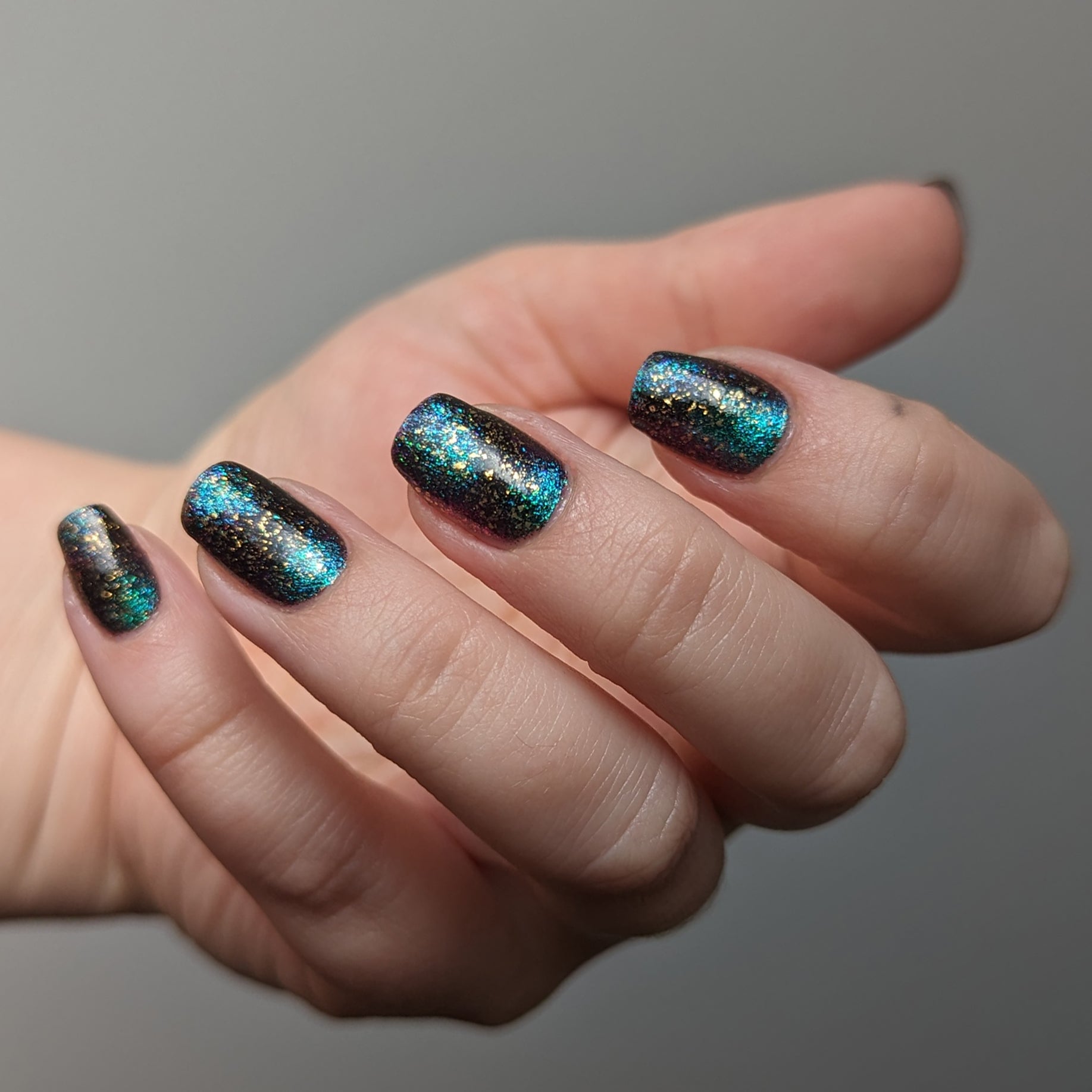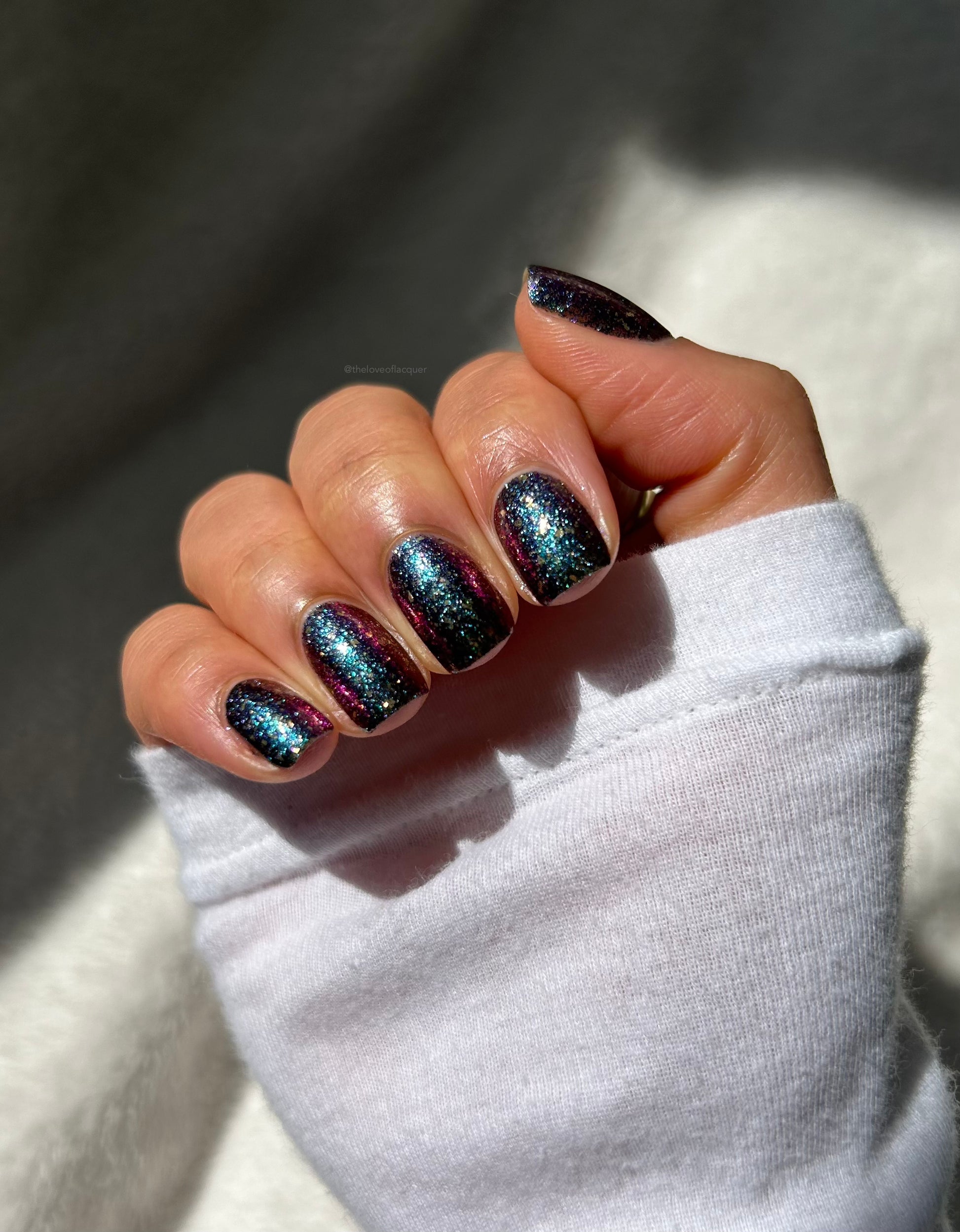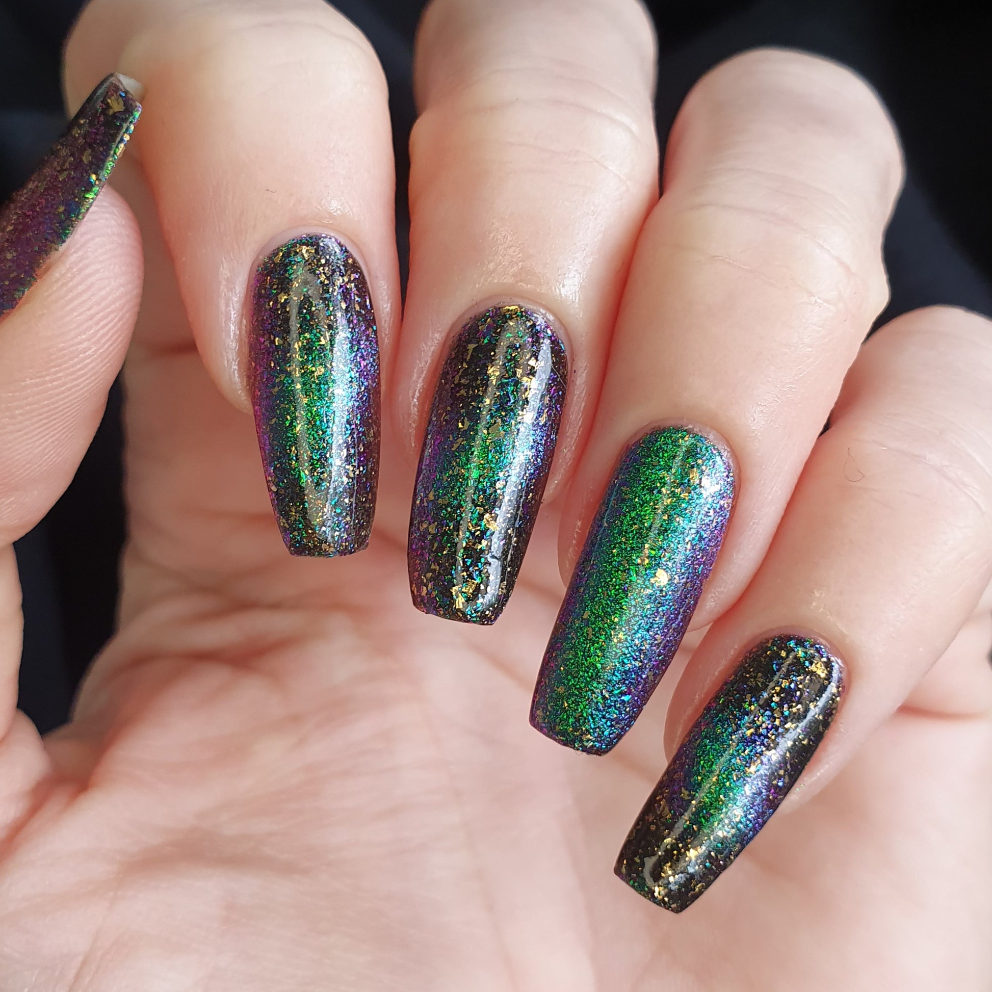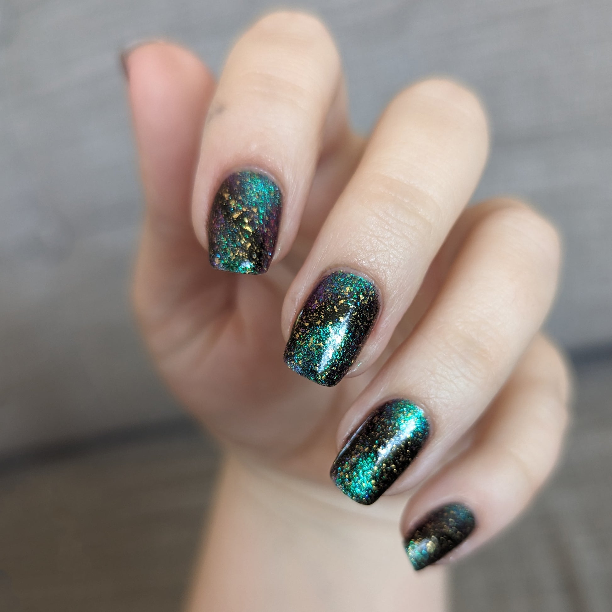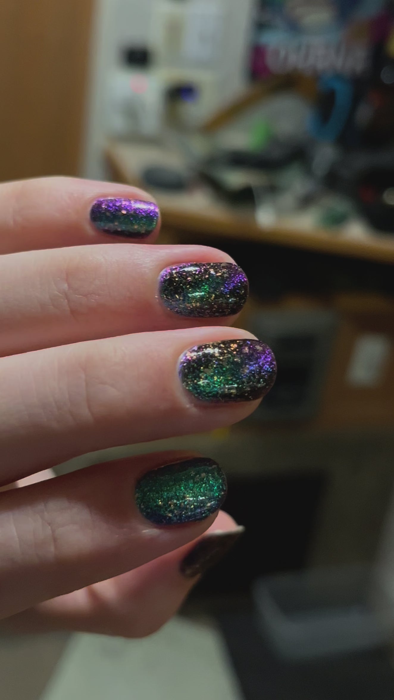 Divine Punishment has a black jelly base with green & purple magnetic shimmer and gold metallic flakes. The larger particle size of the magnetic shimmer creates stunning shifts from green to purple regardless of magnetizing technique!