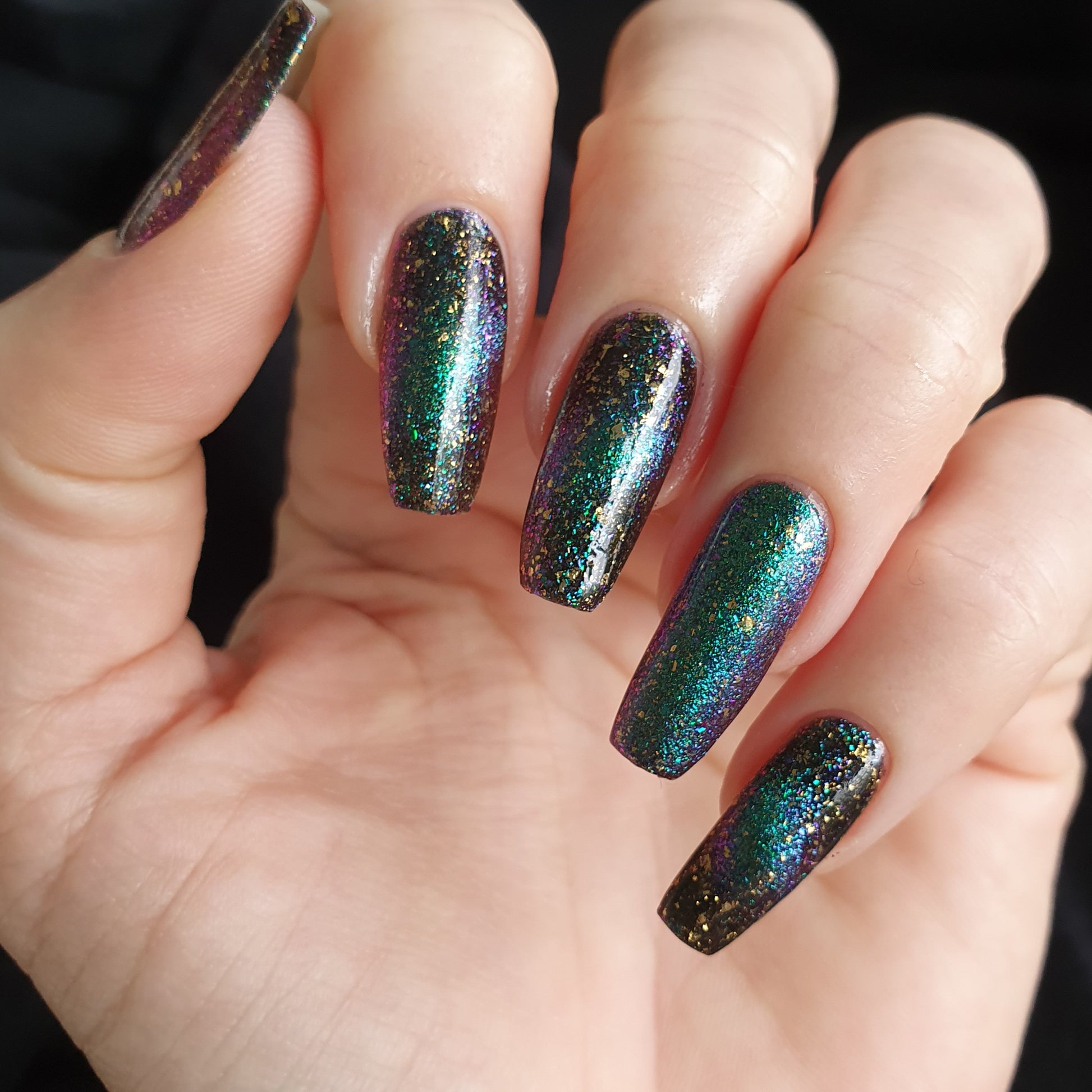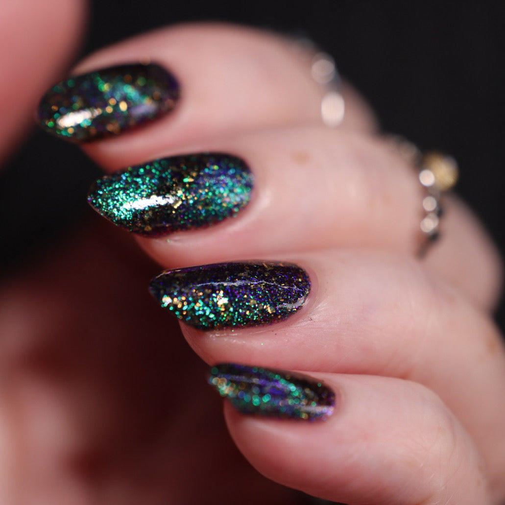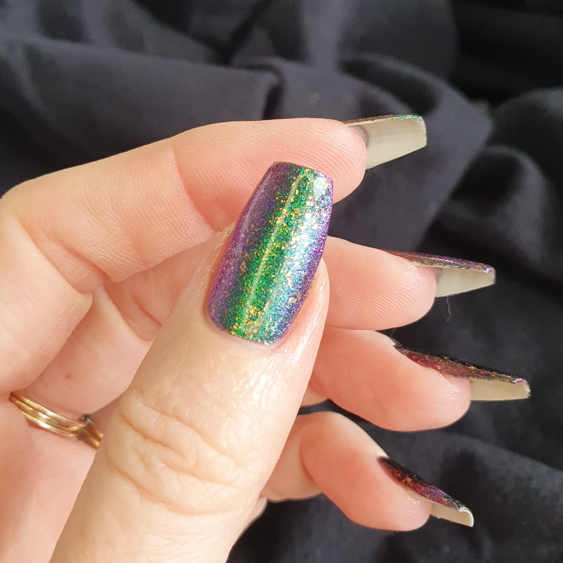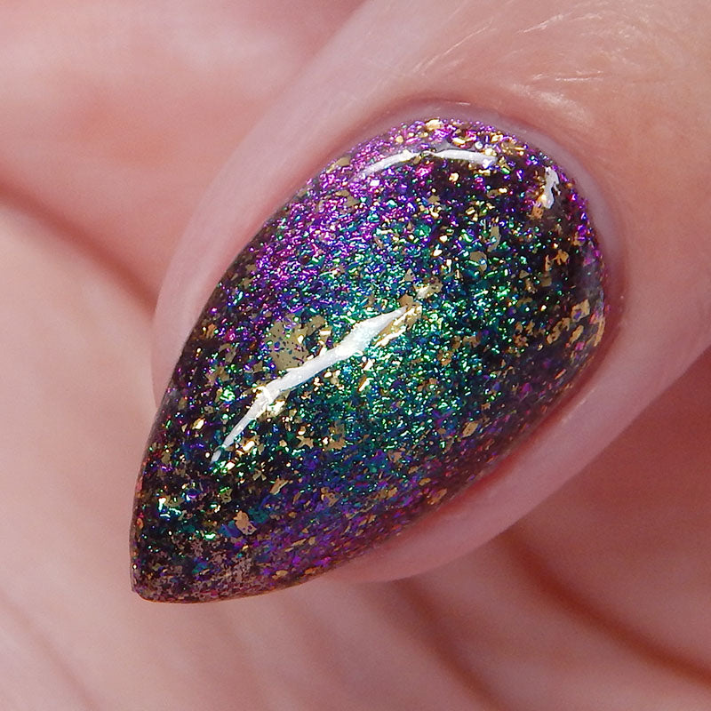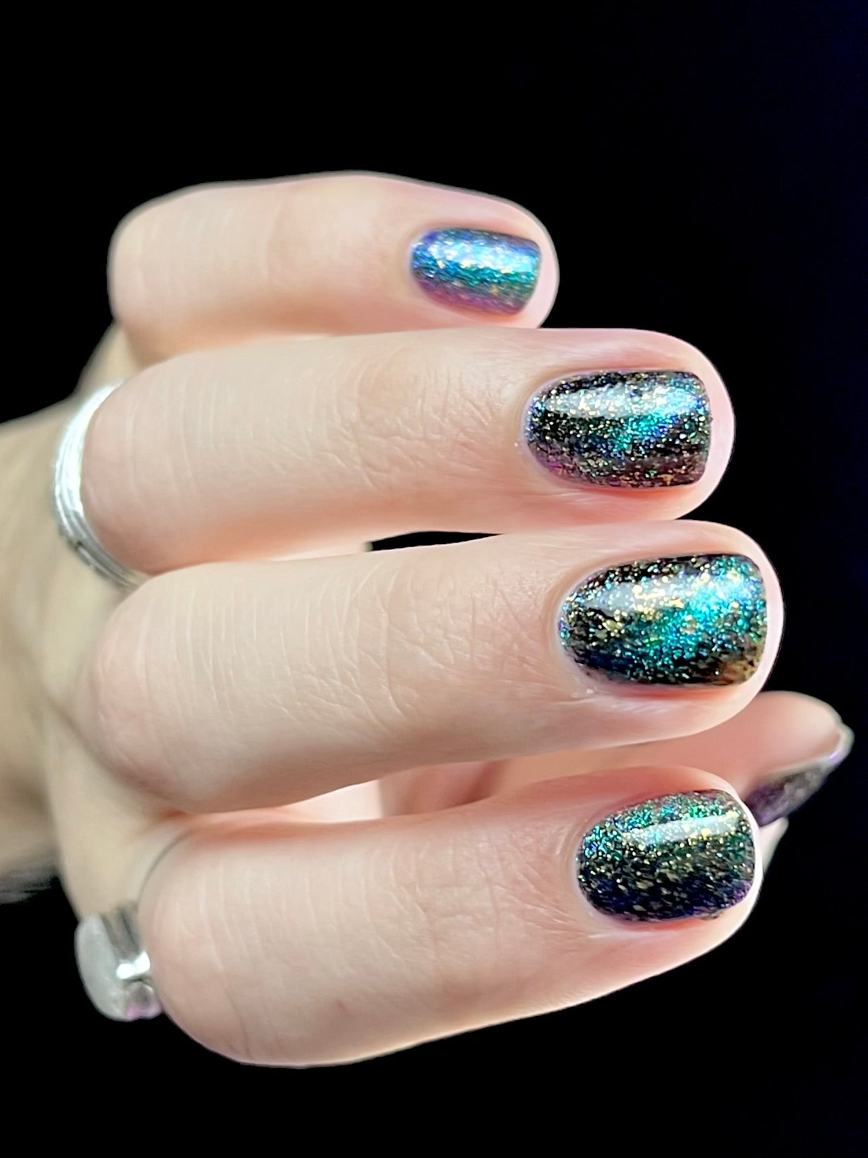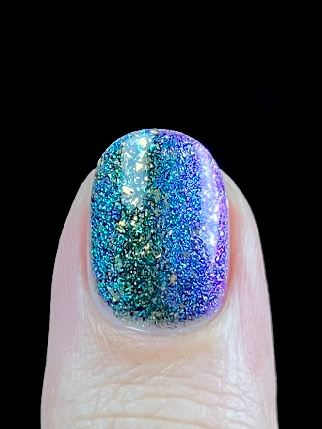 Divine Punishment has a black jelly base with green & purple magnetic shimmer and gold metallic flakes. The larger particle size of the magnetic shimmer creates stunning shifts from green to purple regardless of magnetizing technique!