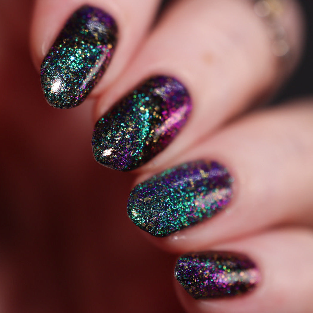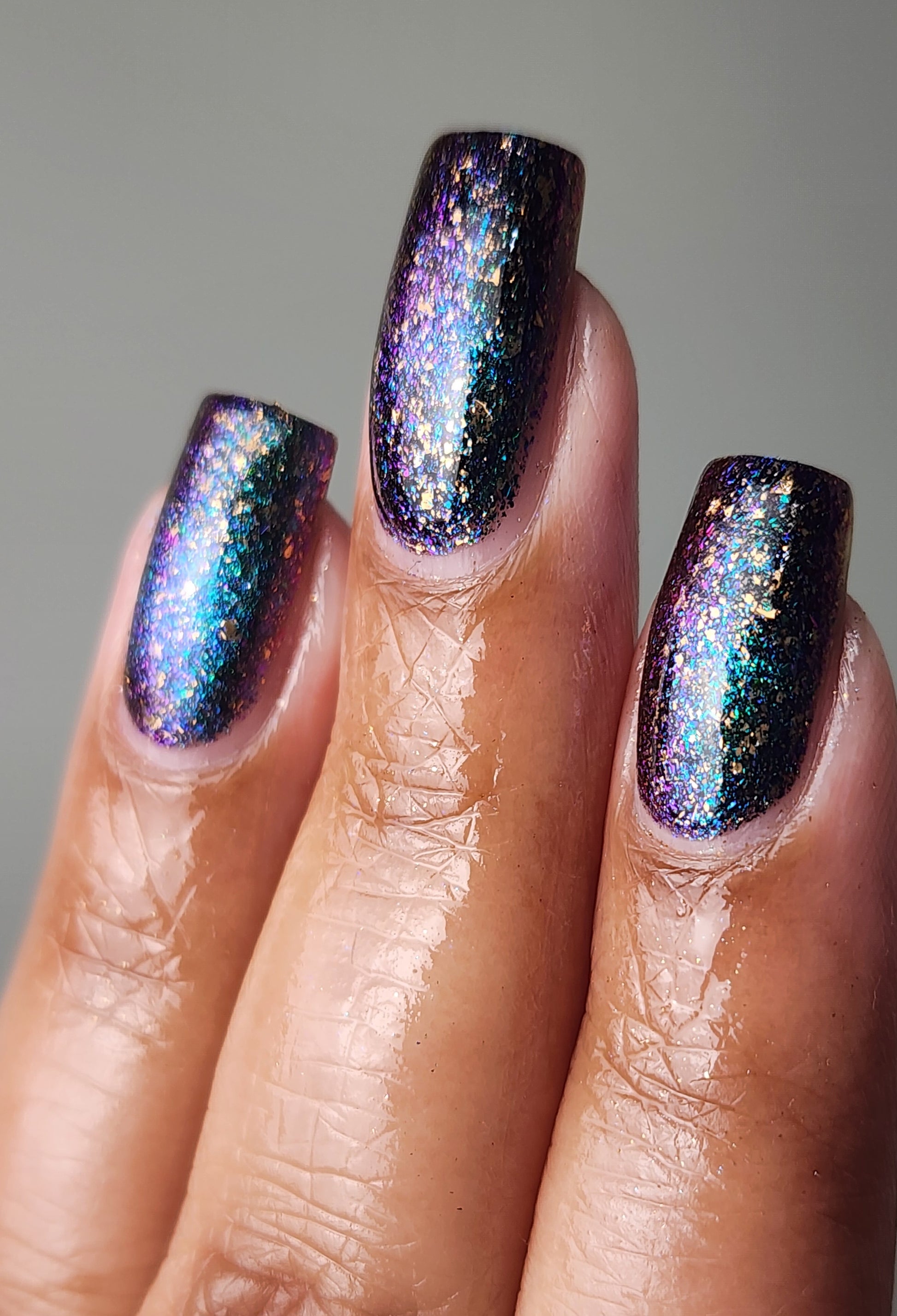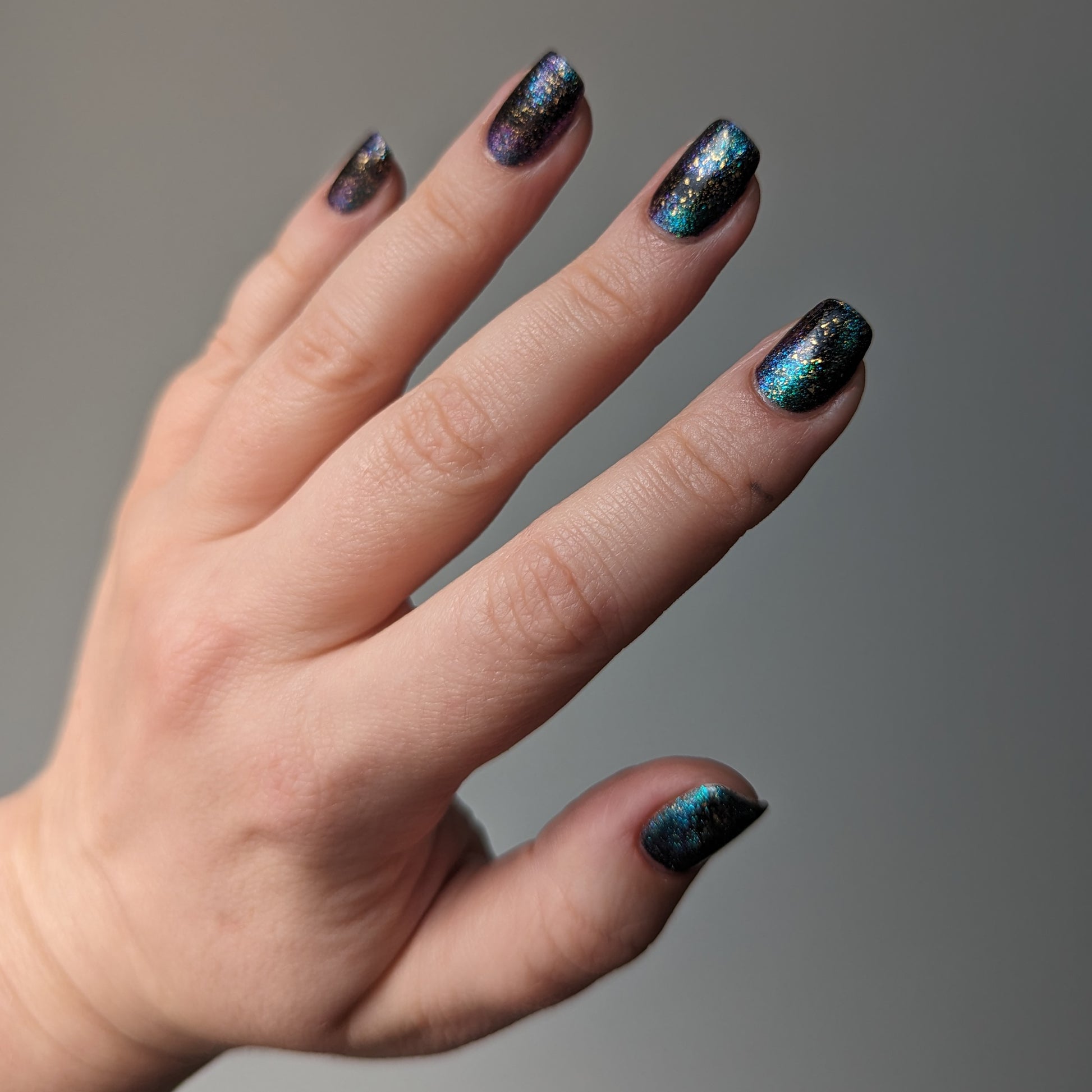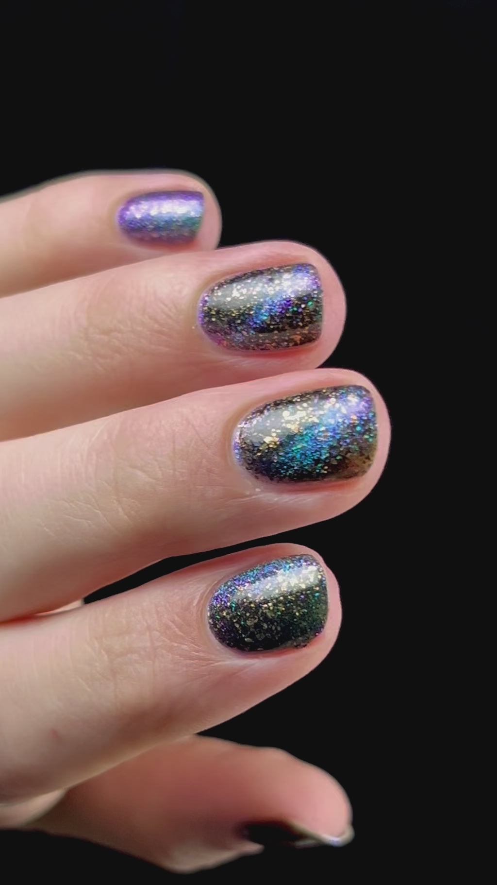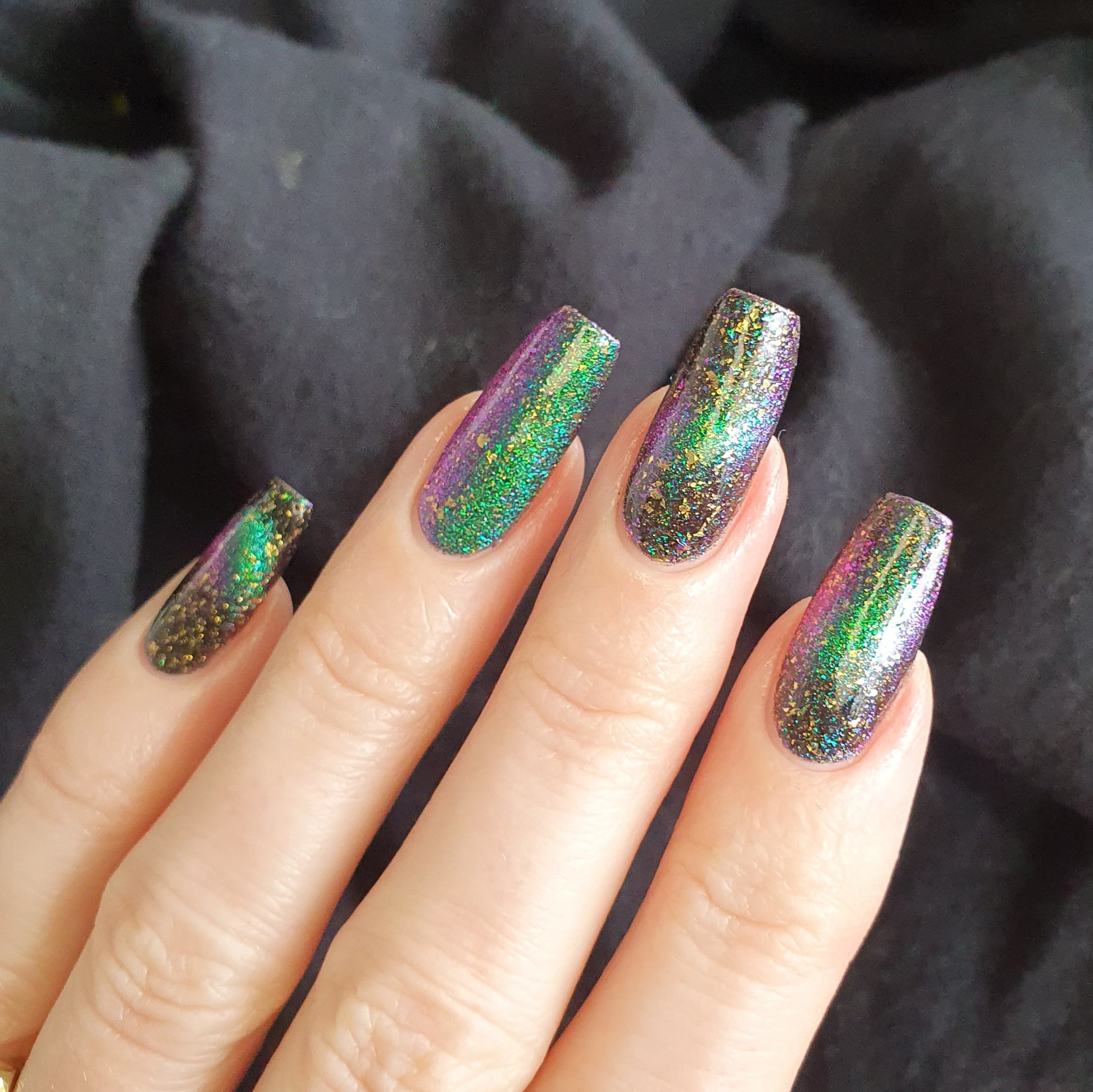 Divine Punishment has a black jelly base with green & purple magnetic shimmer and gold metallic flakes. The larger particle size of the magnetic shimmer creates stunning shifts from green to purple regardless of magnetizing technique!