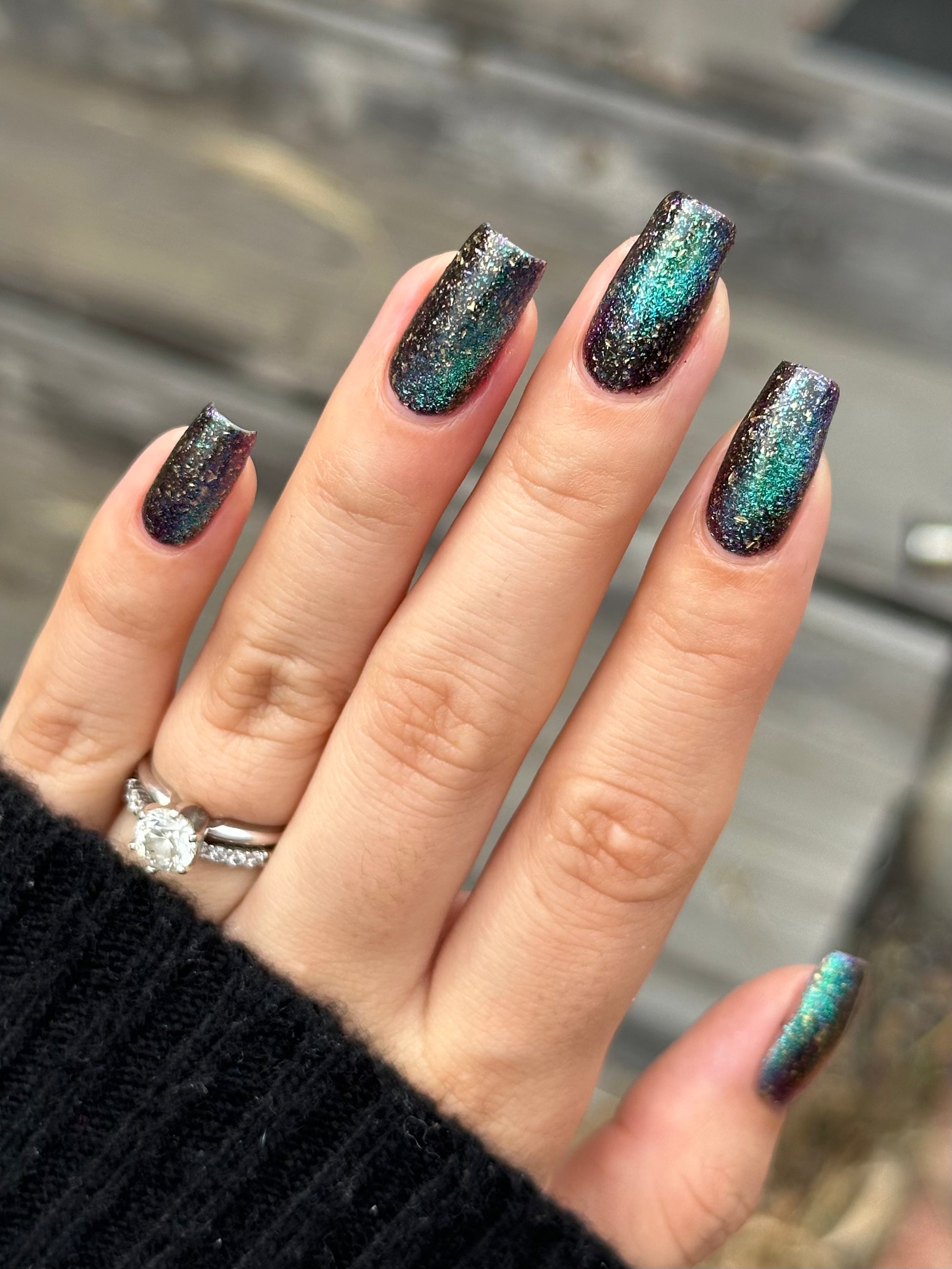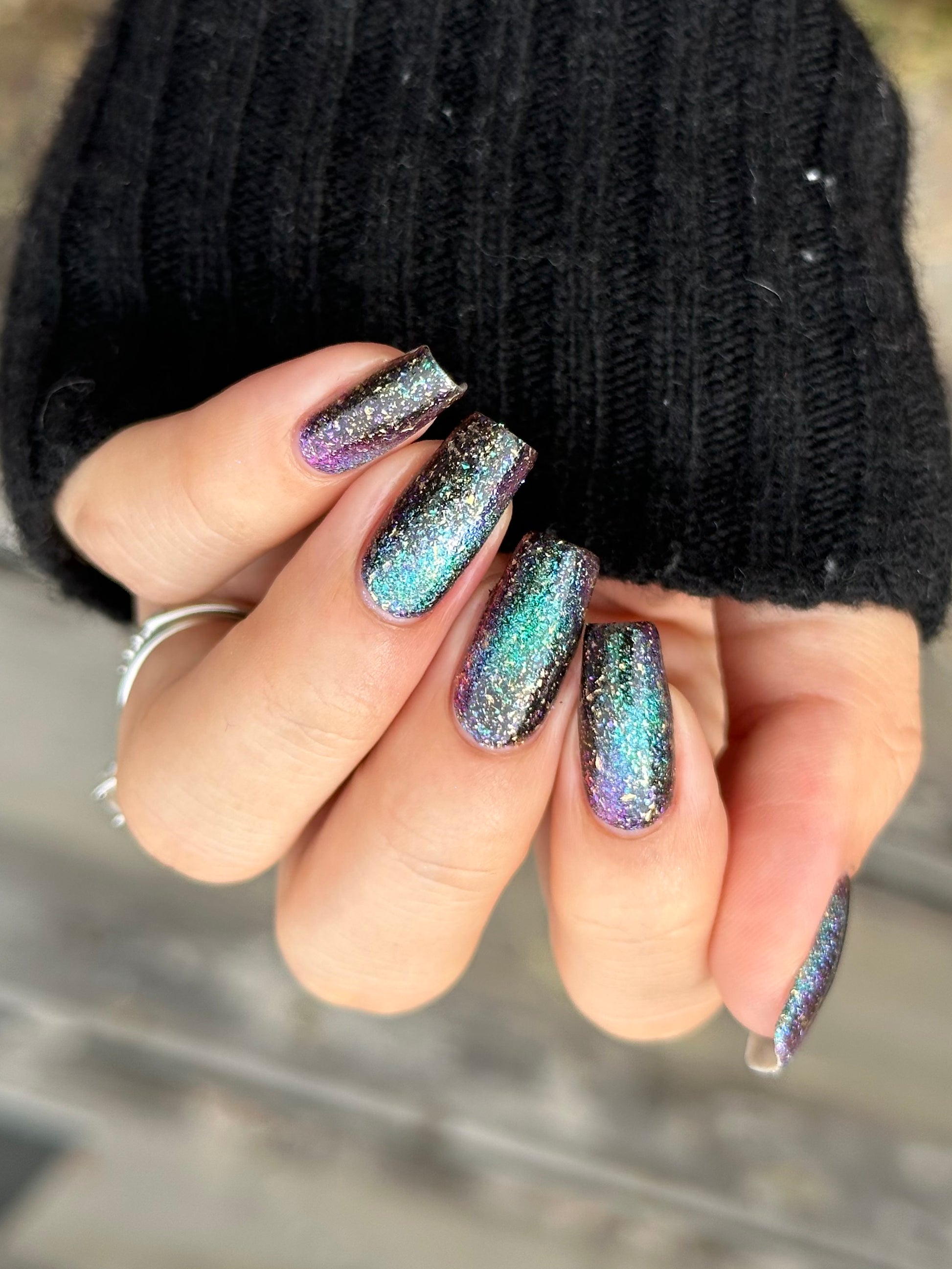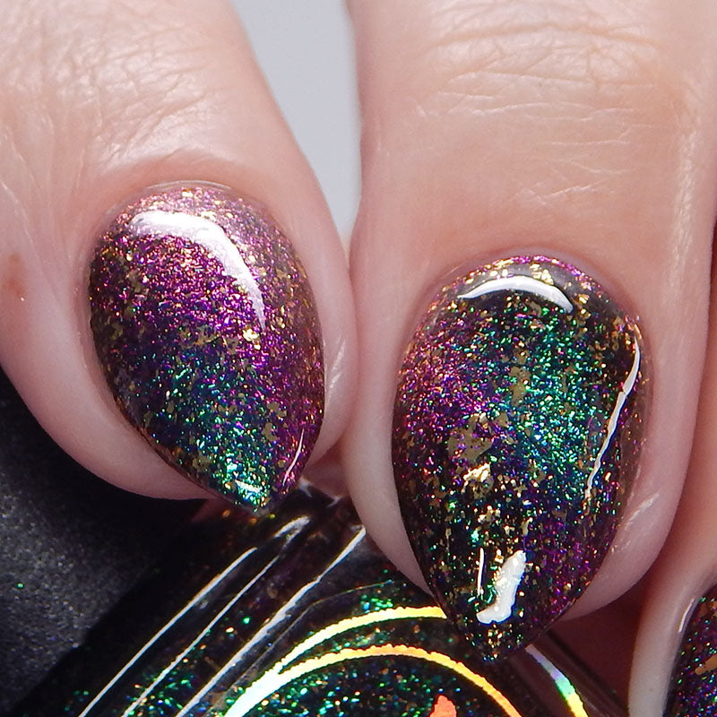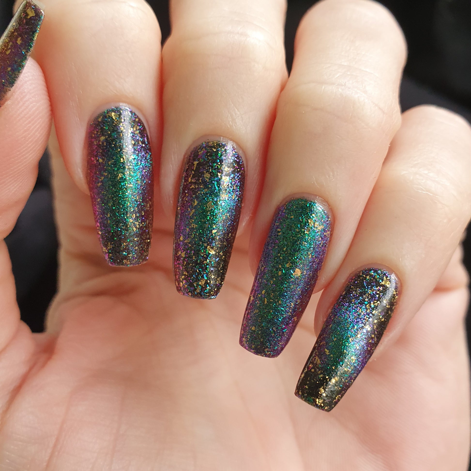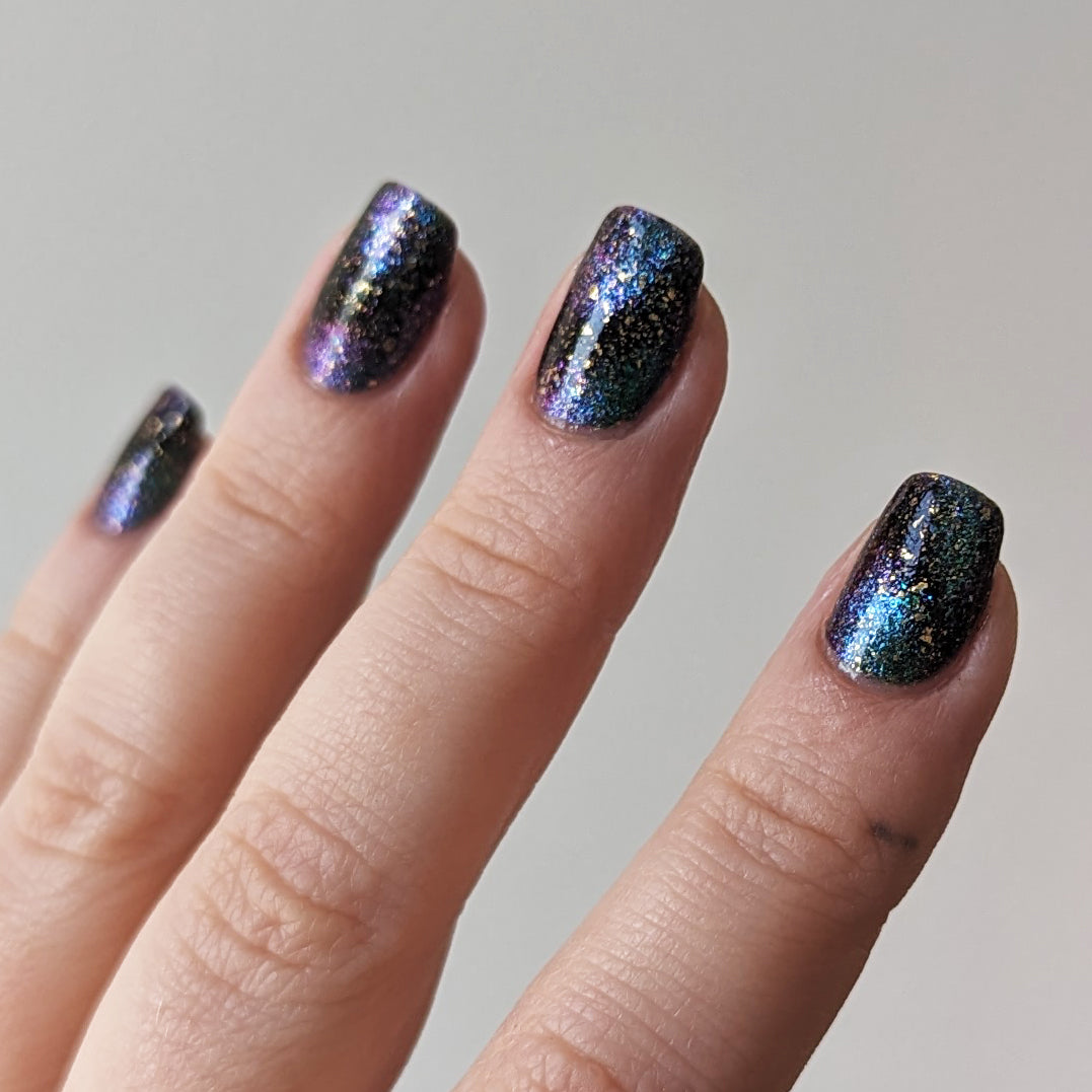 Divine Punishment has a black jelly base with green & purple magnetic shimmer and gold metallic flakes. The larger particle size of the magnetic shimmer creates stunning shifts from green to purple regardless of magnetizing technique!