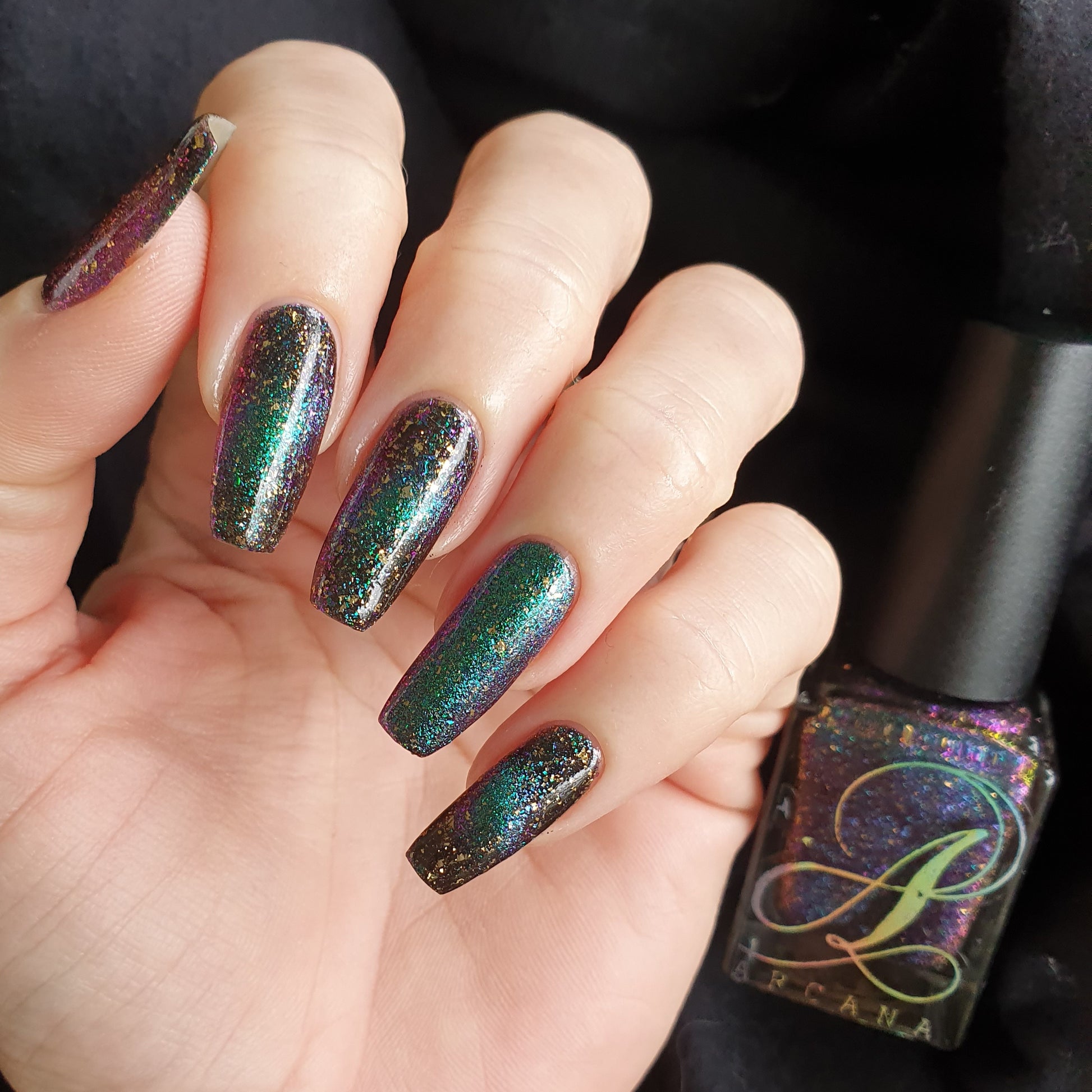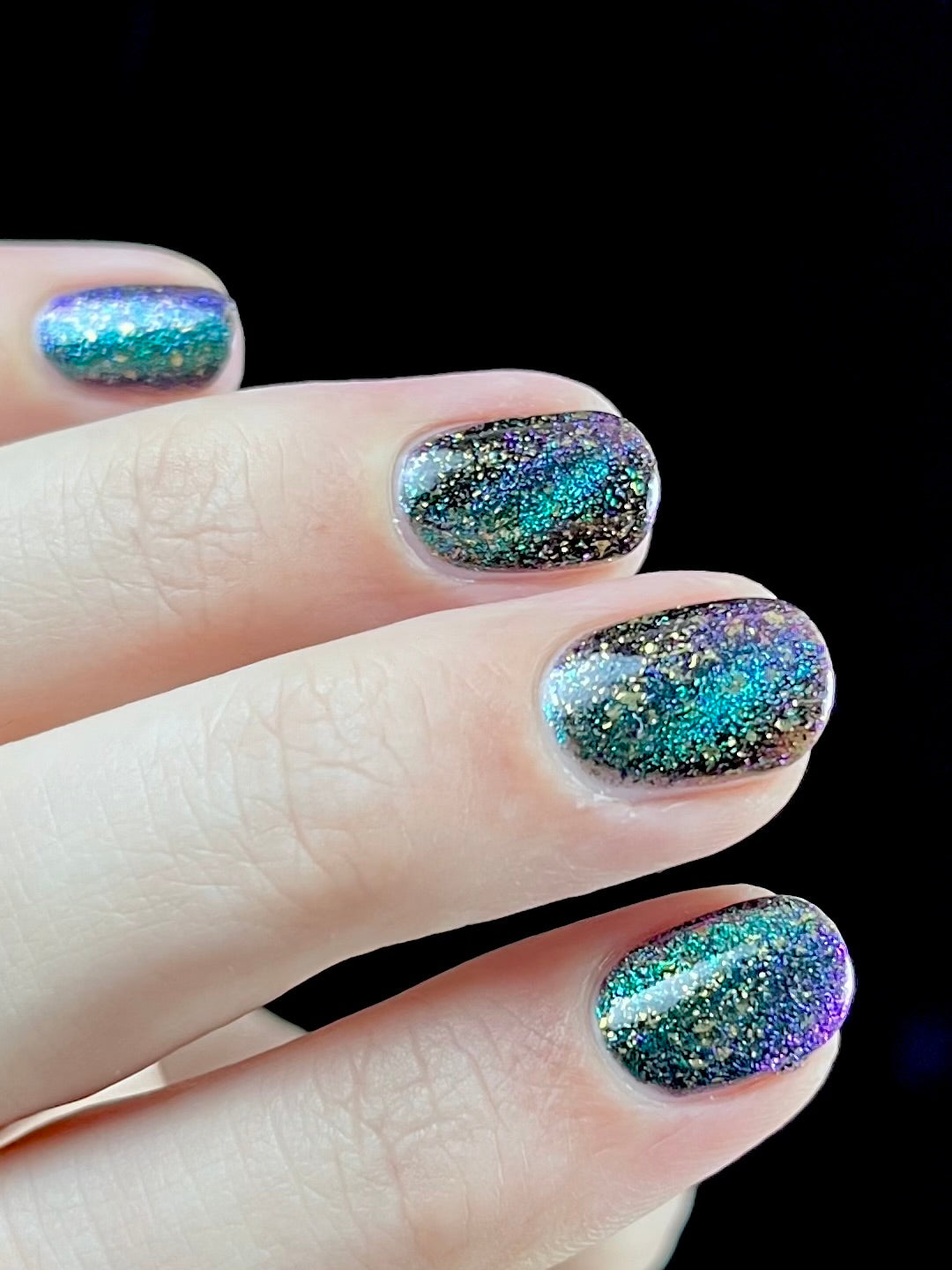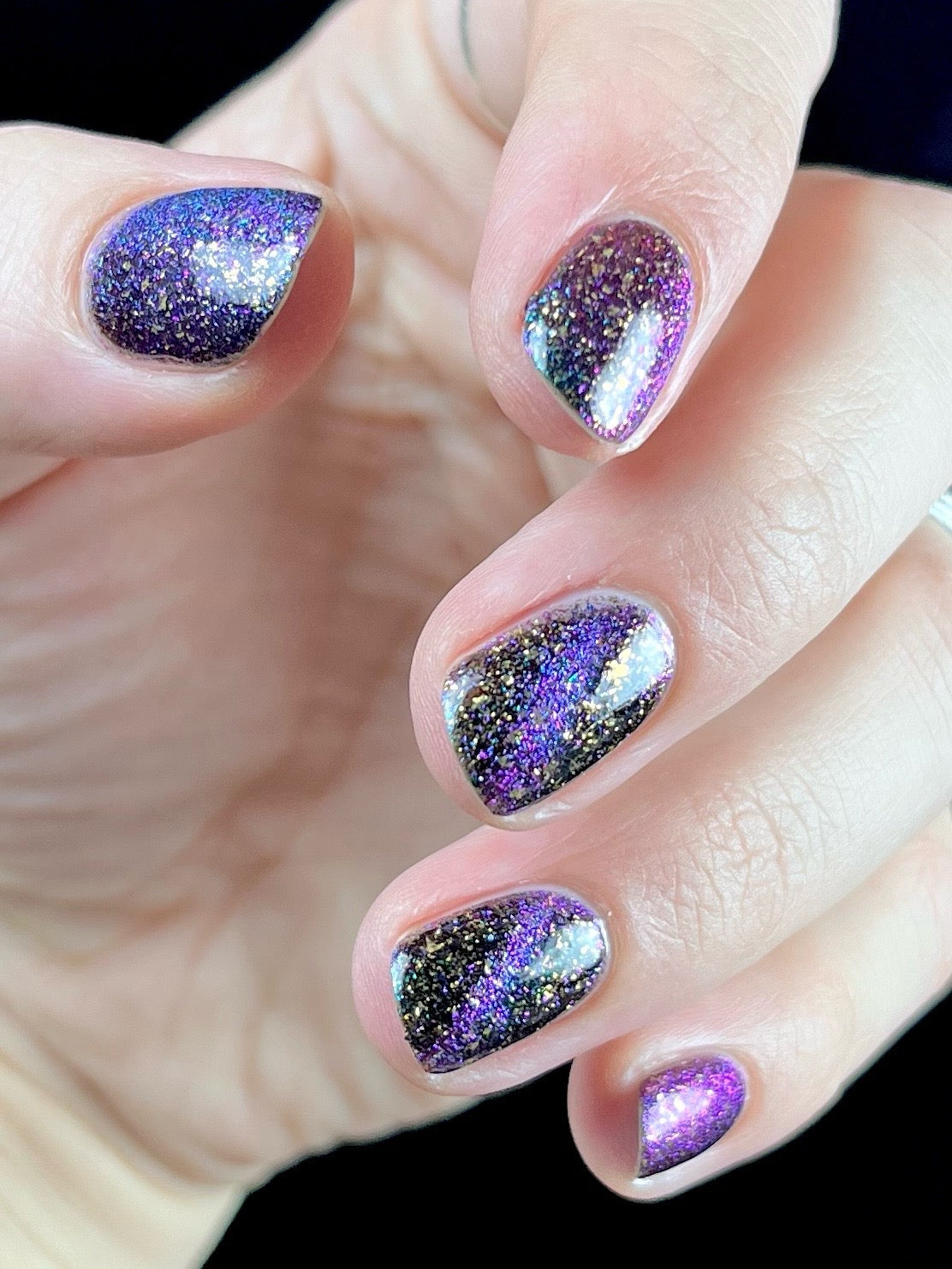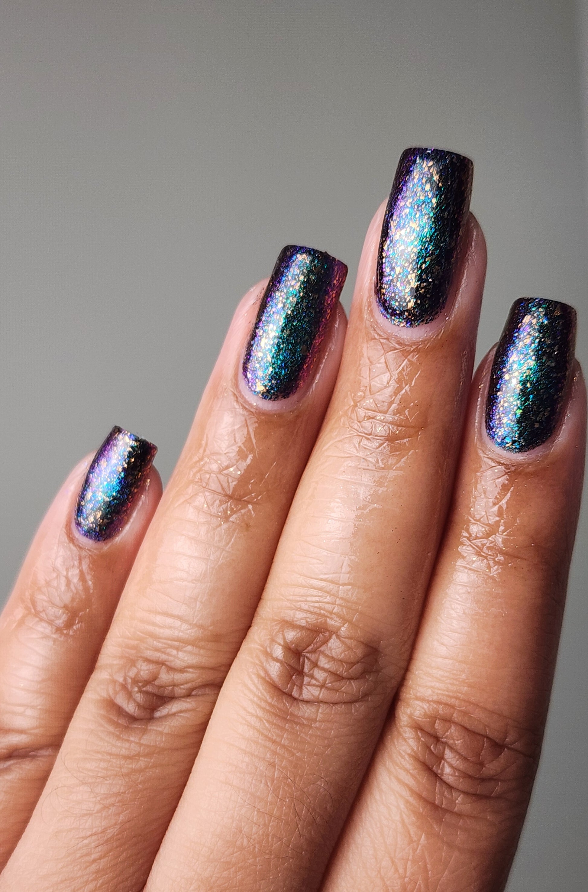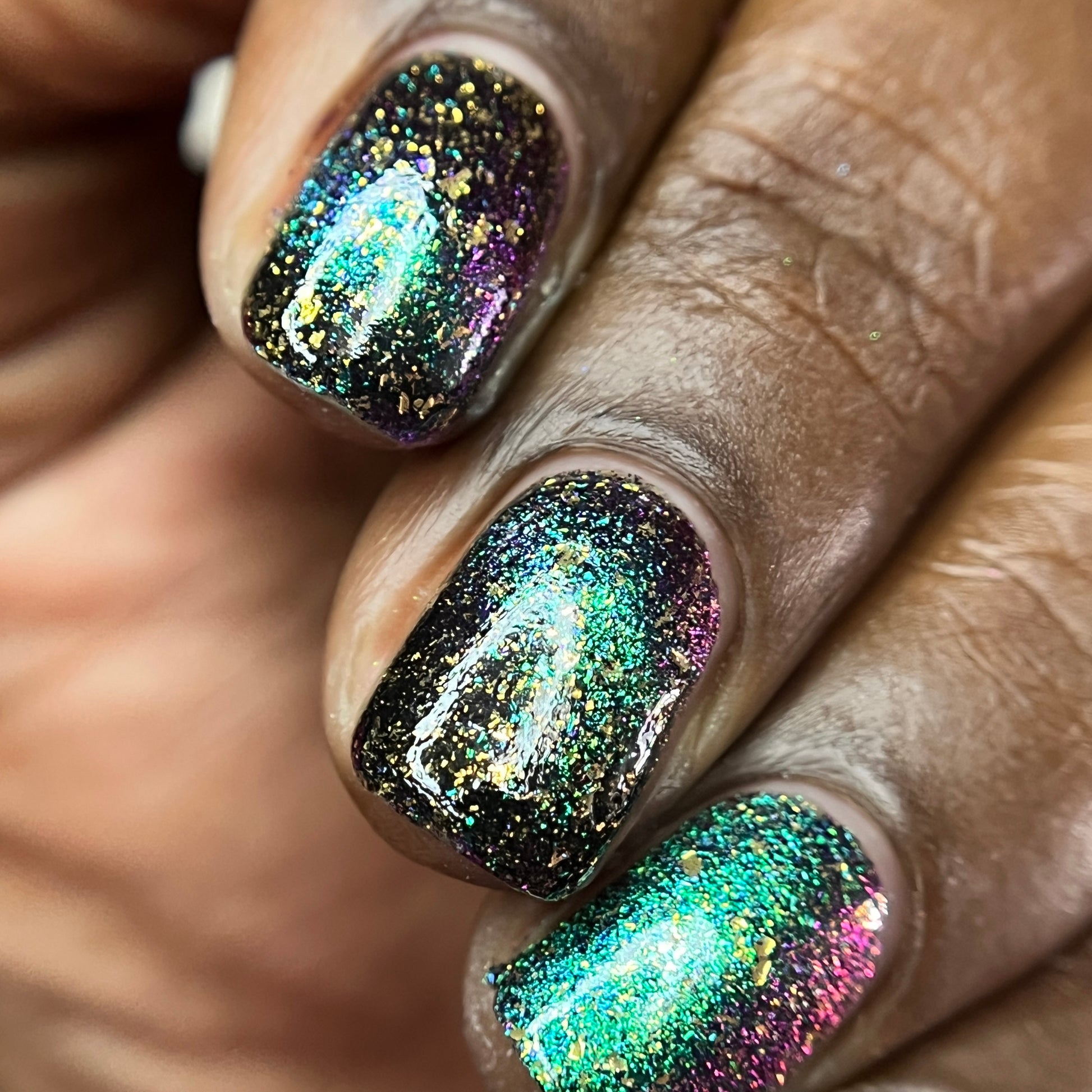 Divine Punishment has a black jelly base with green & purple magnetic shimmer and gold metallic flakes. The larger particle size of the magnetic shimmer creates stunning shifts from green to purple regardless of magnetizing technique!