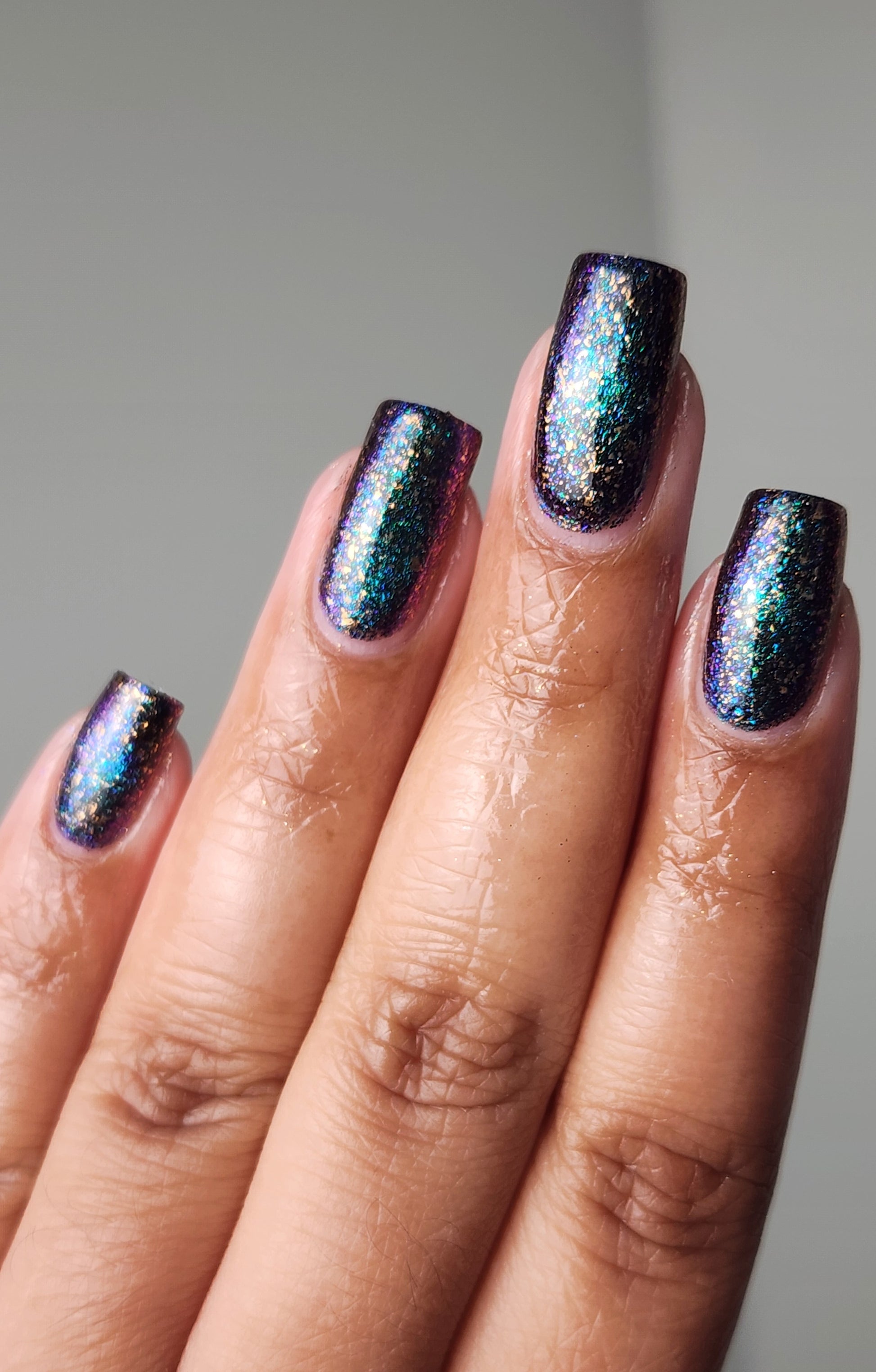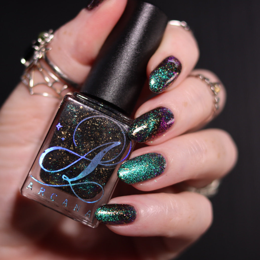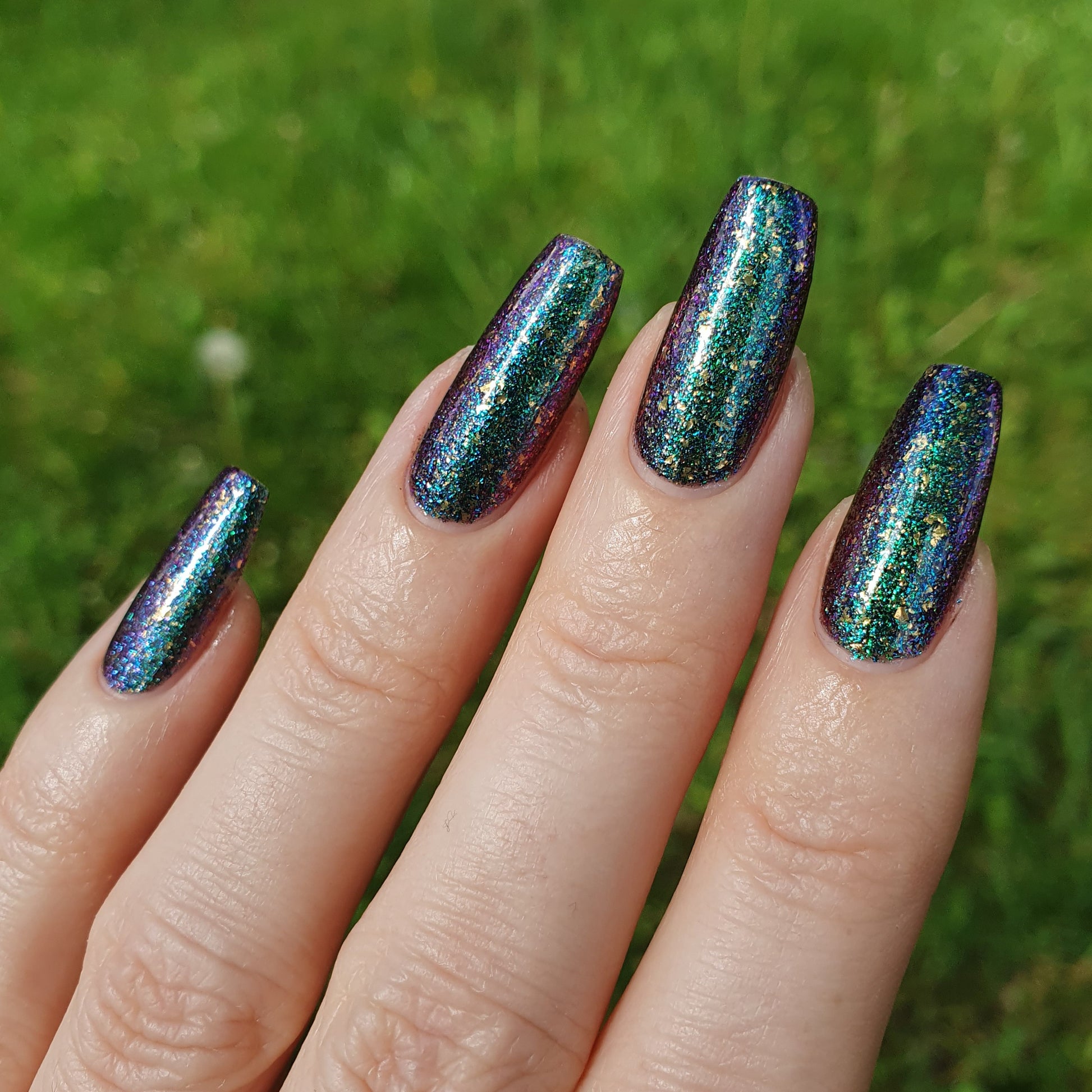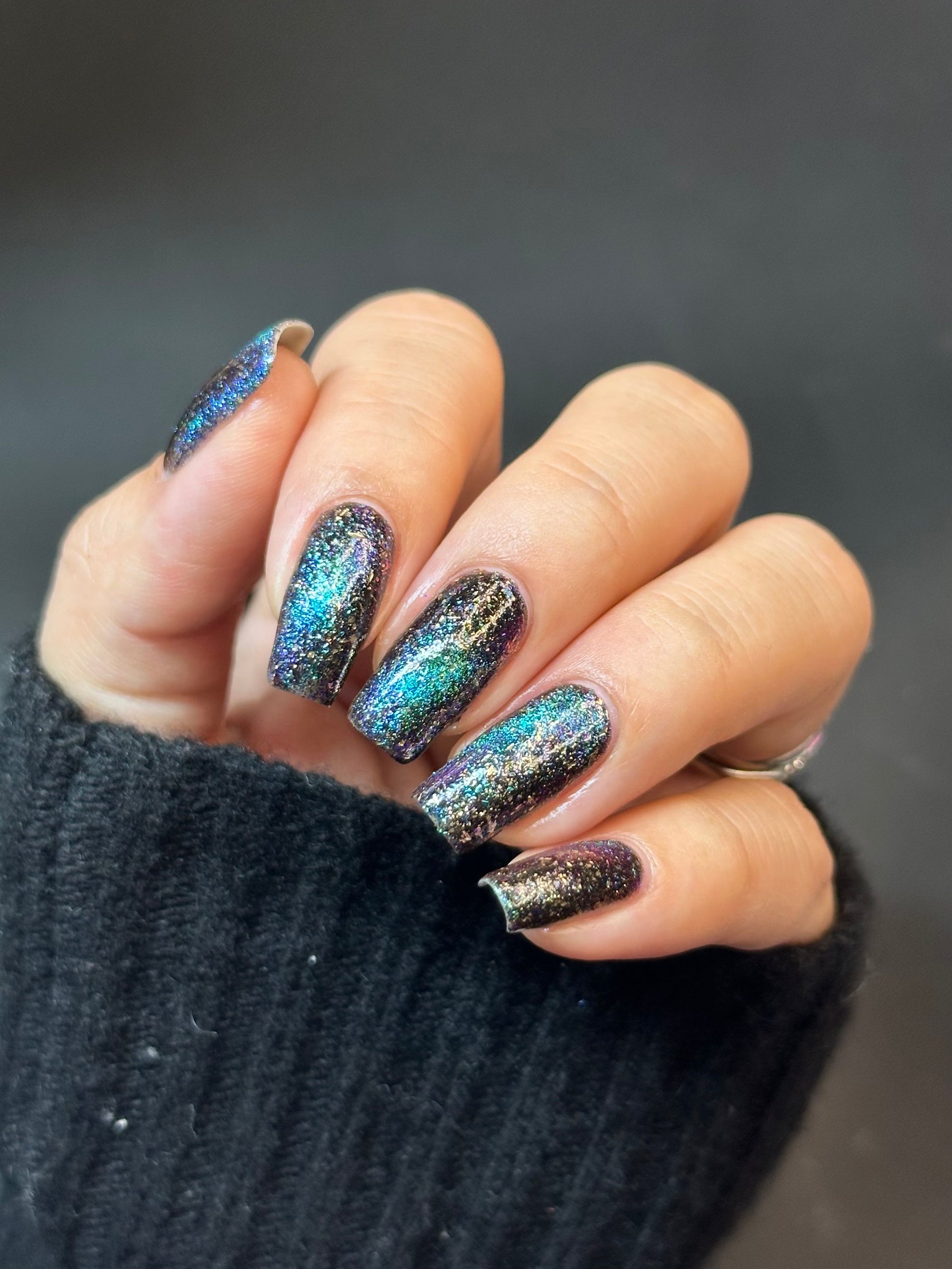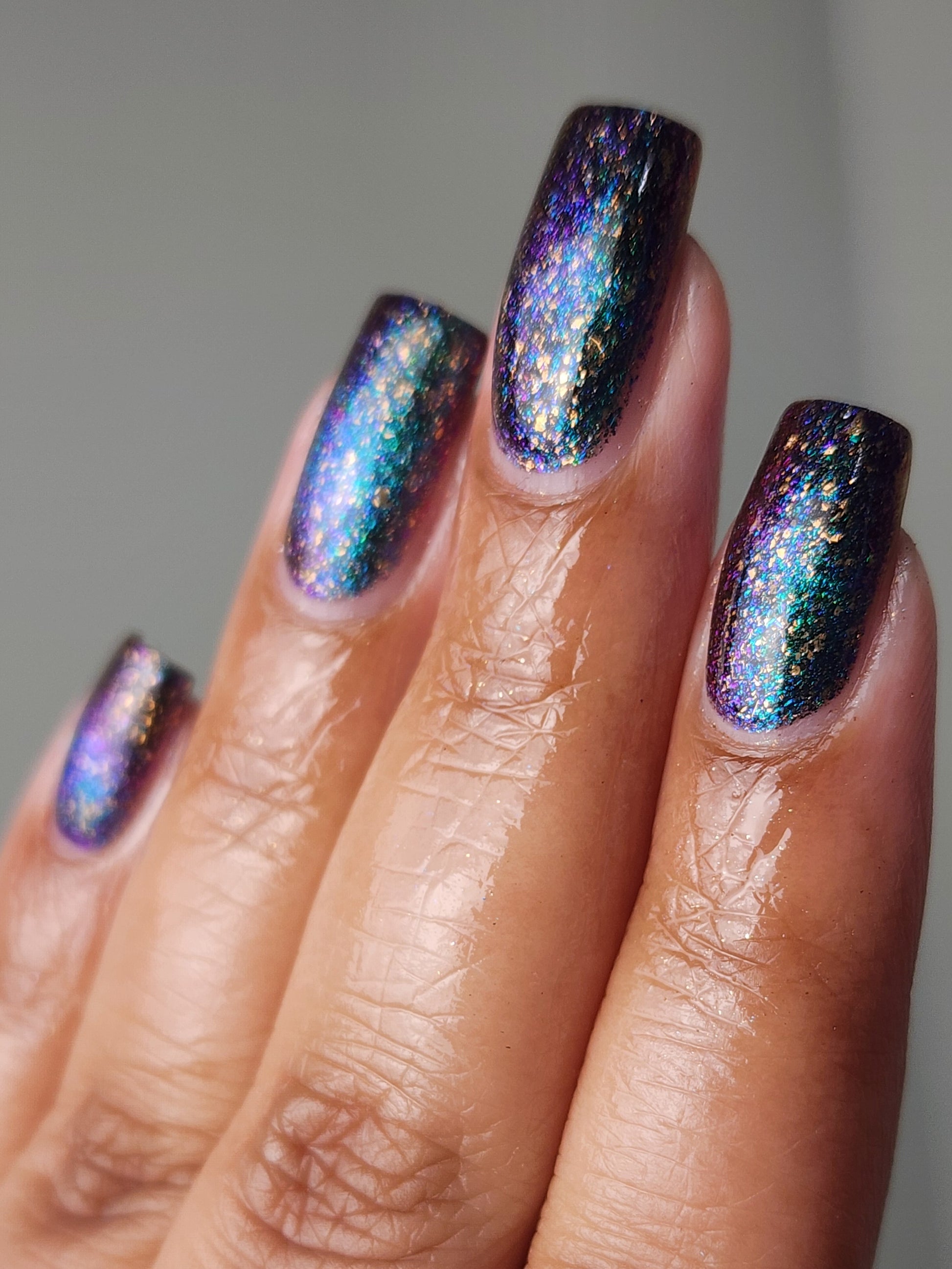Divine Punishment has a black jelly base with green & purple magnetic shimmer and gold metallic flakes. The larger particle size of the magnetic shimmer creates stunning shifts from green to purple regardless of magnetizing technique!