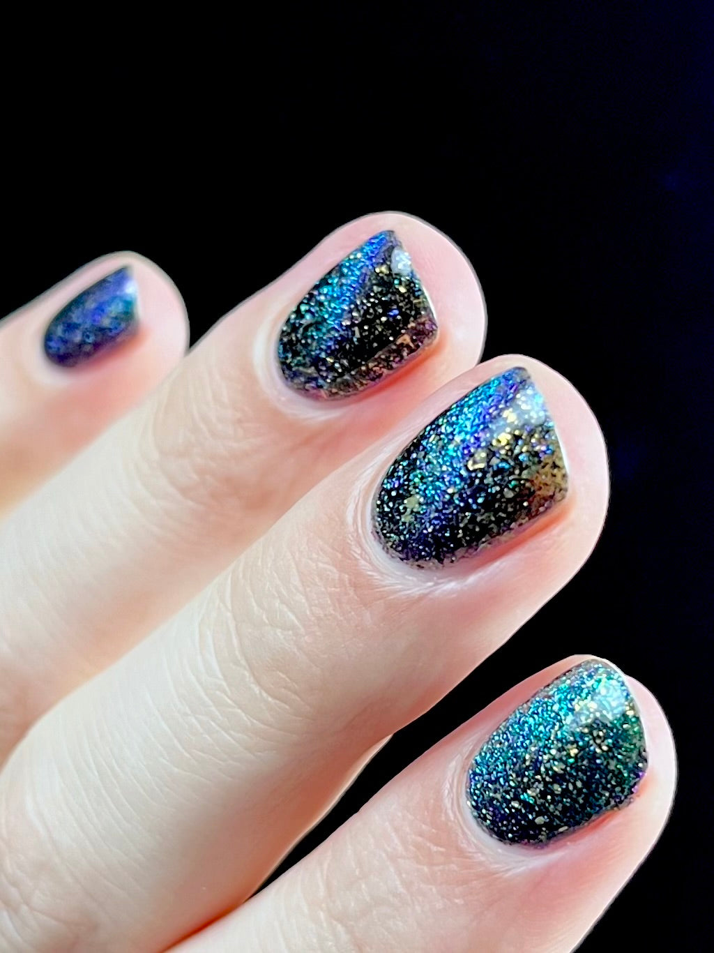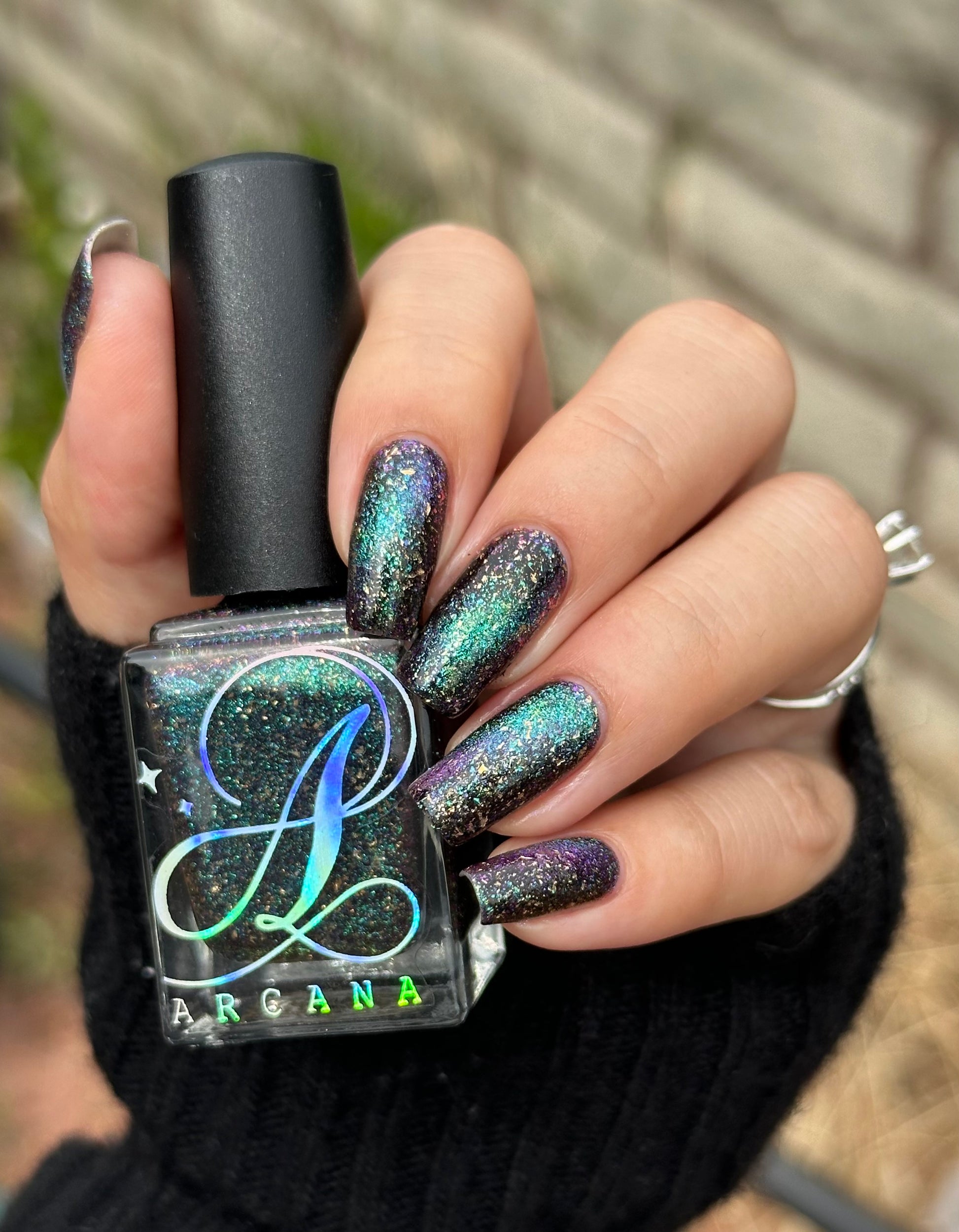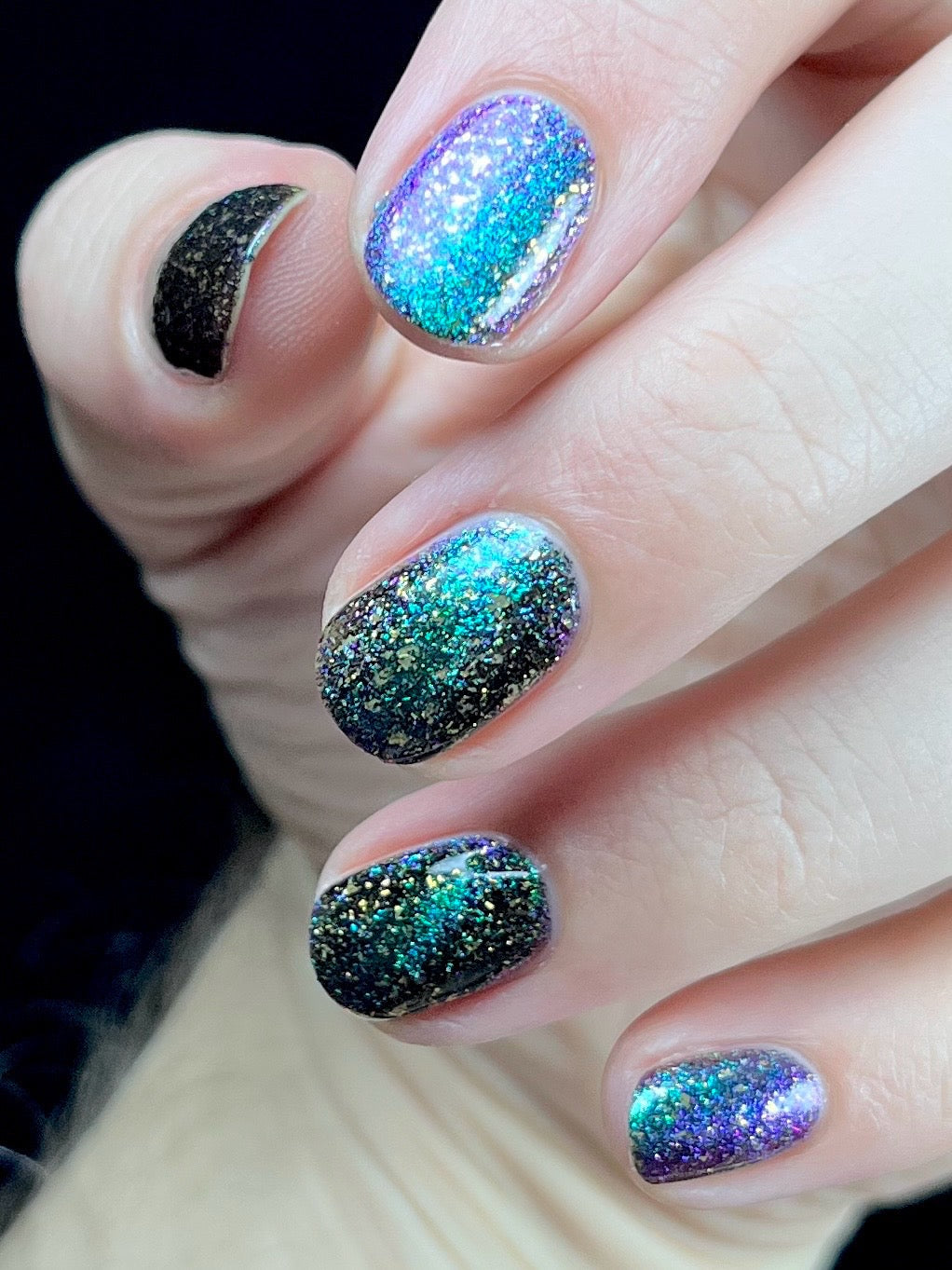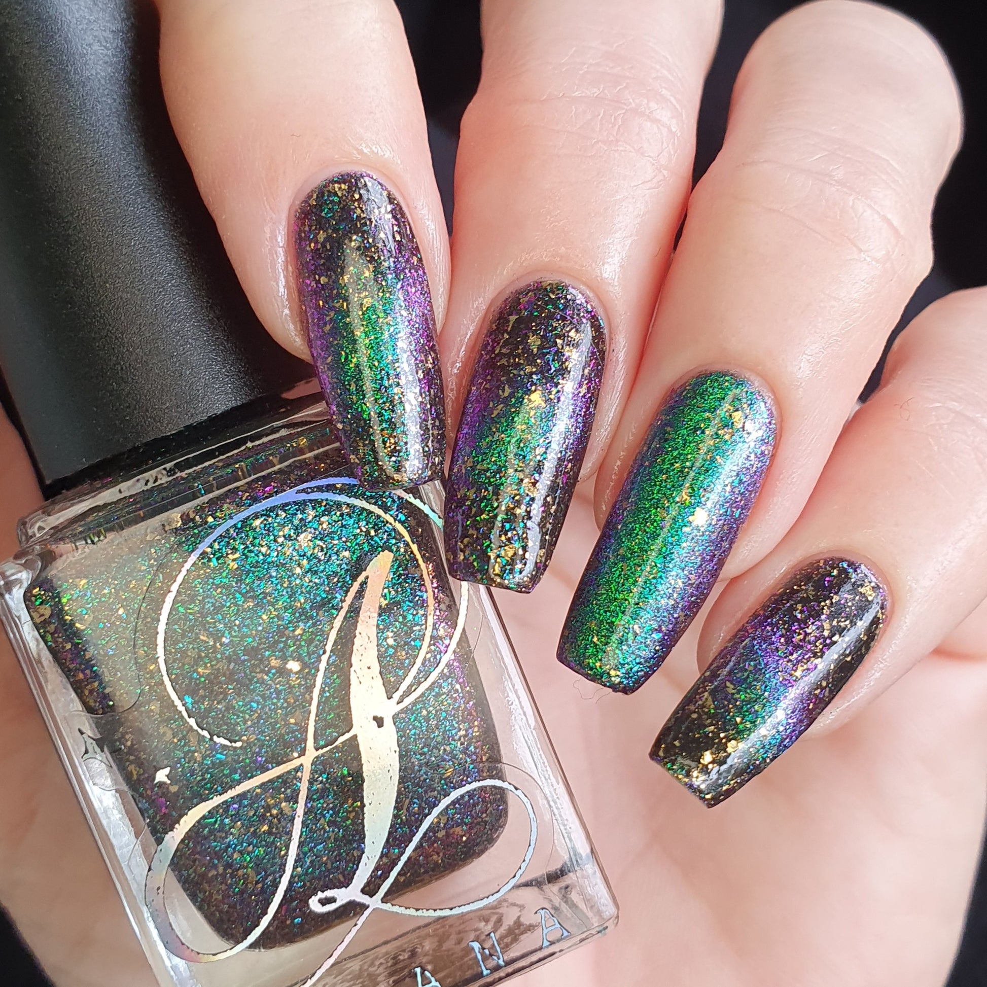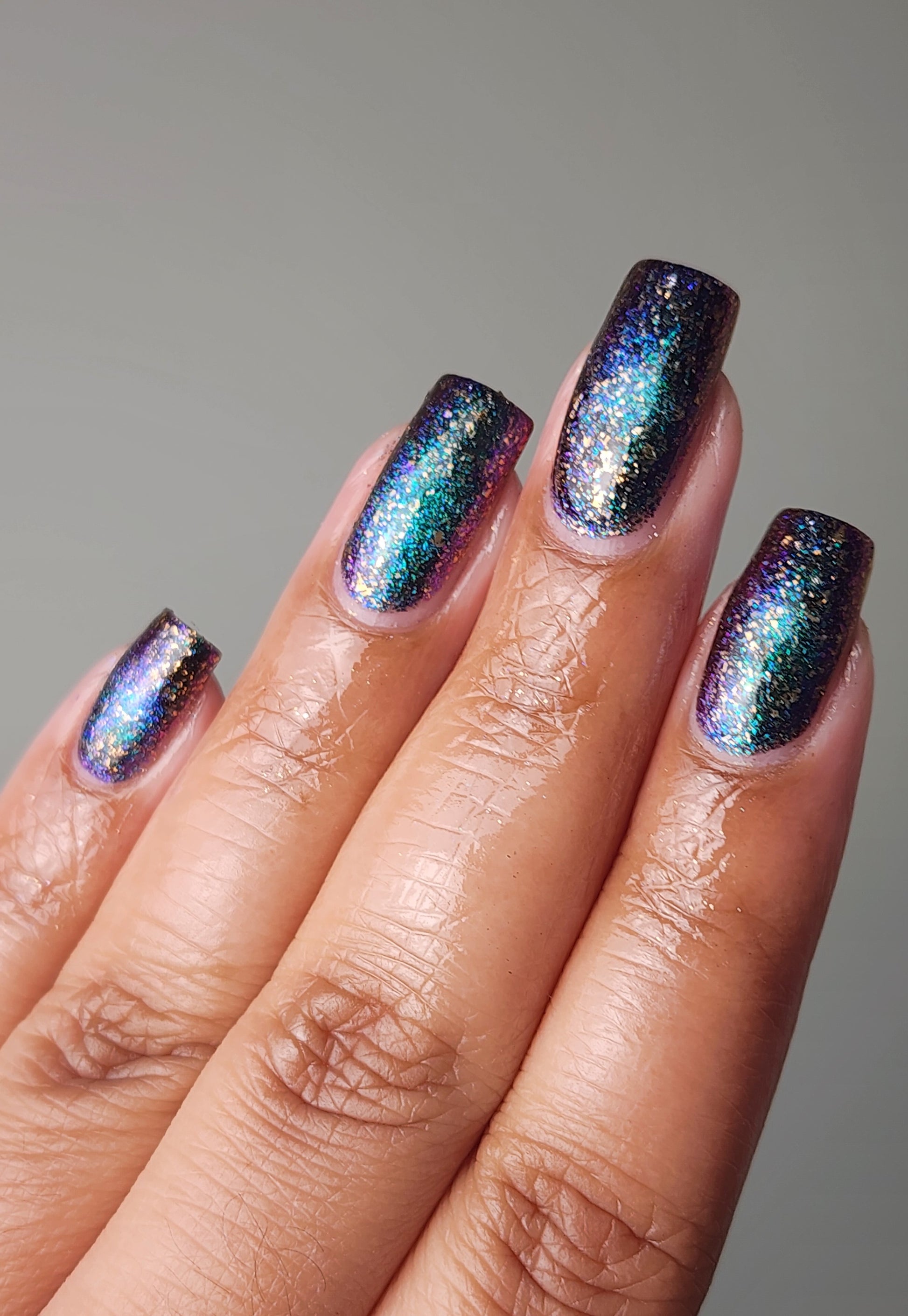 Divine Punishment has a black jelly base with green & purple magnetic shimmer and gold metallic flakes. The larger particle size of the magnetic shimmer creates stunning shifts from green to purple regardless of magnetizing technique!