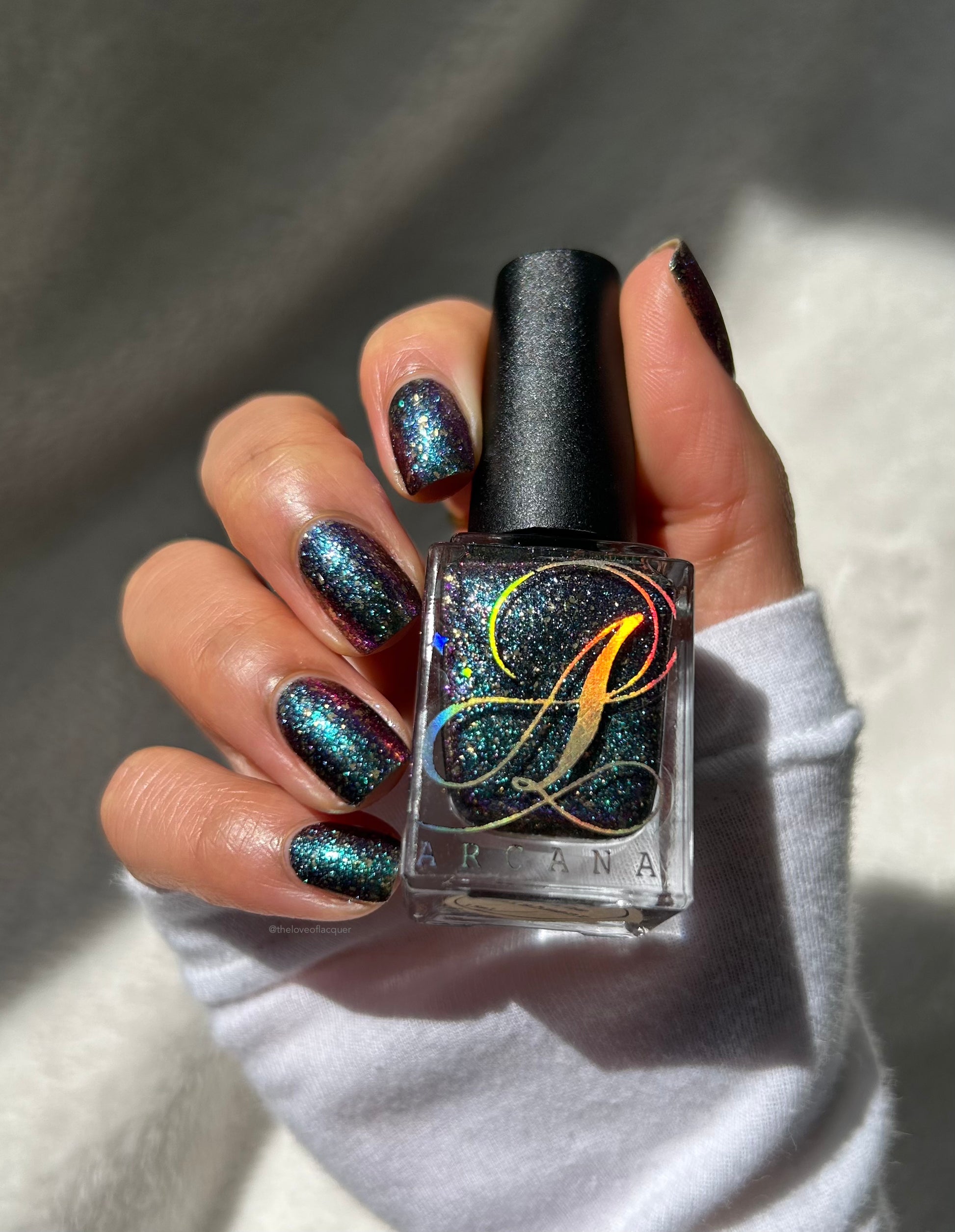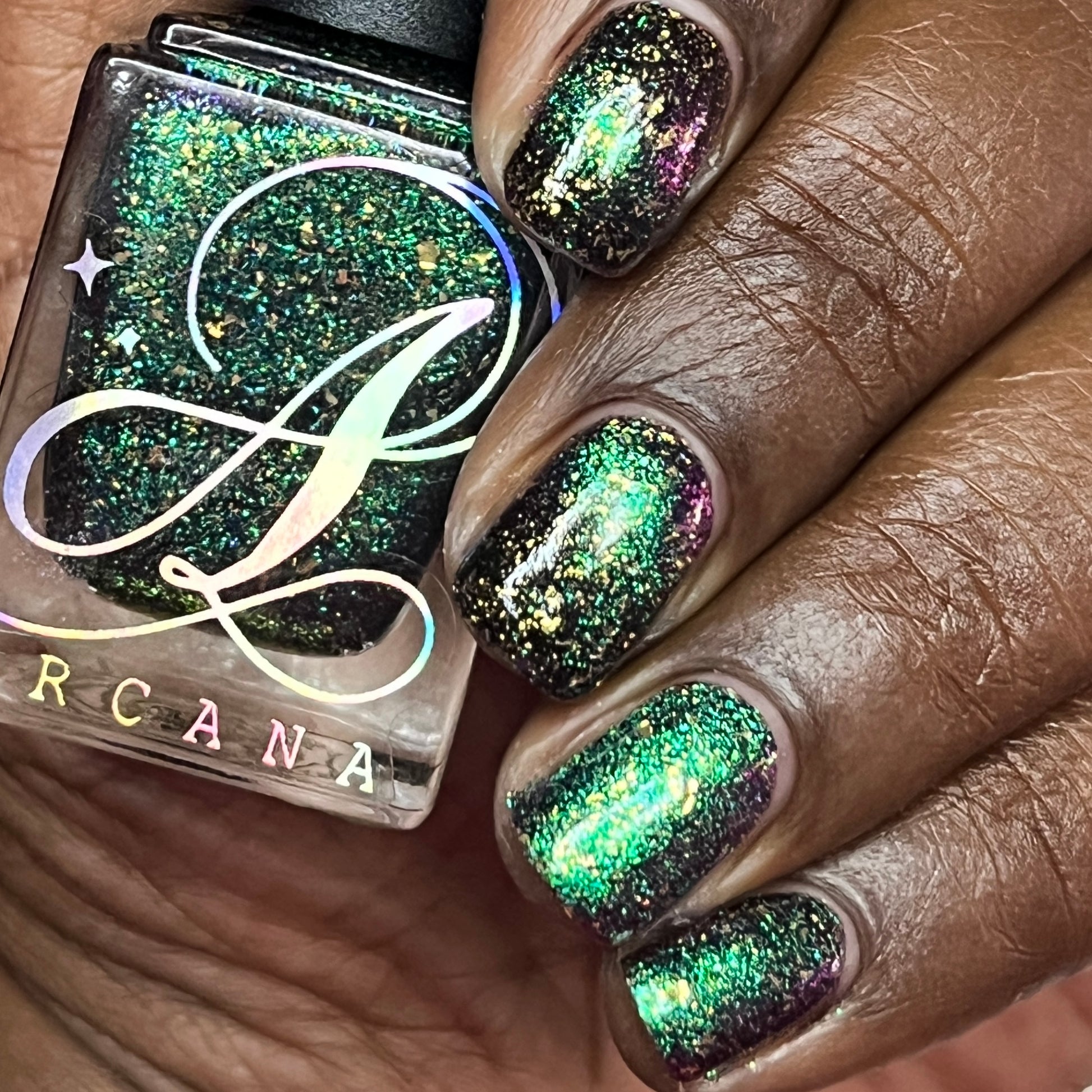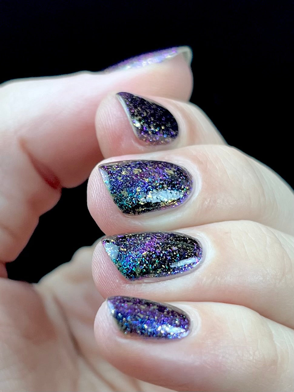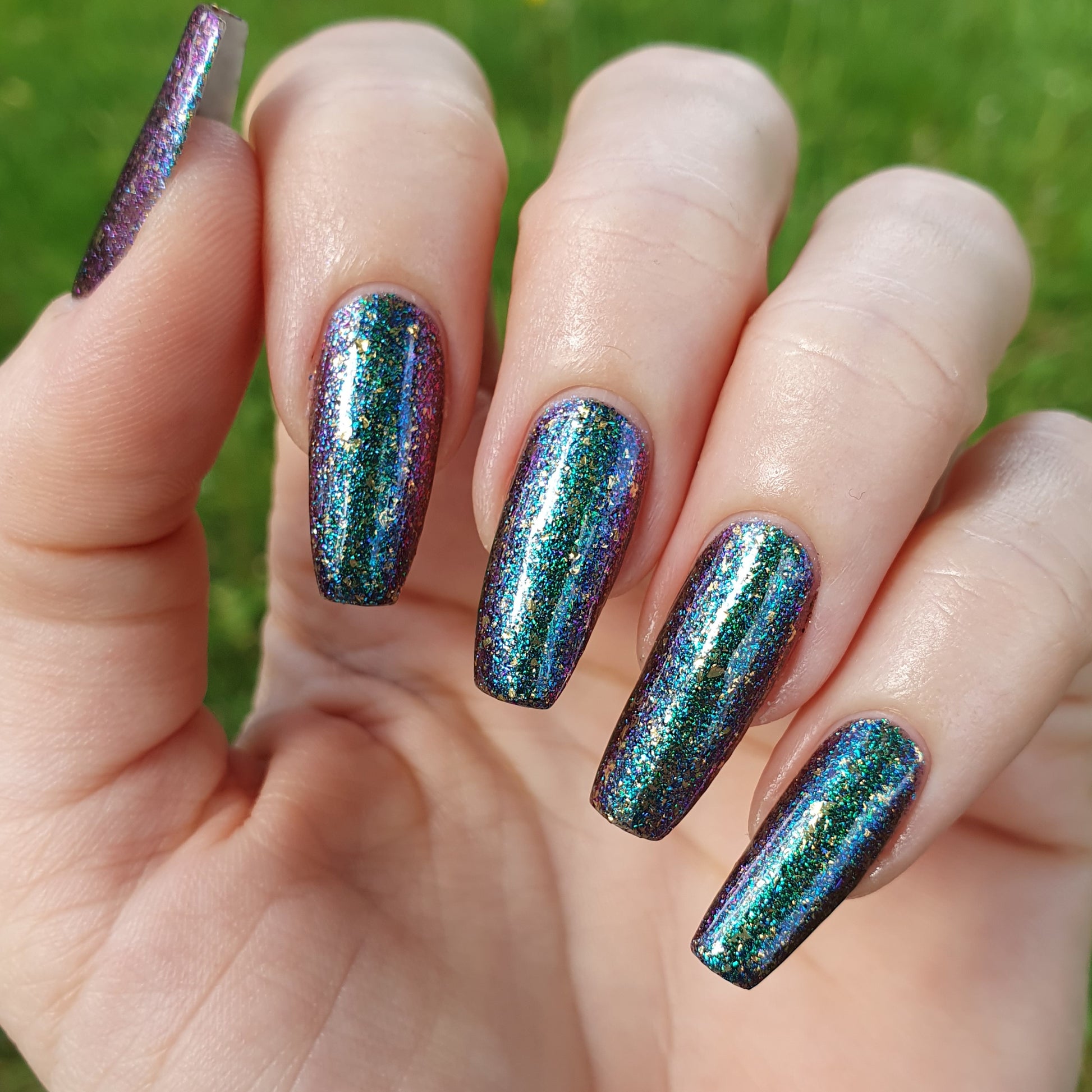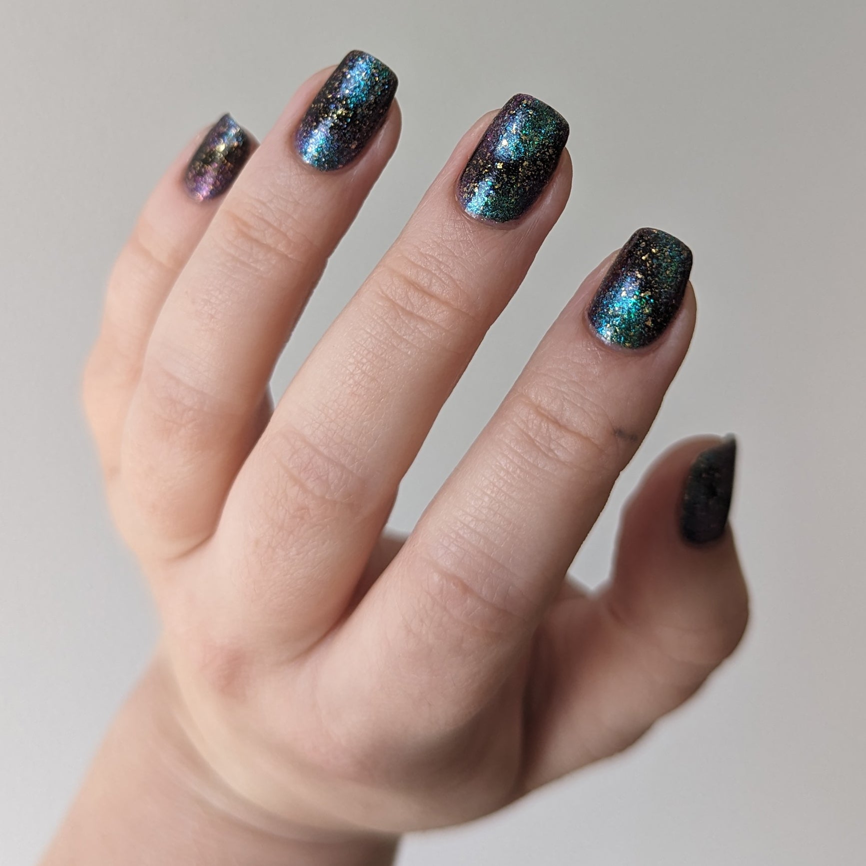 Divine Punishment has a black jelly base with green & purple magnetic shimmer and gold metallic flakes. The larger particle size of the magnetic shimmer creates stunning shifts from green to purple regardless of magnetizing technique!