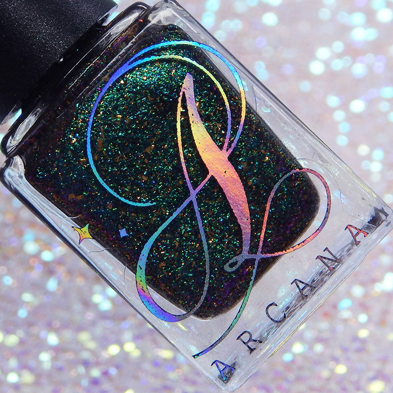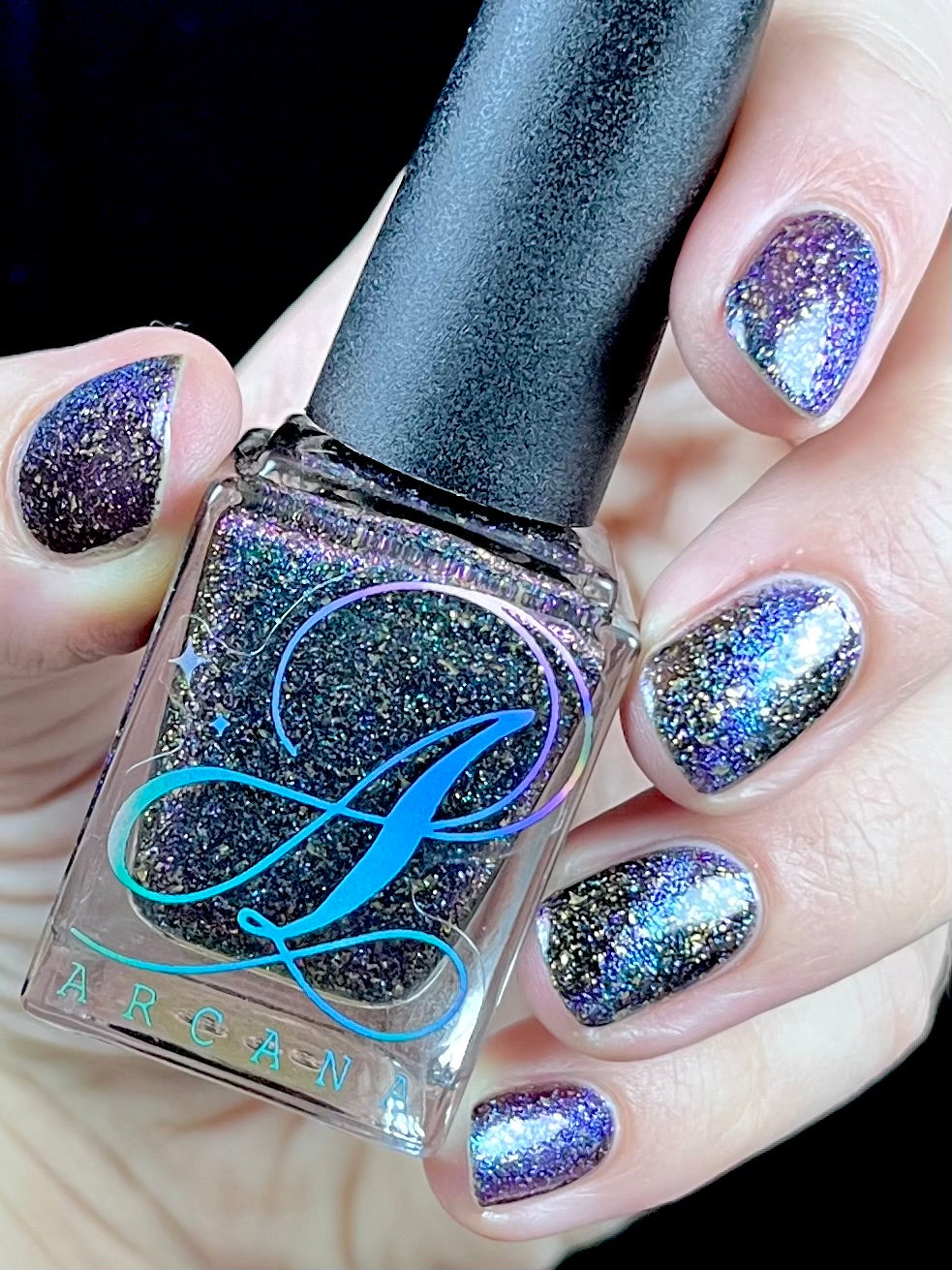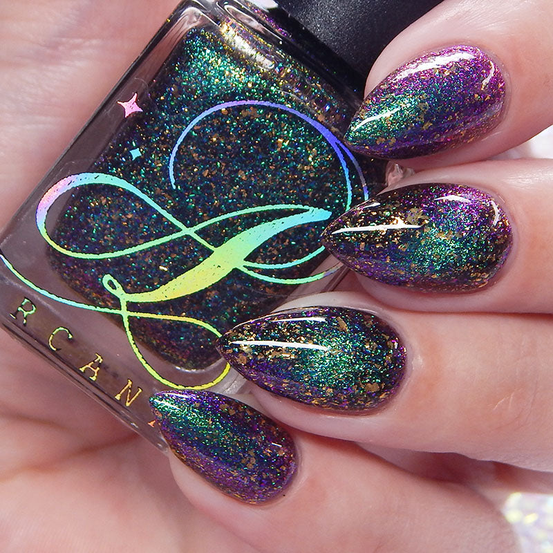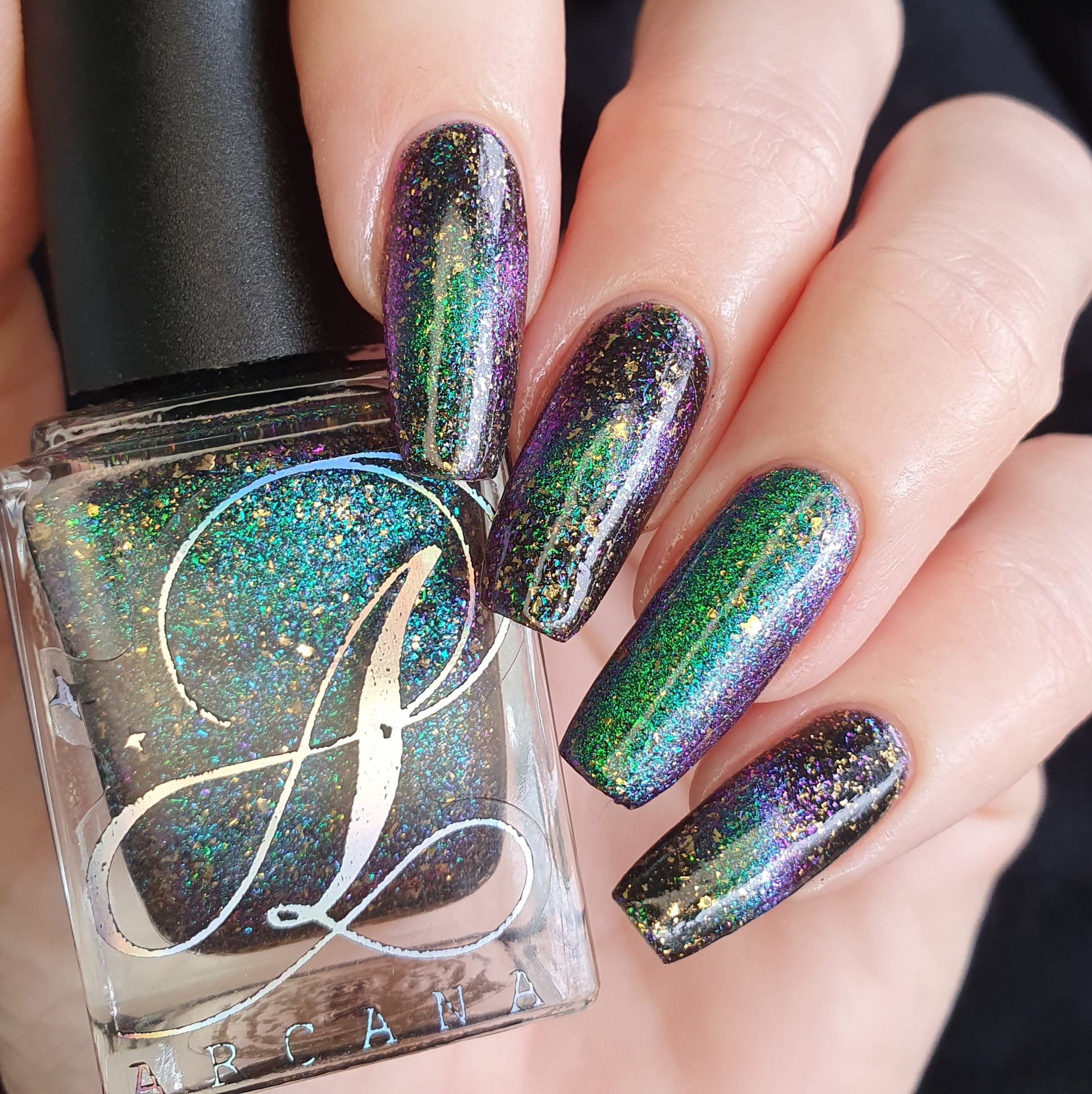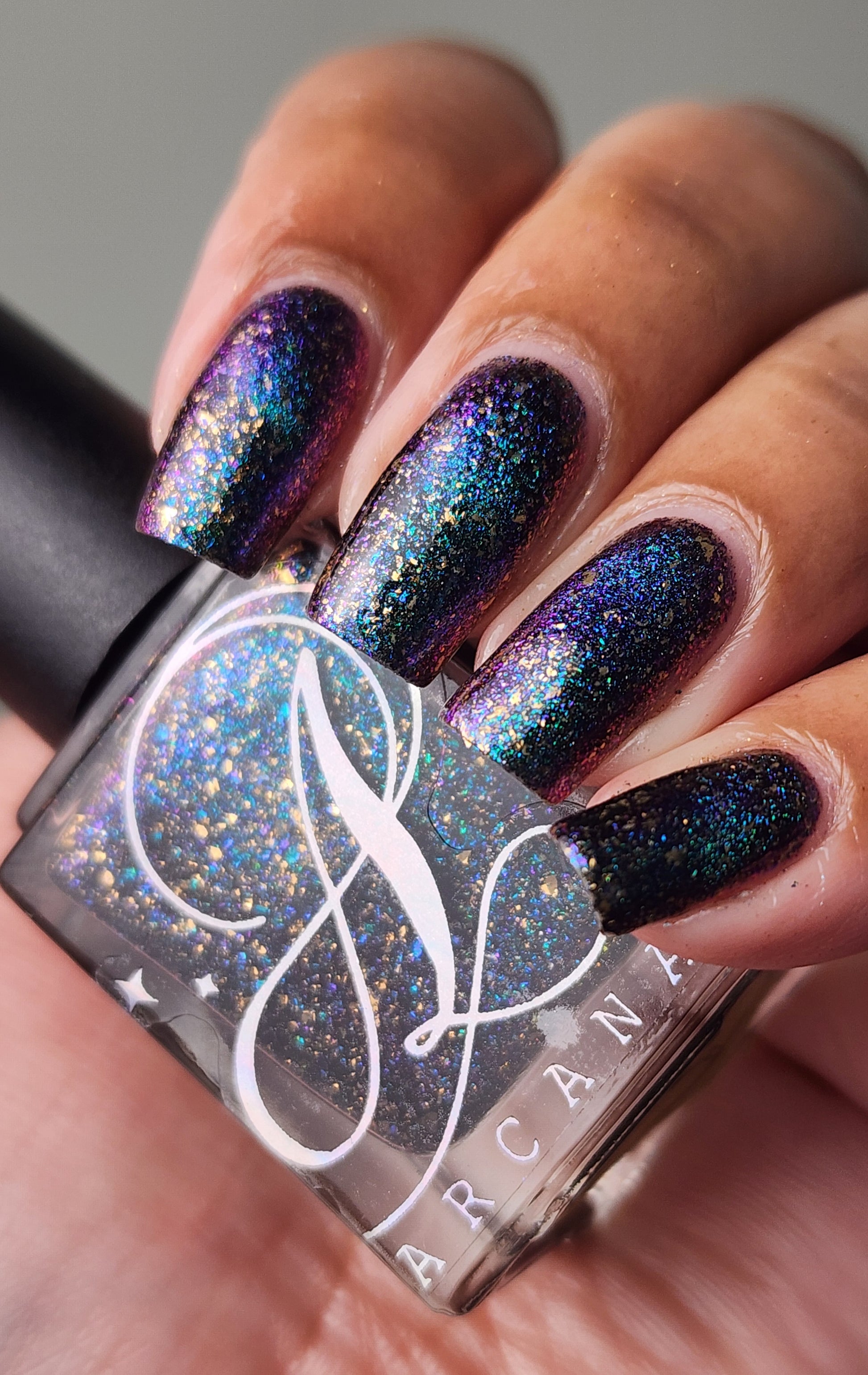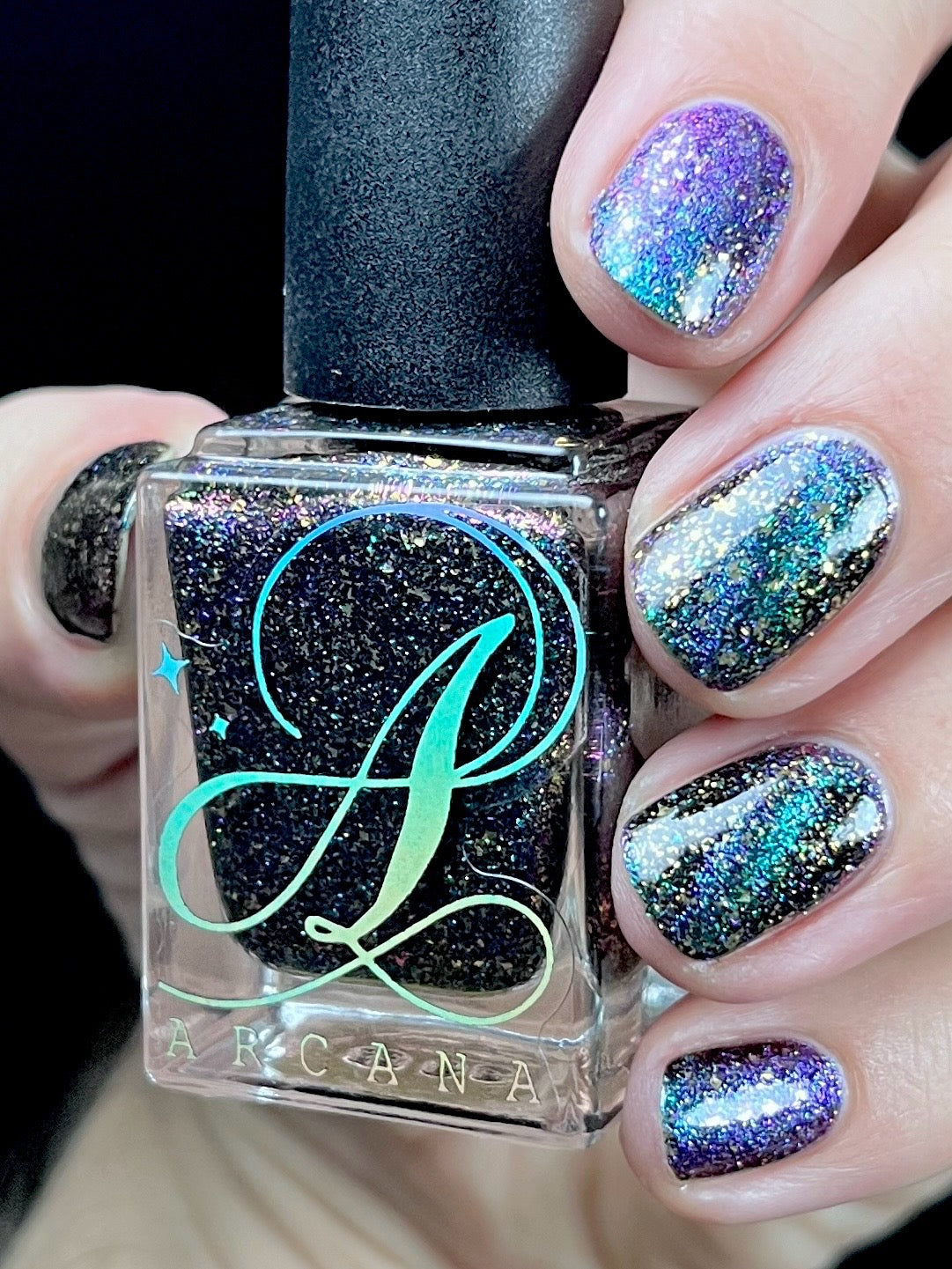 Divine Punishment has a black jelly base with green & purple magnetic shimmer and gold metallic flakes. The larger particle size of the magnetic shimmer creates stunning shifts from green to purple regardless of magnetizing technique!