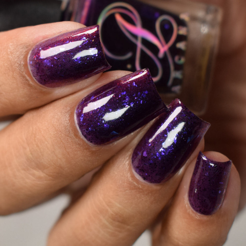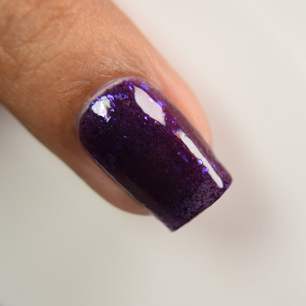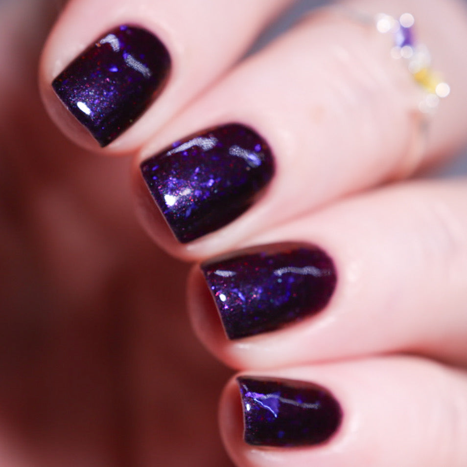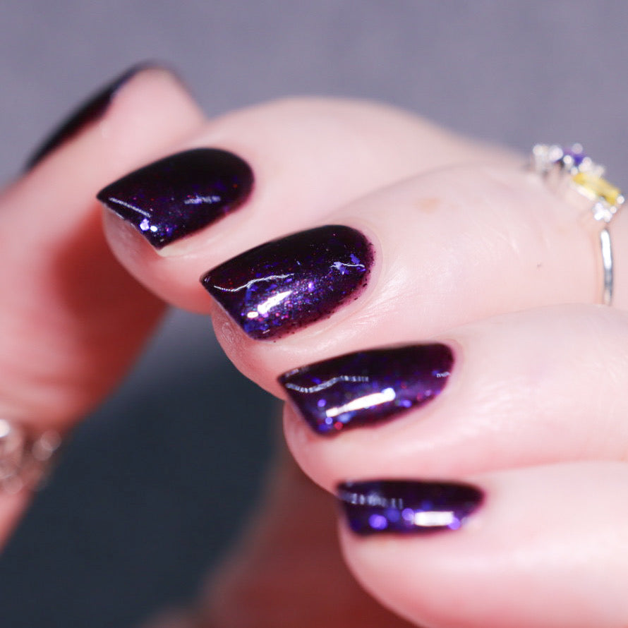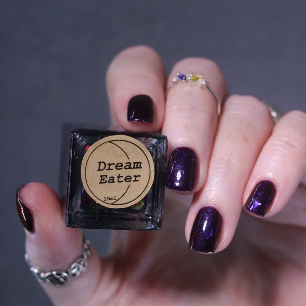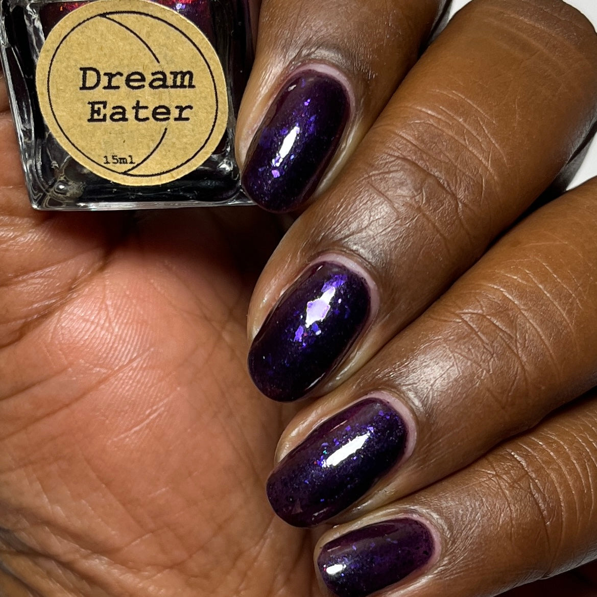 Dream Eater has a dark purple jelly base with black to red multichrome shimmer in both small and medium sized particles as well as blue to purple ghost flakes - inspired by Gengar the ghost type pokemon!
