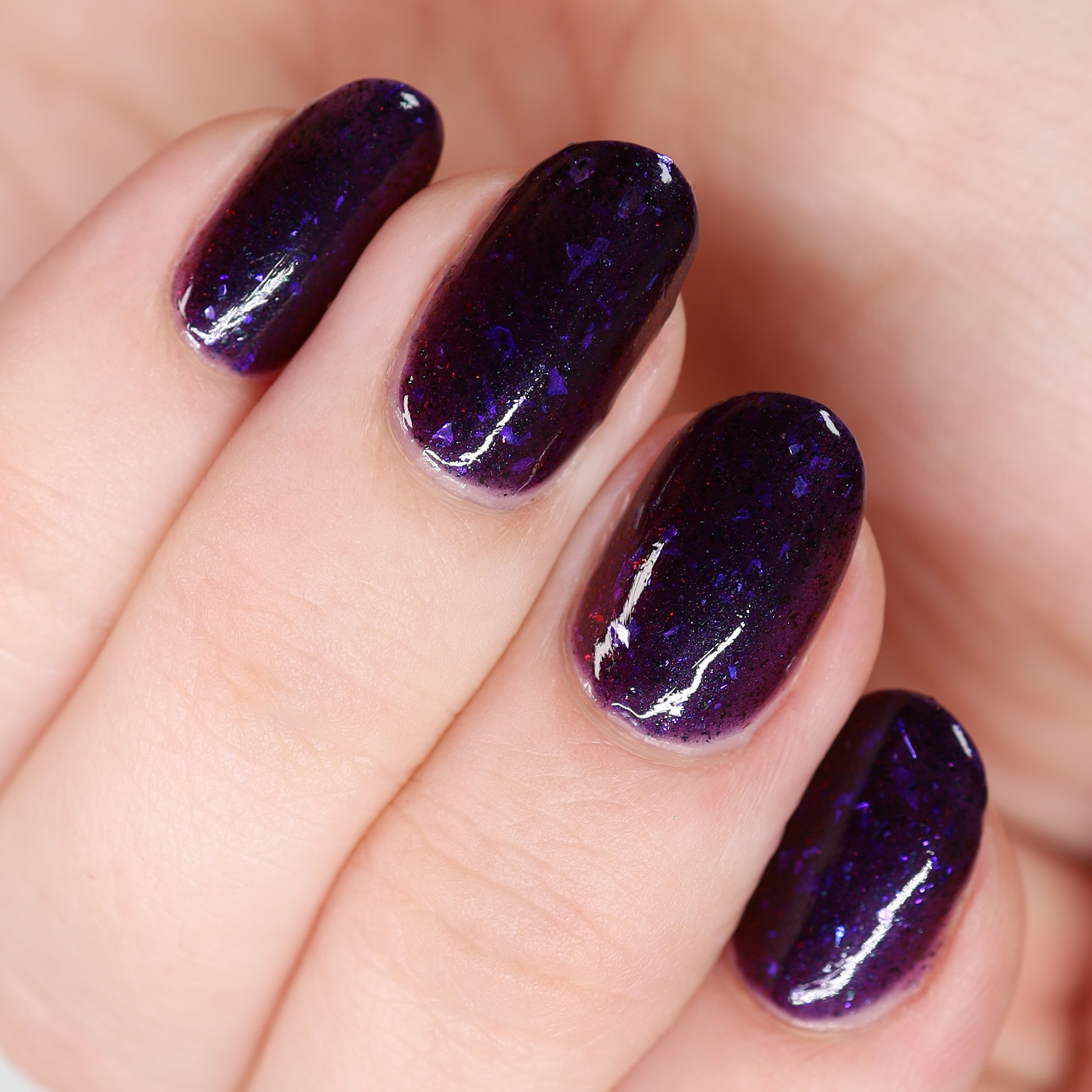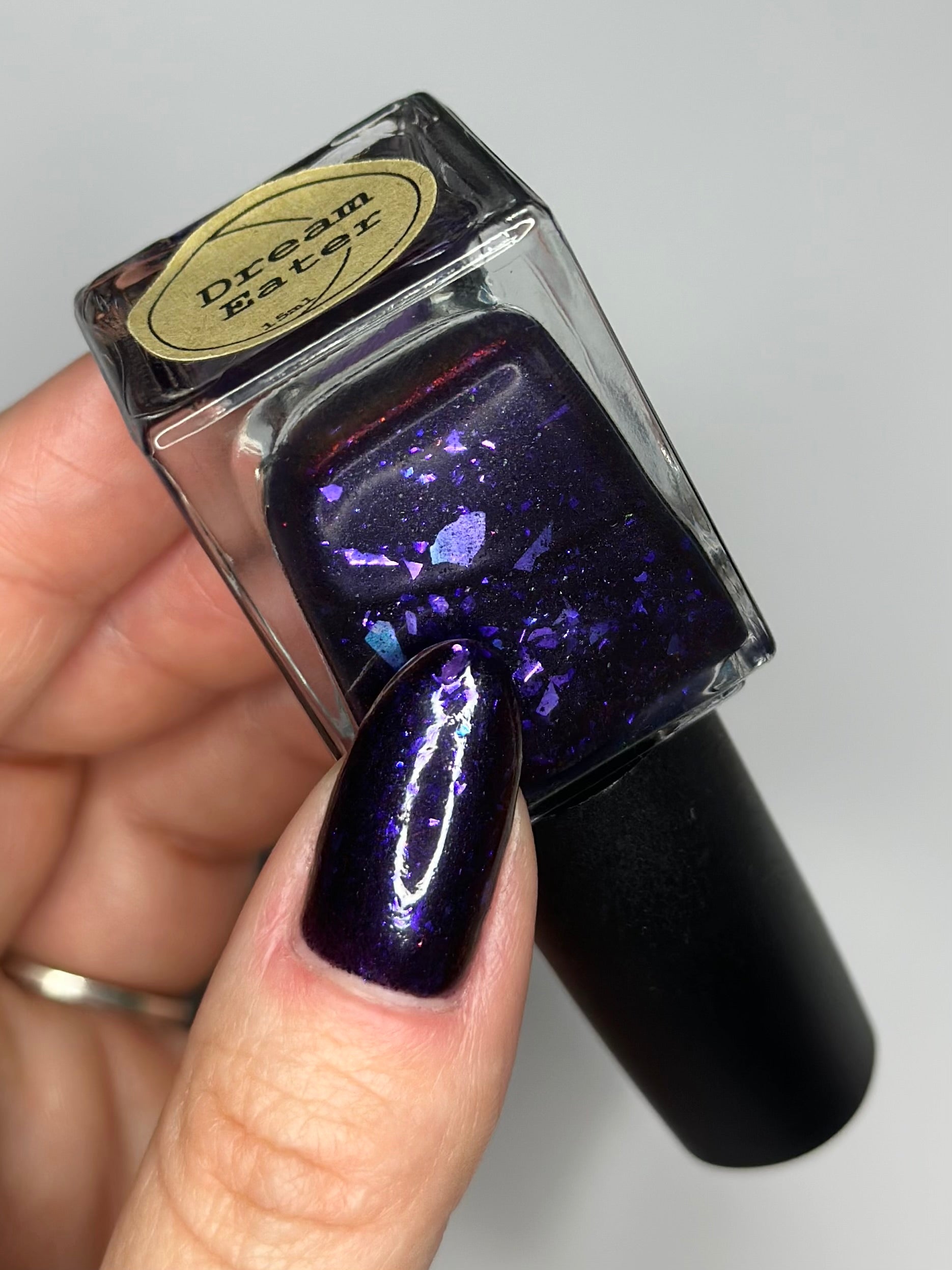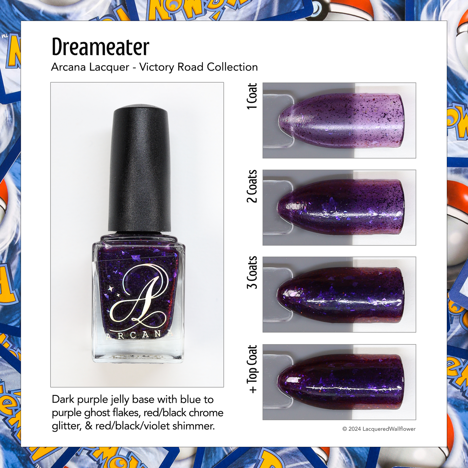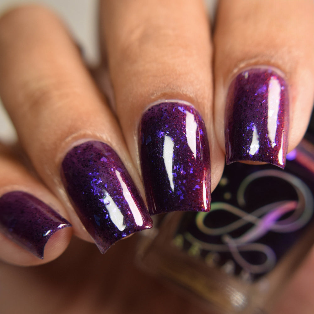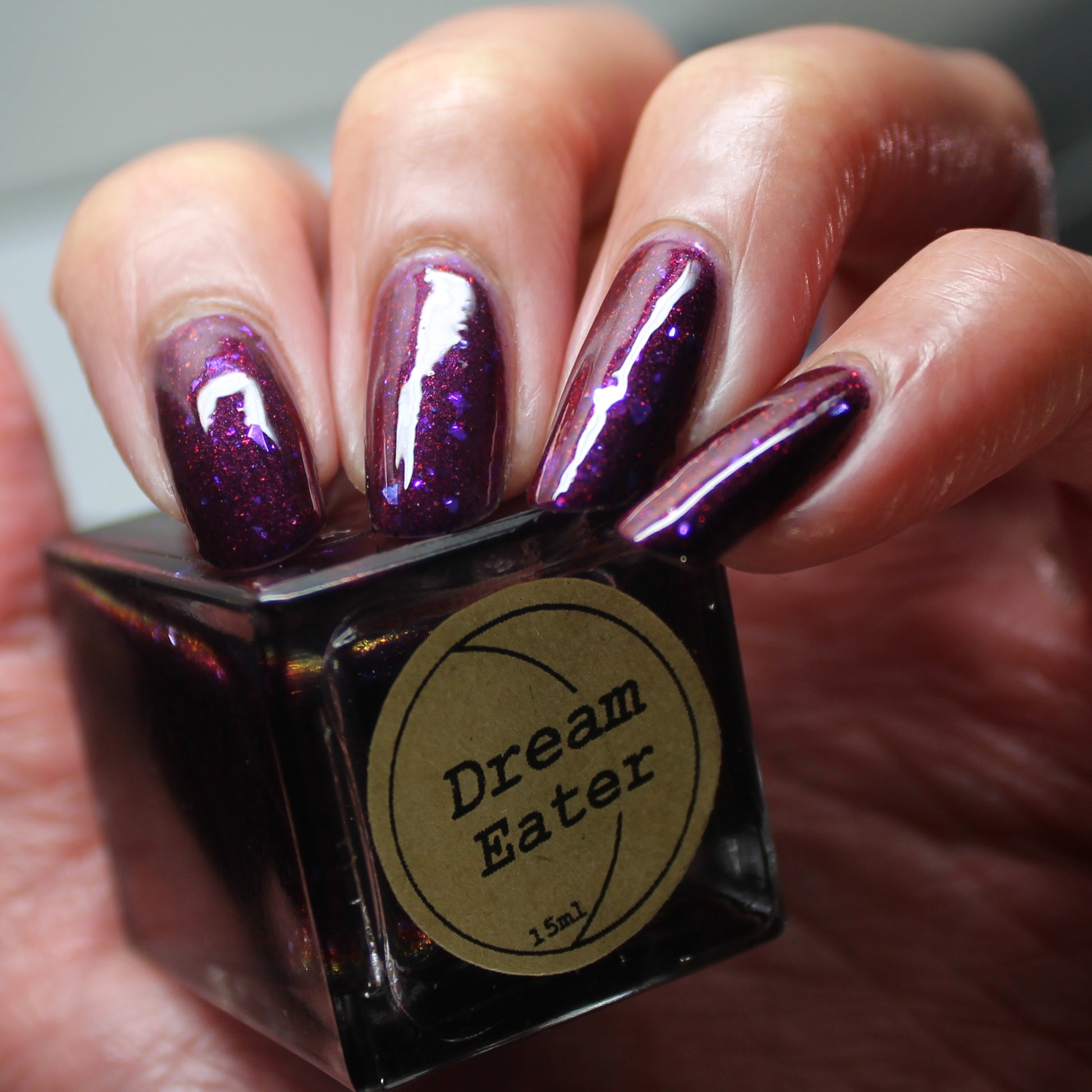 Dream Eater has a dark purple jelly base with black to red multichrome shimmer in both small and medium sized particles as well as blue to purple ghost flakes - inspired by Gengar the ghost type pokemon!
