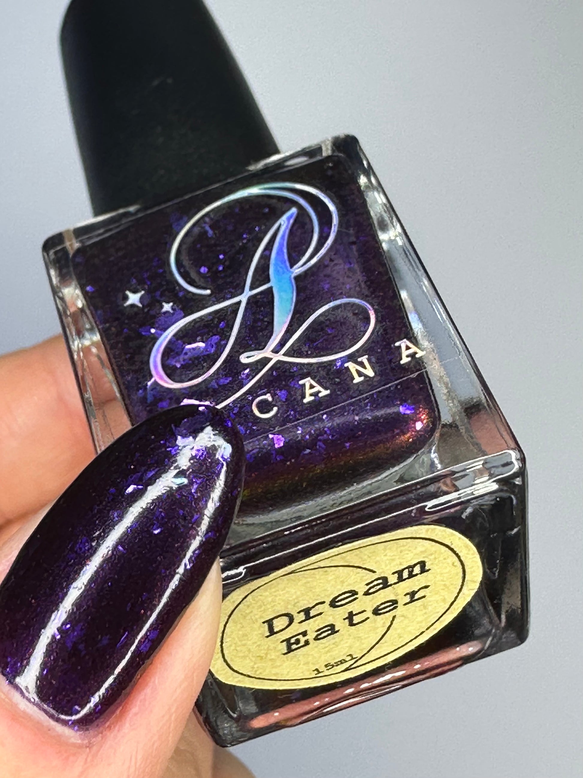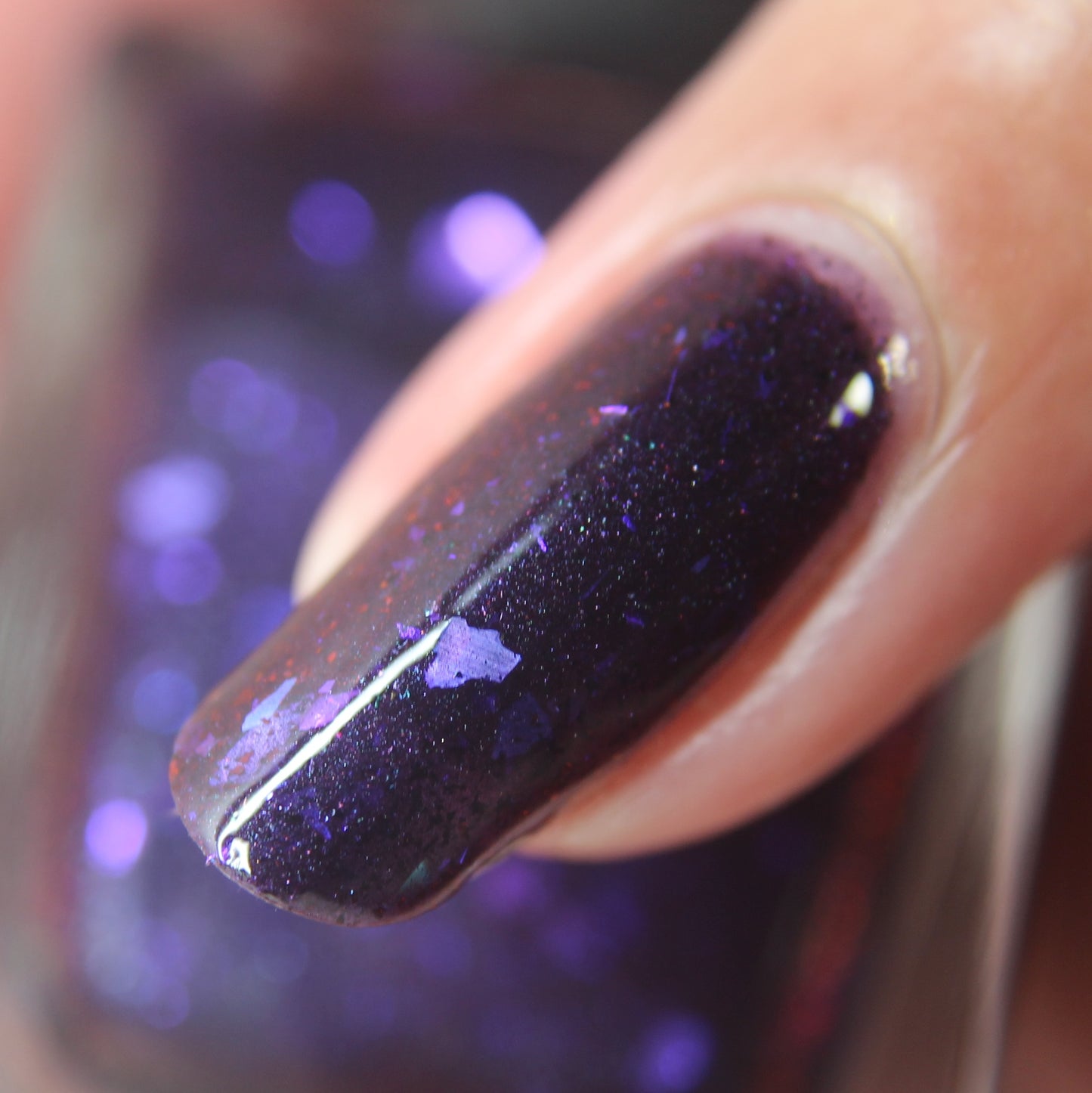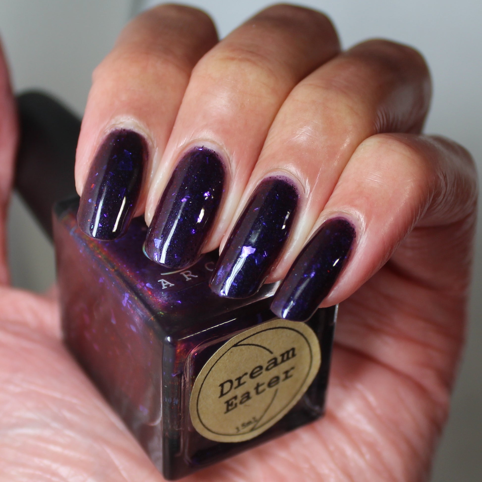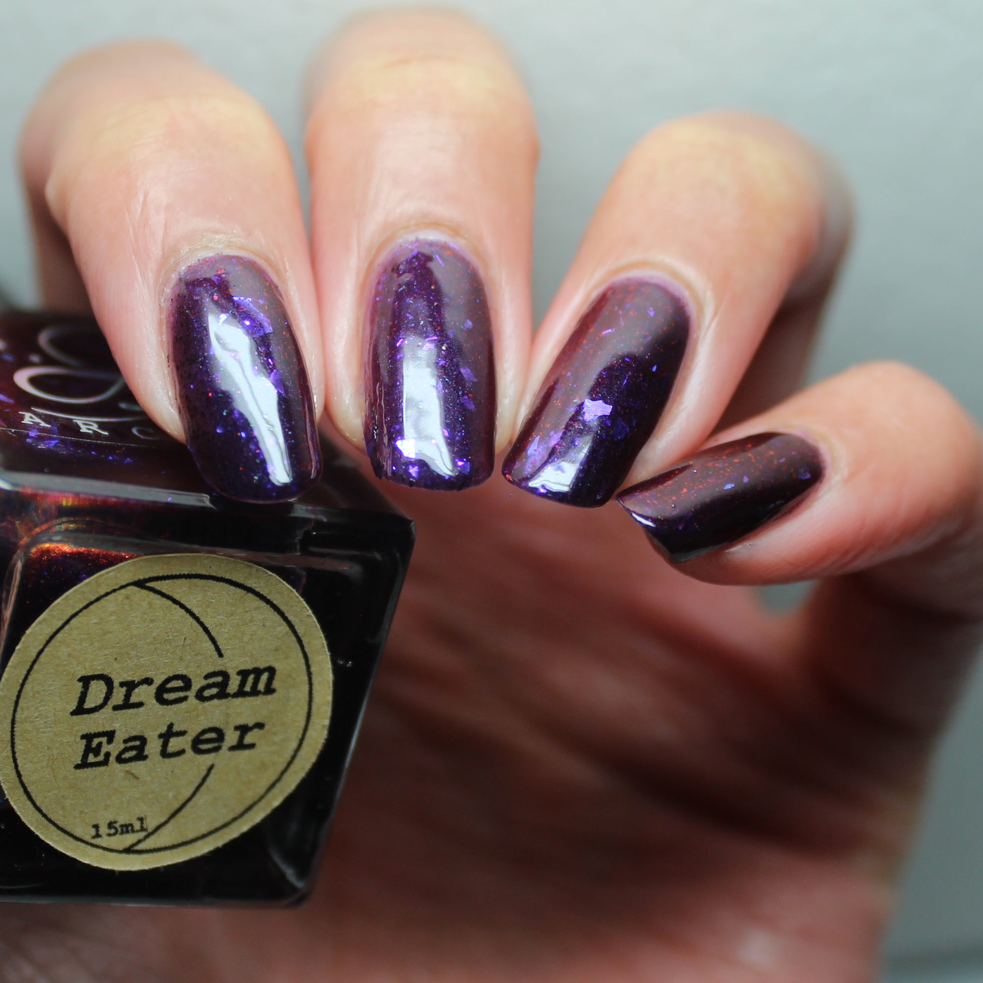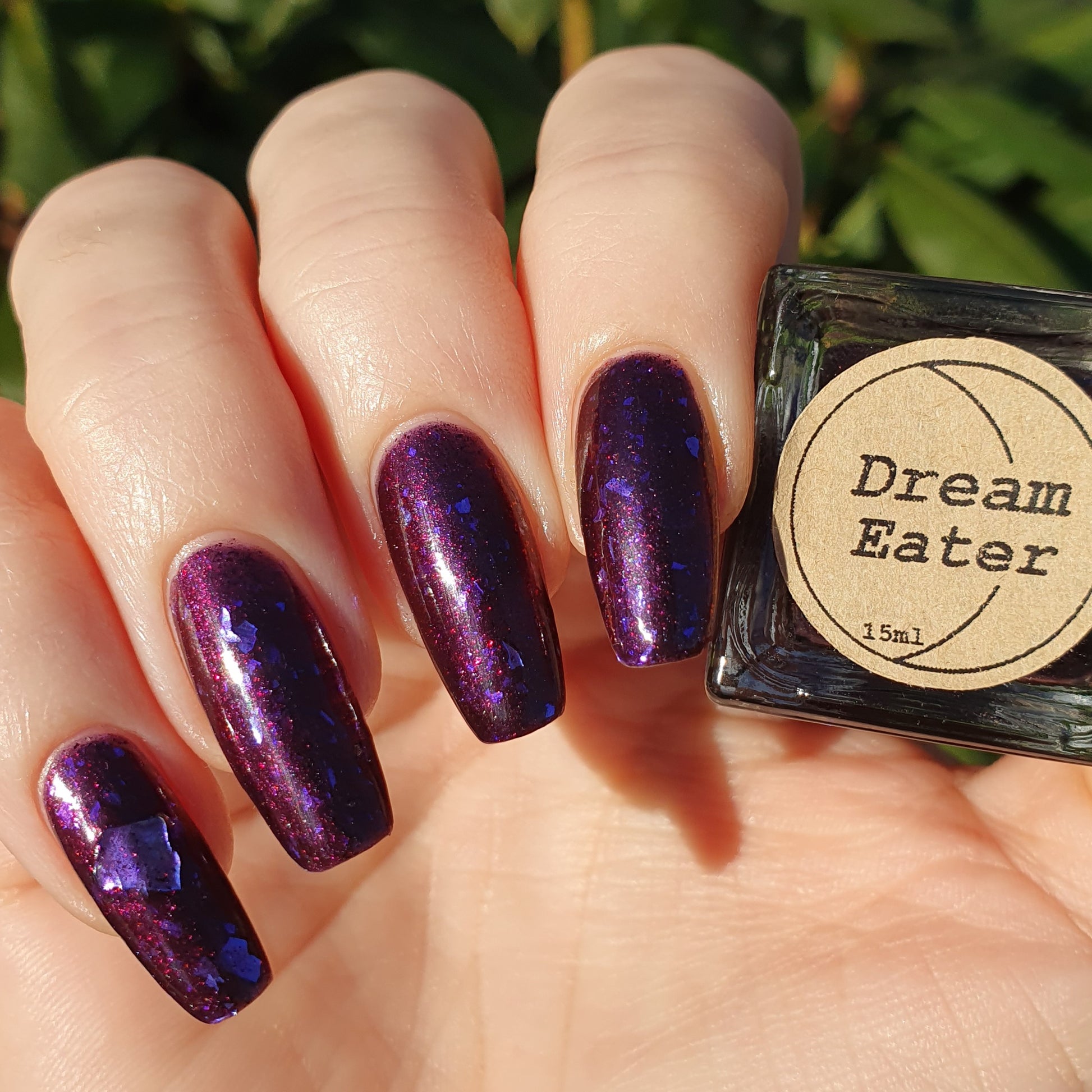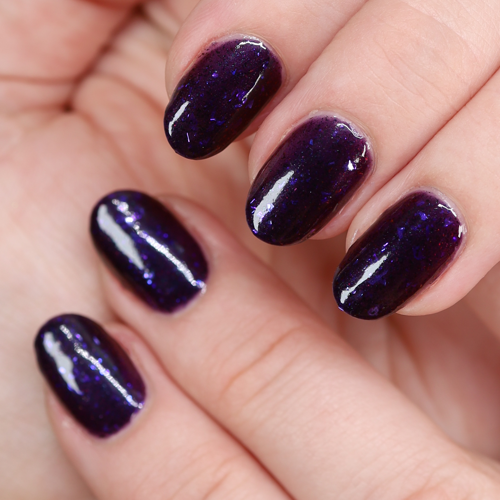 Dream Eater has a dark purple jelly base with black to red multichrome shimmer in both small and medium sized particles as well as blue to purple ghost flakes - inspired by Gengar the ghost type pokemon!