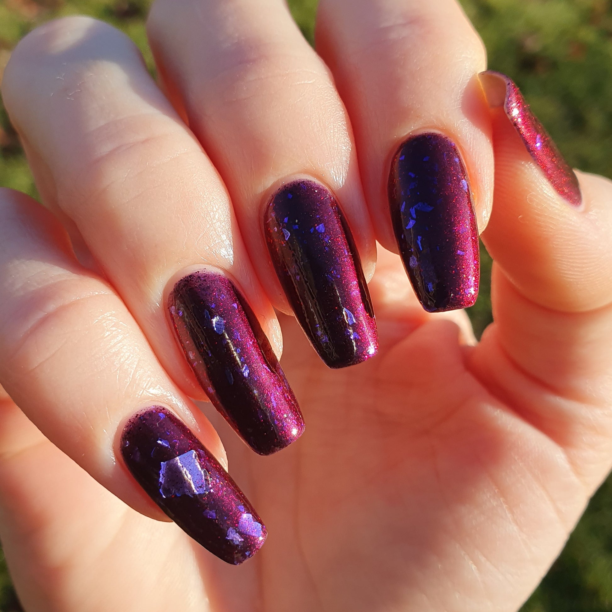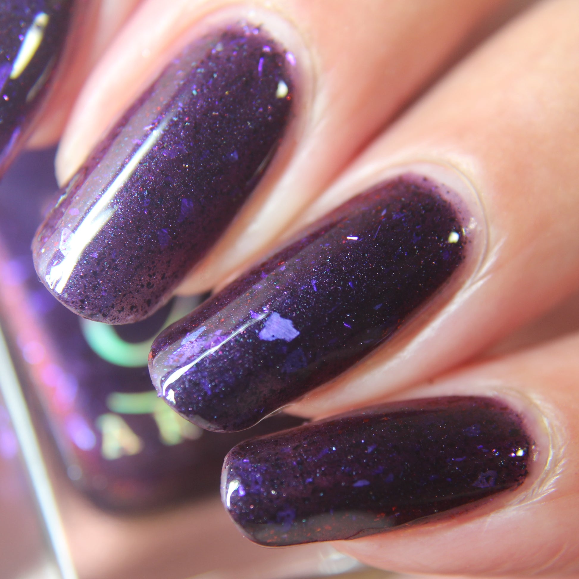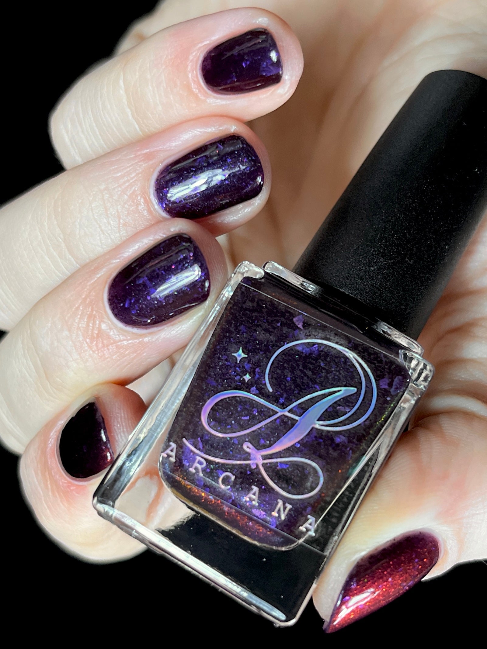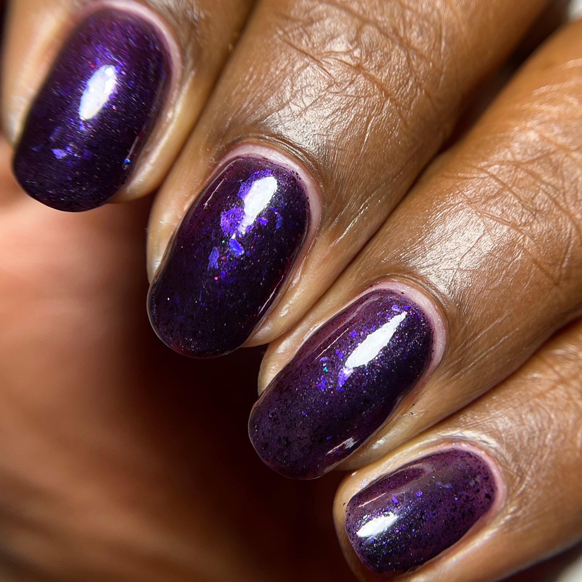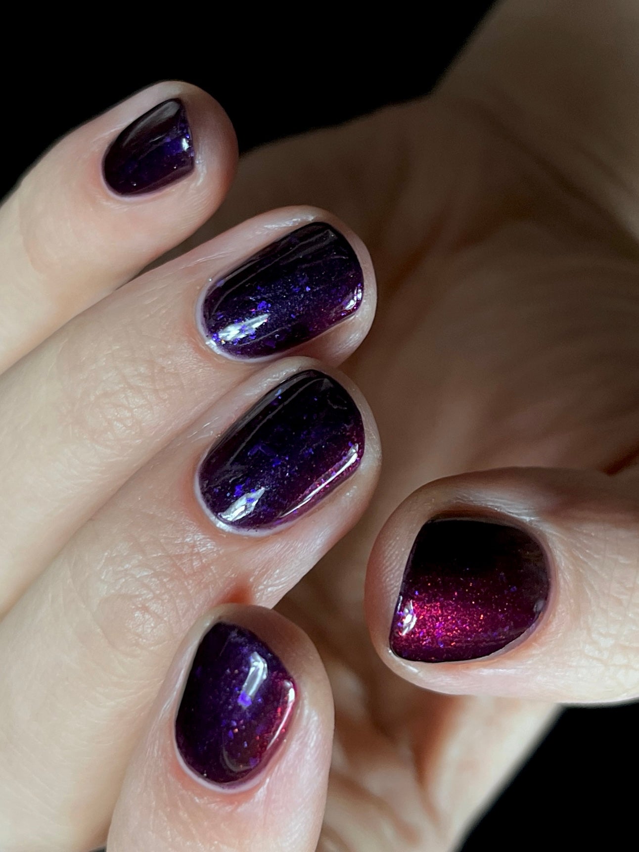 Dream Eater has a dark purple jelly base with black to red multichrome shimmer in both small and medium sized particles as well as blue to purple ghost flakes - inspired by Gengar the ghost type pokemon!
