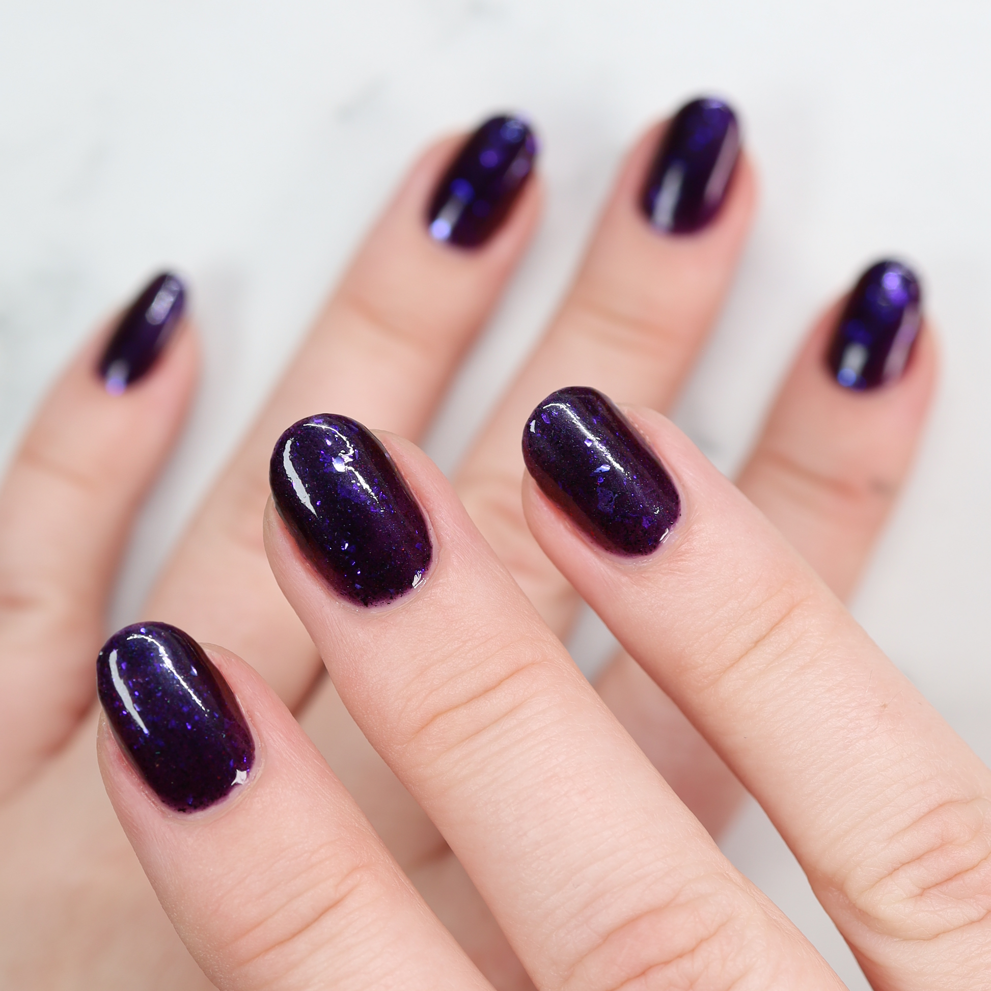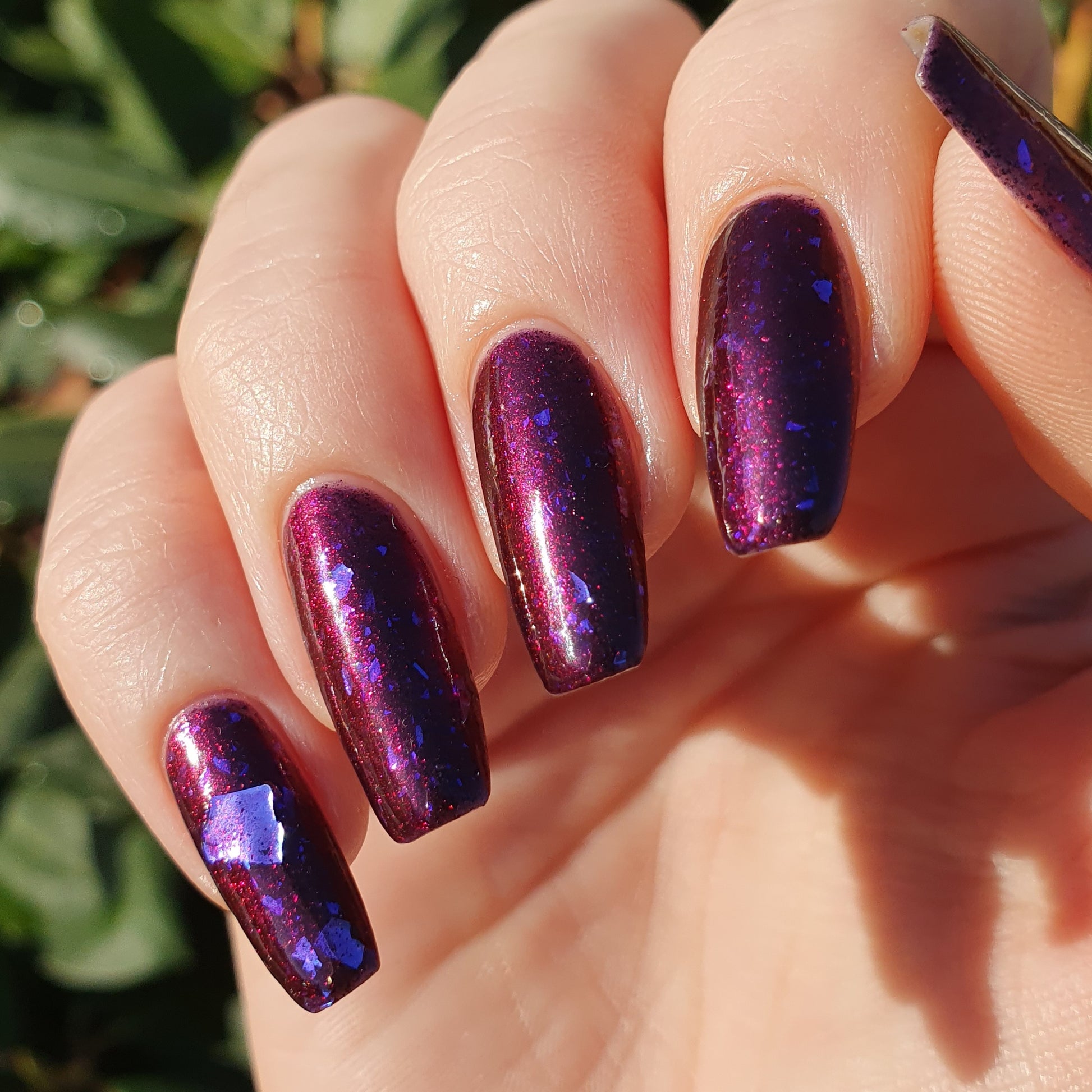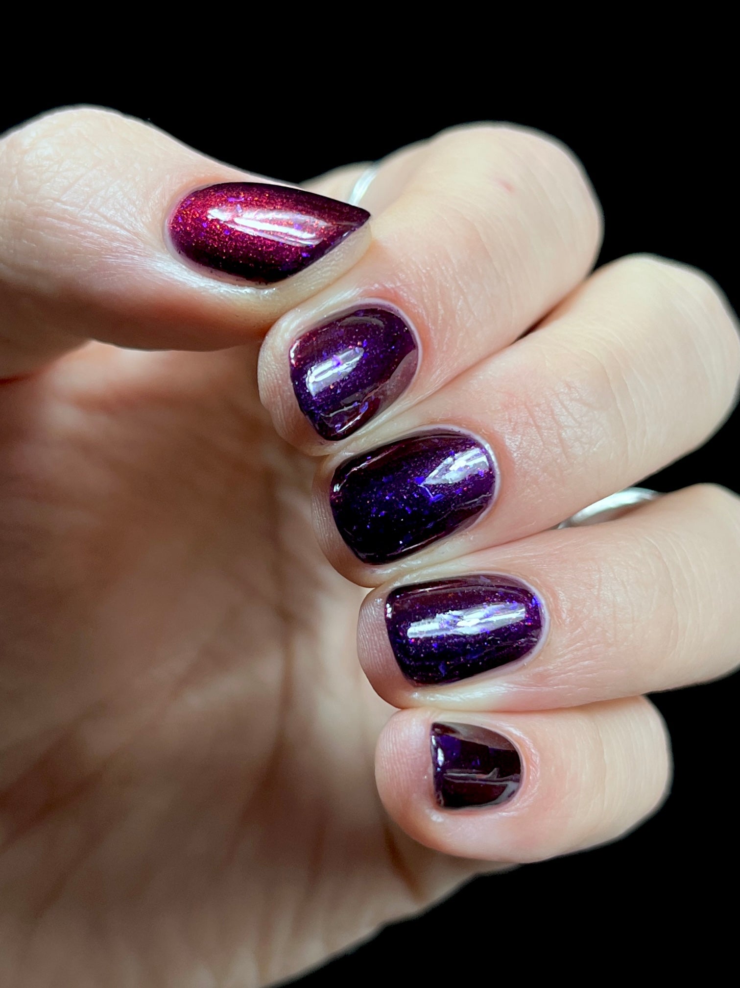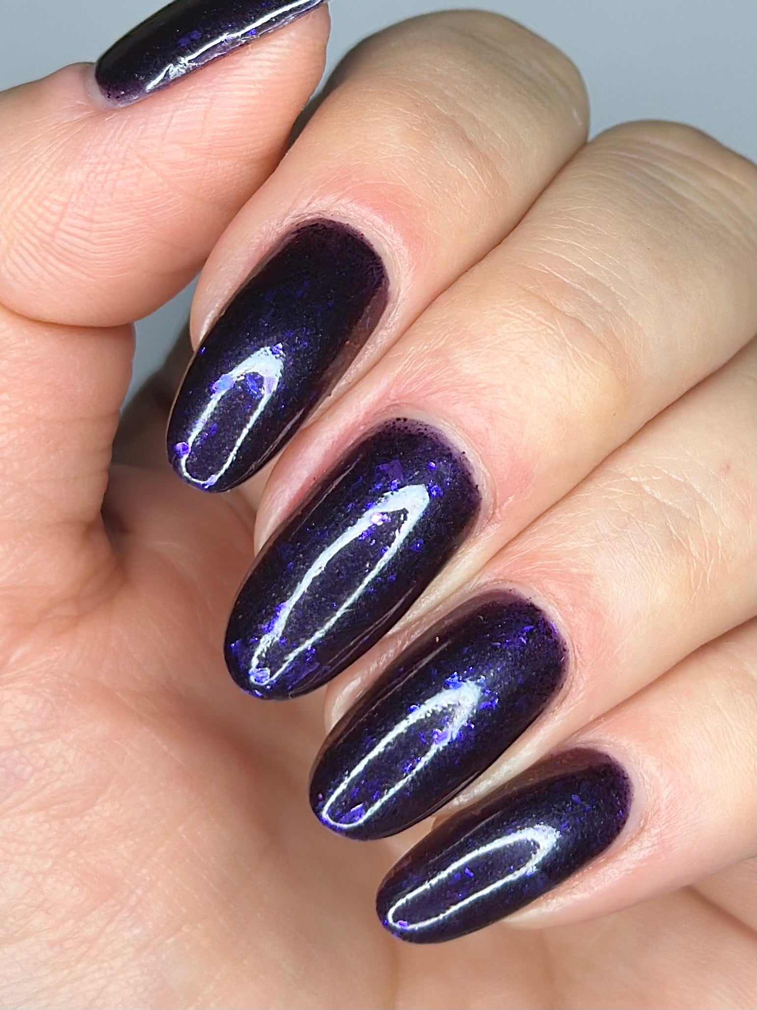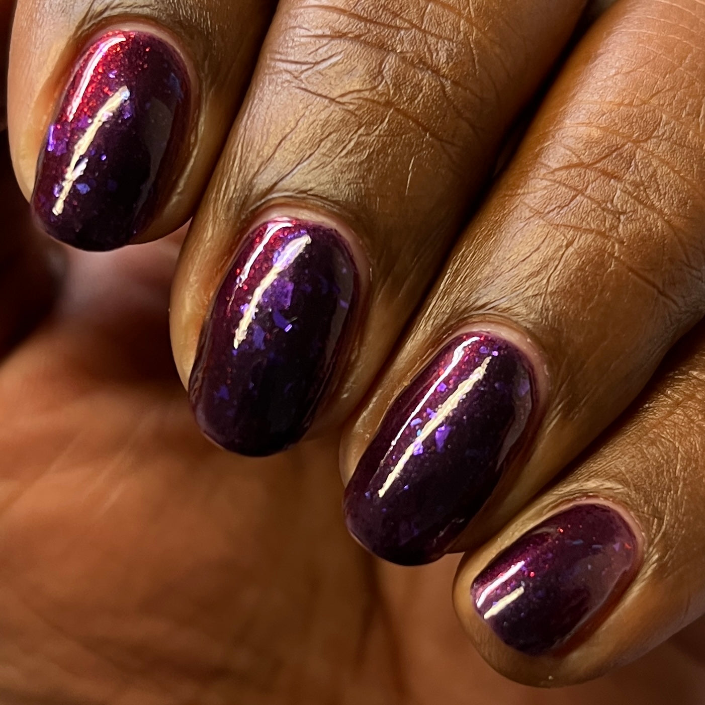 Dream Eater has a dark purple jelly base with black to red multichrome shimmer in both small and medium sized particles as well as blue to purple ghost flakes - inspired by Gengar the ghost type pokemon!