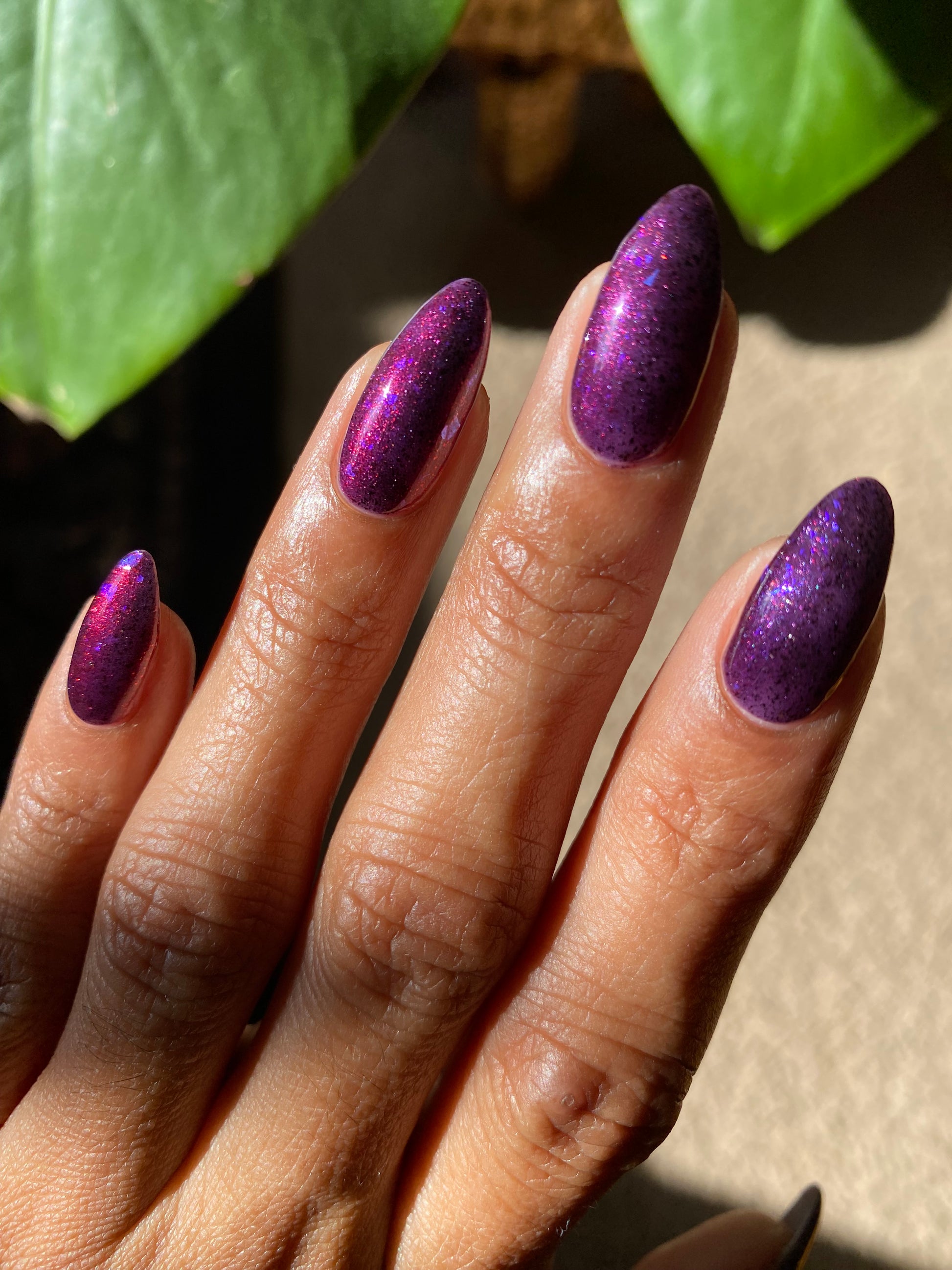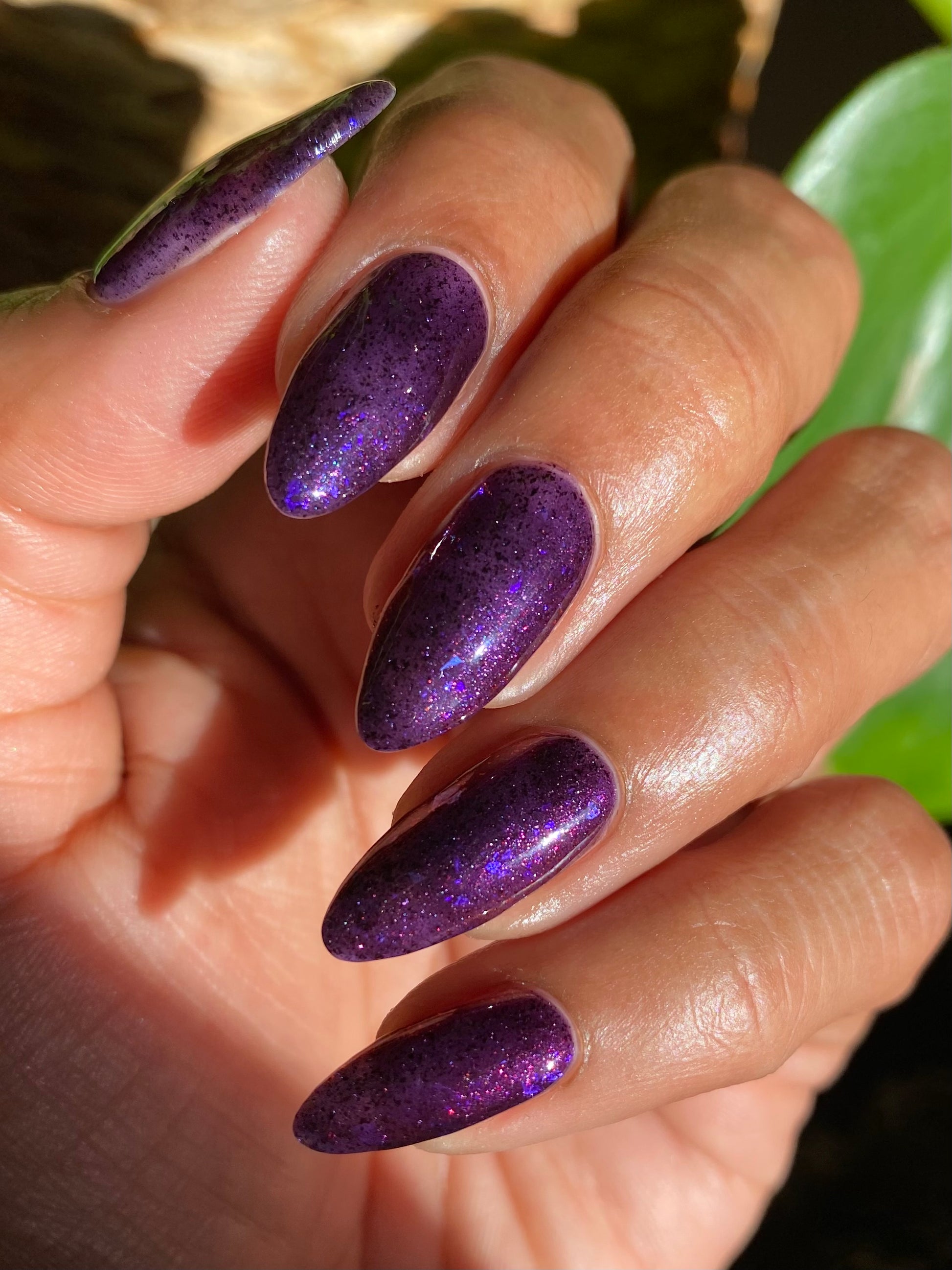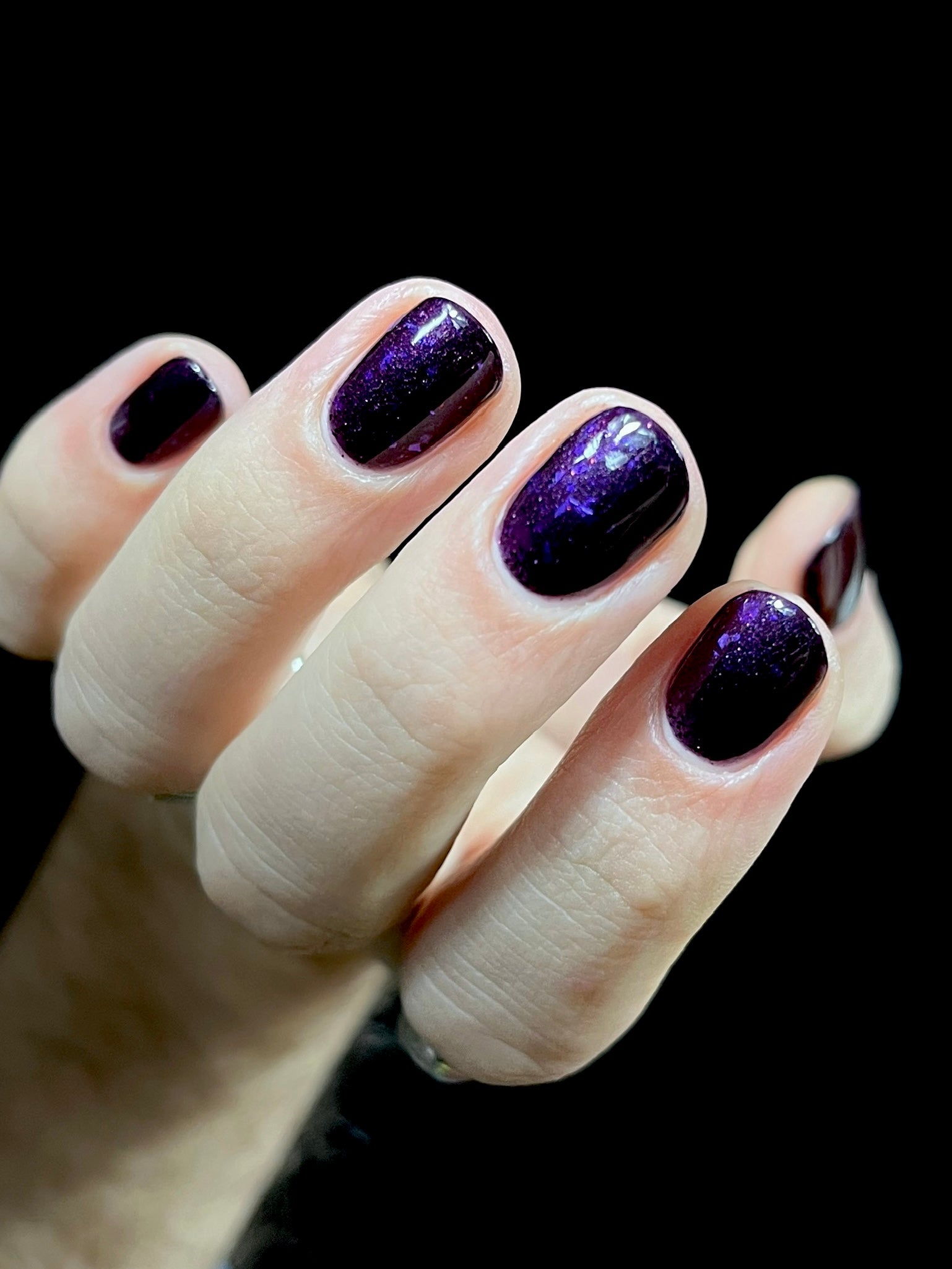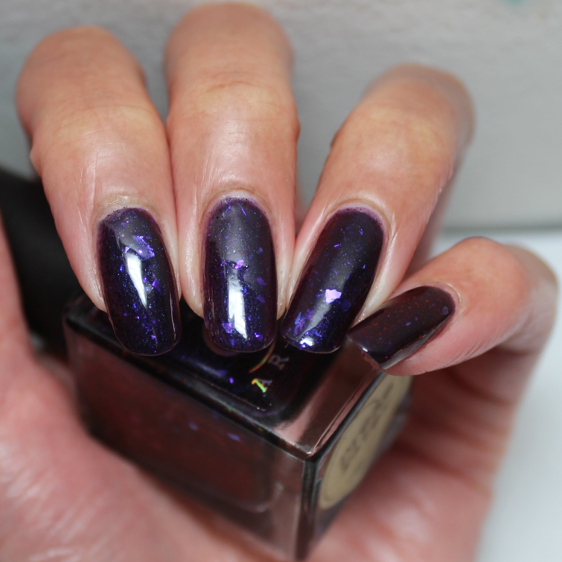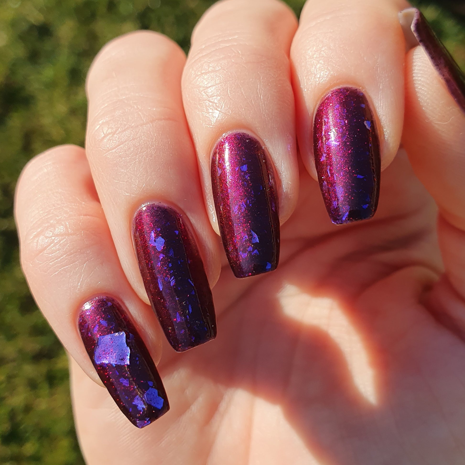 Dream Eater has a dark purple jelly base with black to red multichrome shimmer in both small and medium sized particles as well as blue to purple ghost flakes - inspired by Gengar the ghost type pokemon!