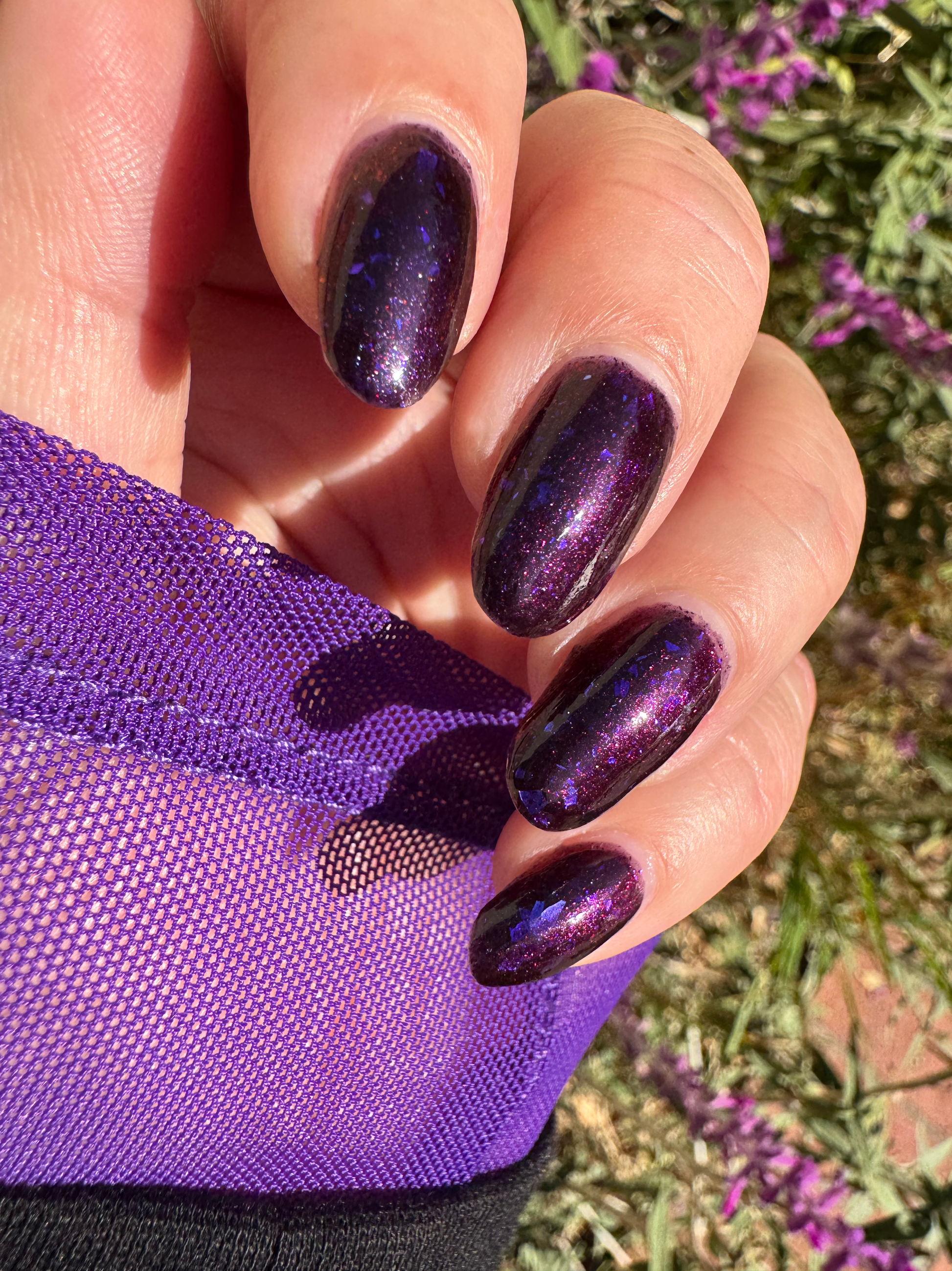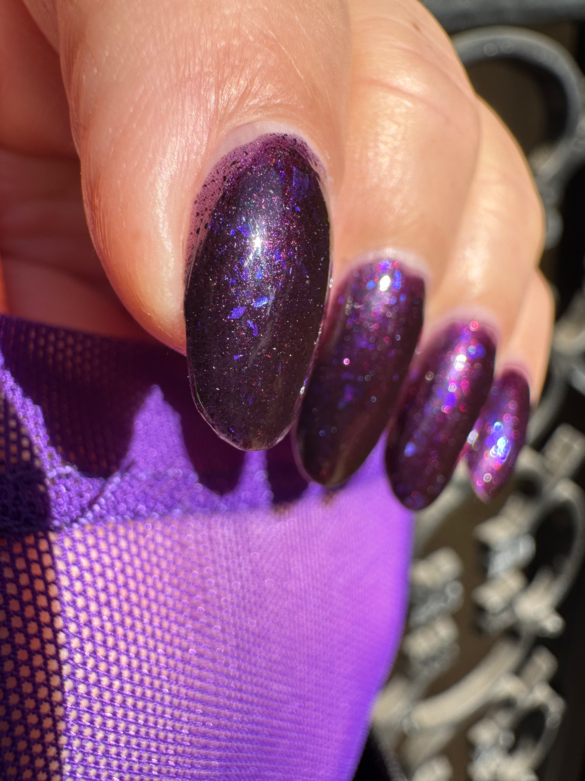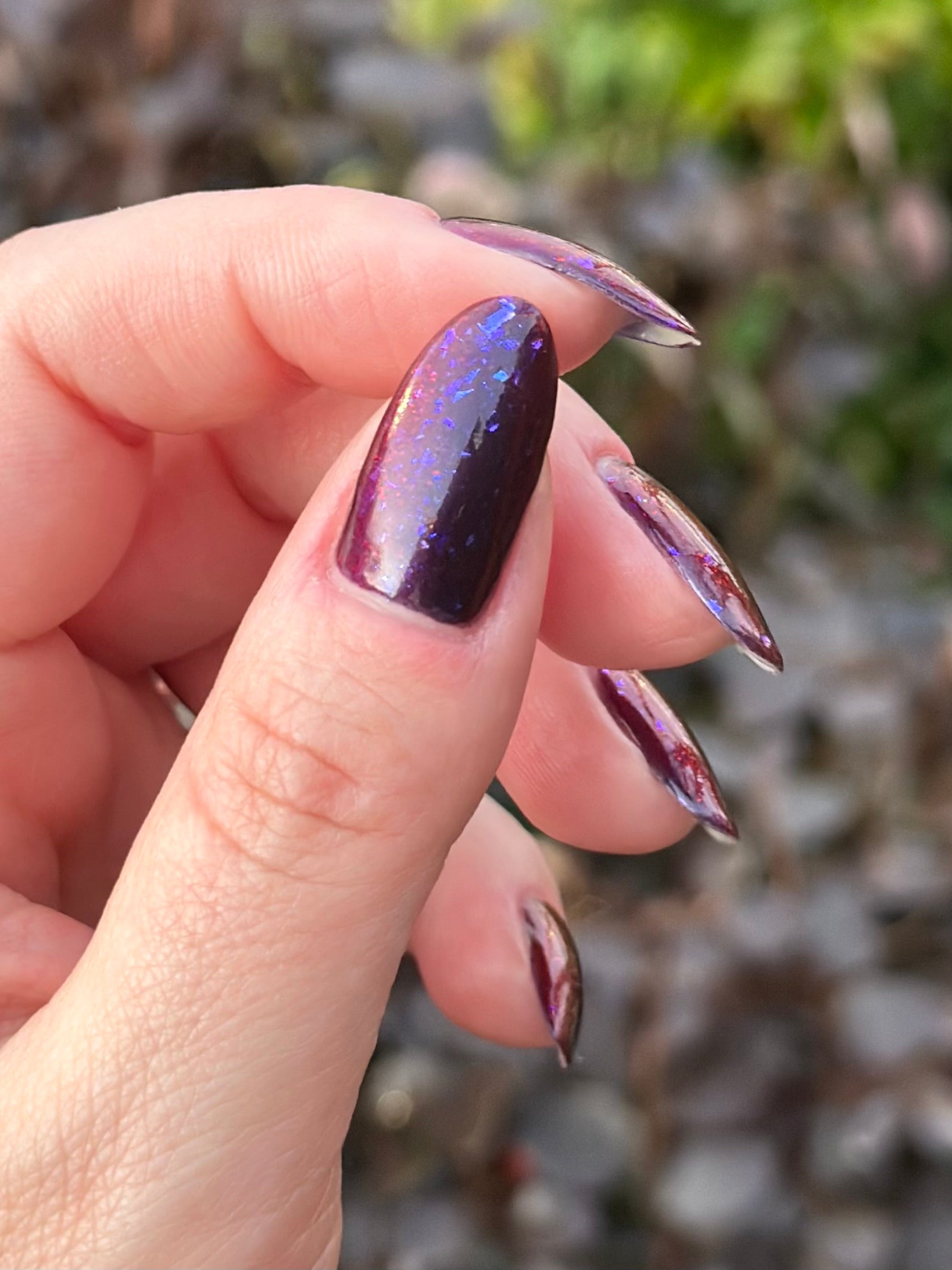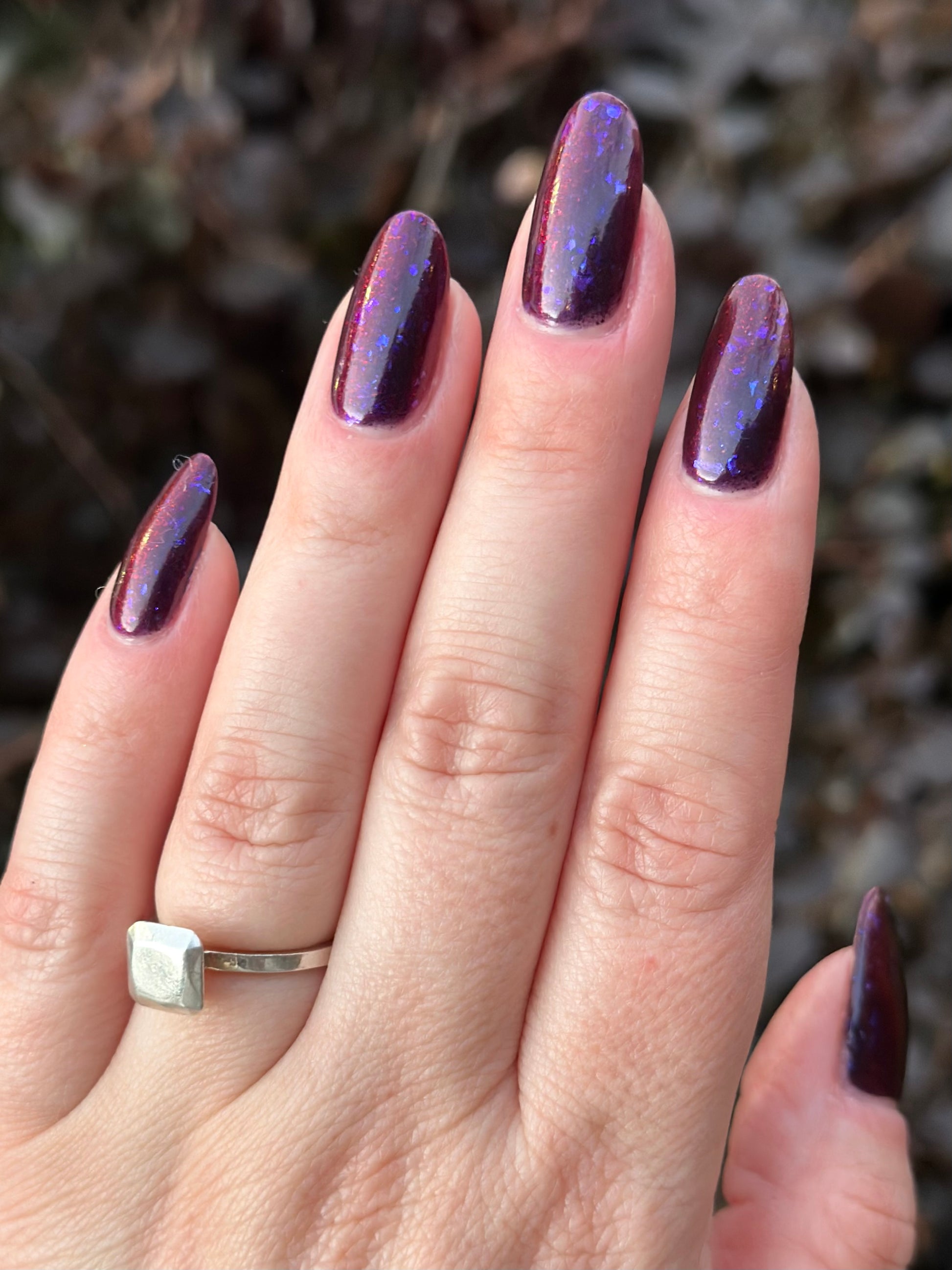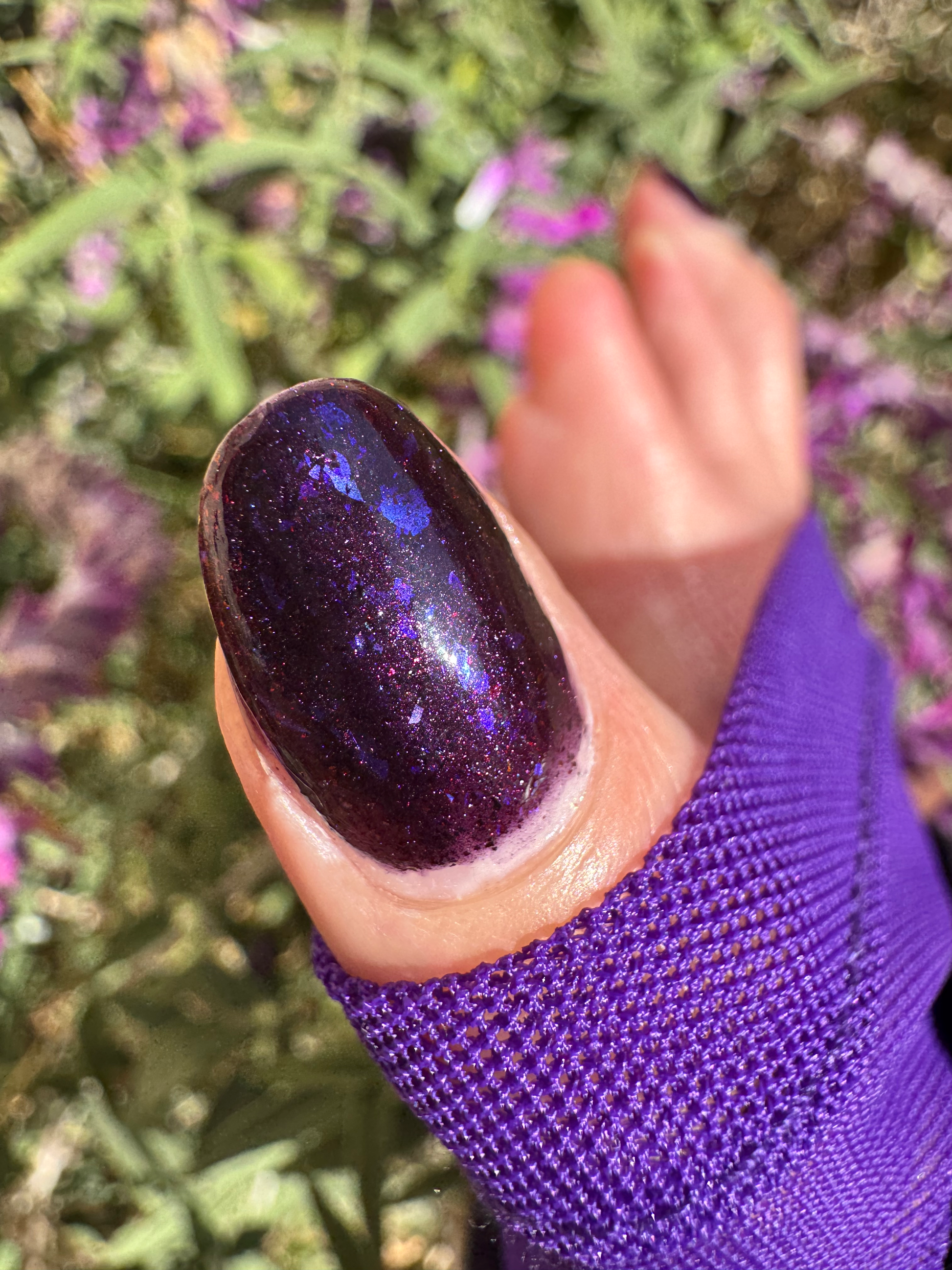 Dream Eater has a dark purple jelly base with black to red multichrome shimmer in both small and medium sized particles as well as blue to purple ghost flakes - inspired by Gengar the ghost type pokemon!
