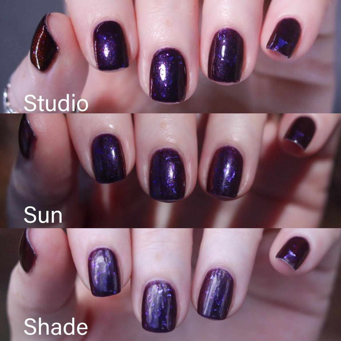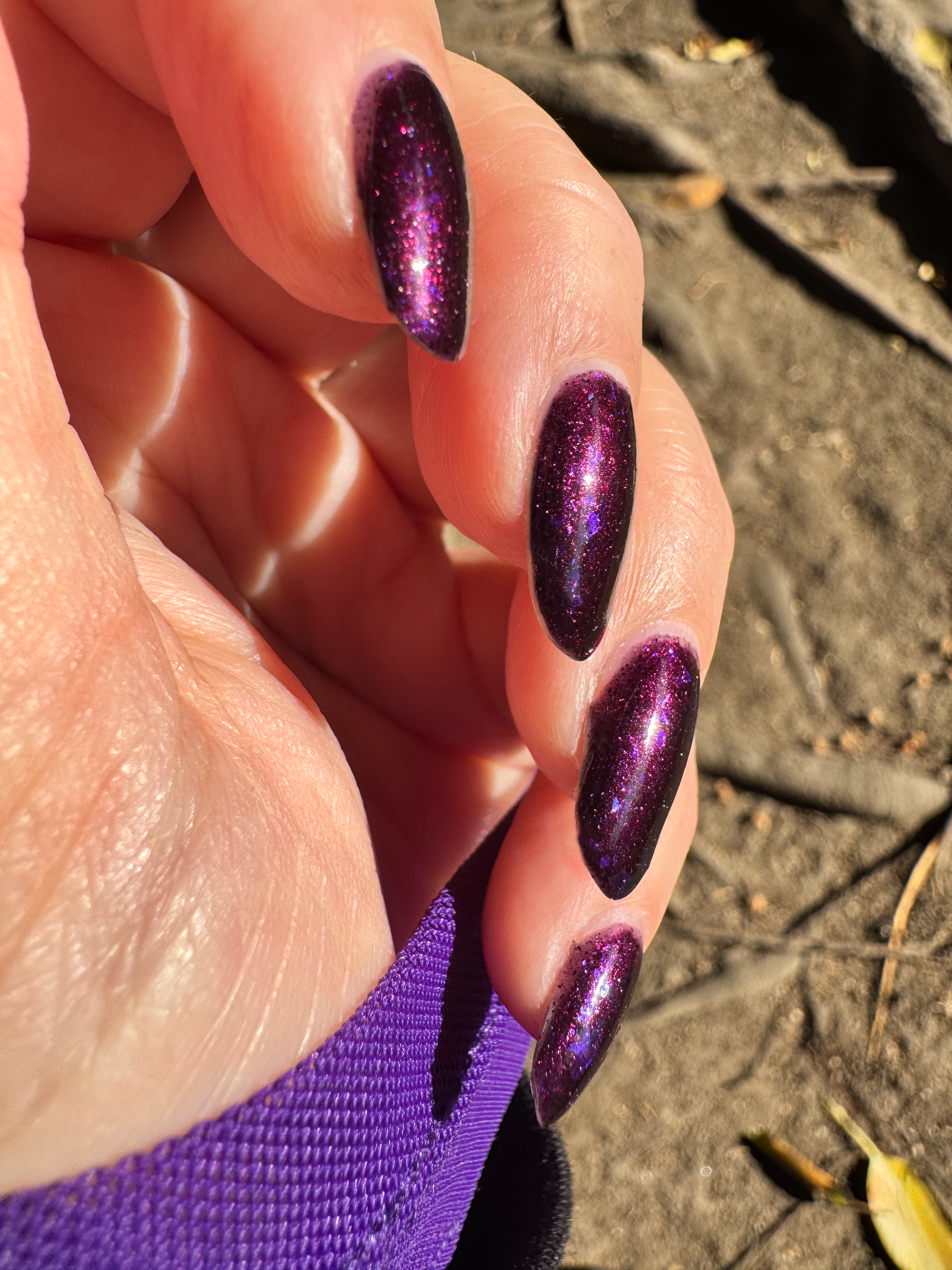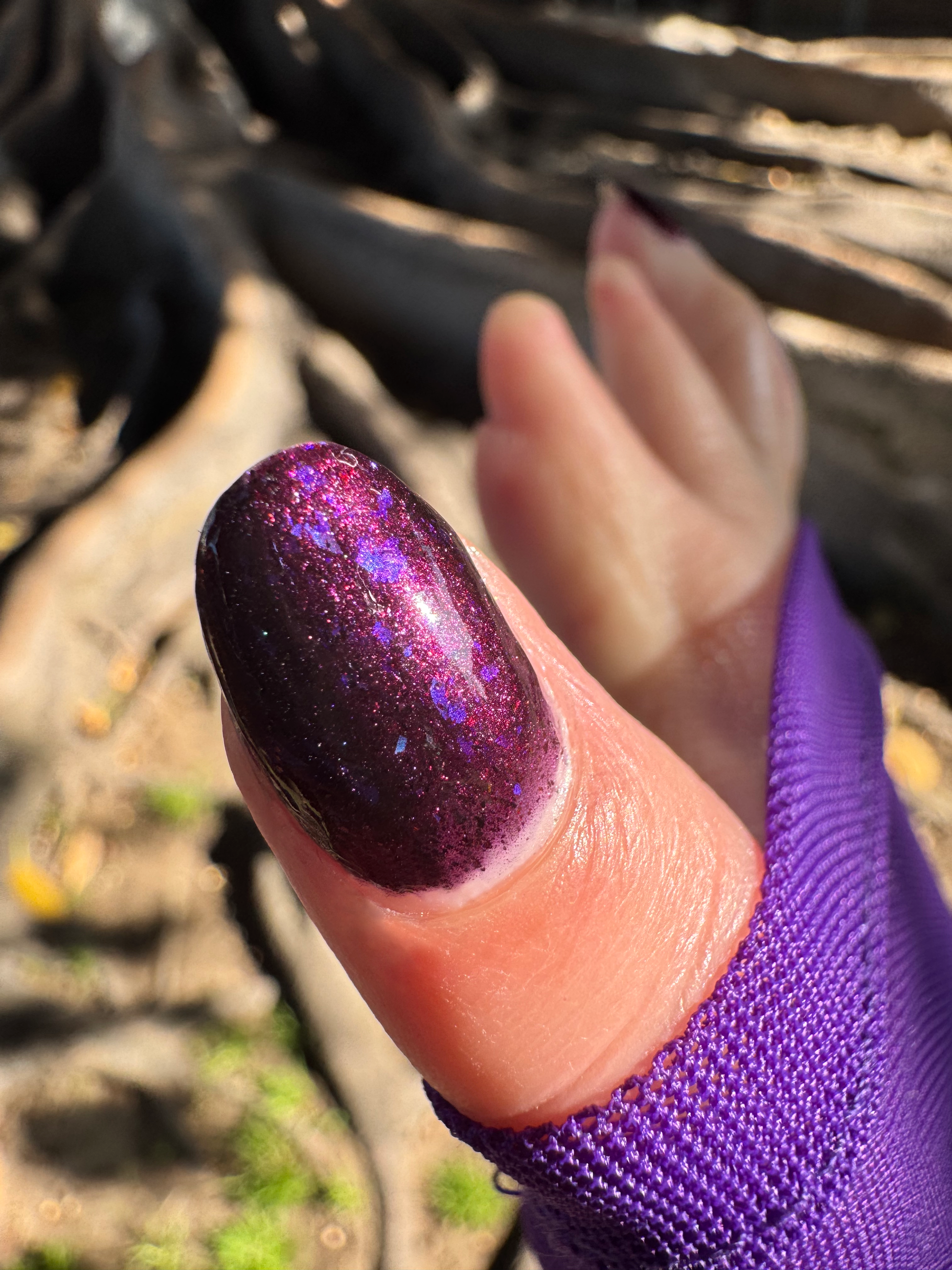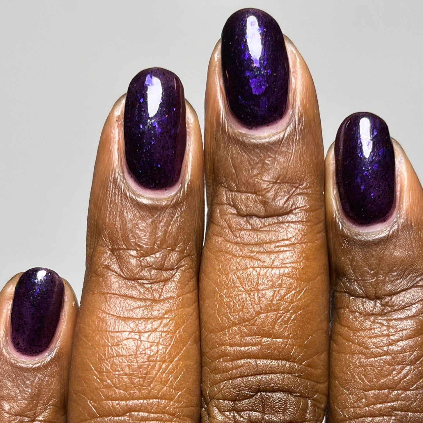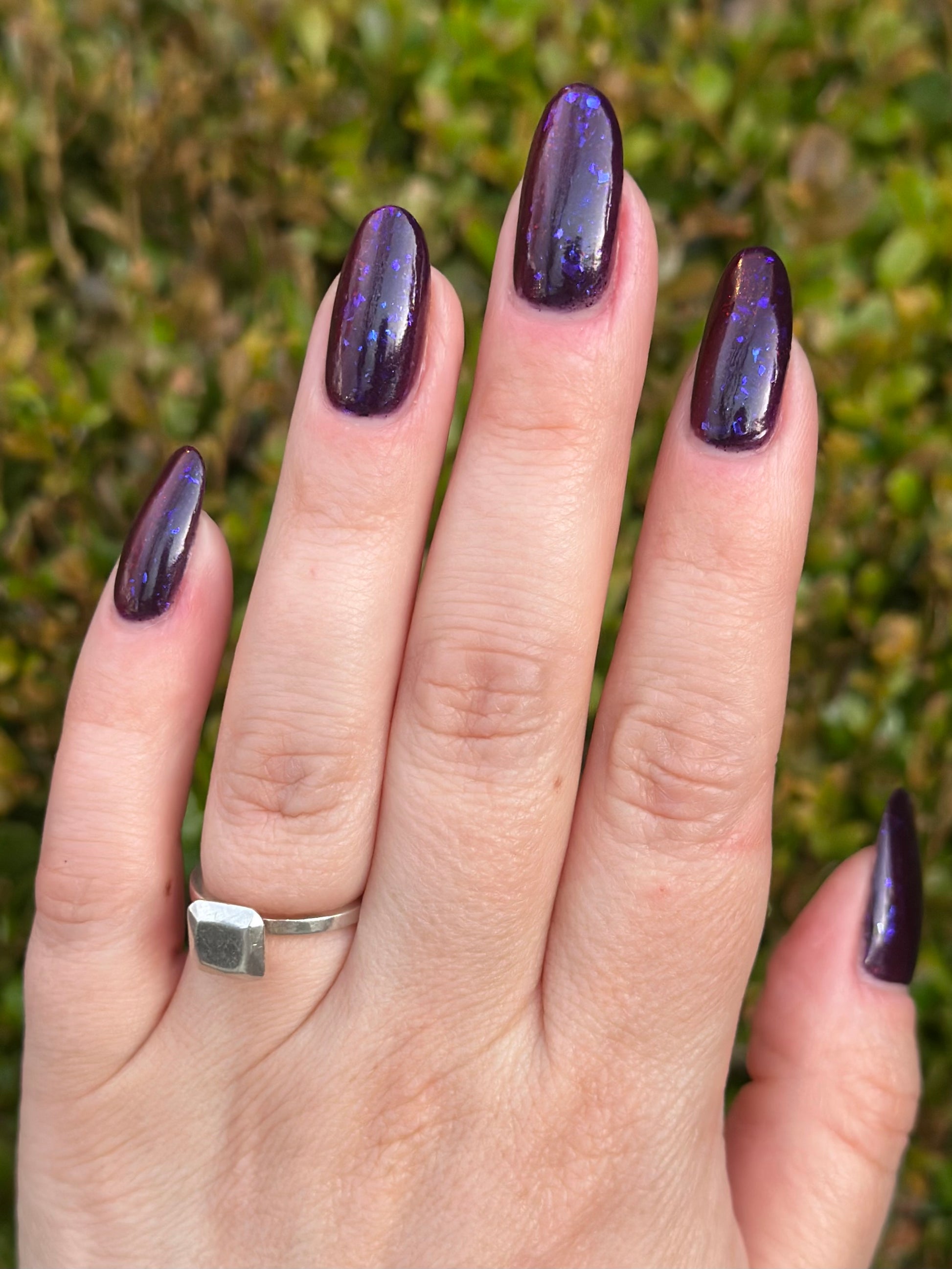 Dream Eater has a dark purple jelly base with black to red multichrome shimmer in both small and medium sized particles as well as blue to purple ghost flakes - inspired by Gengar the ghost type pokemon!