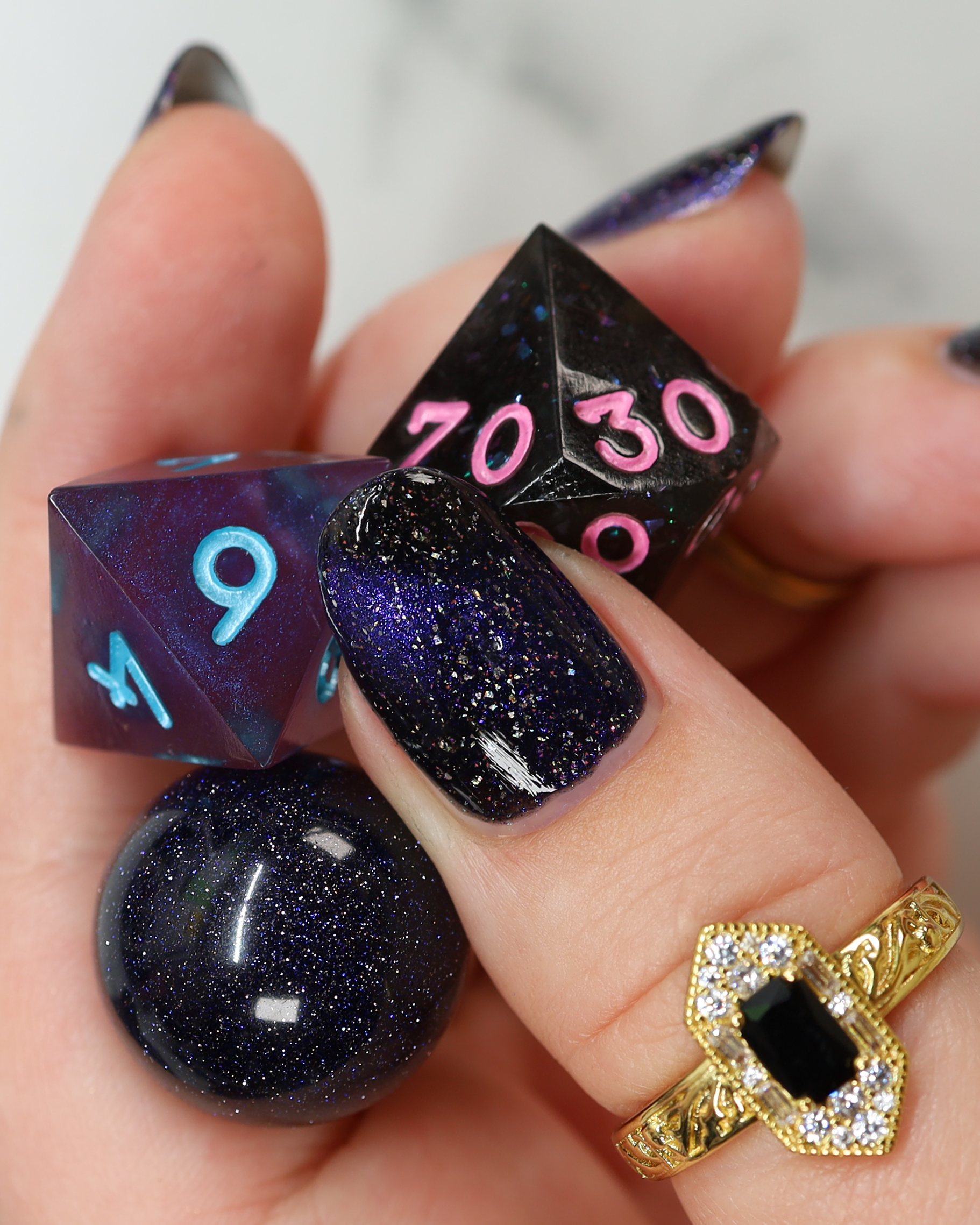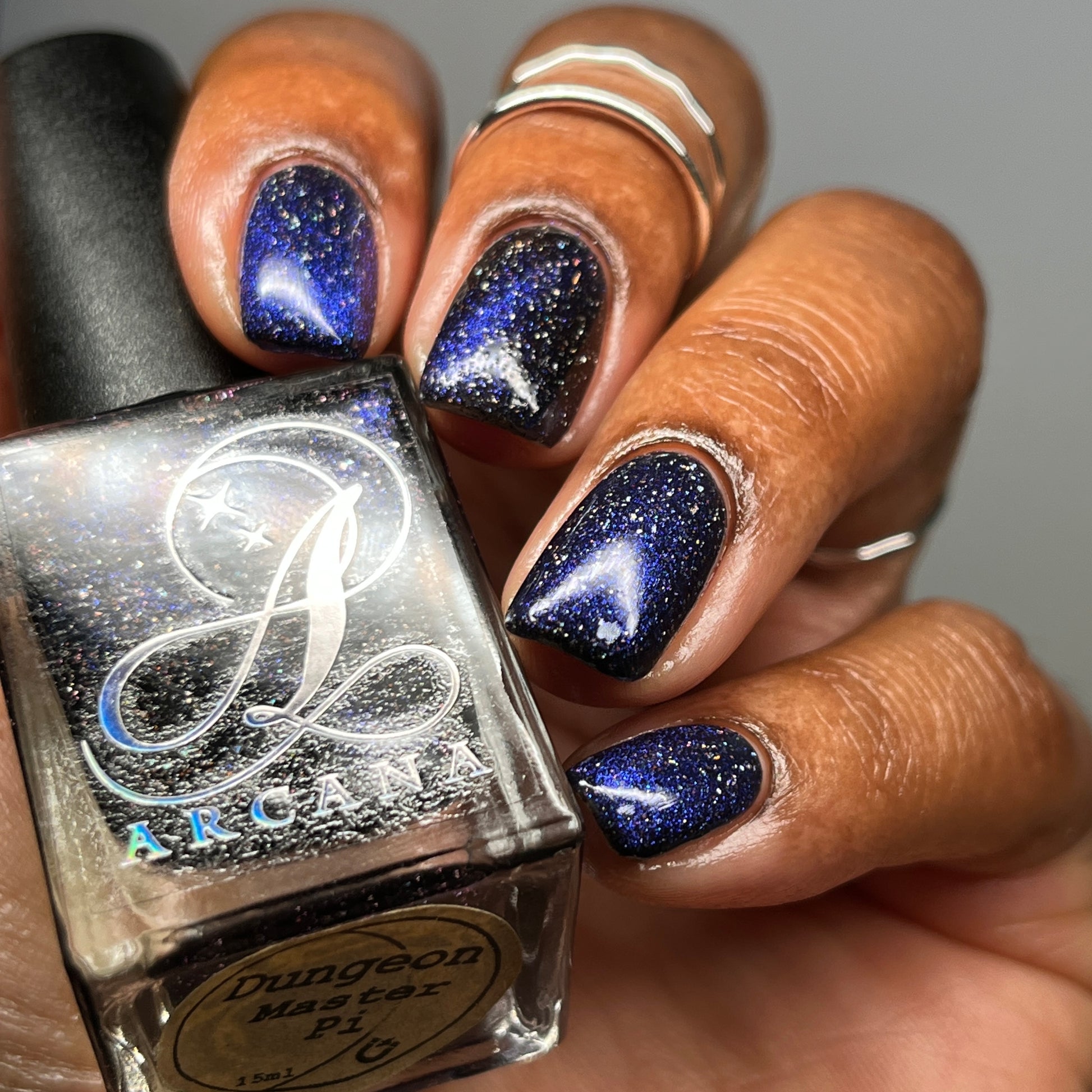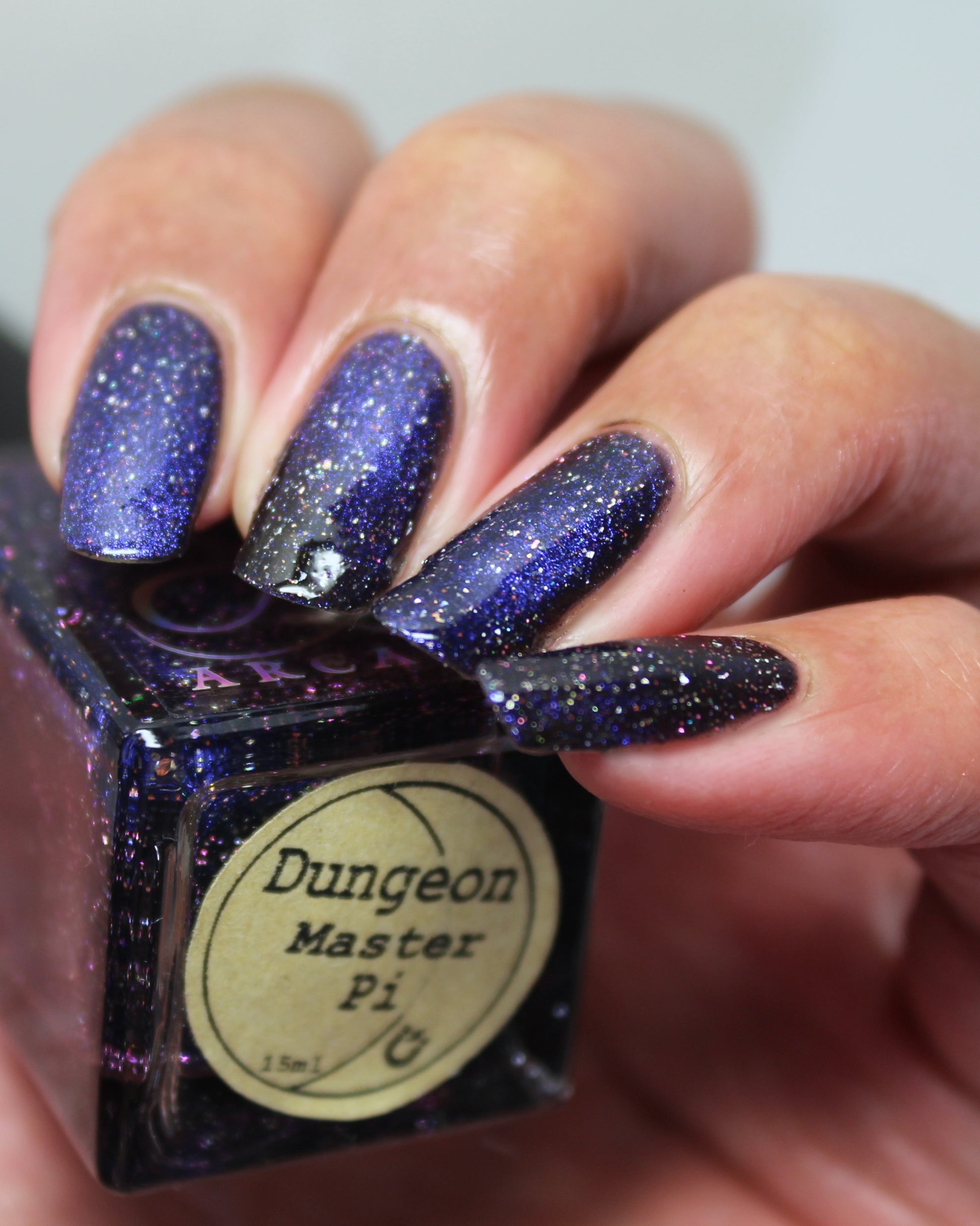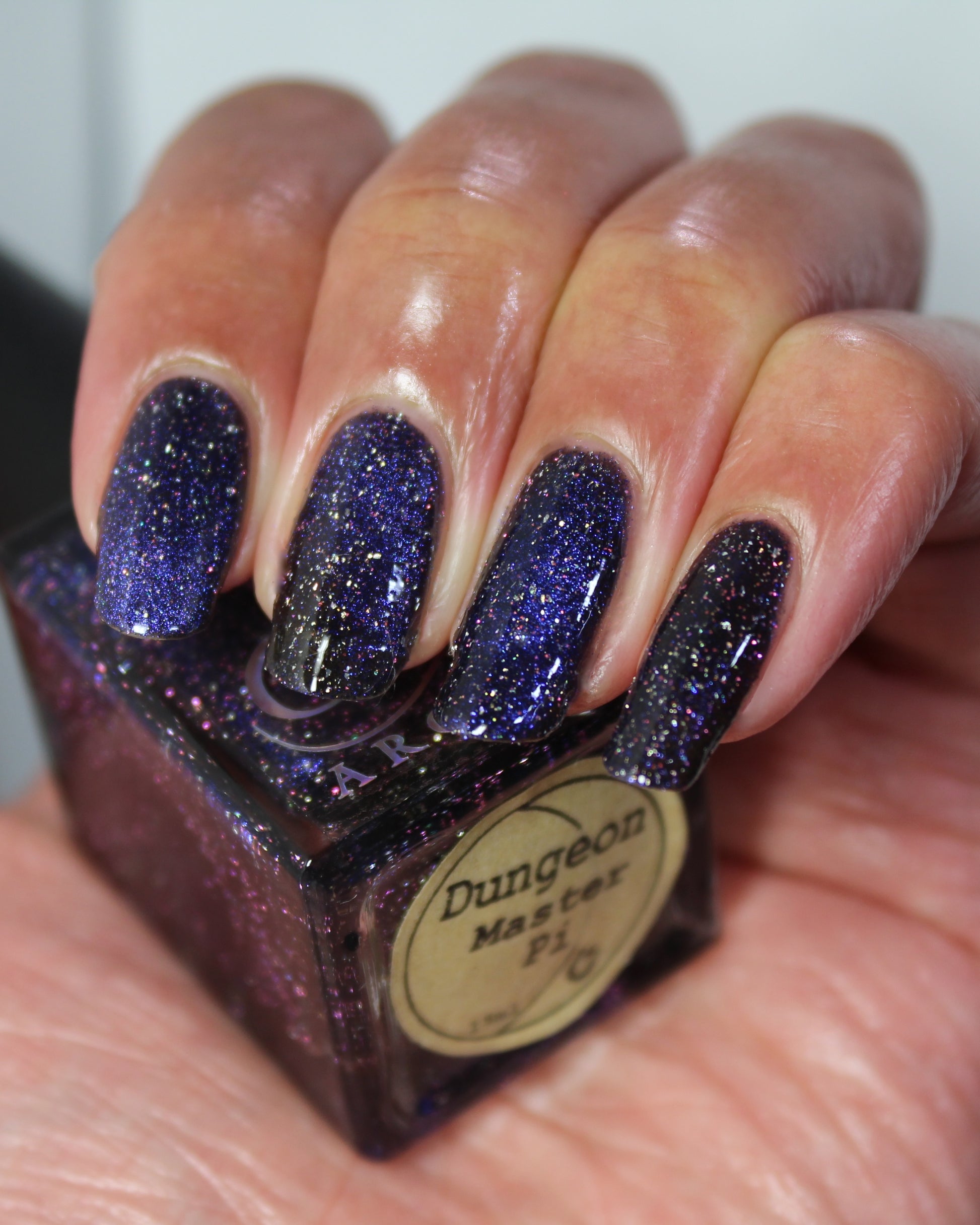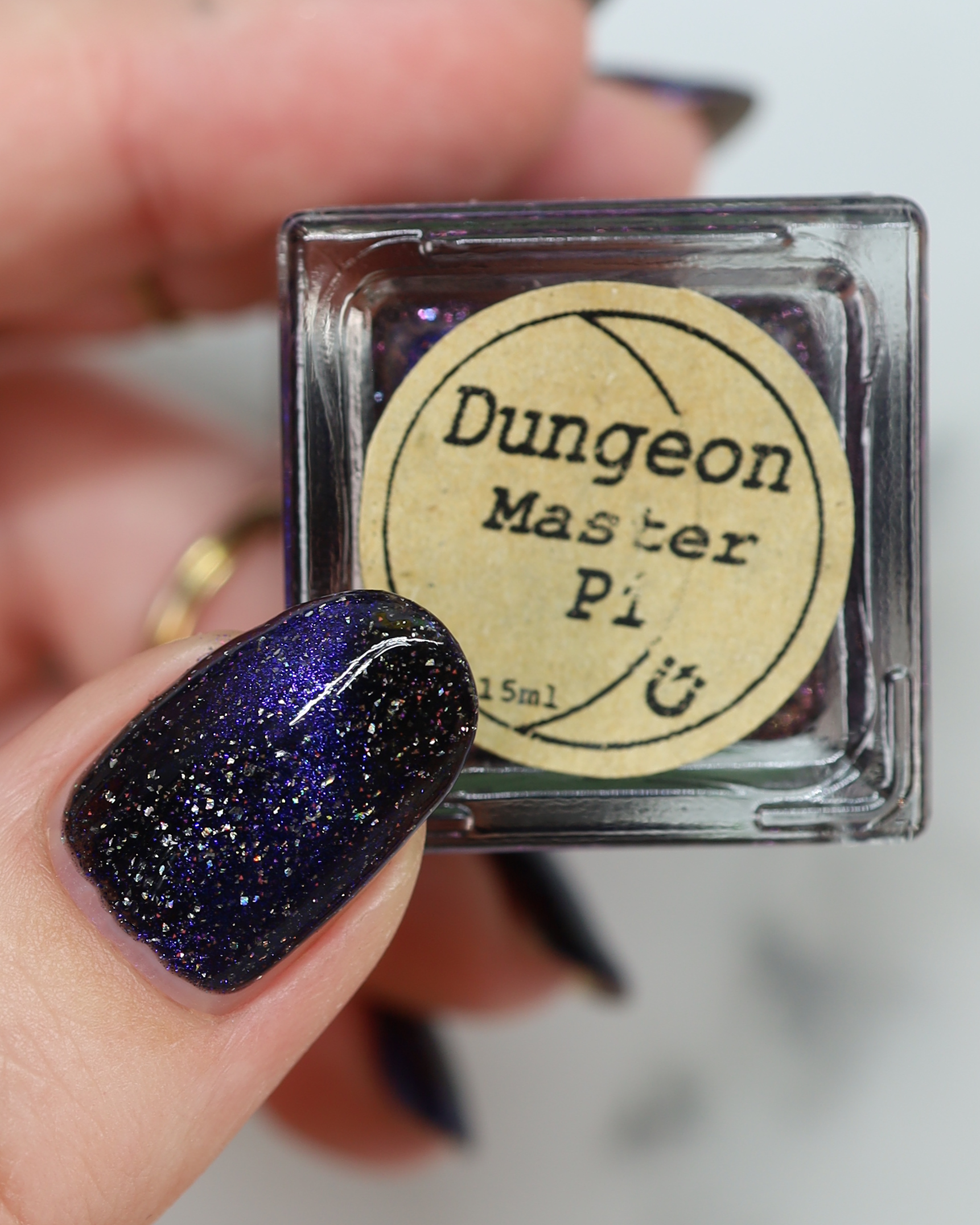 Dungeon Master Pi has a black base with silver, blue, red, and purple reflective glitter, micro holographic flakes, and indigo to purple magnetic pigment.