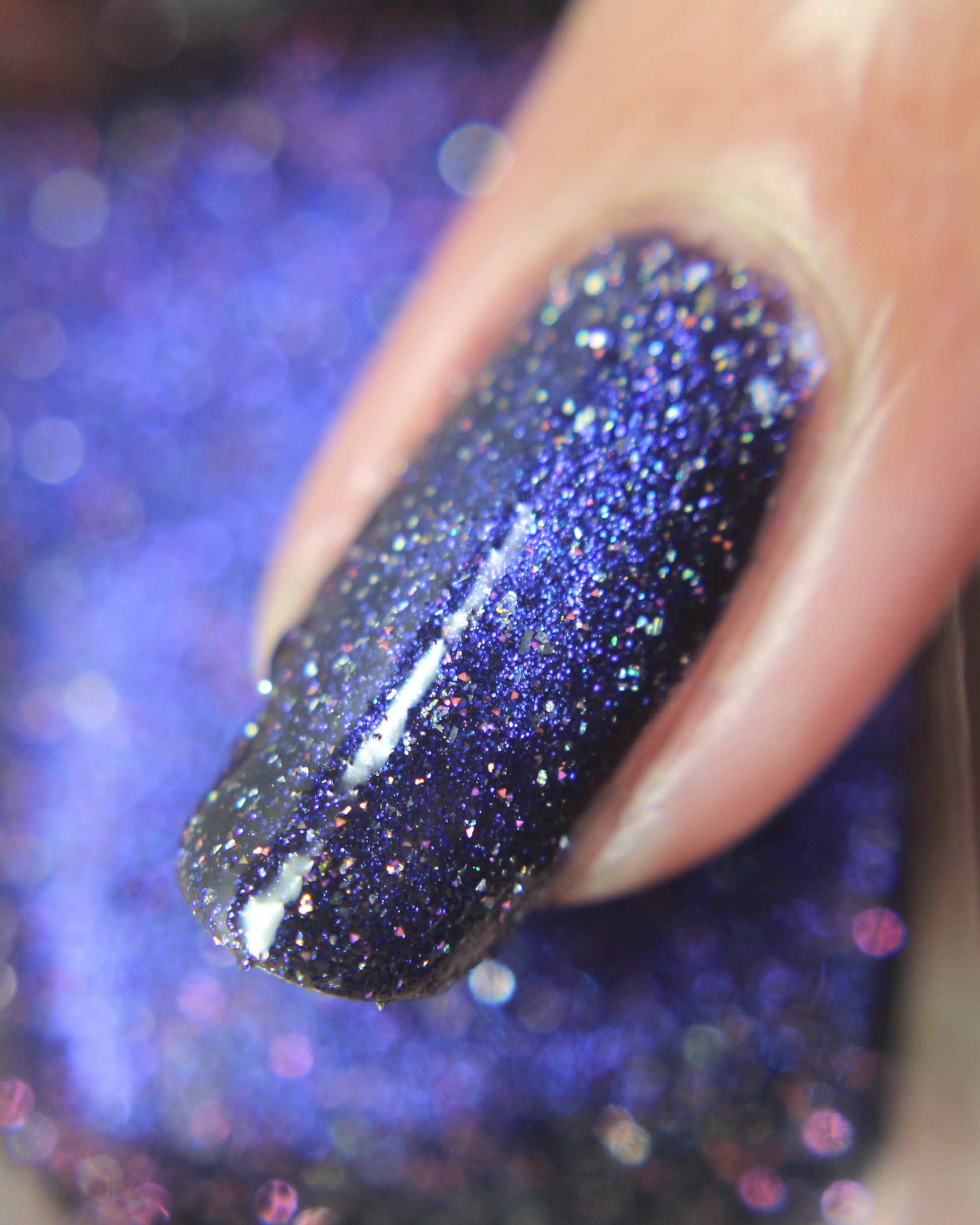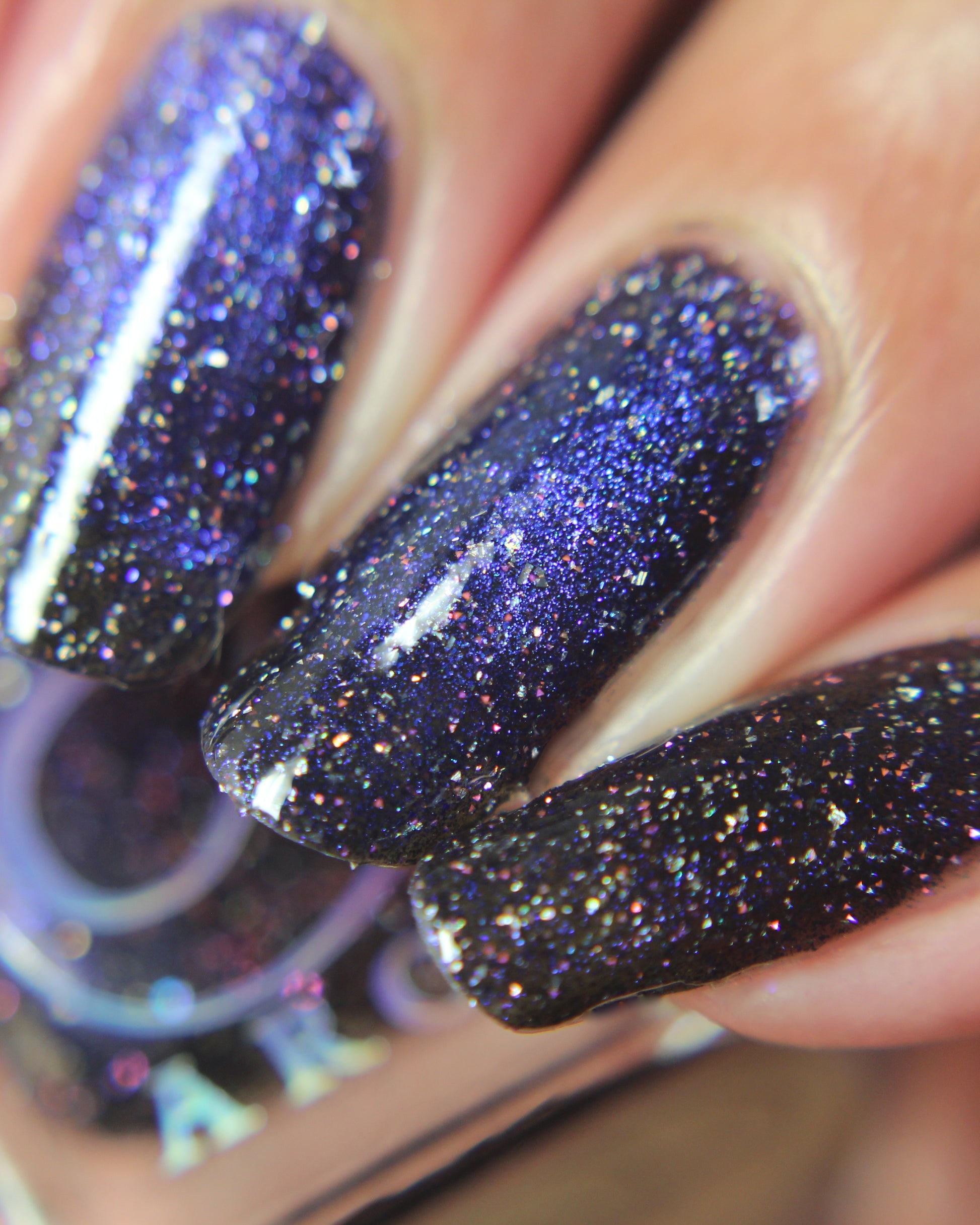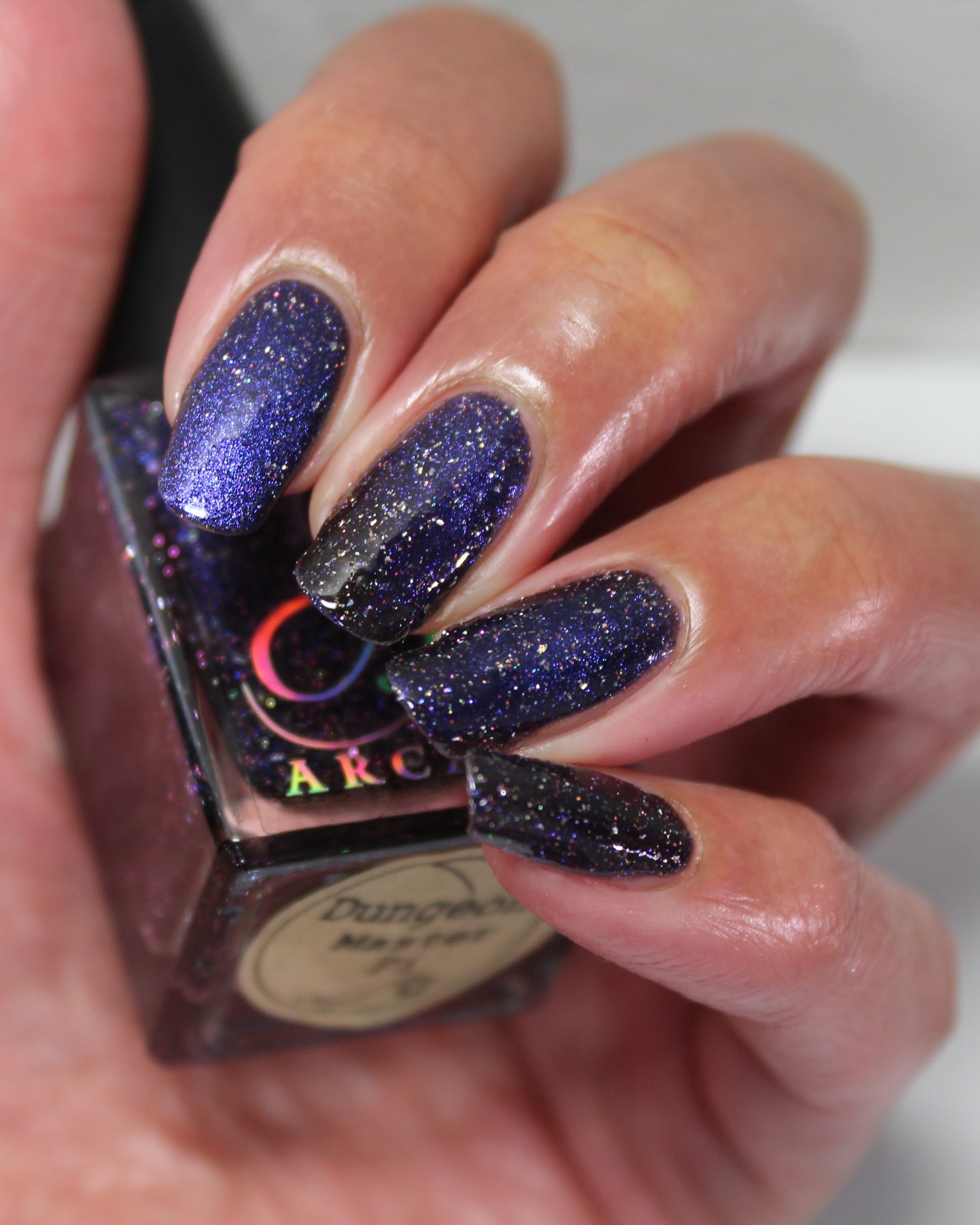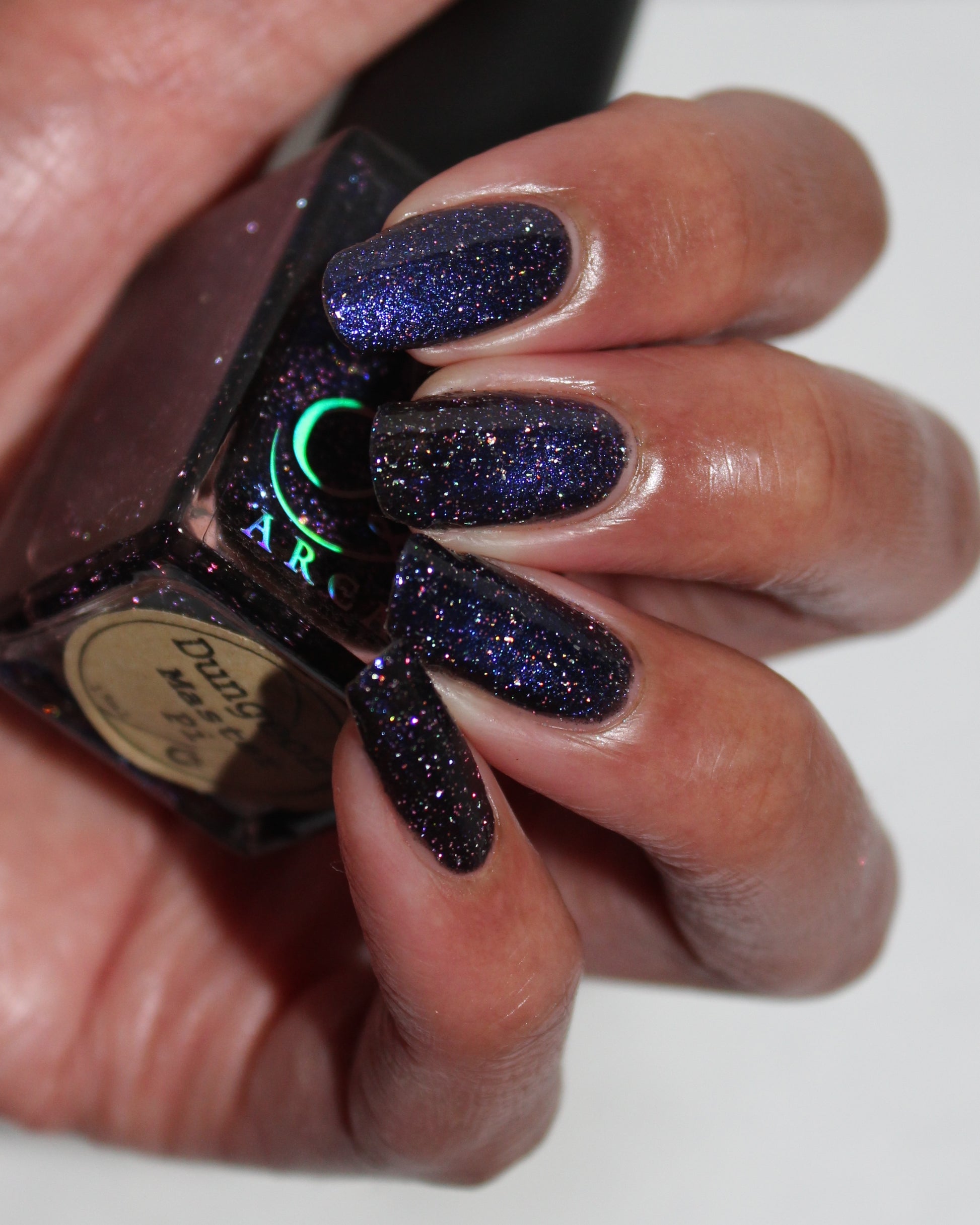 Dungeon Master Pi has a black base with silver, blue, red, and purple reflective glitter, micro holographic flakes, and indigo to purple magnetic pigment.