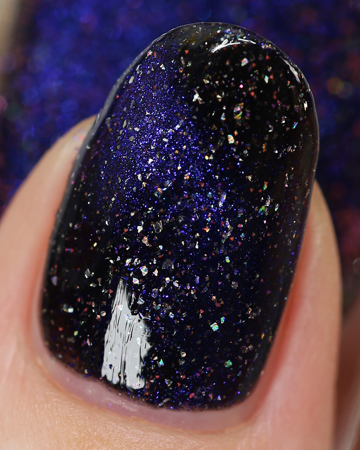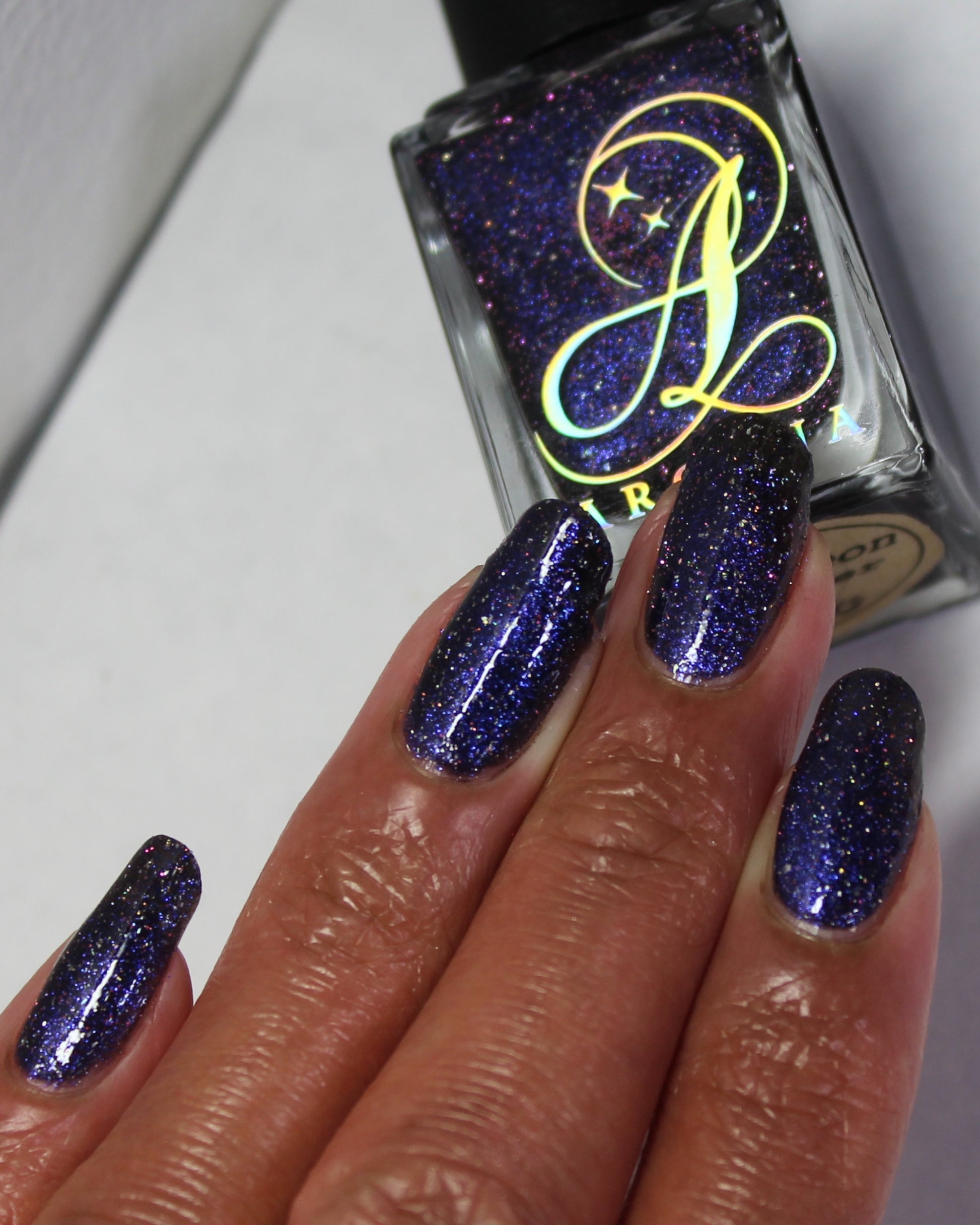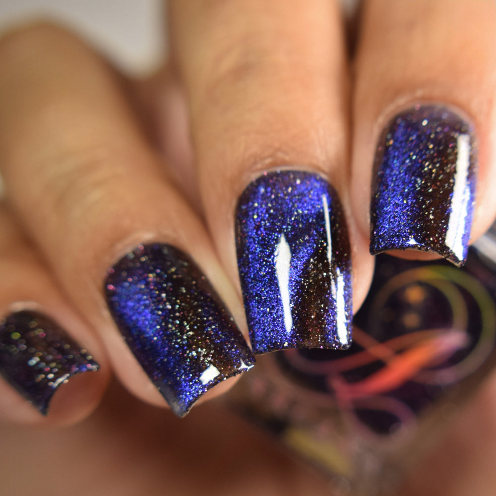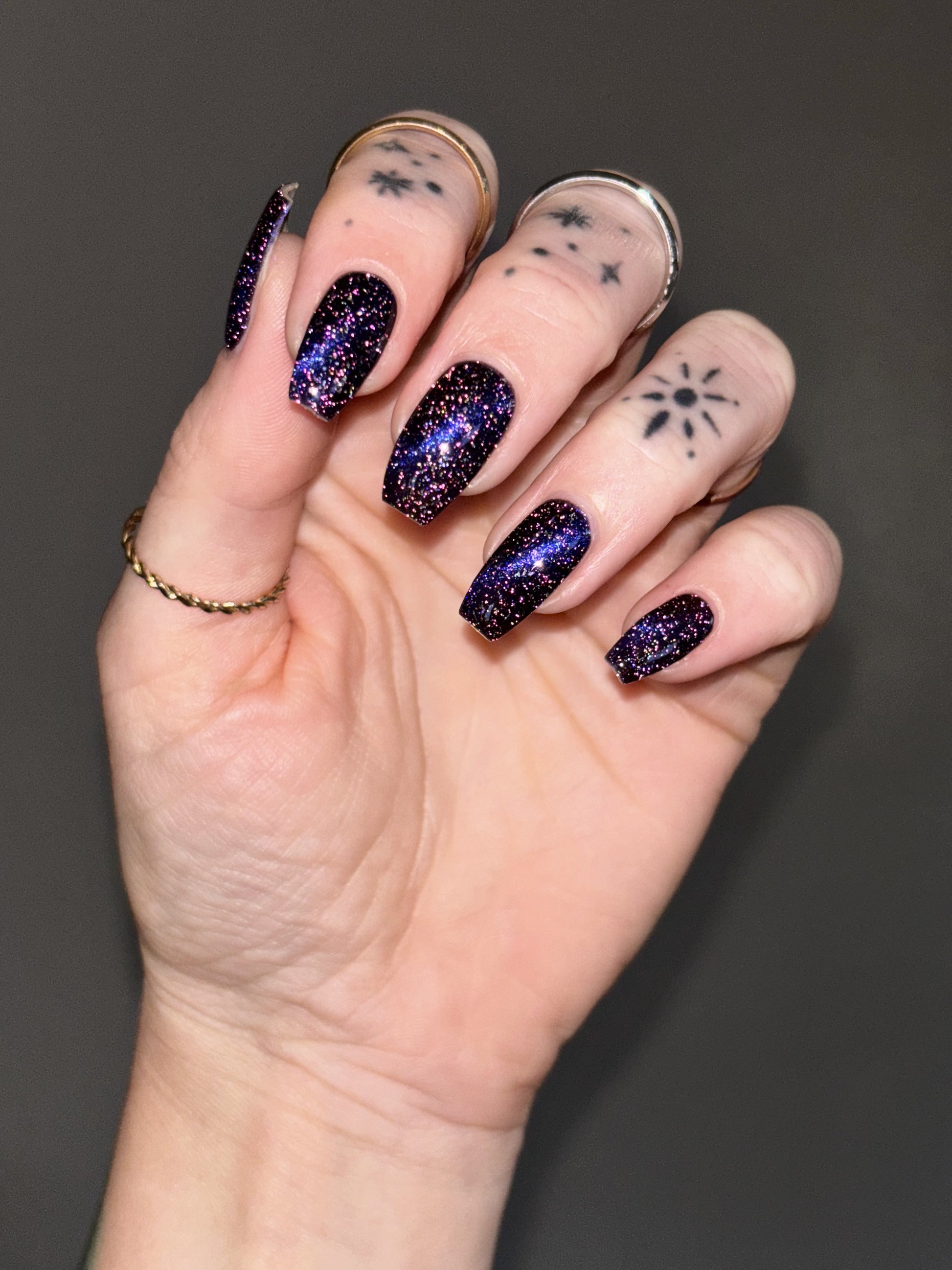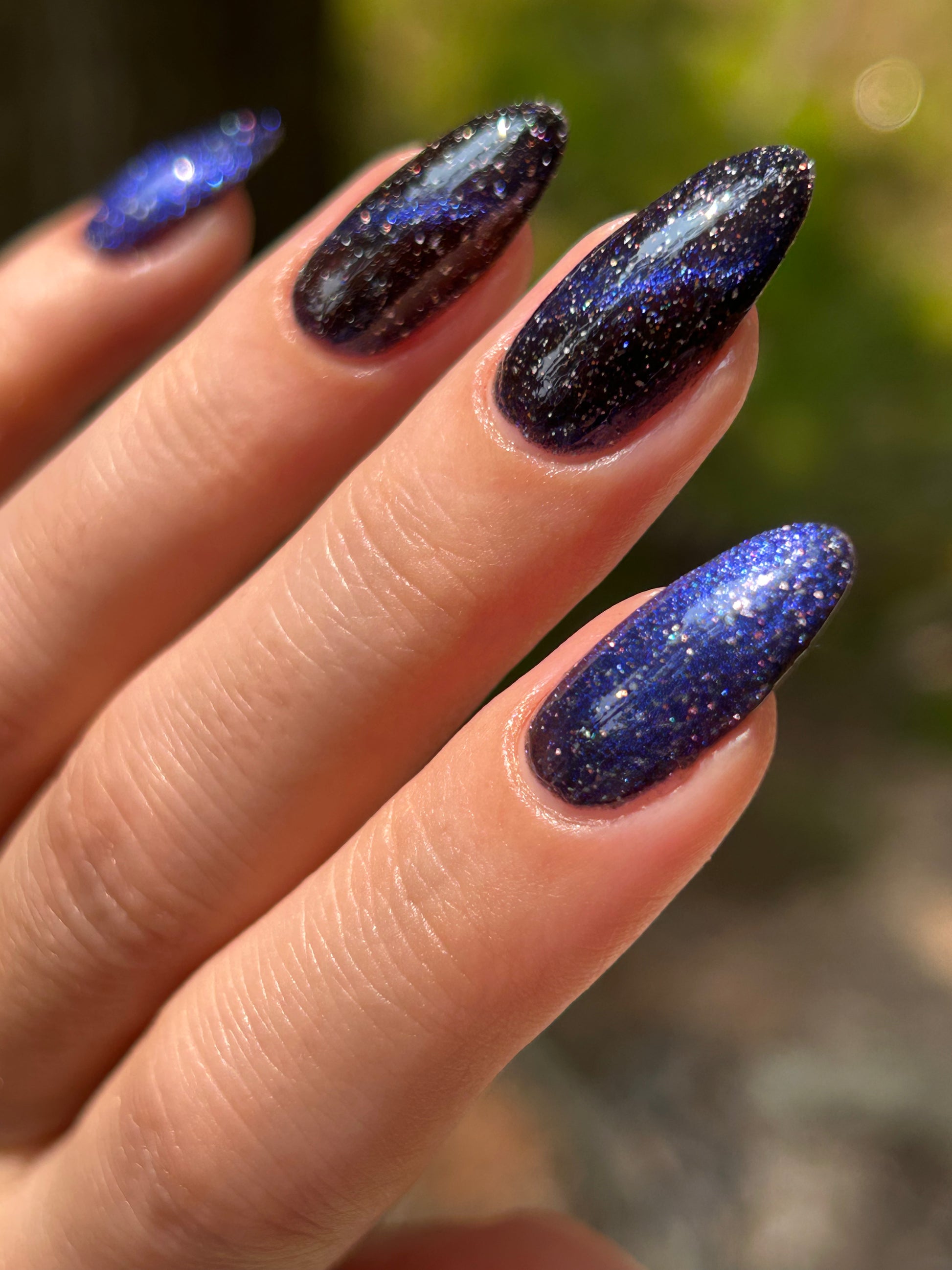 Dungeon Master Pi has a black base with silver, blue, red, and purple reflective glitter, micro holographic flakes, and indigo to purple magnetic pigment.
