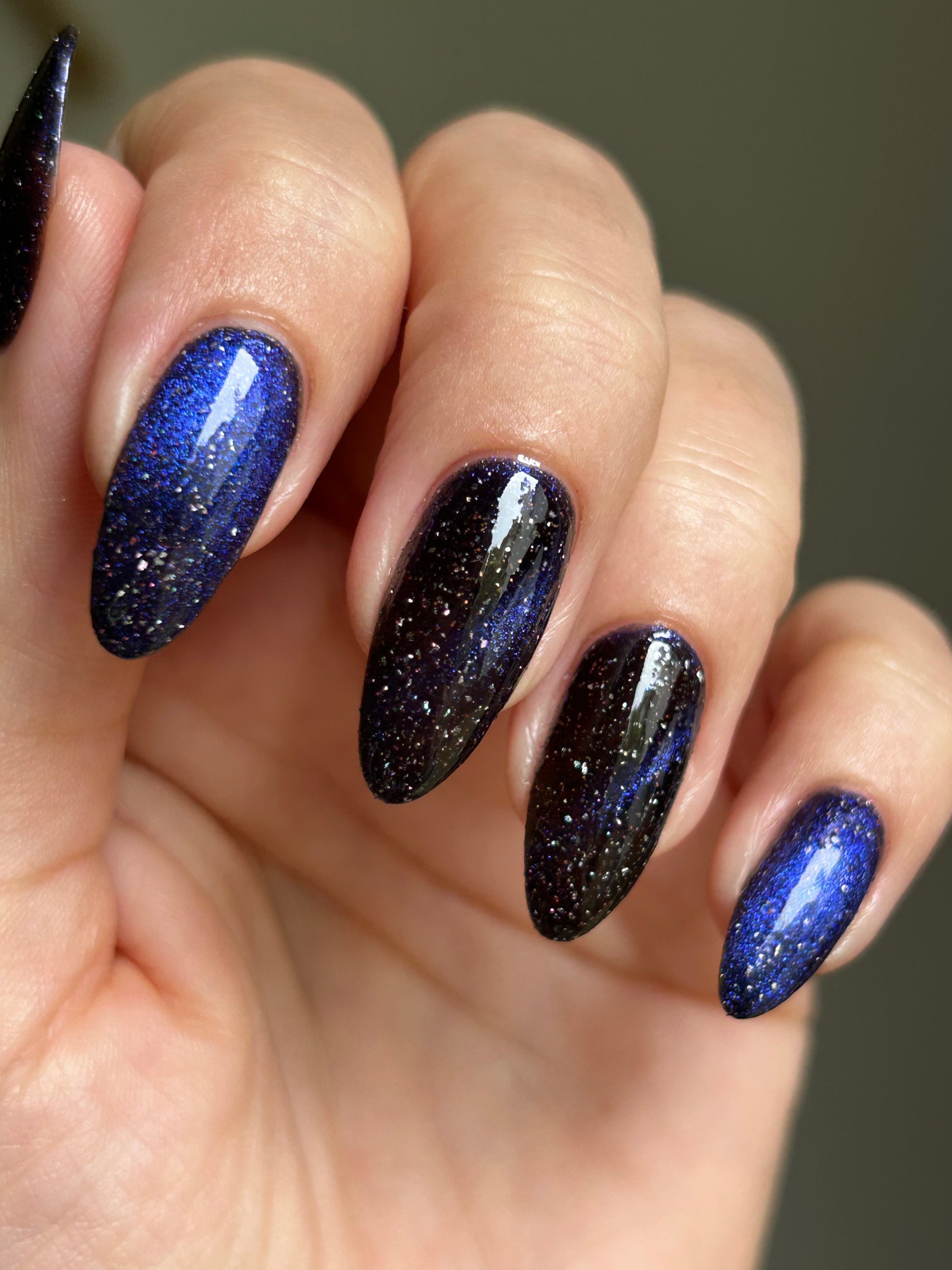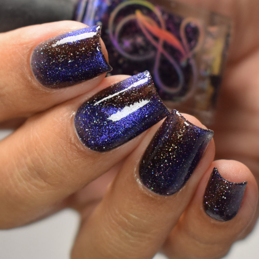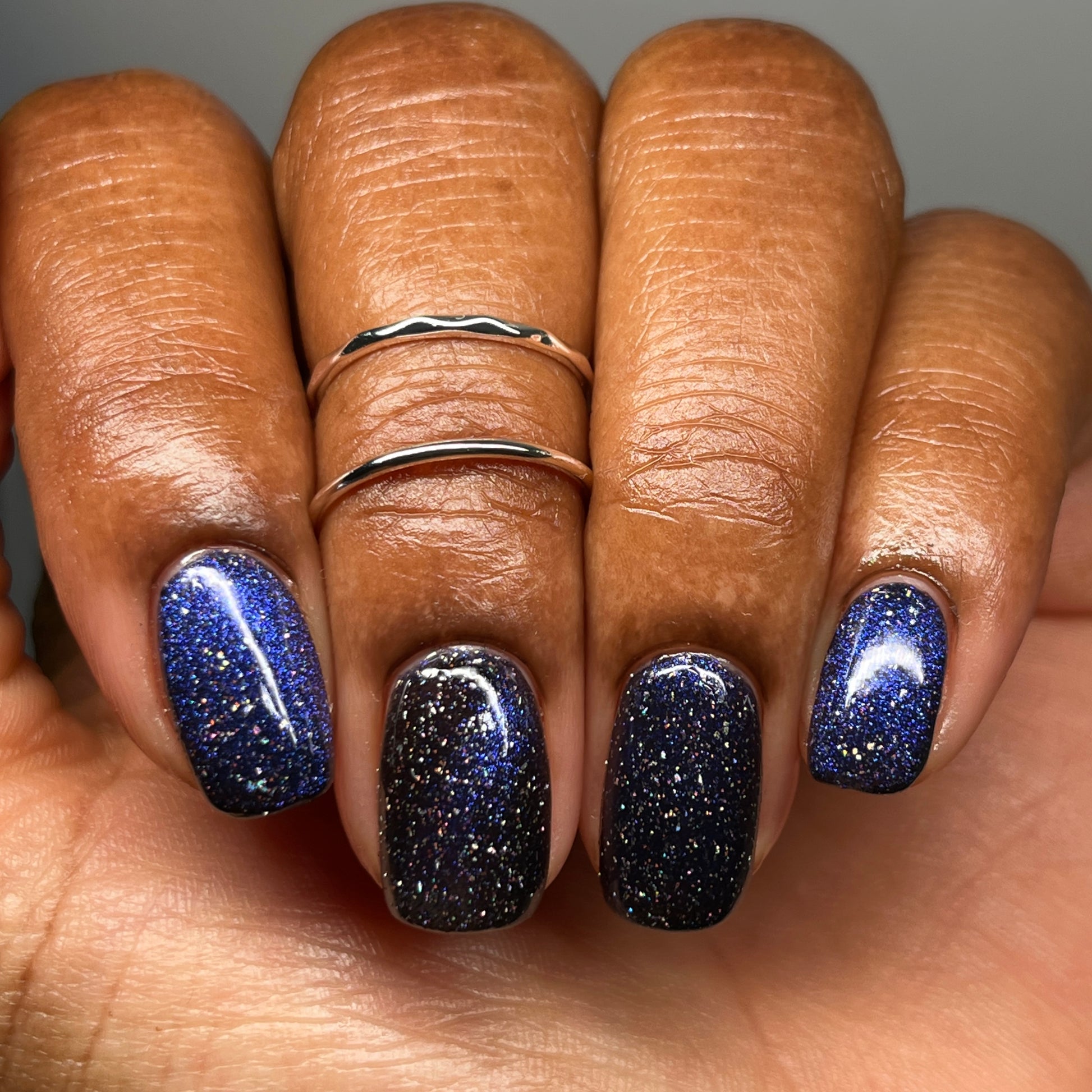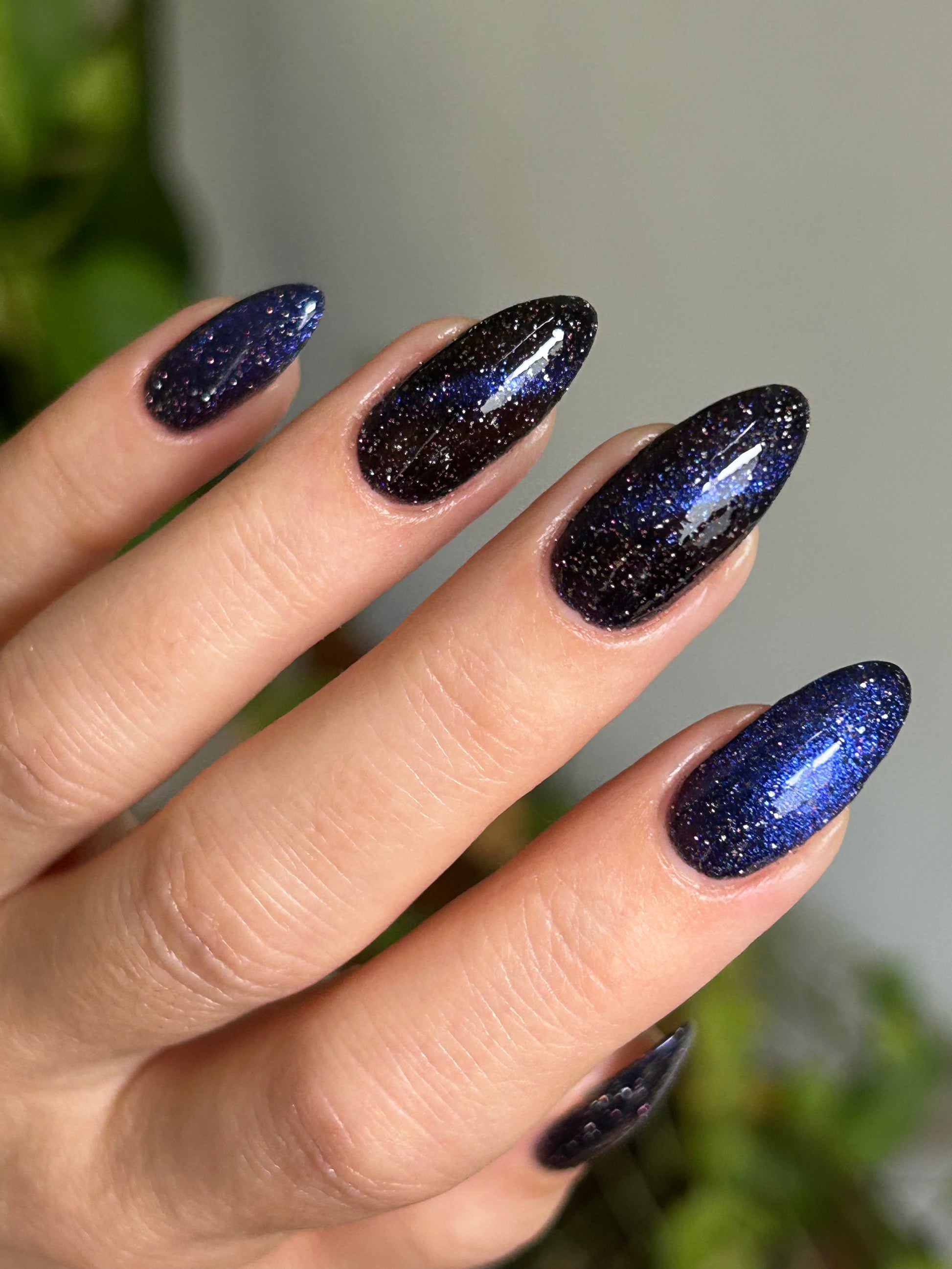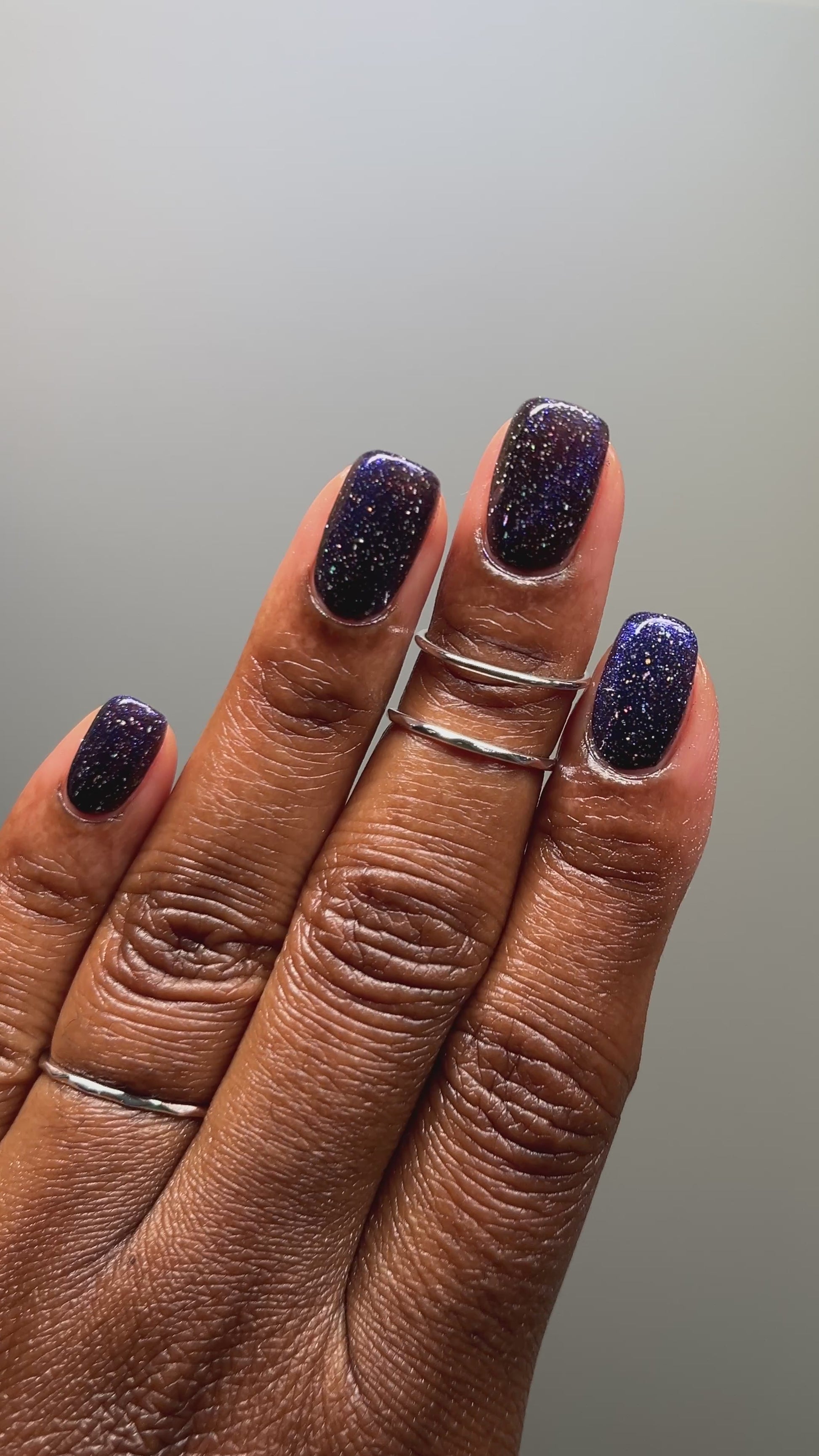 Dungeon Master Pi has a black base with silver, blue, red, and purple reflective glitter, micro holographic flakes, and indigo to purple magnetic pigment.