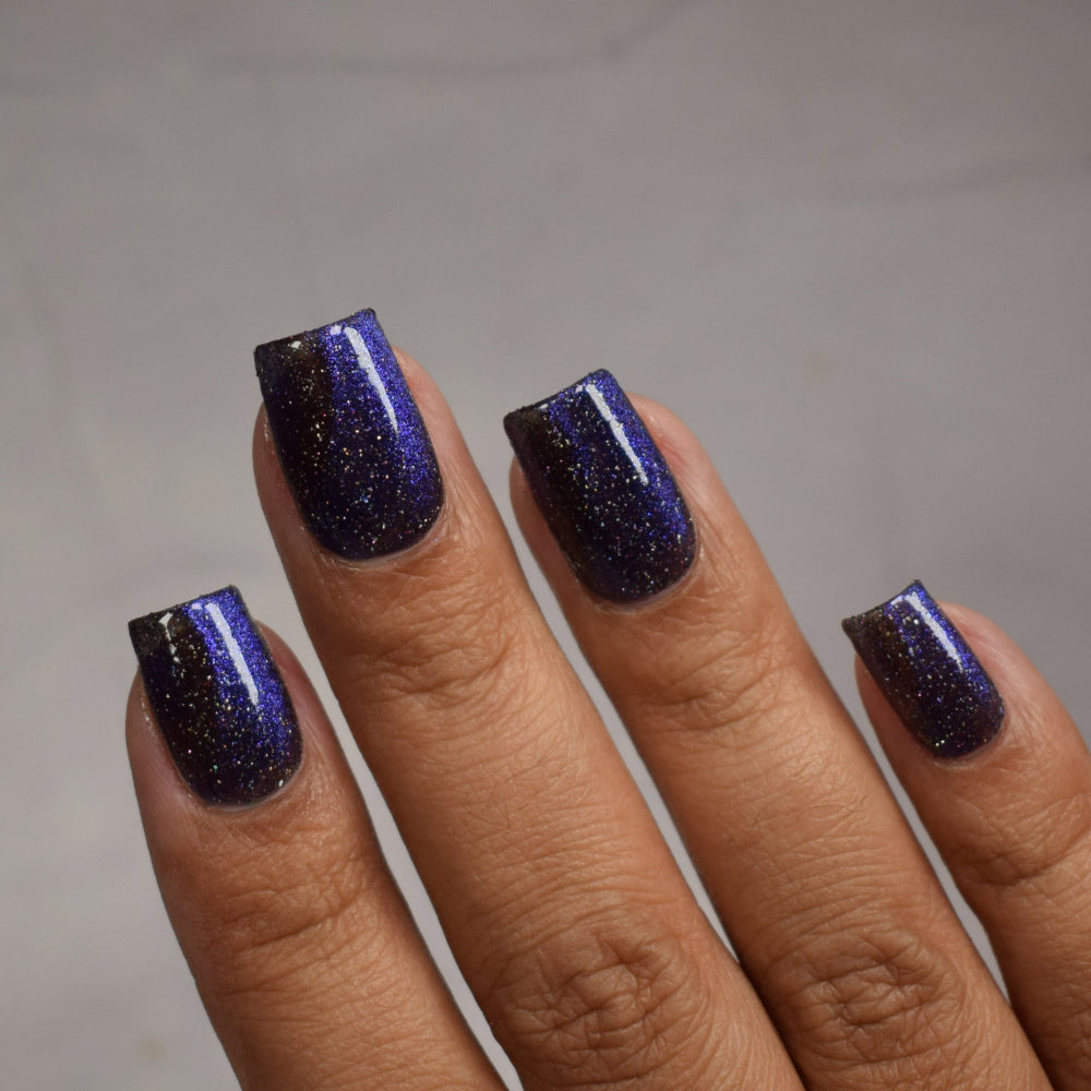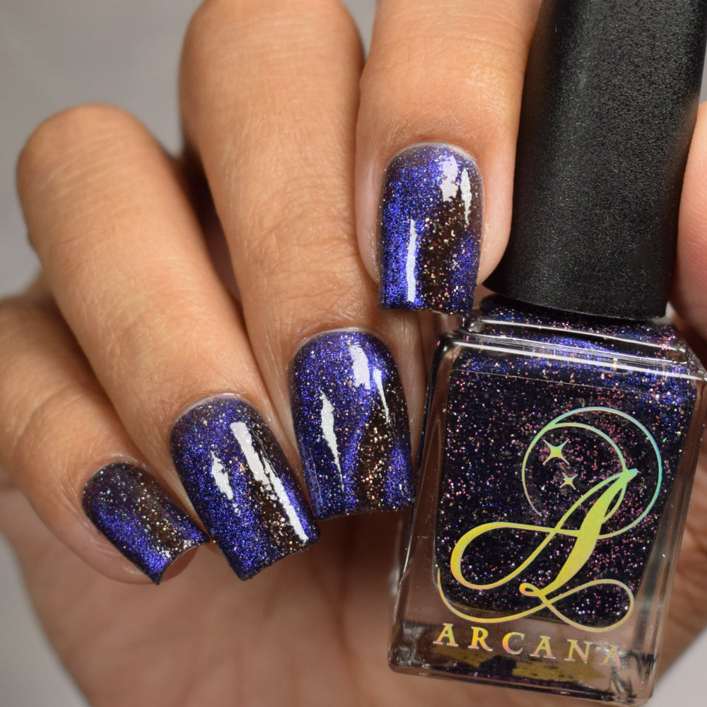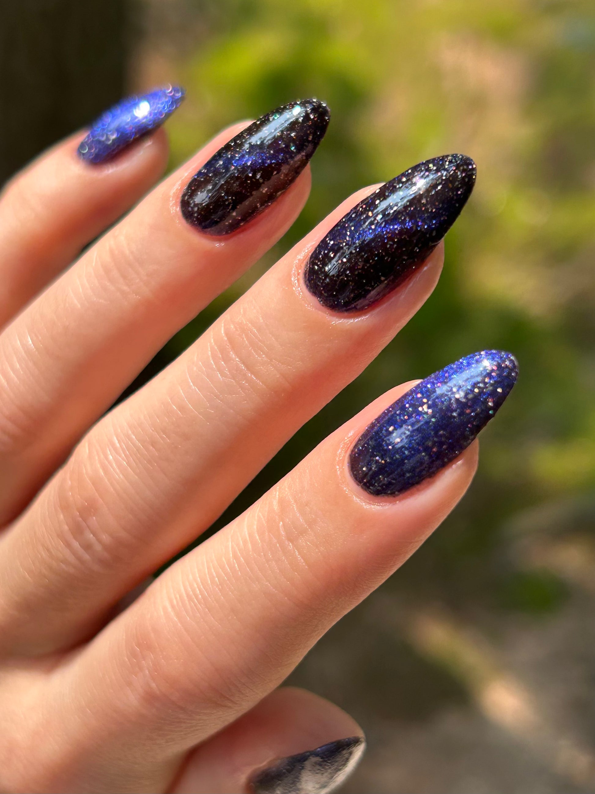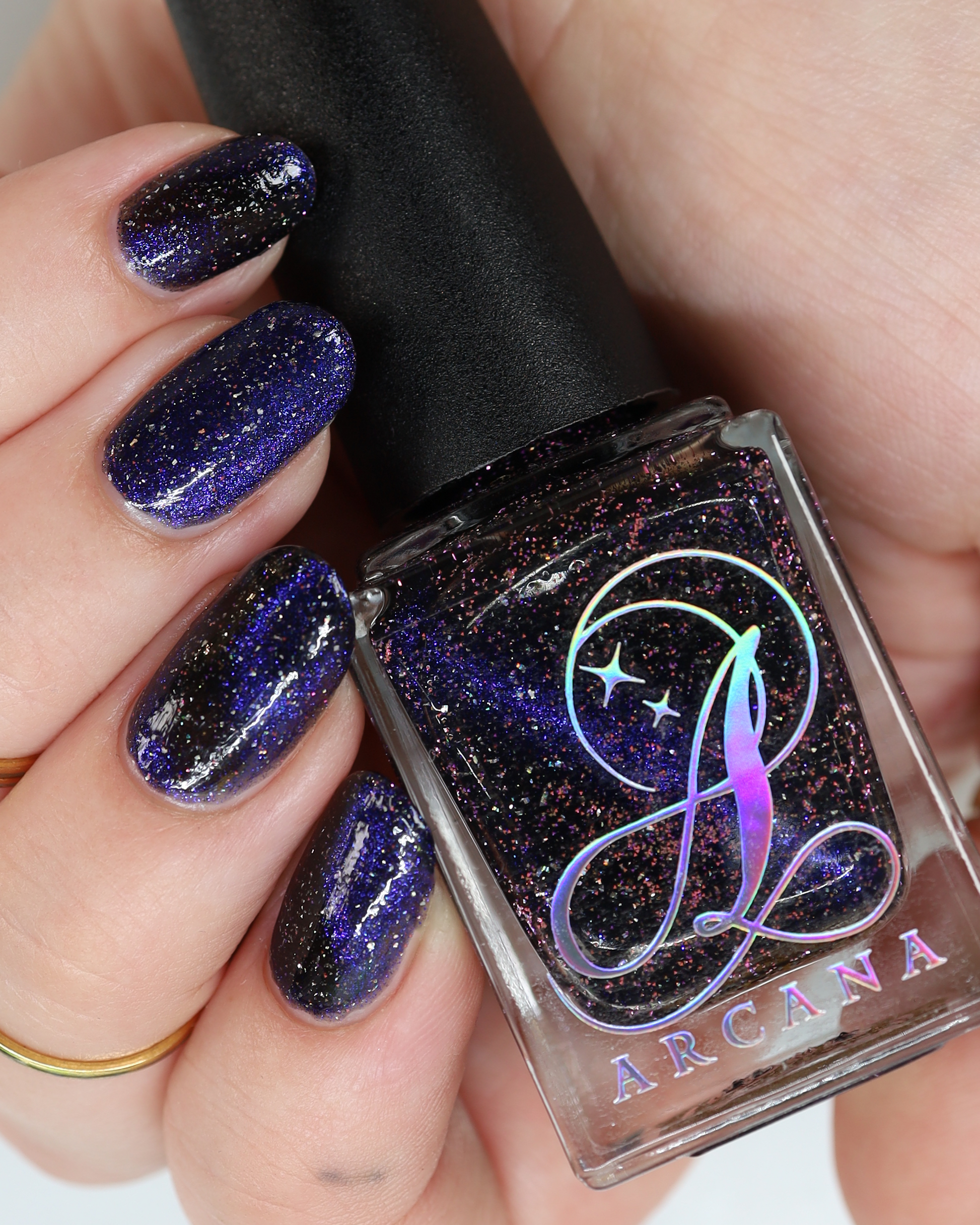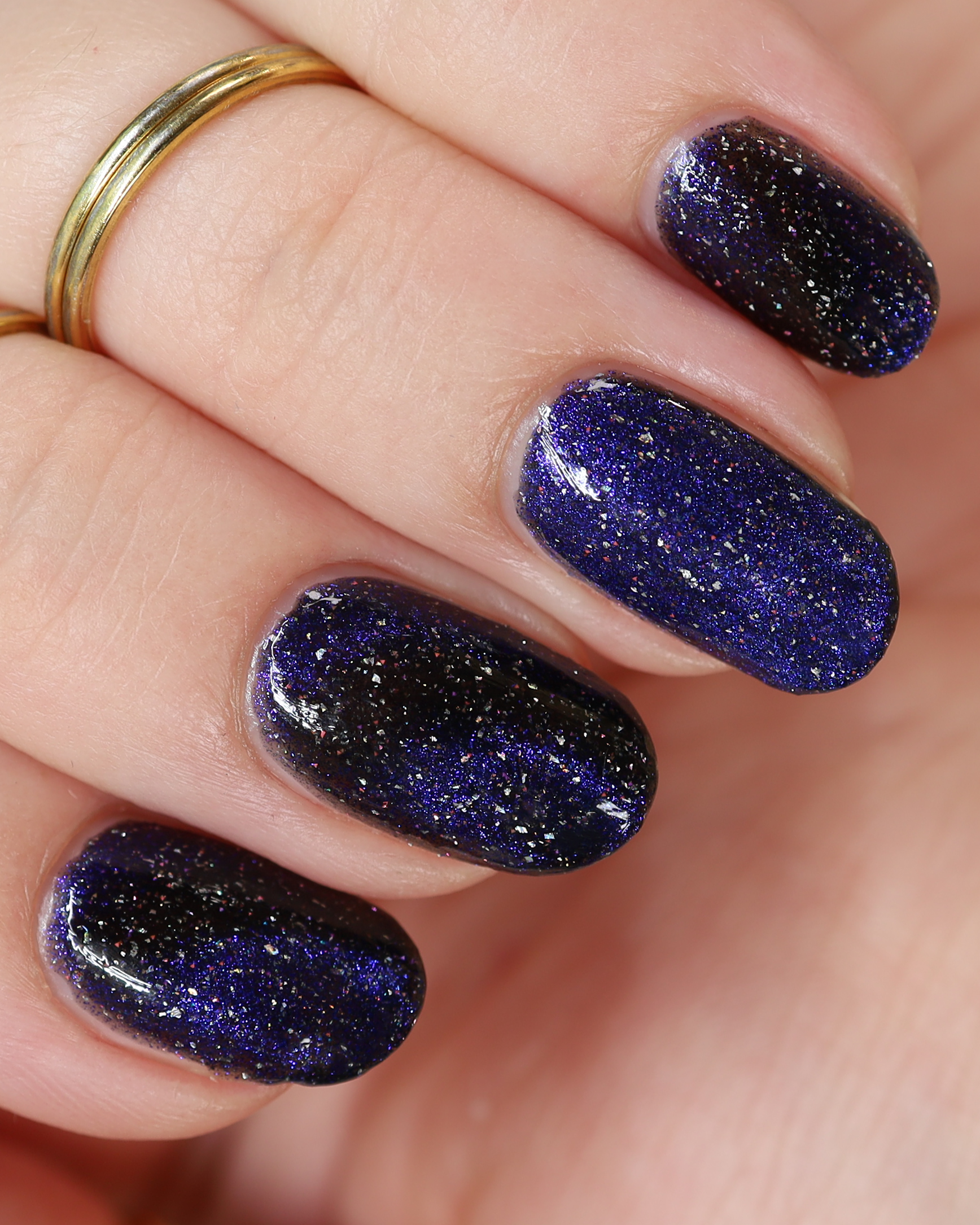 Dungeon Master Pi has a black base with silver, blue, red, and purple reflective glitter, micro holographic flakes, and indigo to purple magnetic pigment.