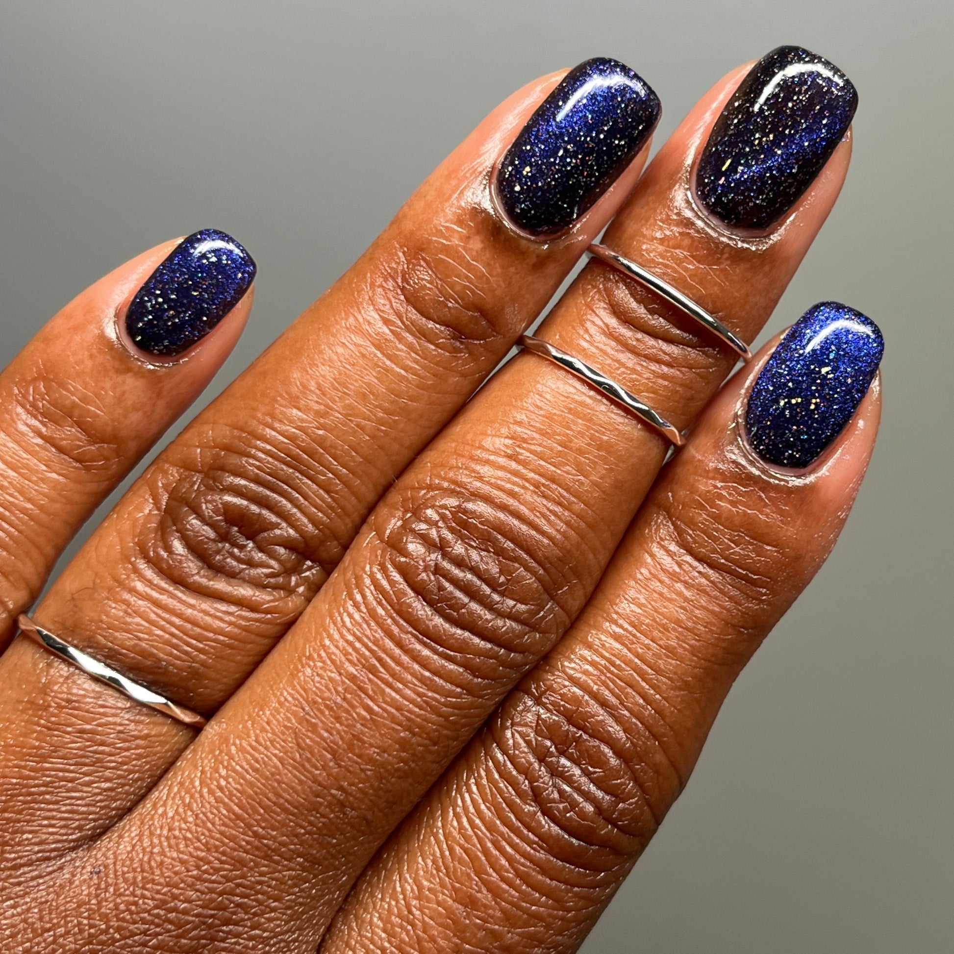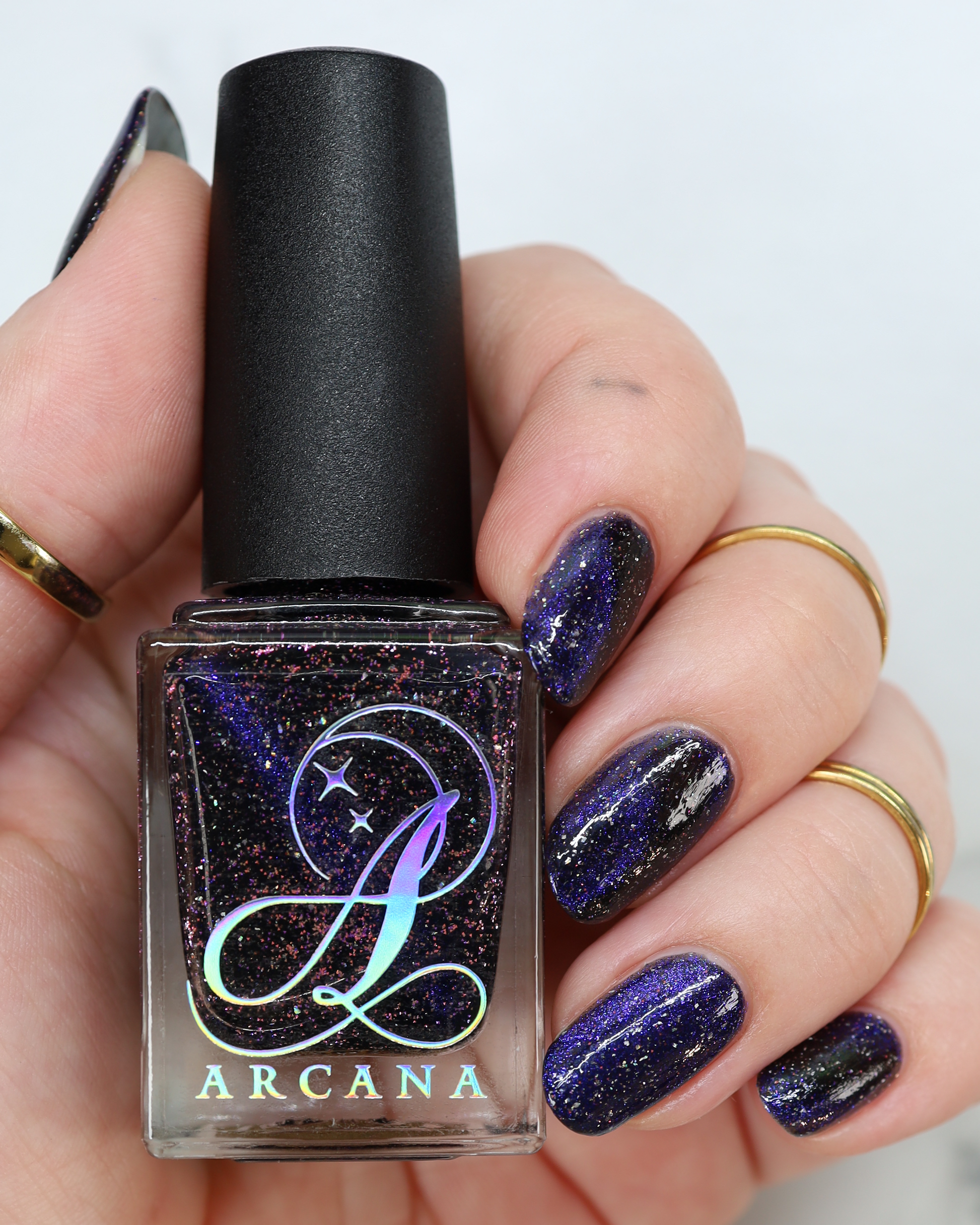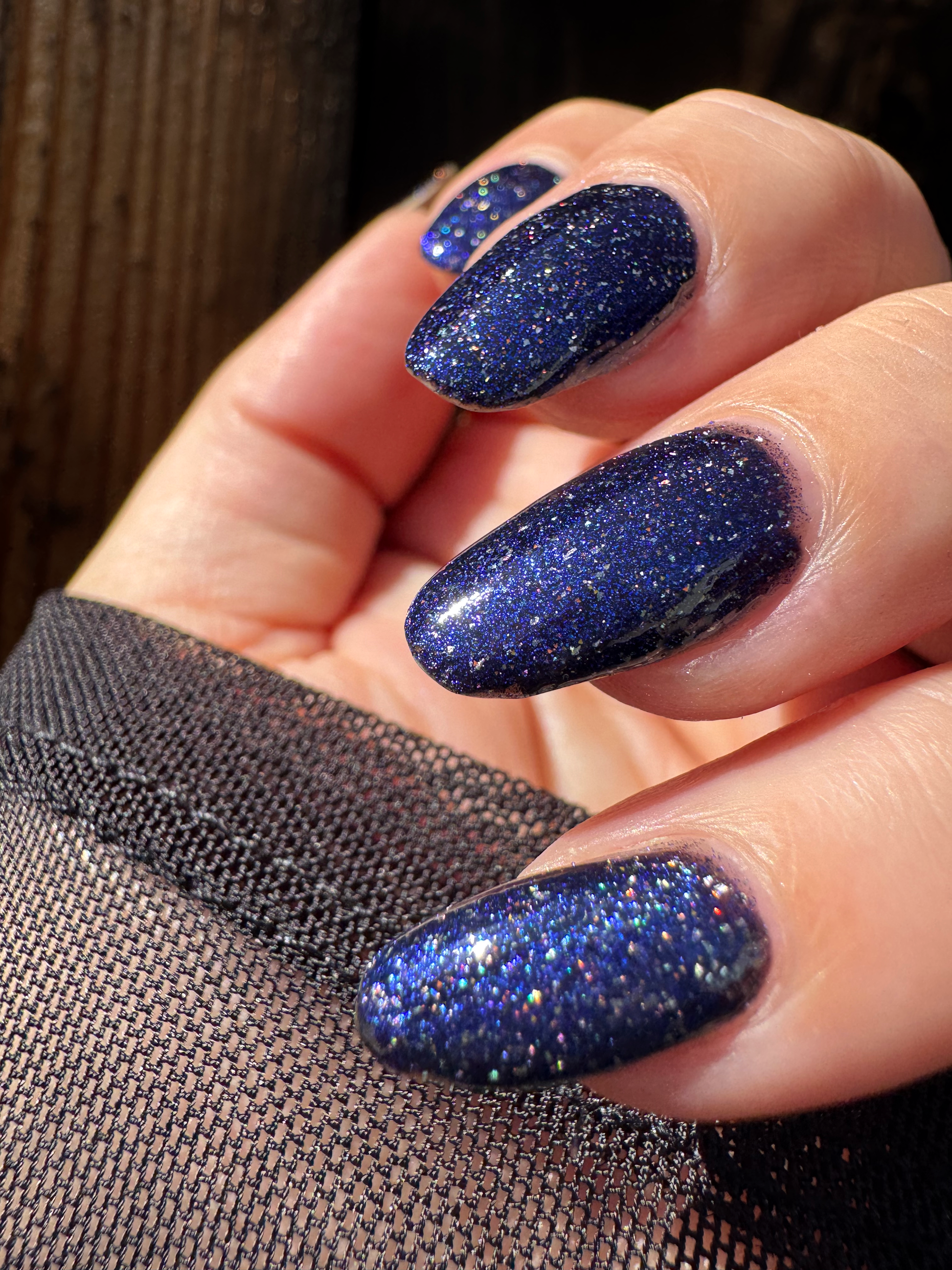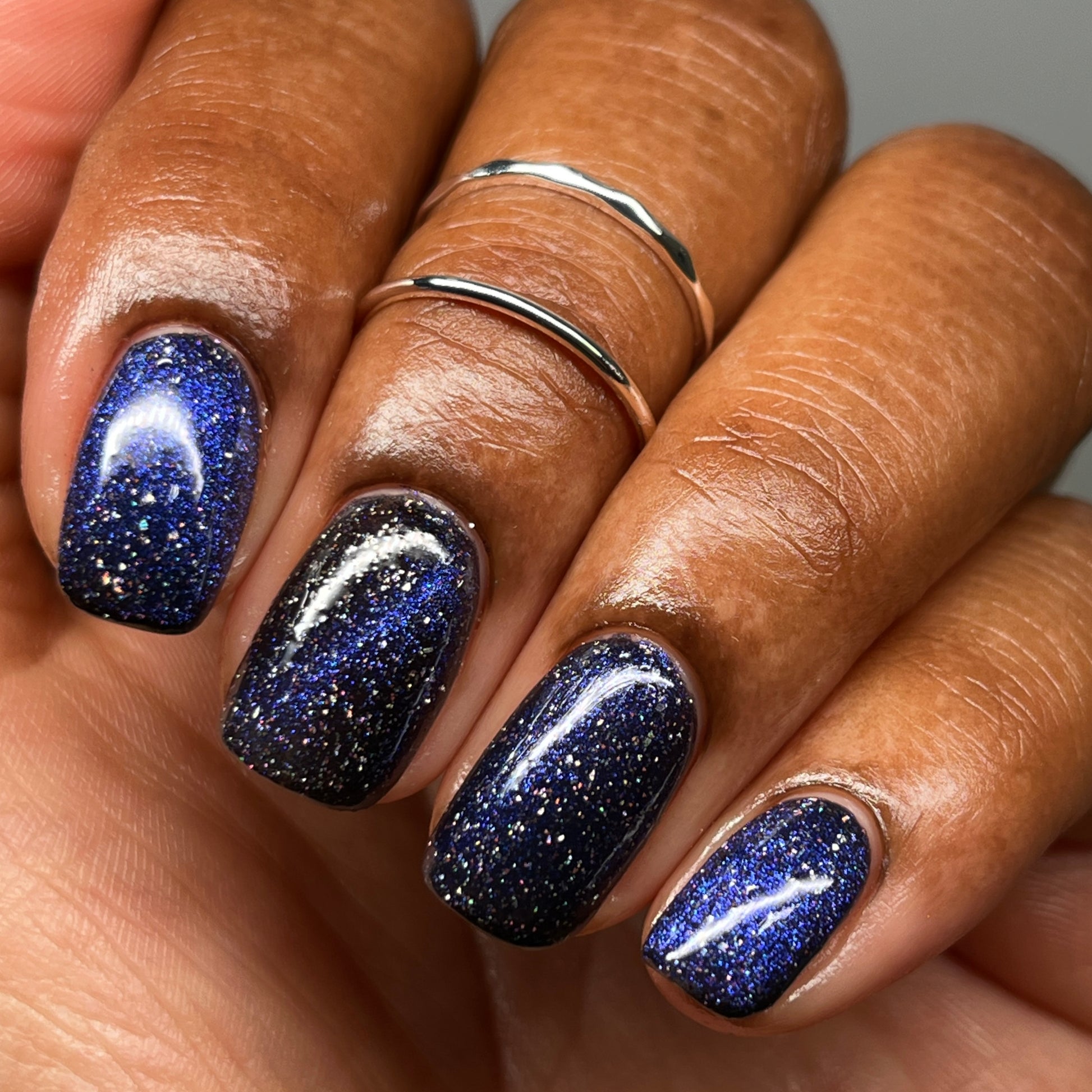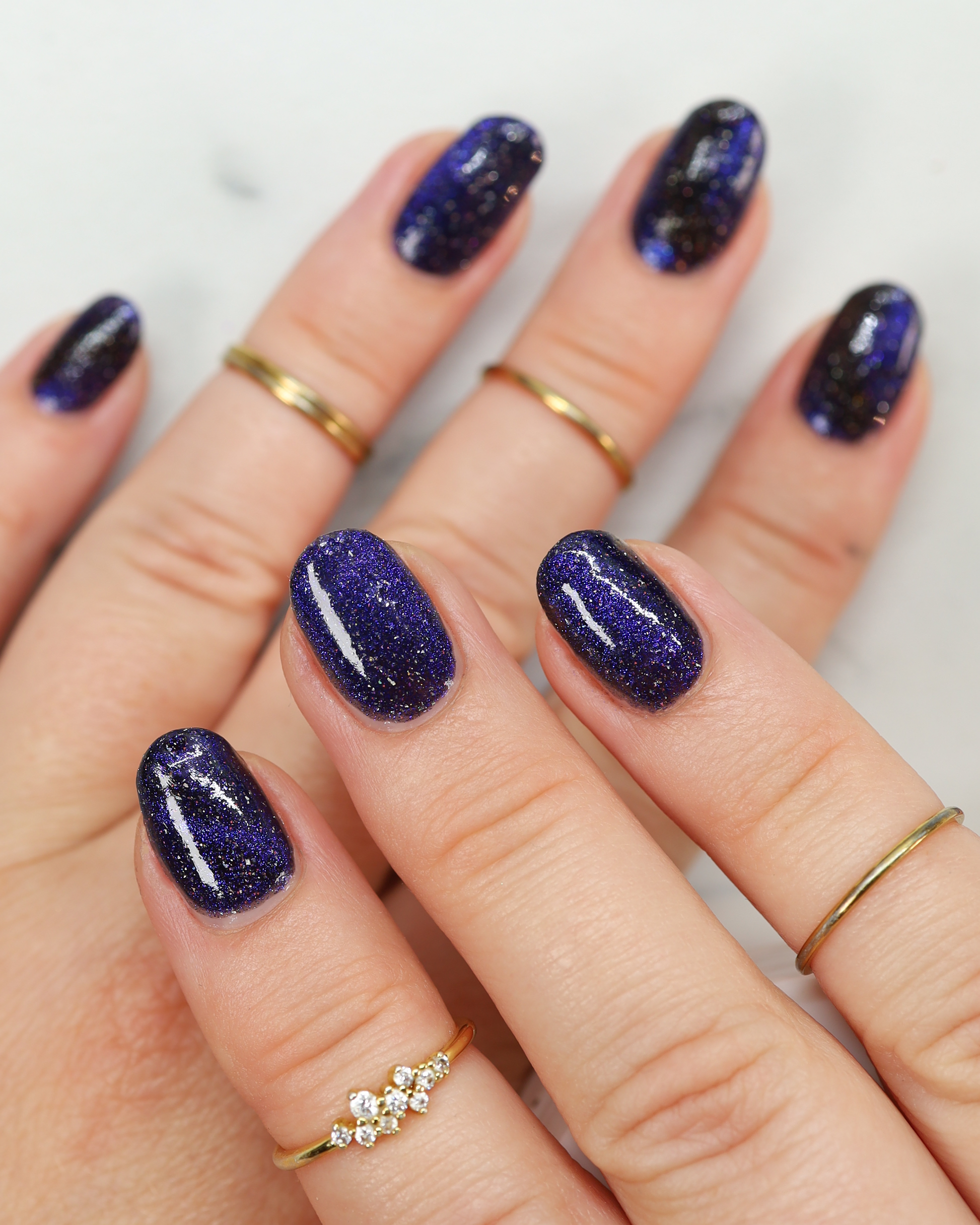 Dungeon Master Pi has a black base with silver, blue, red, and purple reflective glitter, micro holographic flakes, and indigo to purple magnetic pigment.