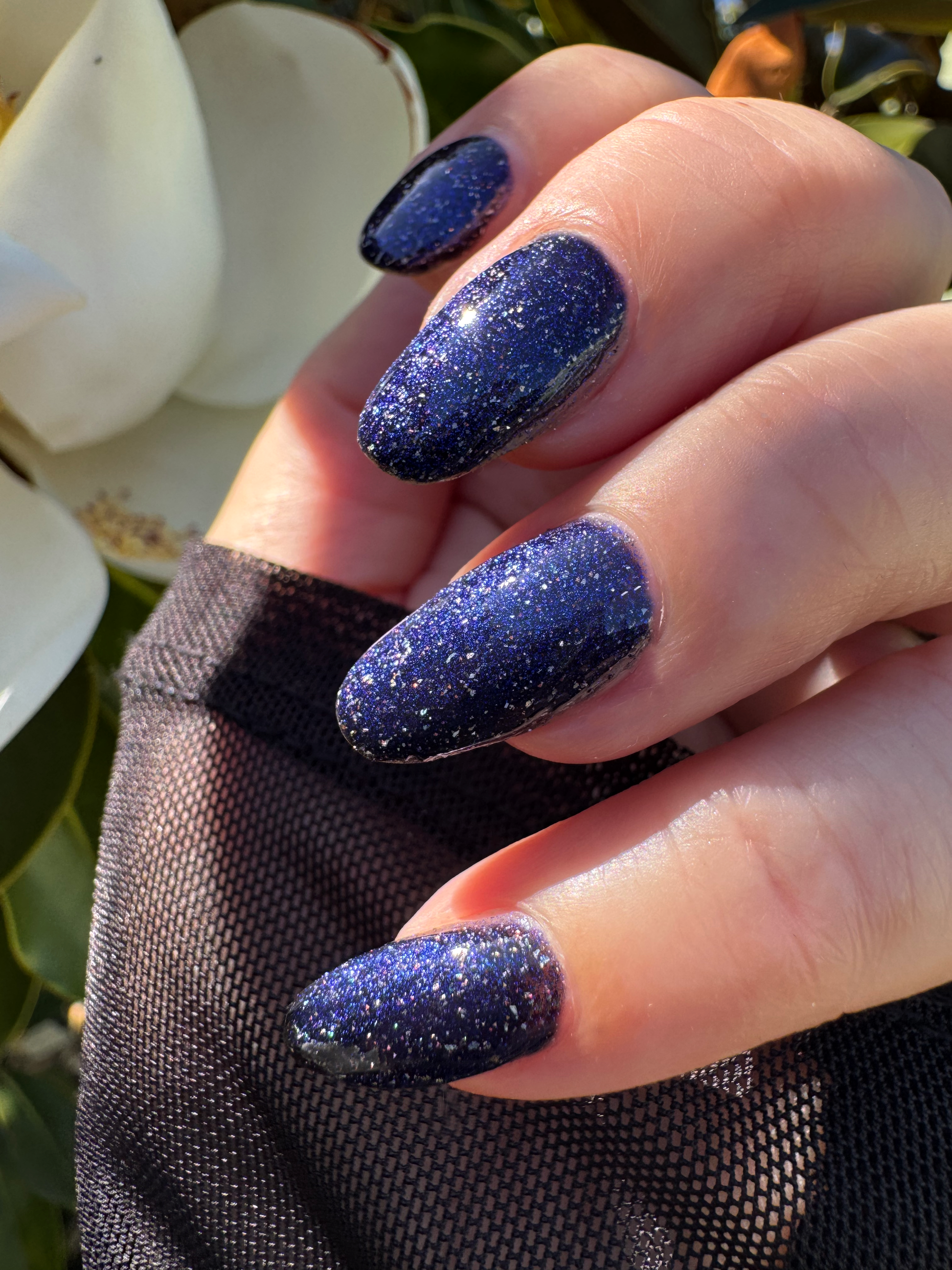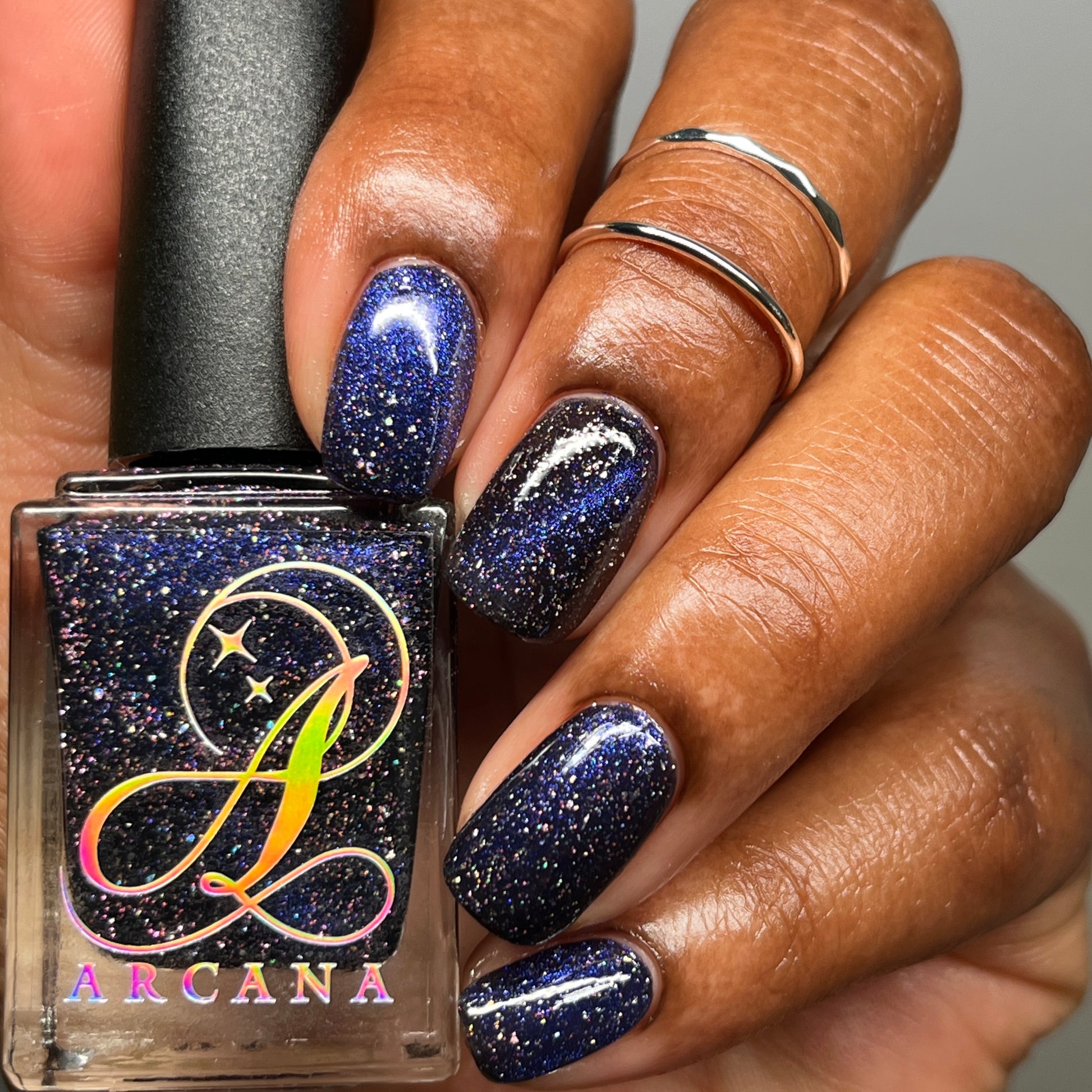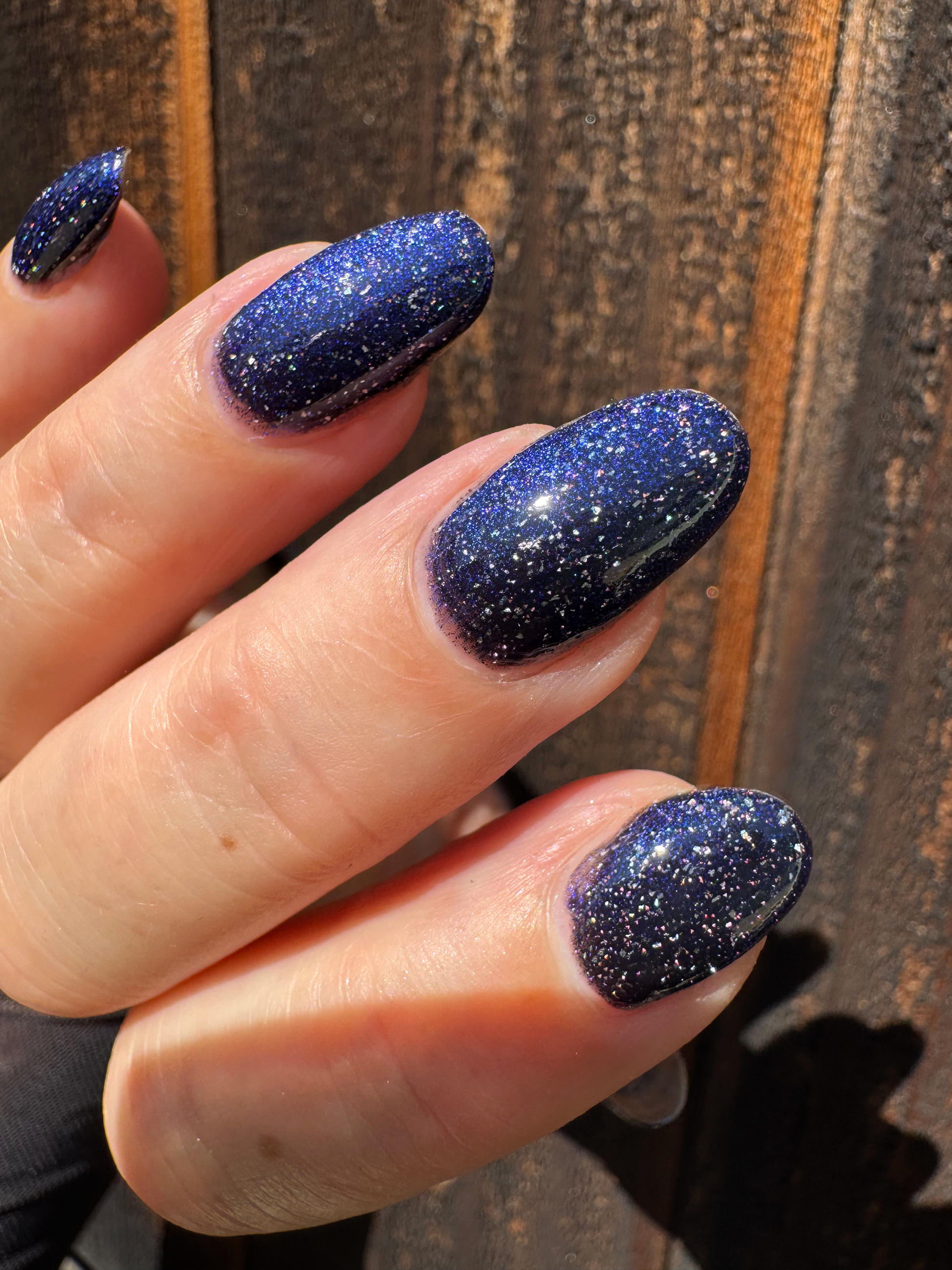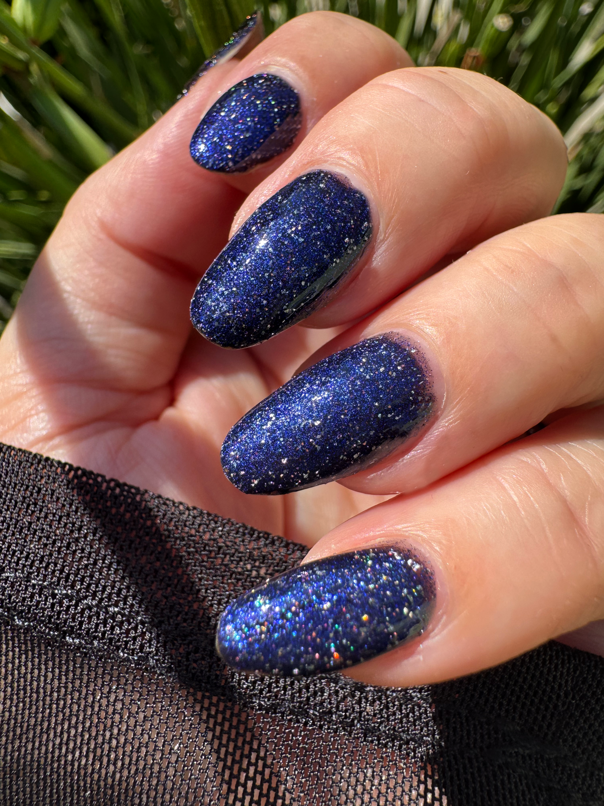 Dungeon Master Pi has a black base with silver, blue, red, and purple reflective glitter, micro holographic flakes, and indigo to purple magnetic pigment.