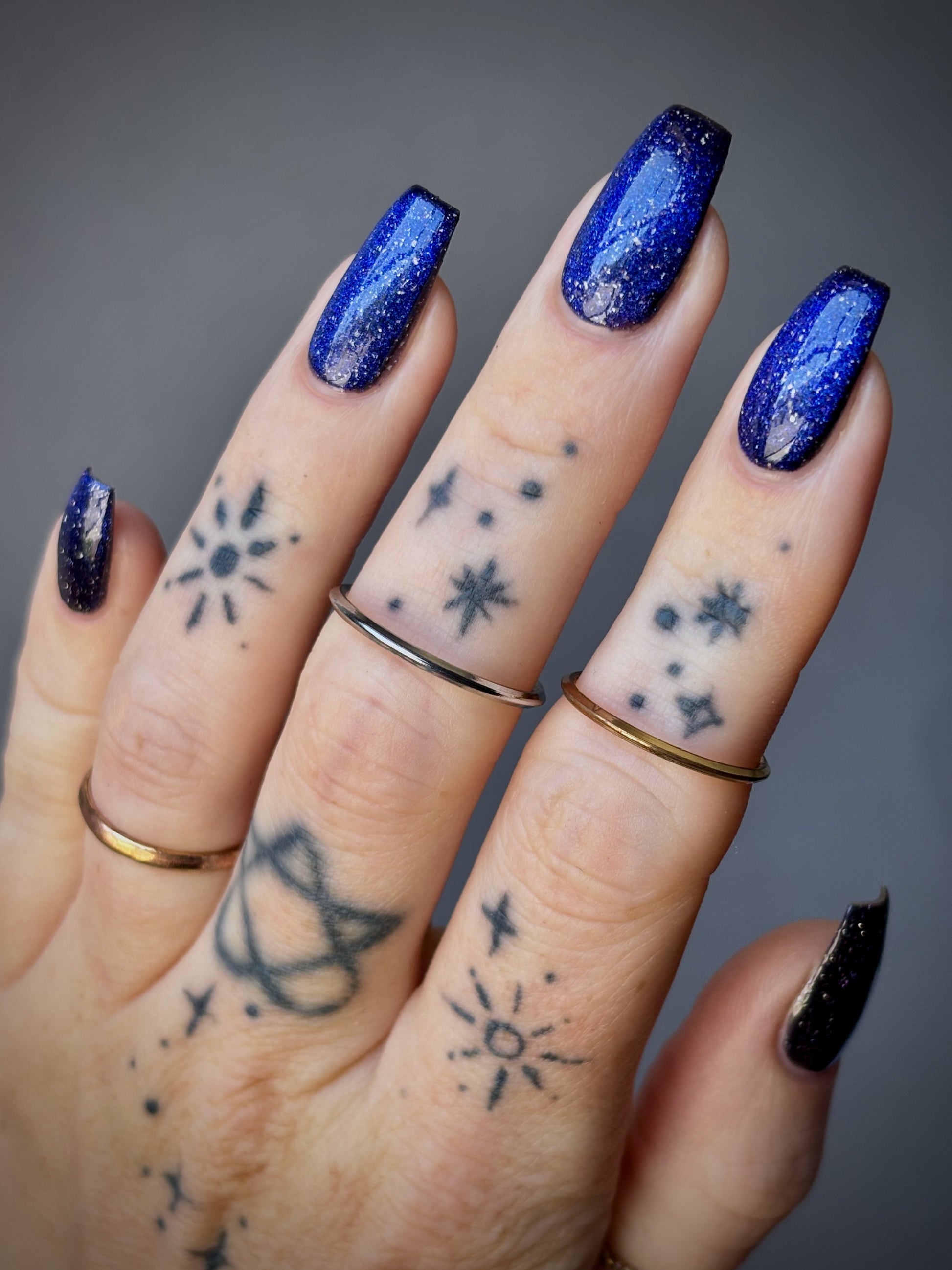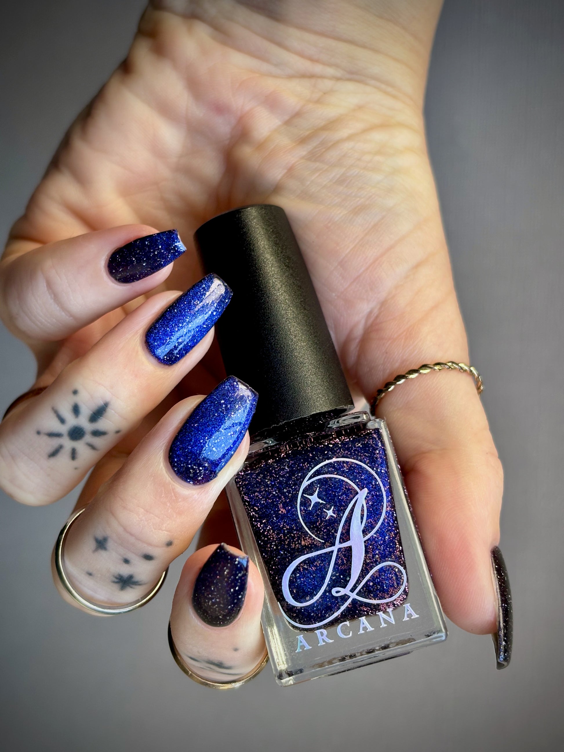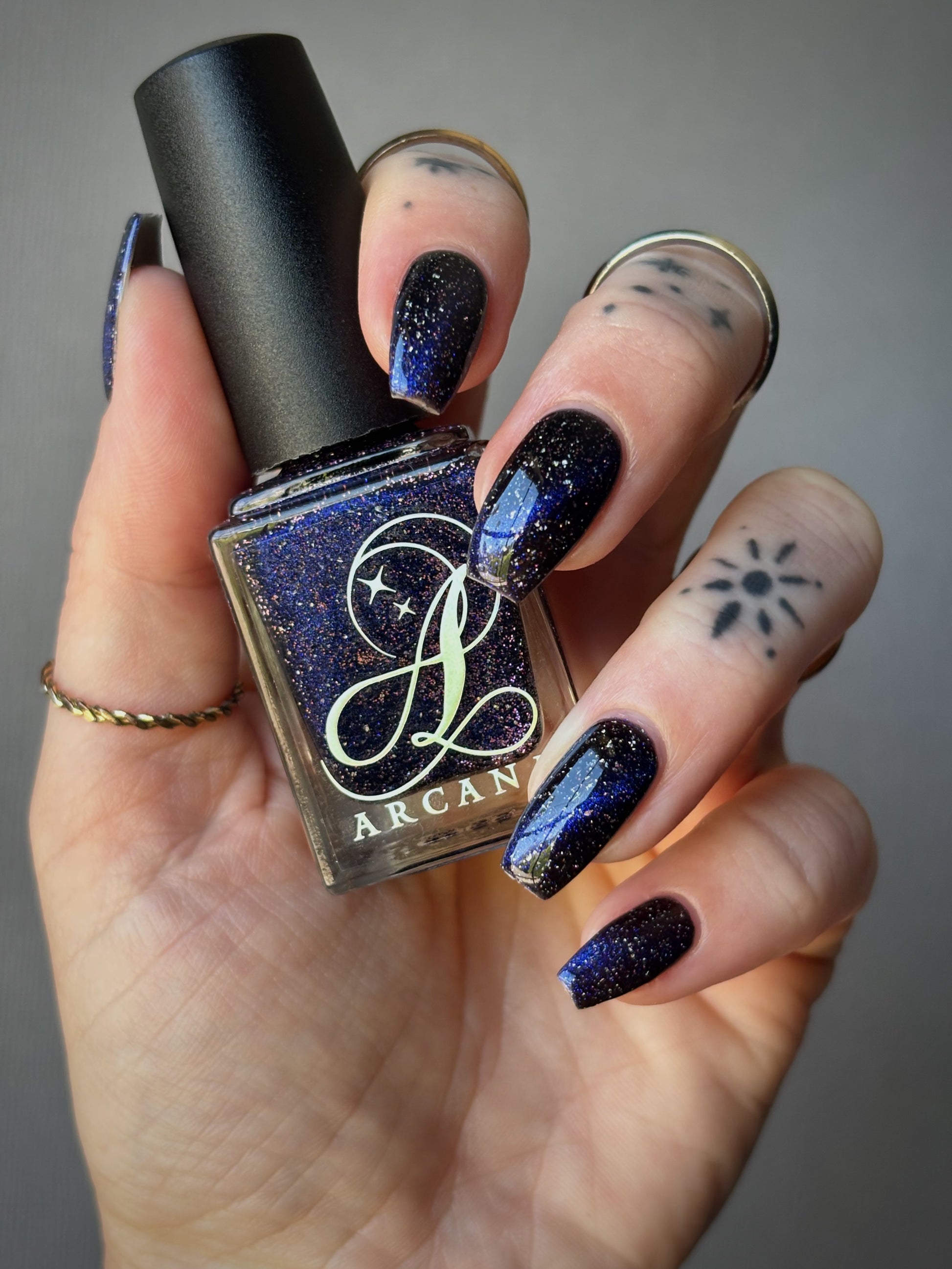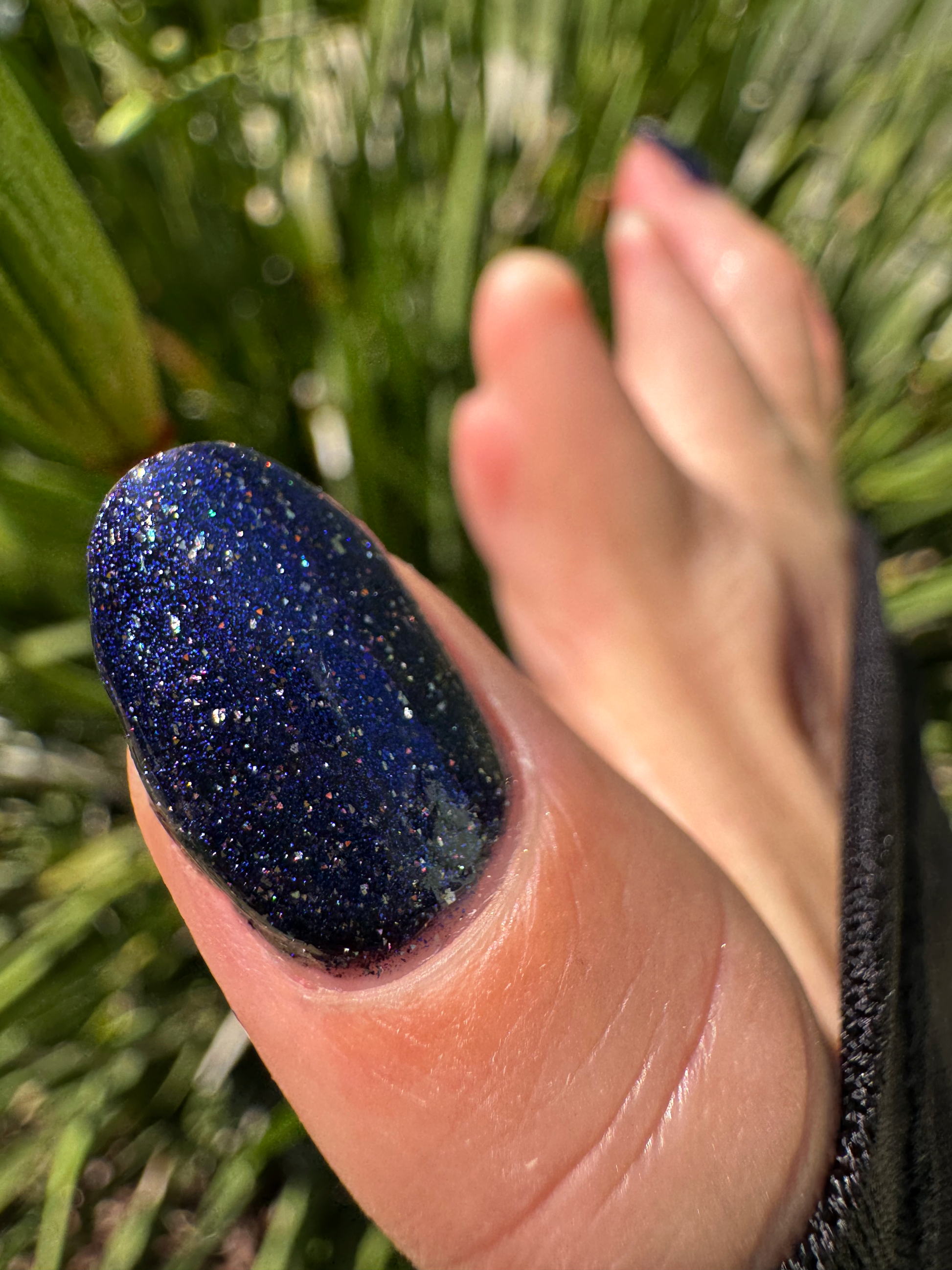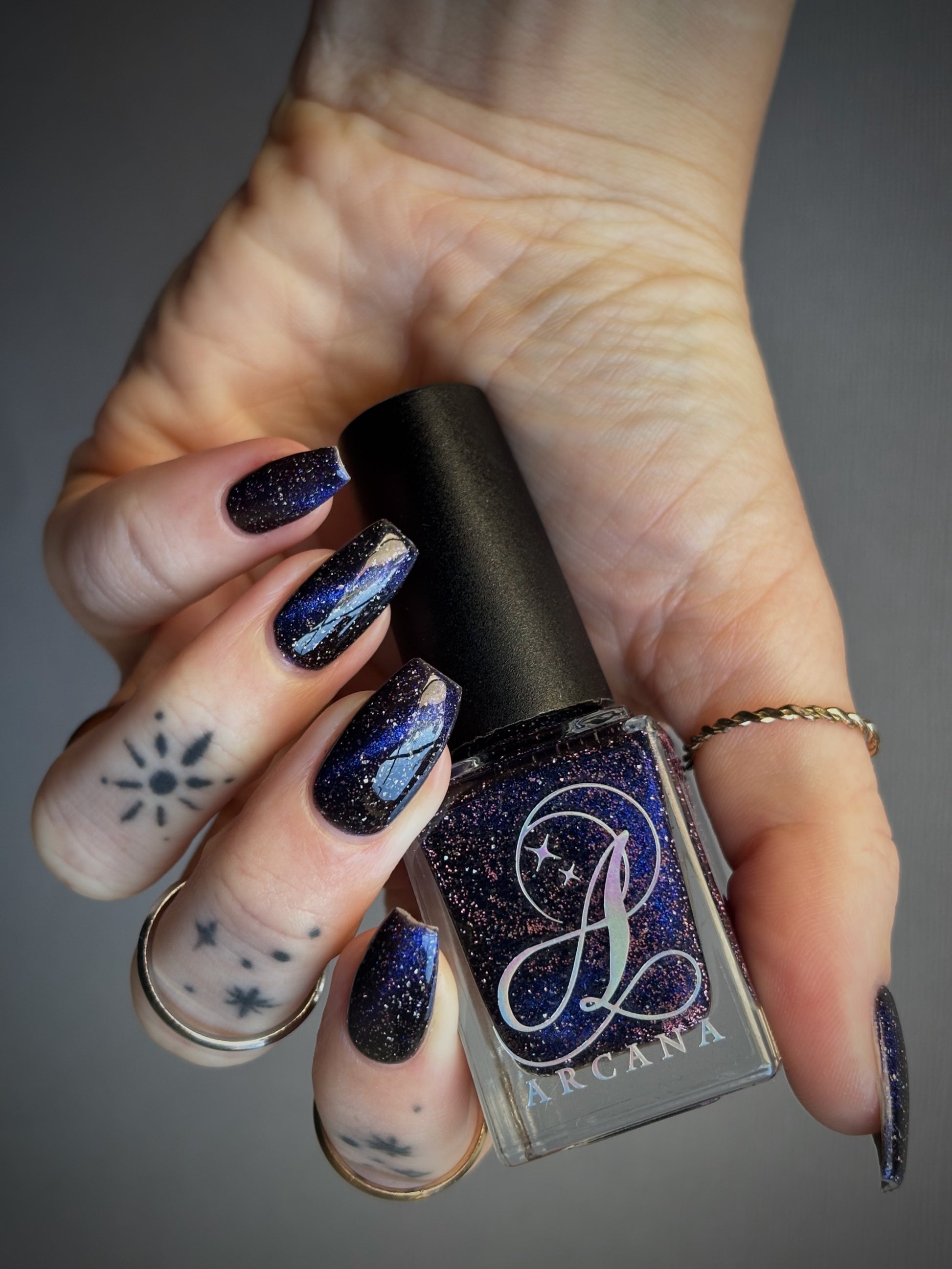 Dungeon Master Pi has a black base with silver, blue, red, and purple reflective glitter, micro holographic flakes, and indigo to purple magnetic pigment.