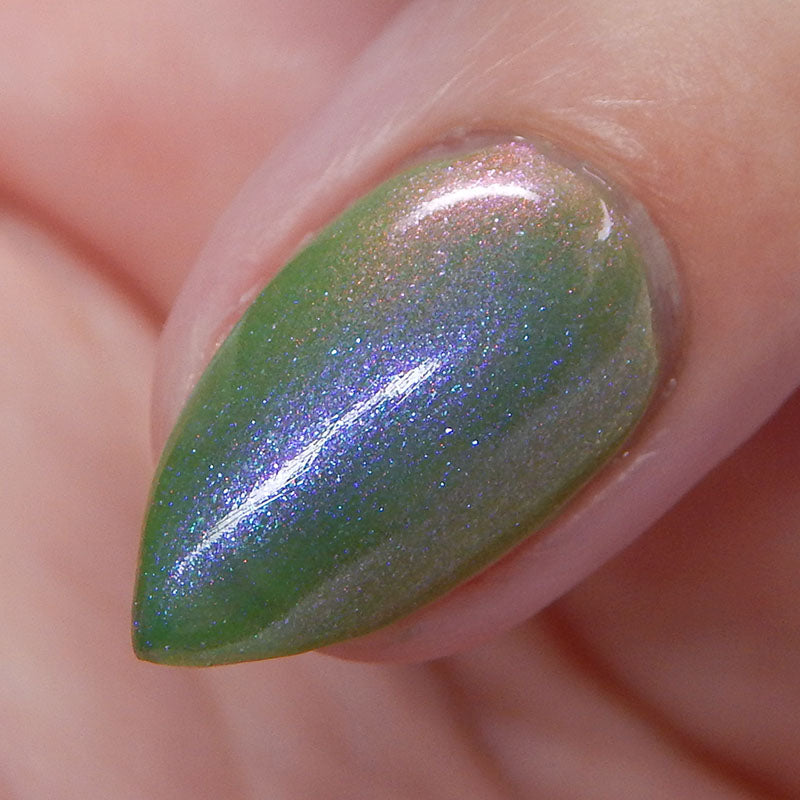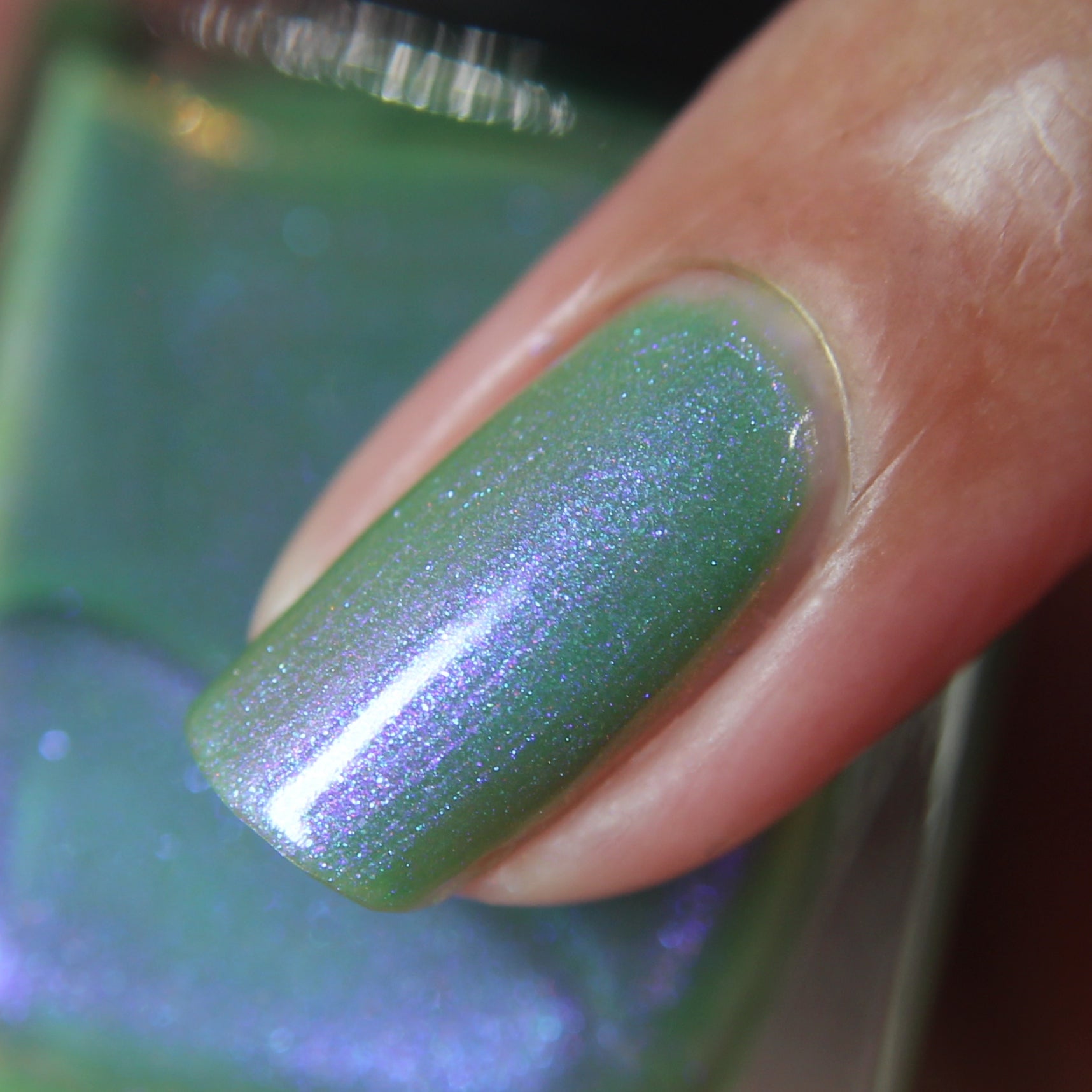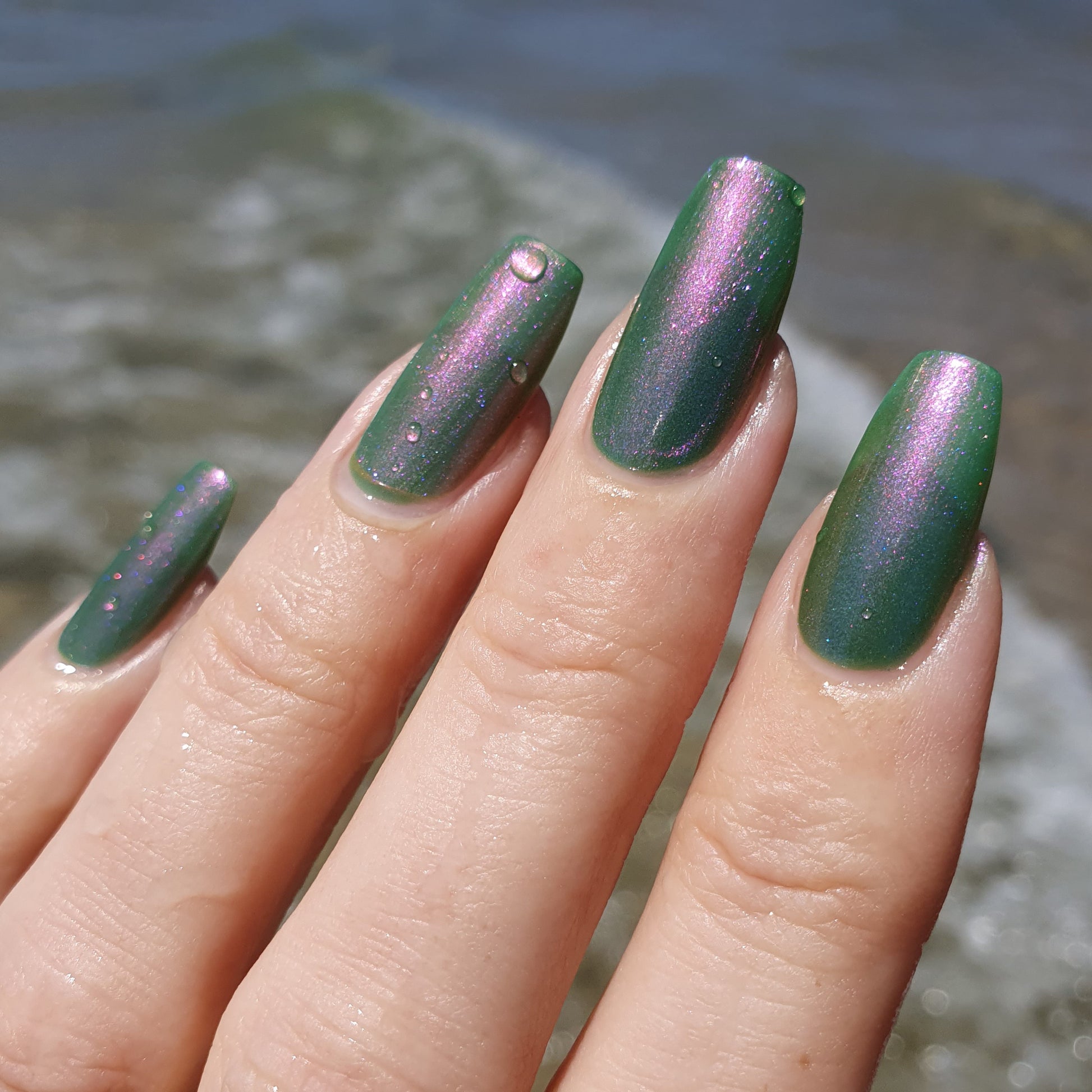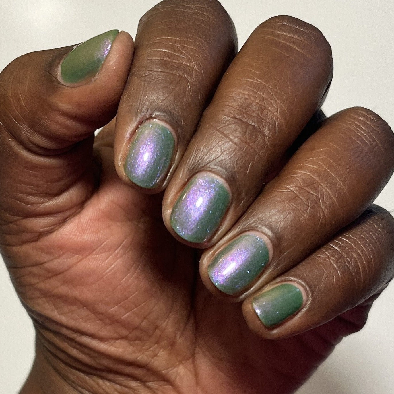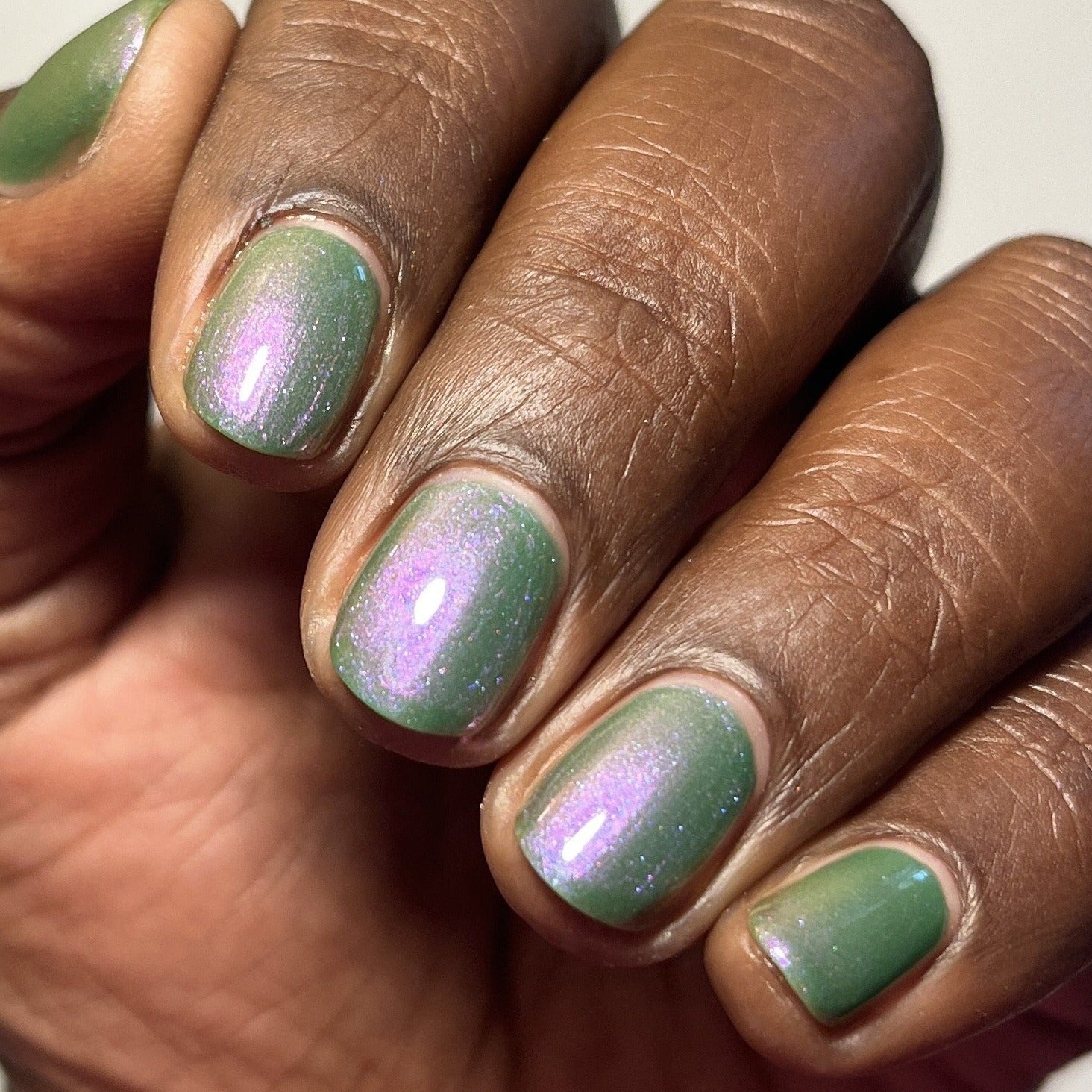 This one is a dusty green polish with a violet to red aurora shimmer!