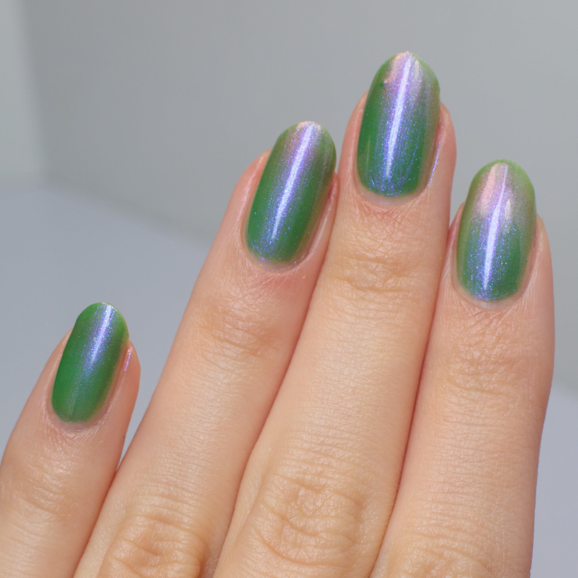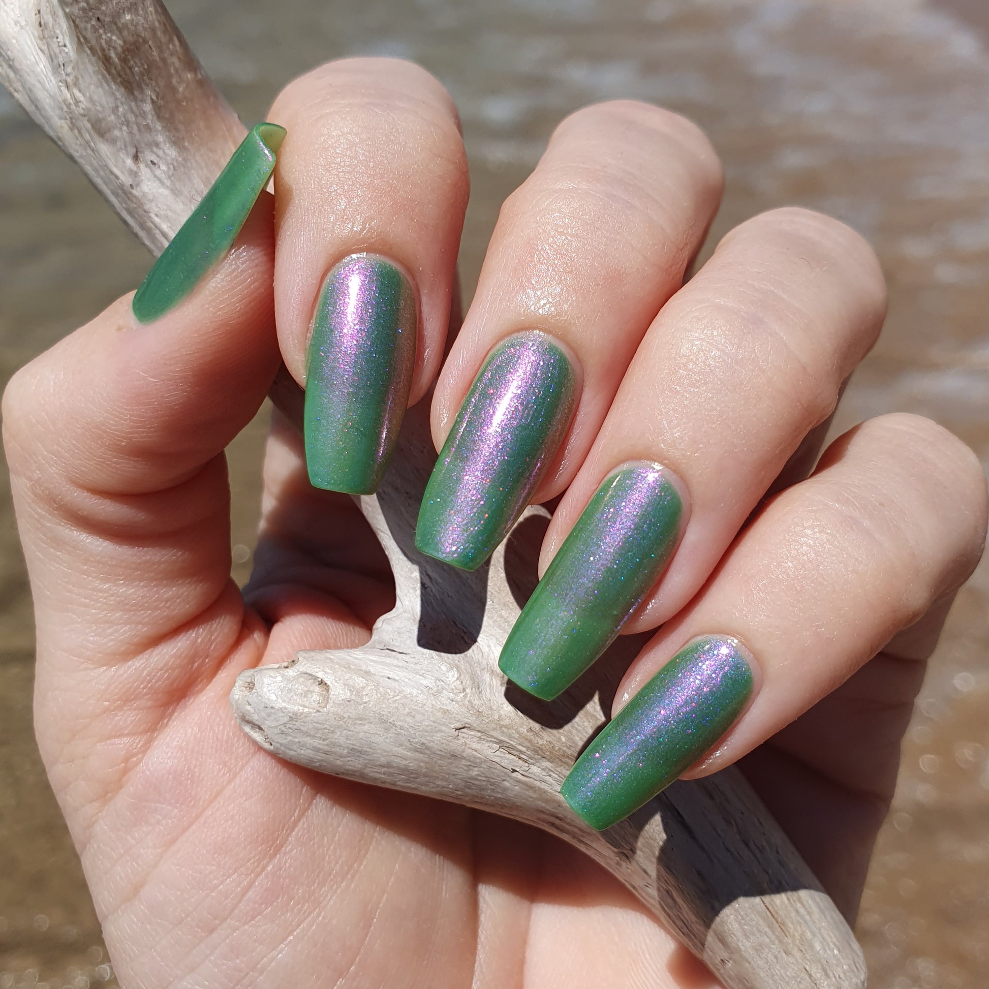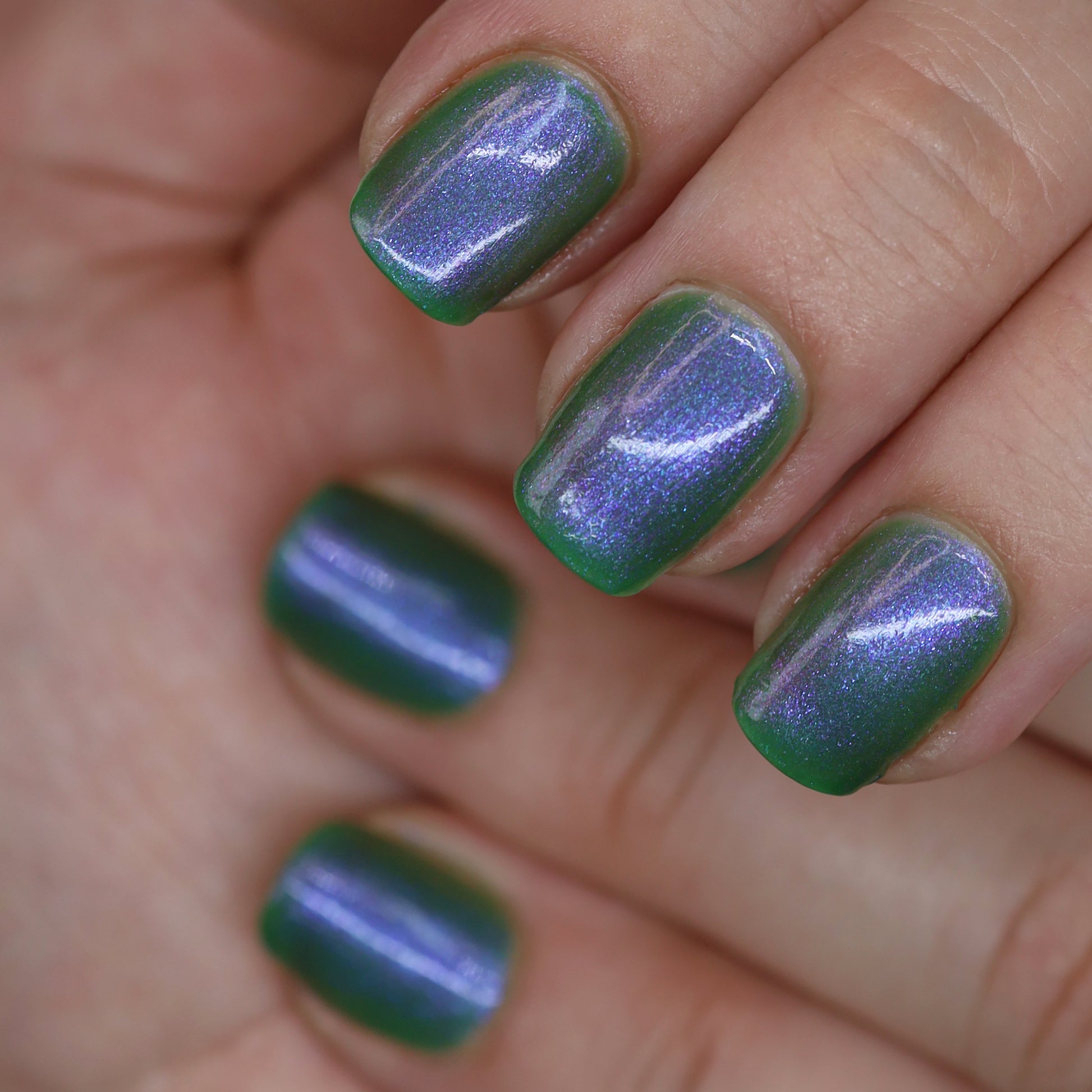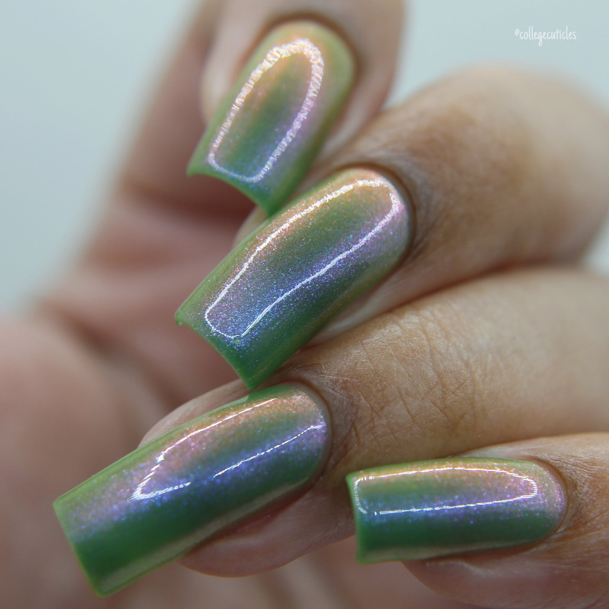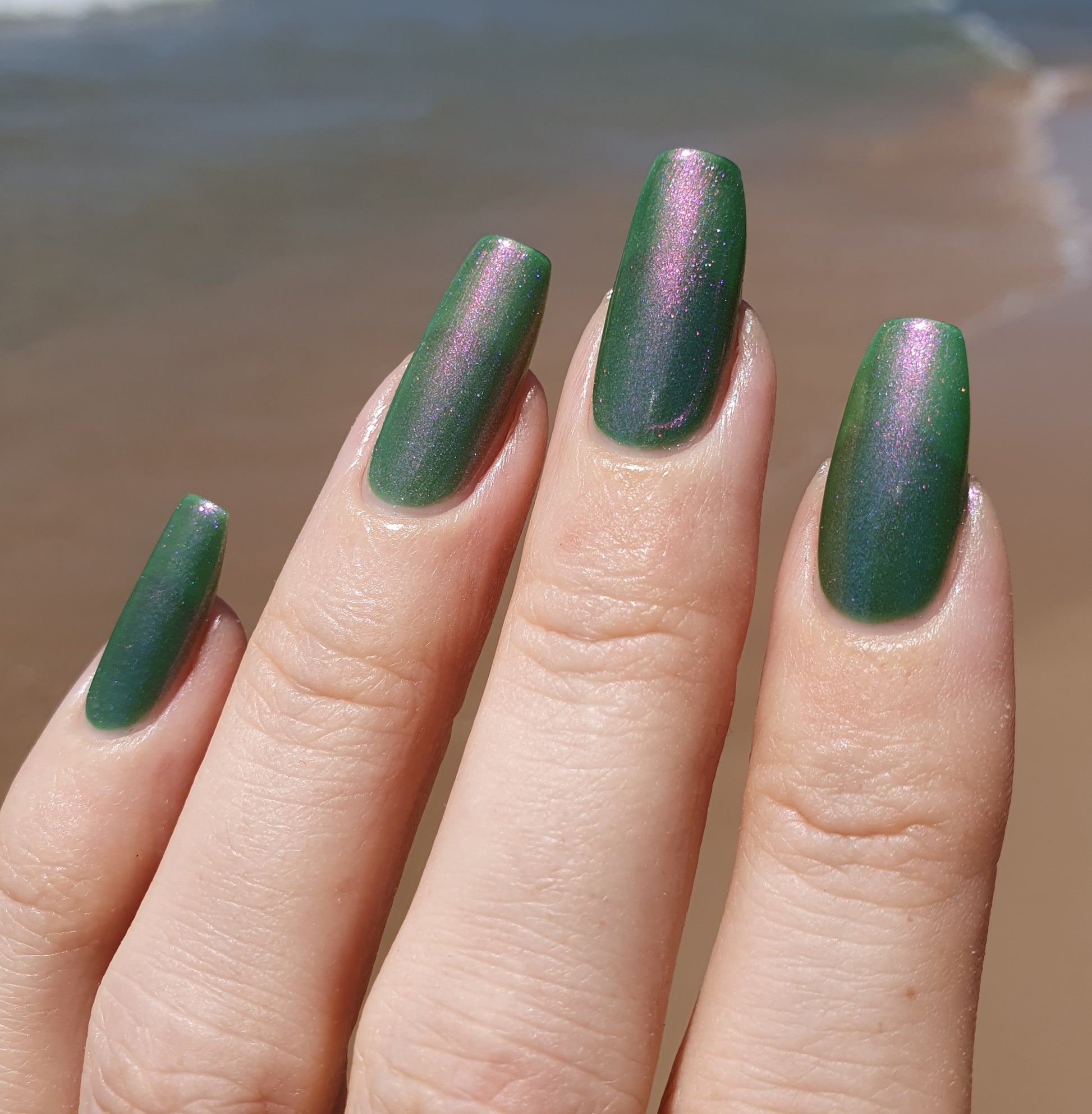 This one is a dusty green polish with a violet to red aurora shimmer!
