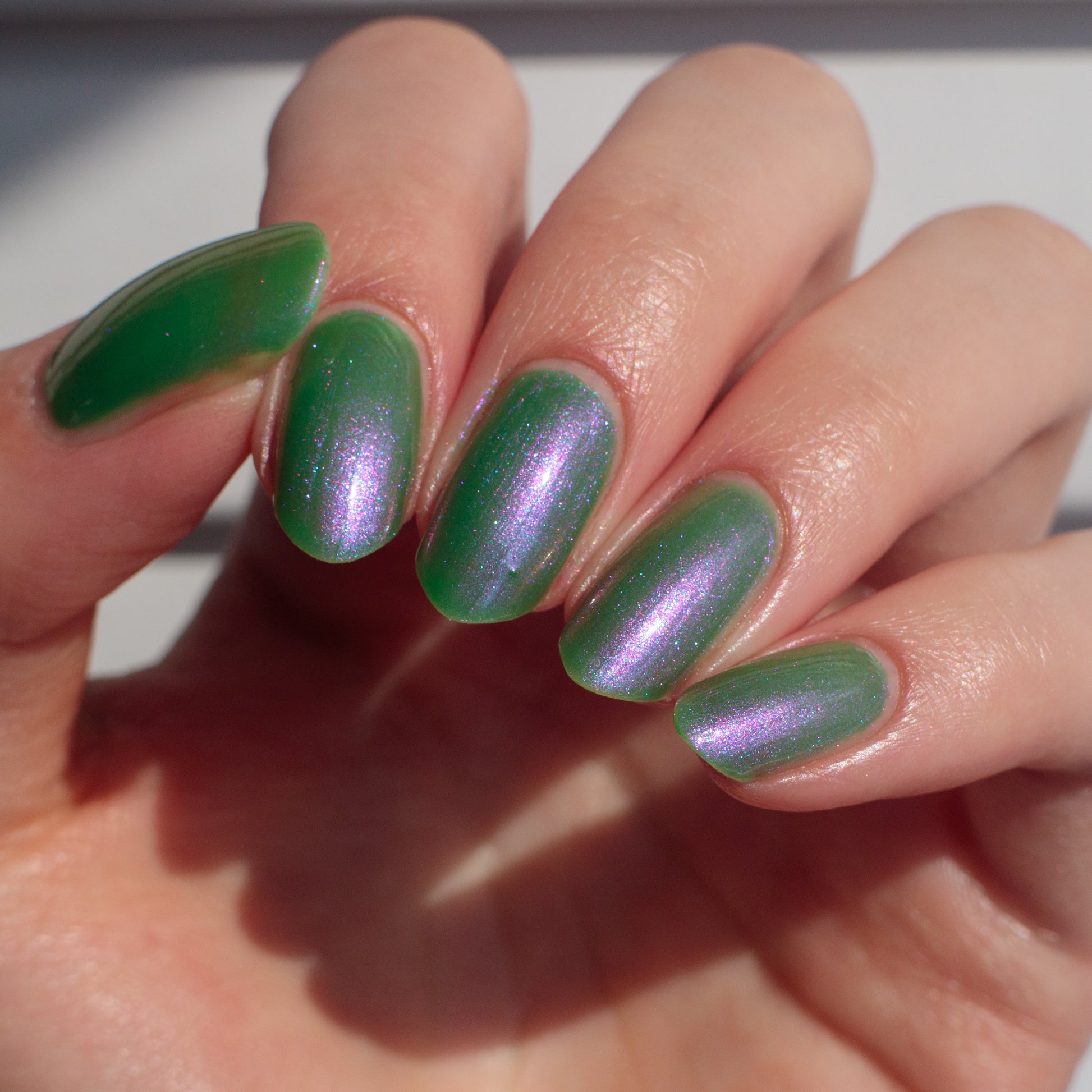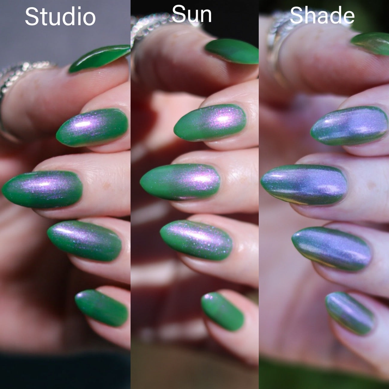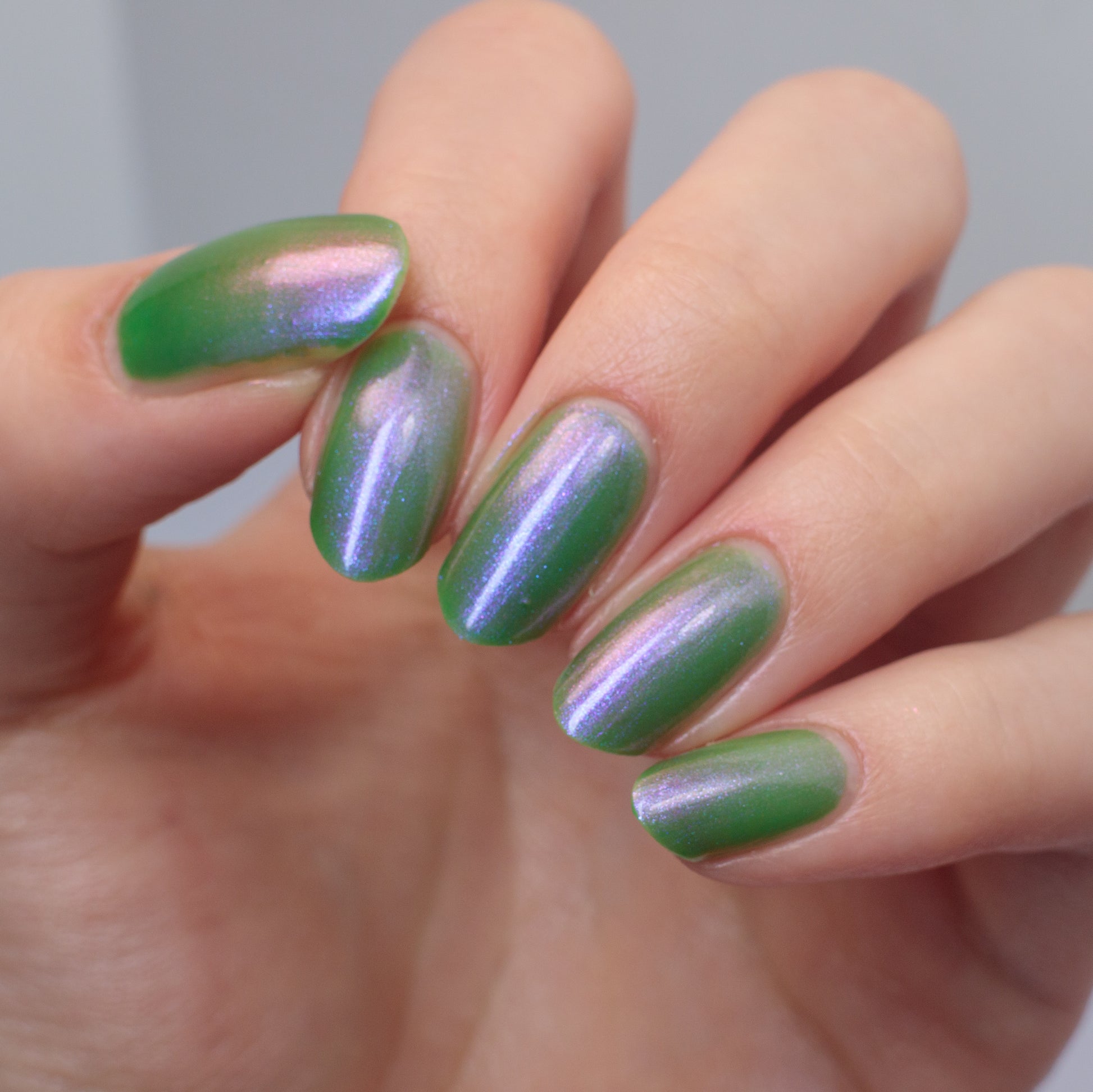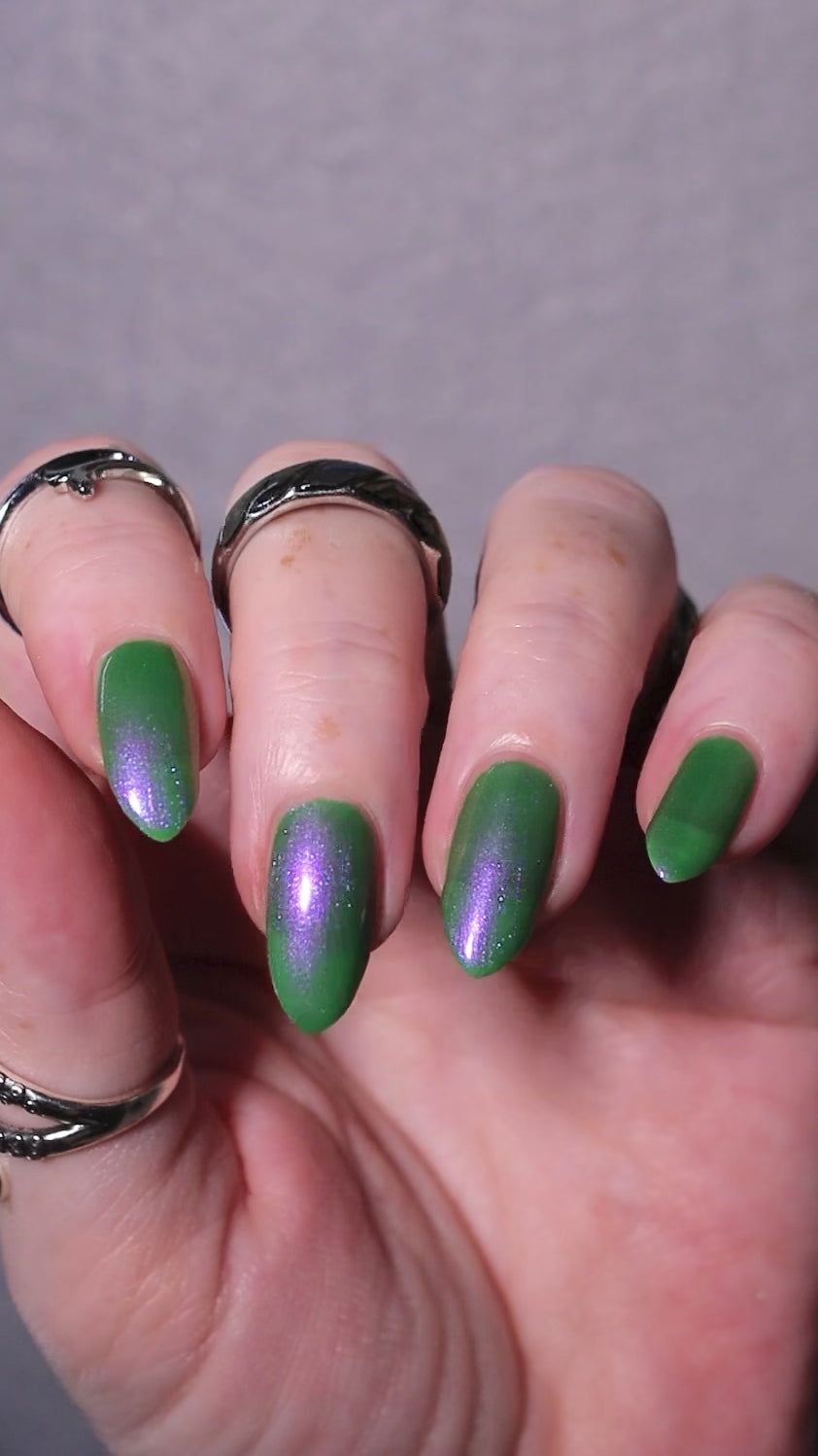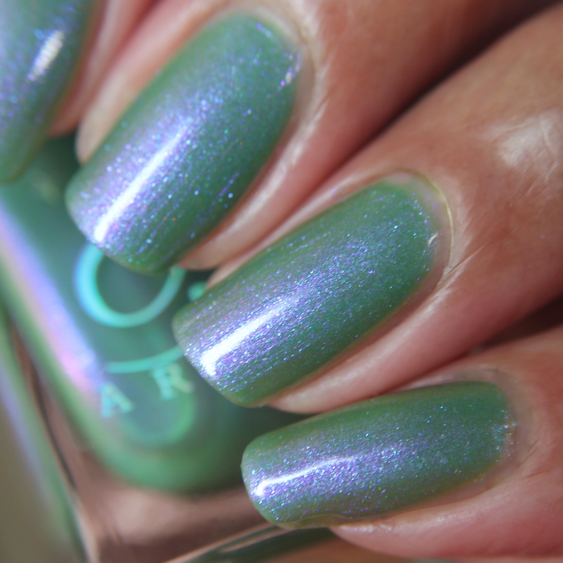 This one is a dusty green polish with a violet to red aurora shimmer!