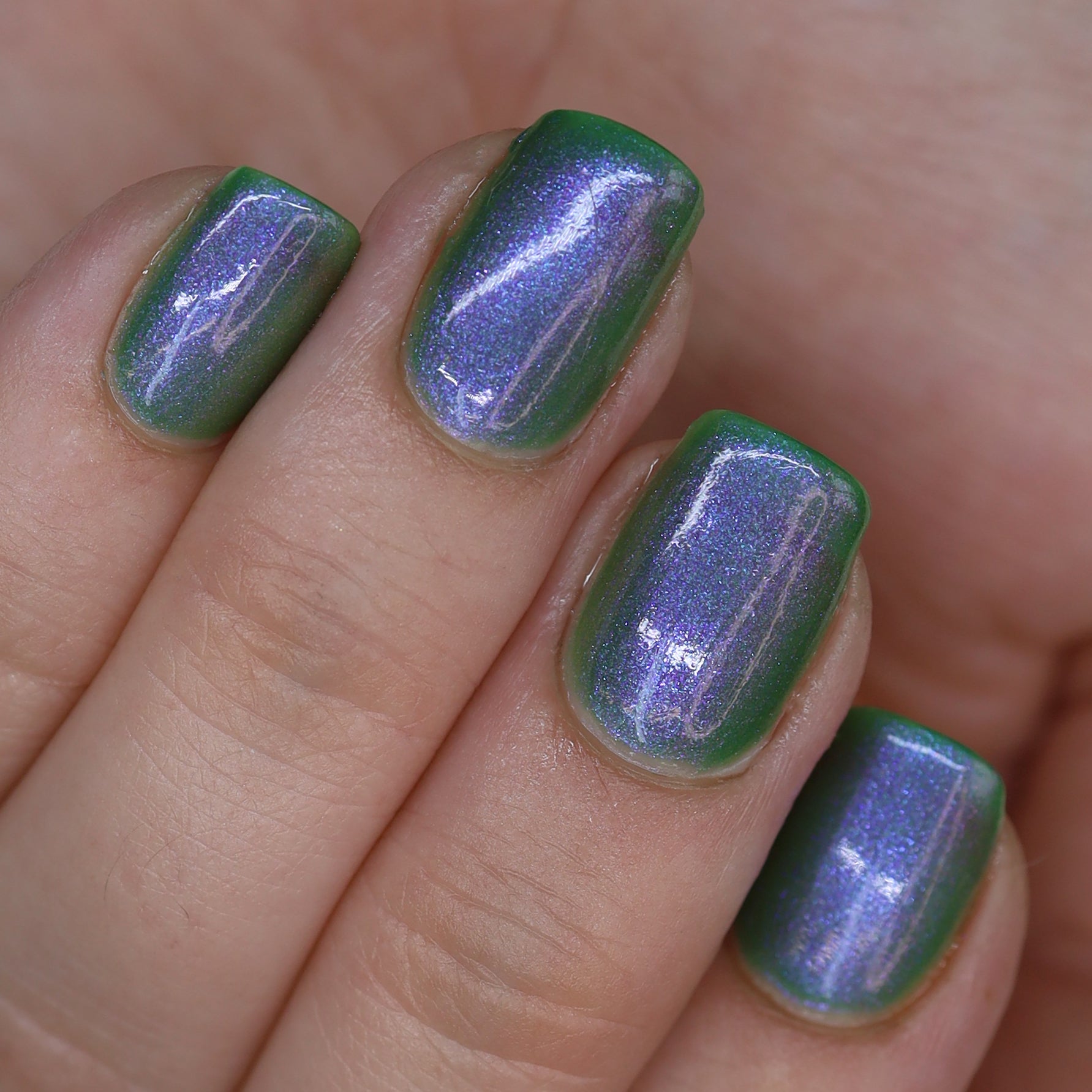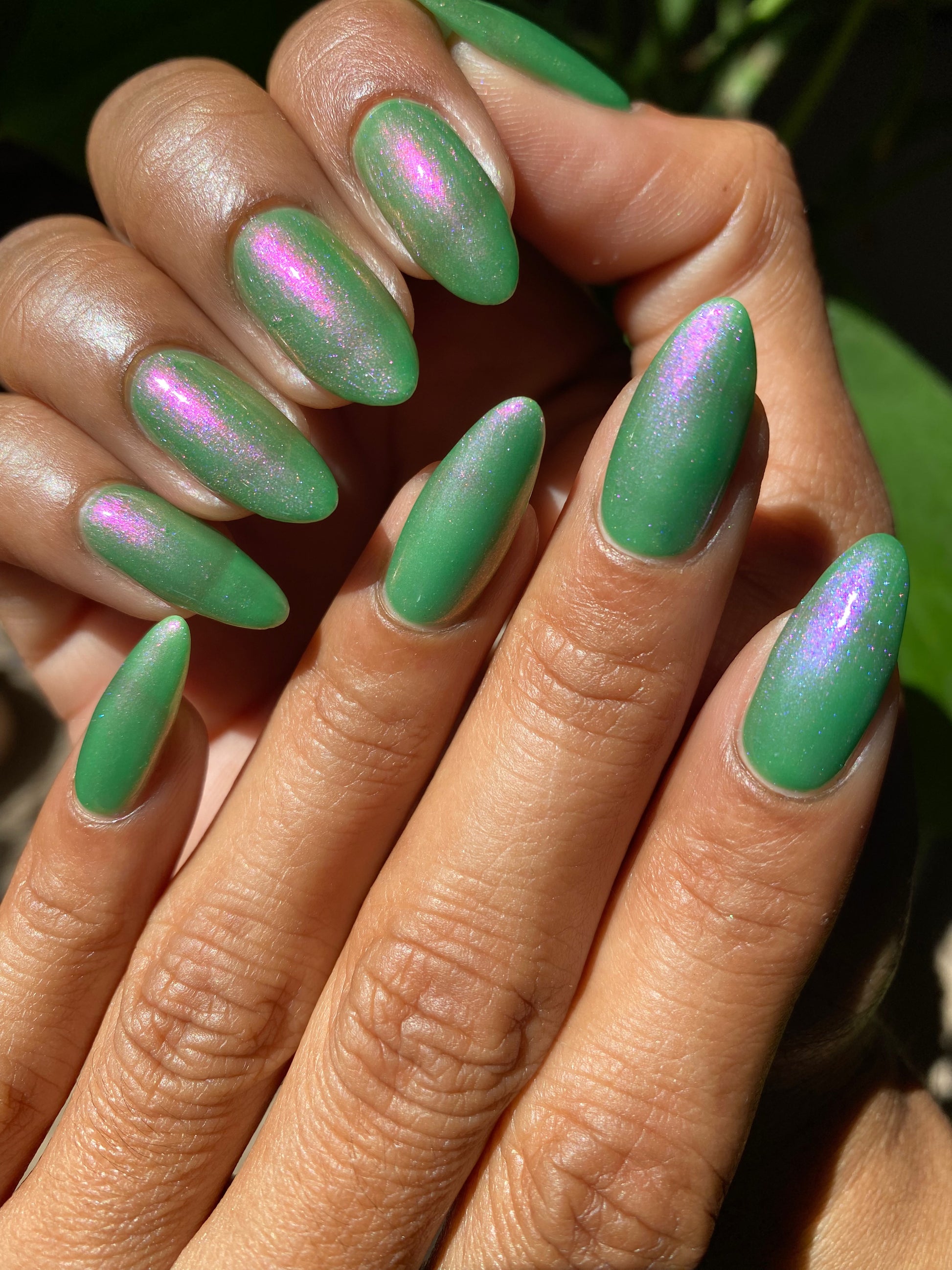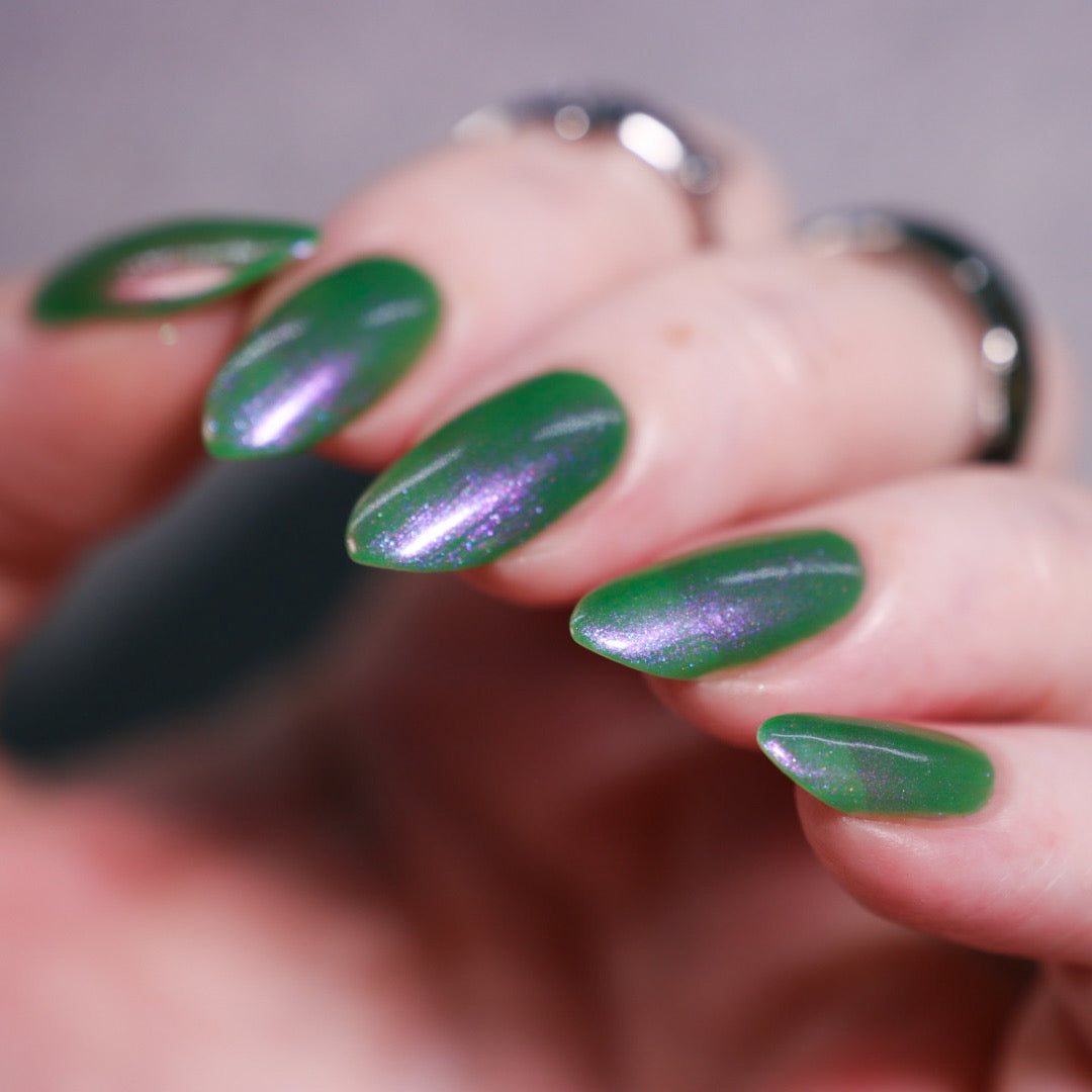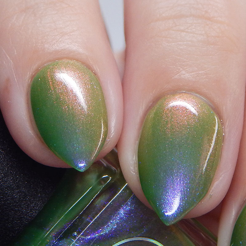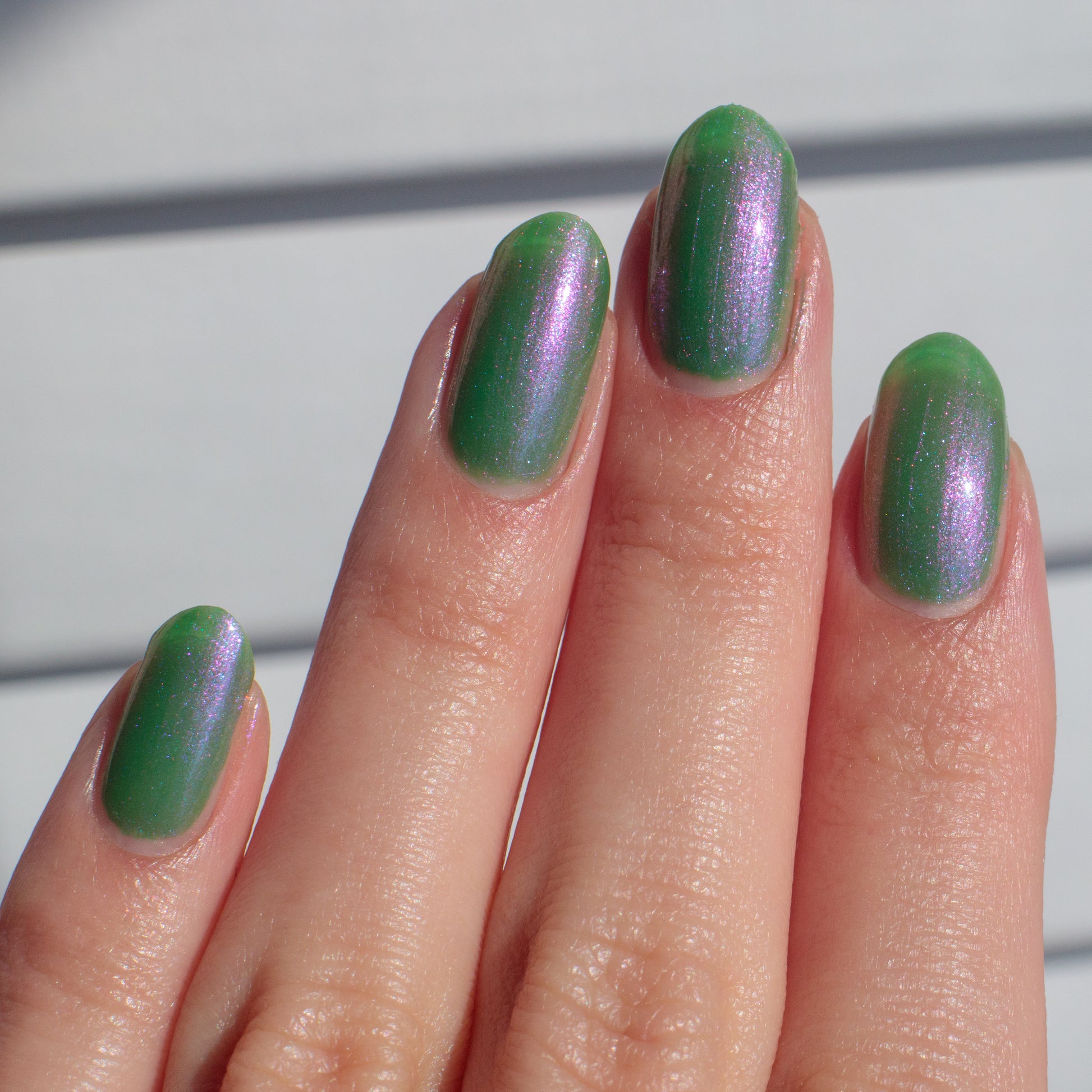 This one is a dusty green polish with a violet to red aurora shimmer!