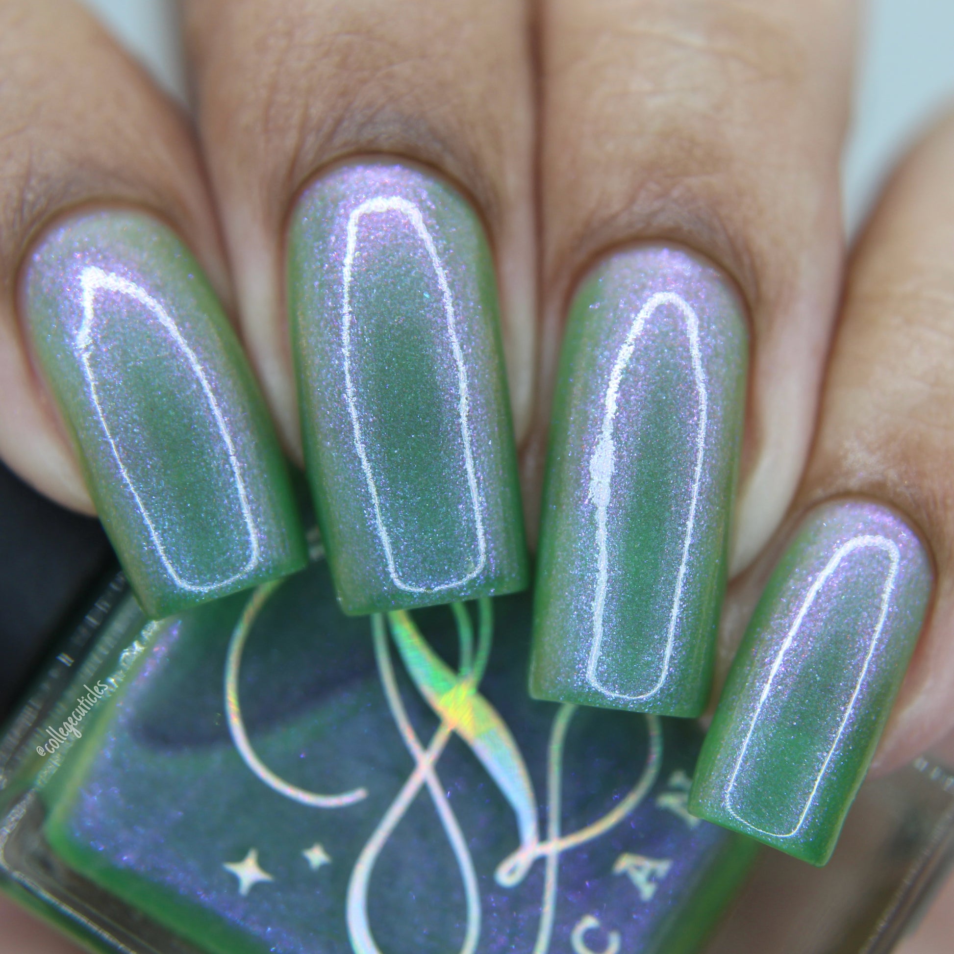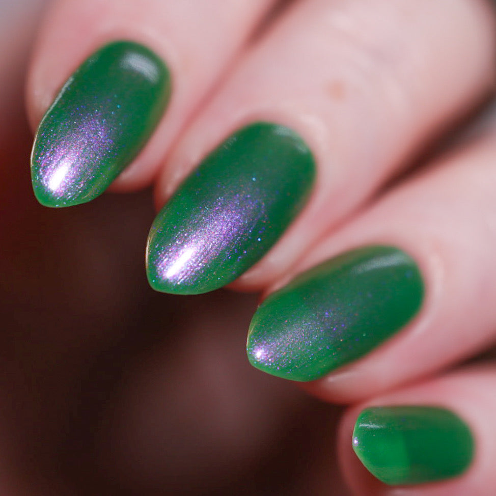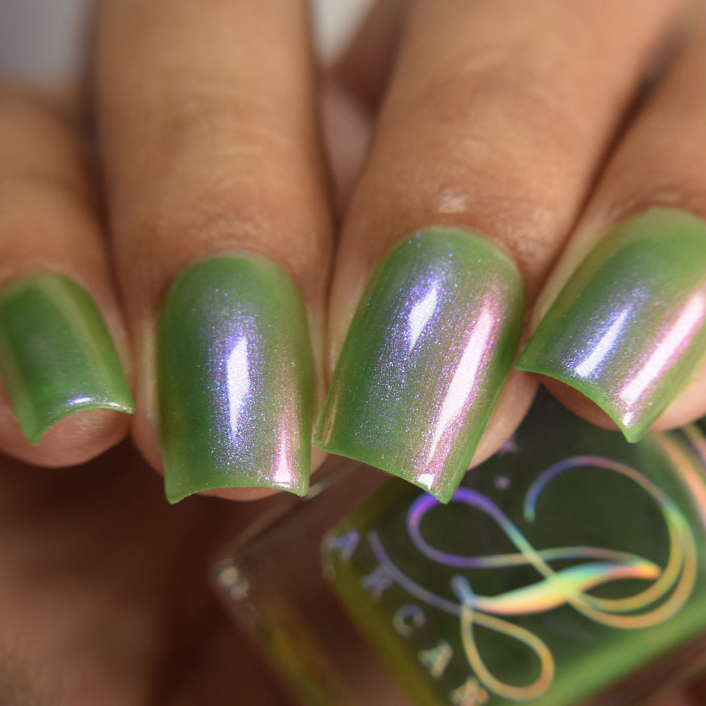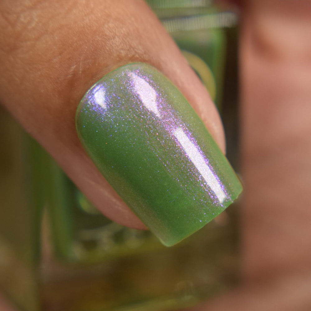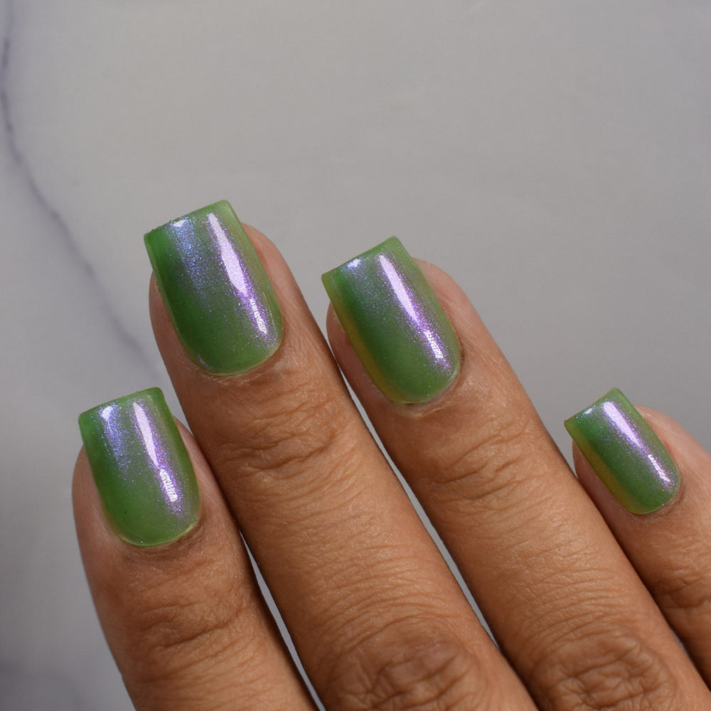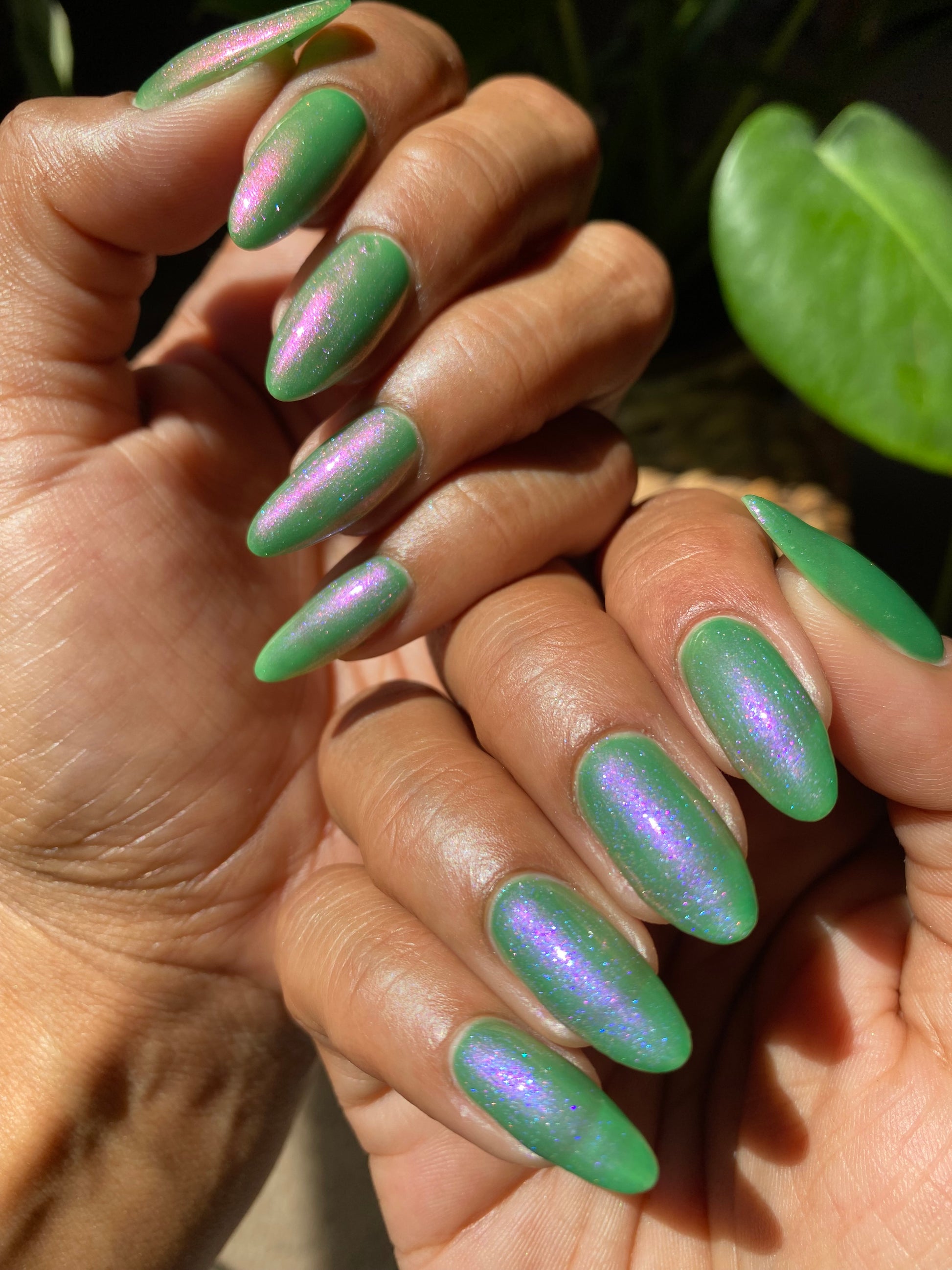 This one is a dusty green polish with a violet to red aurora shimmer!