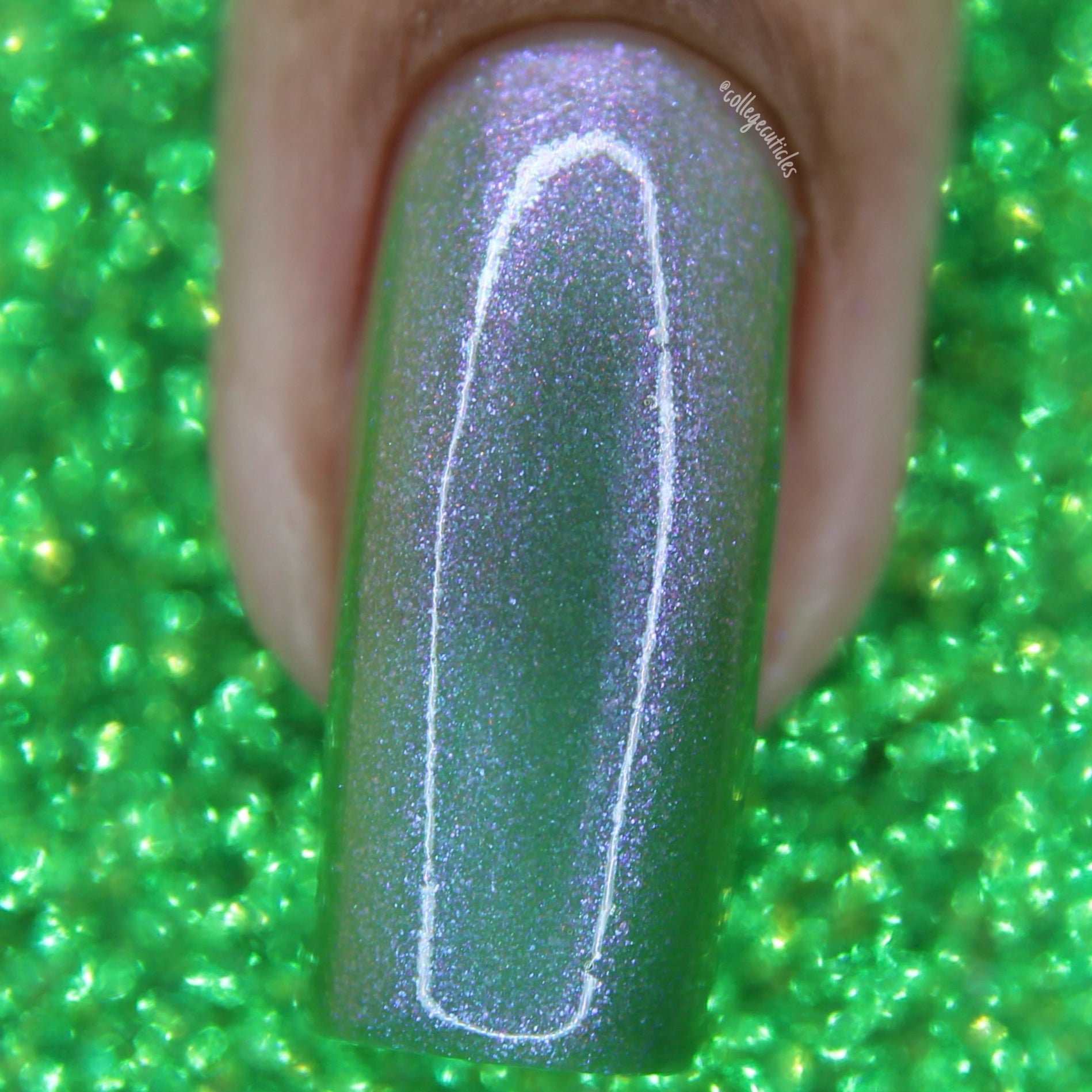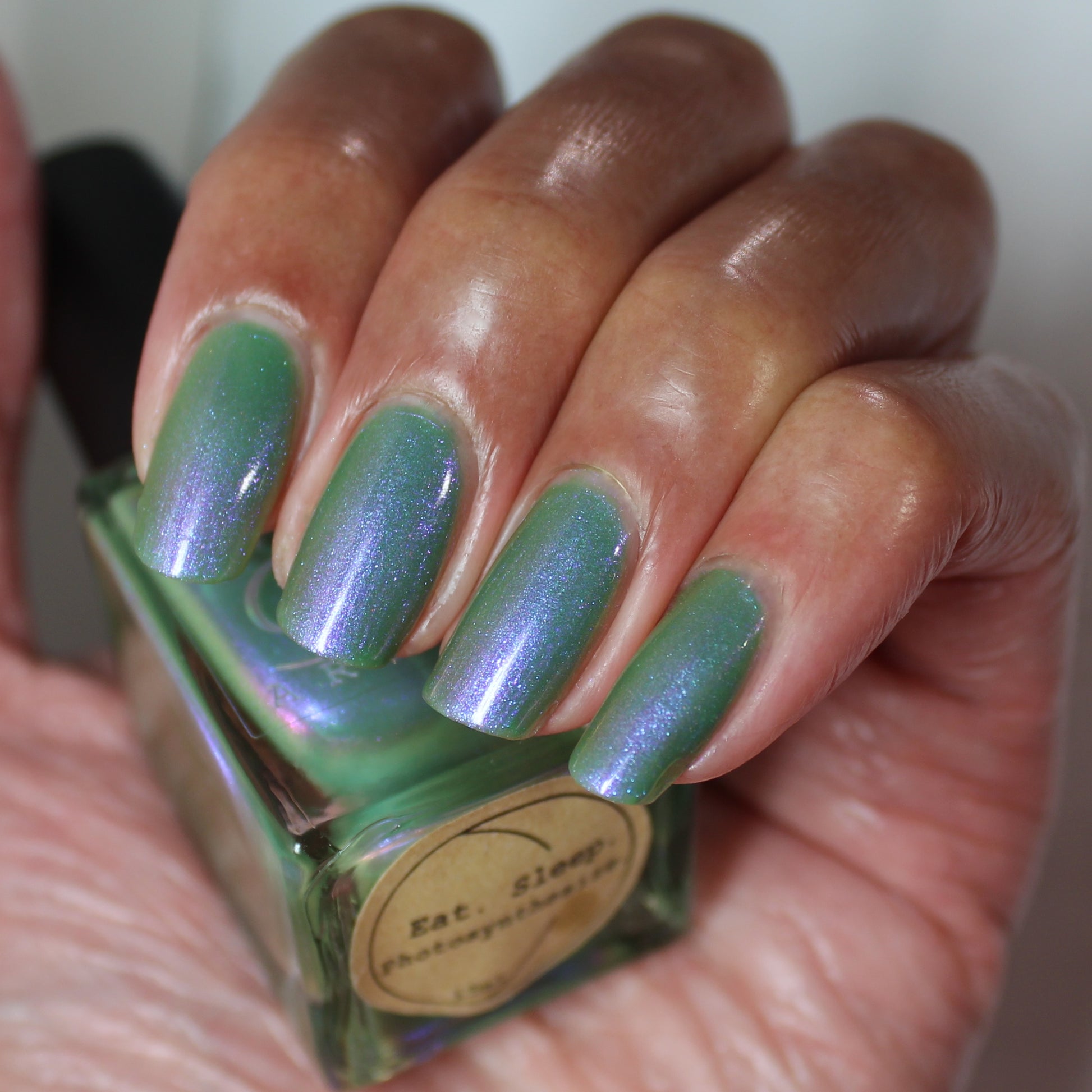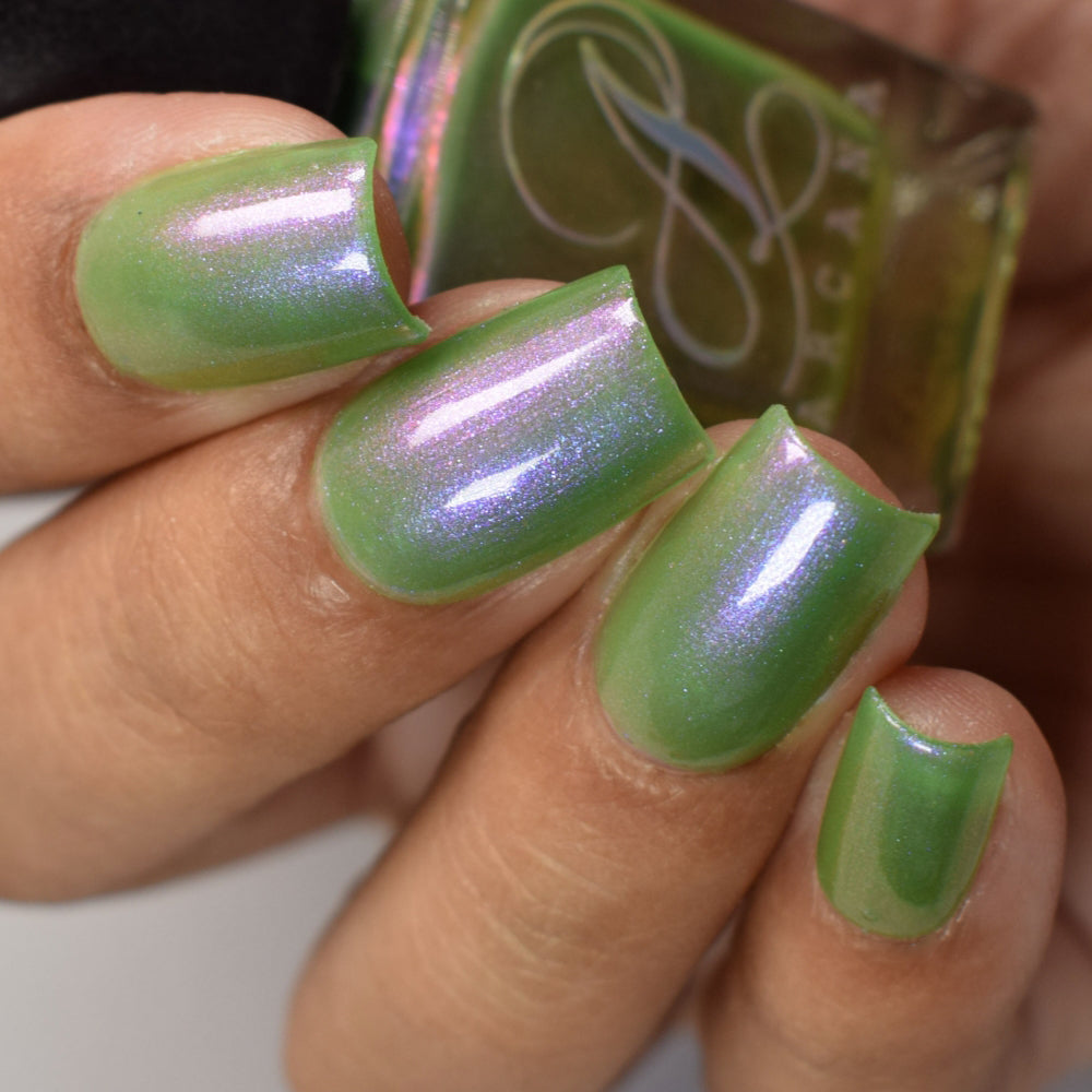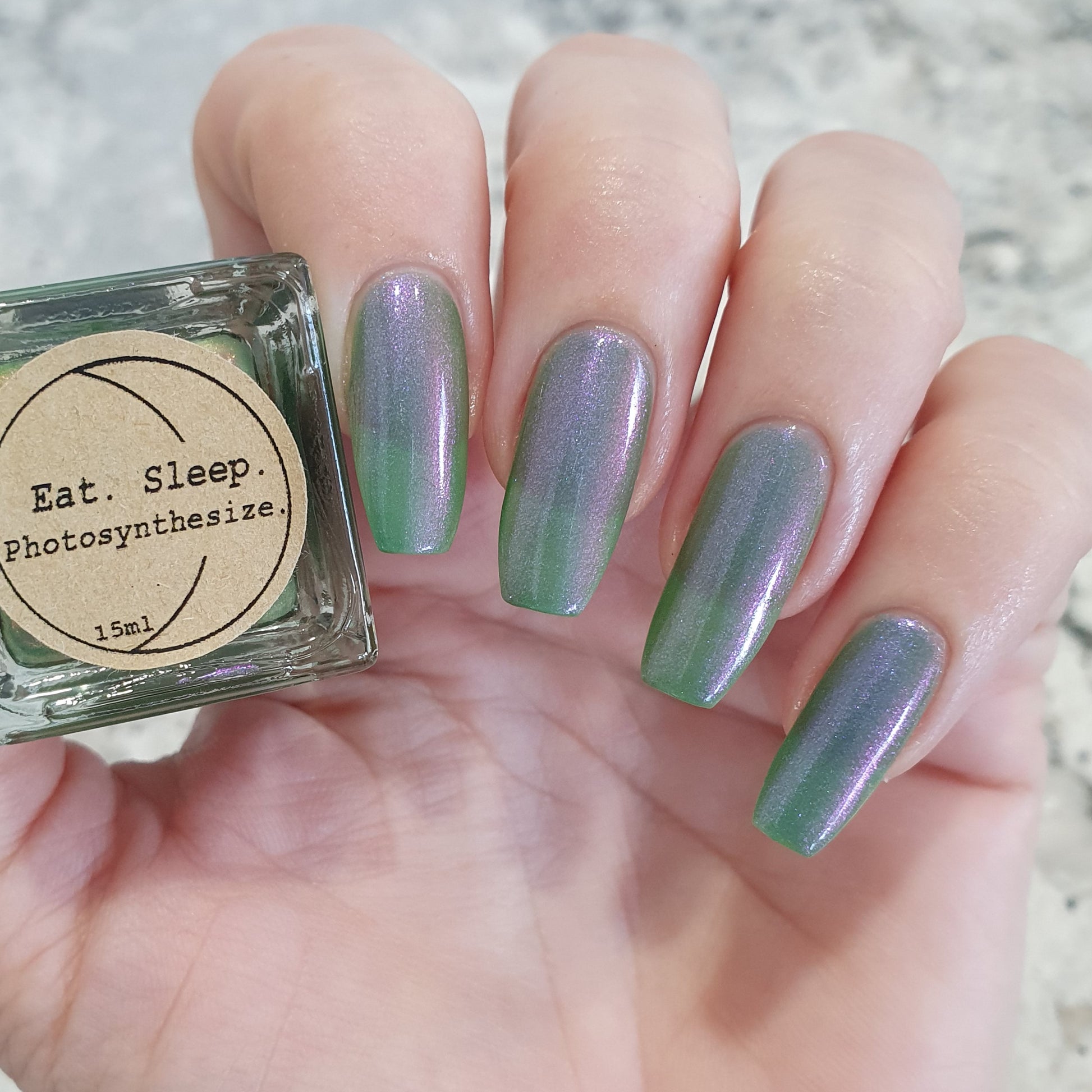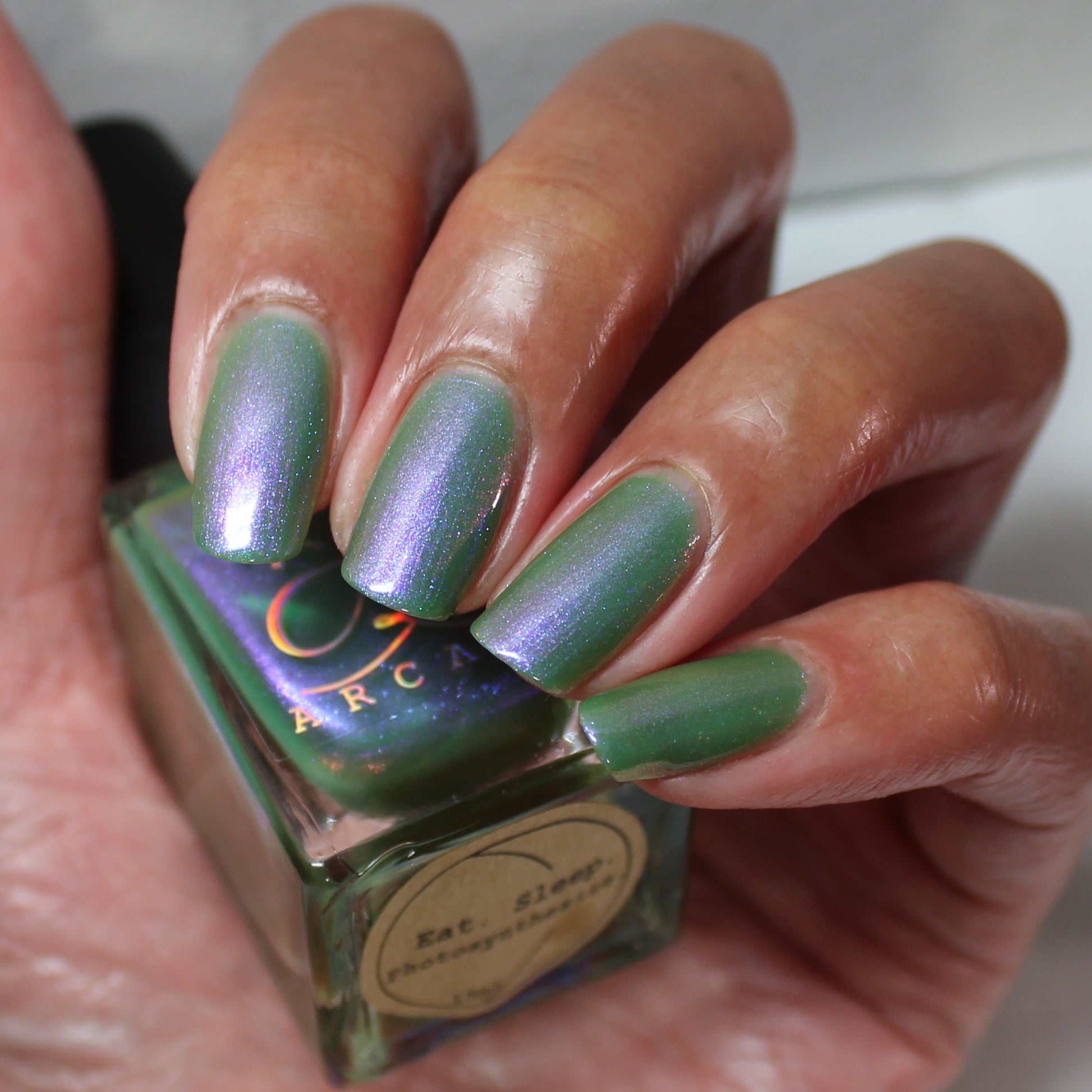 This one is a dusty green polish with a violet to red aurora shimmer!