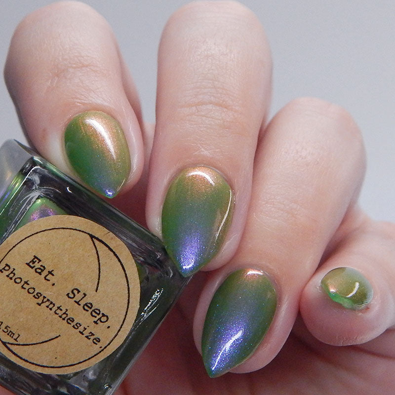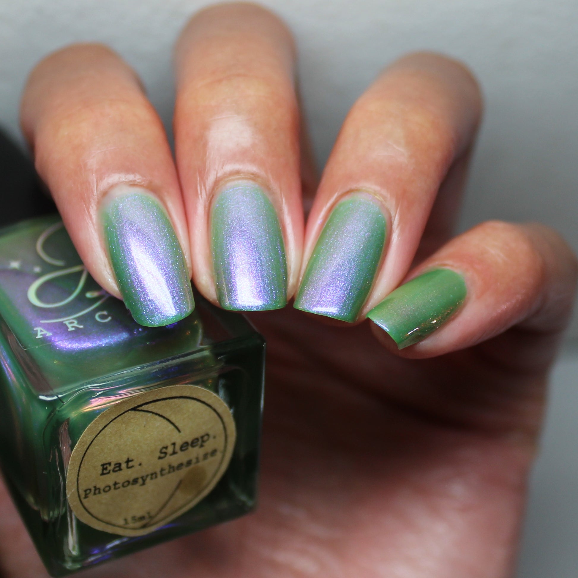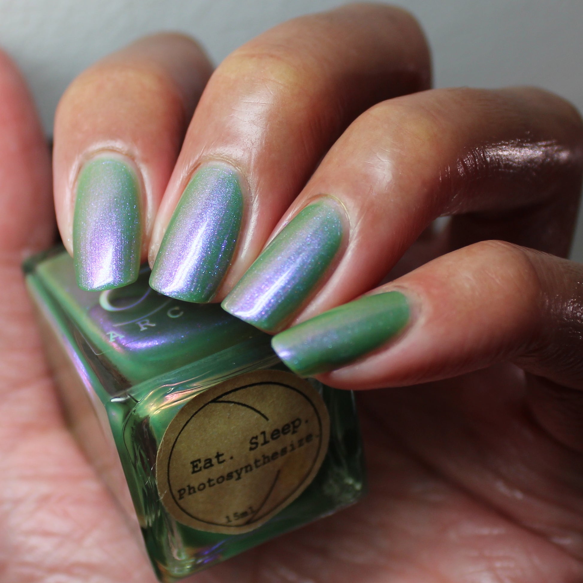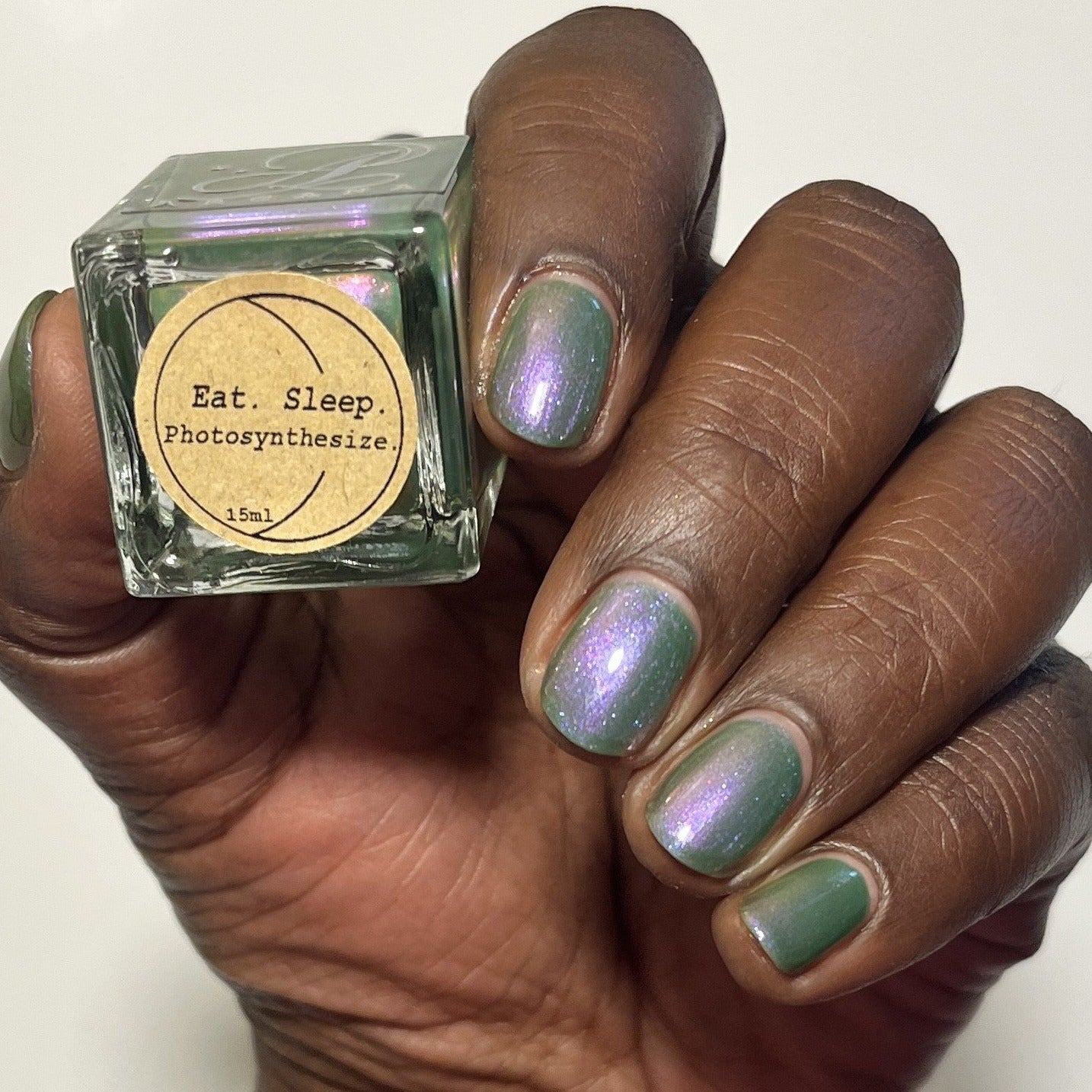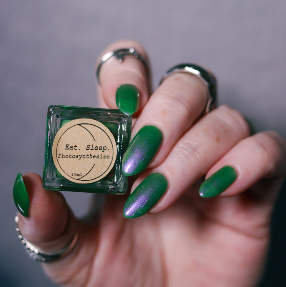 This one is a dusty green polish with a violet to red aurora shimmer!