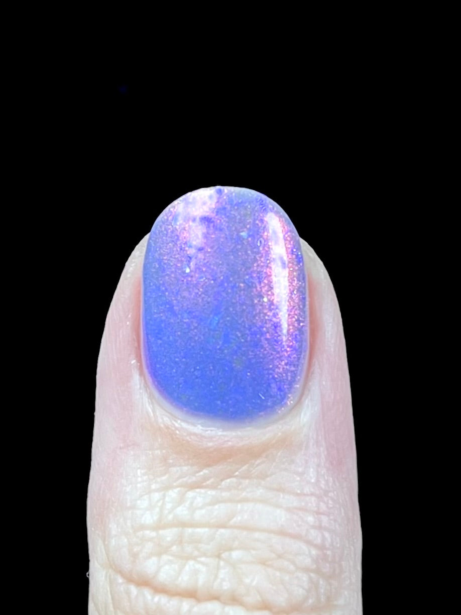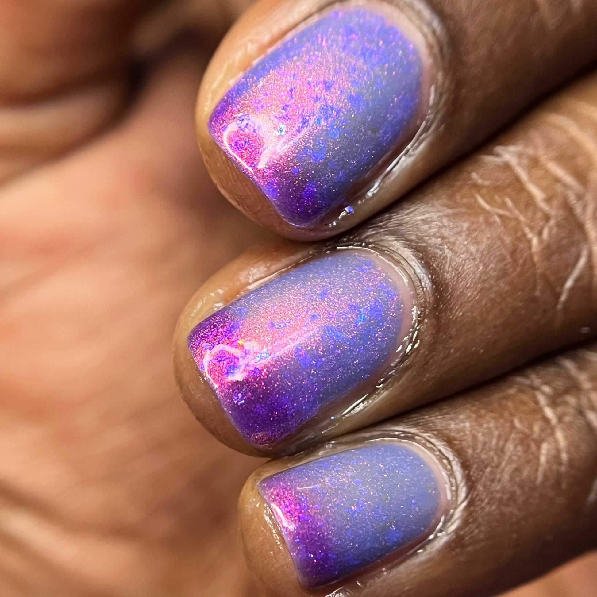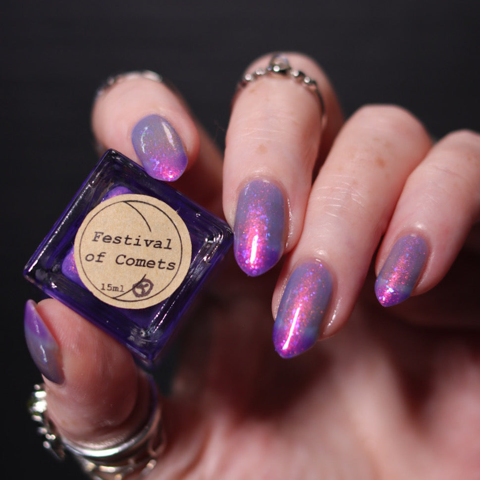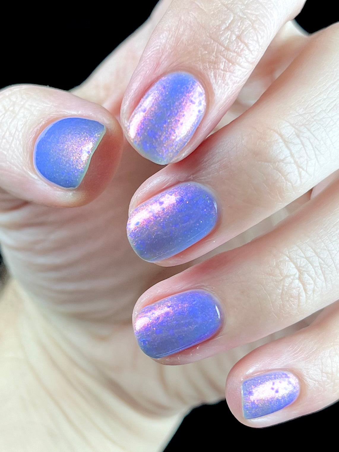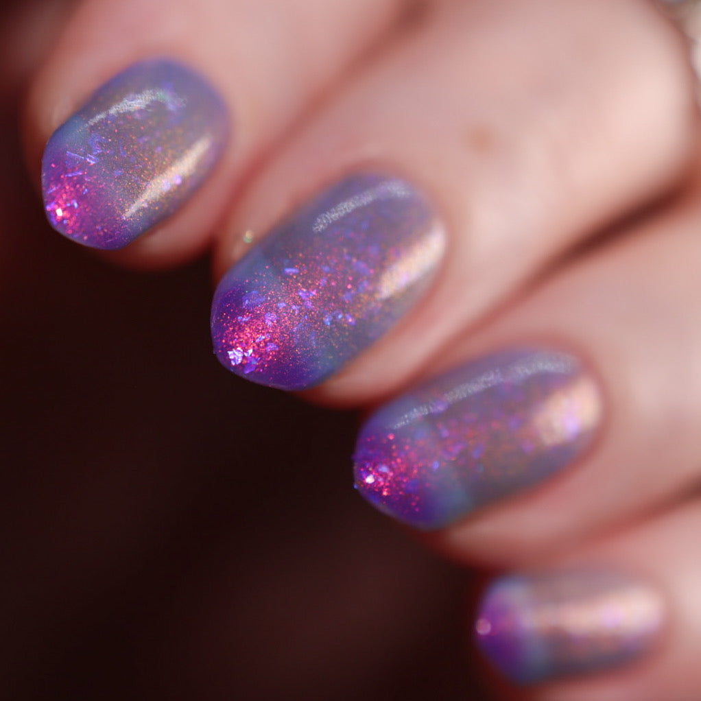 Festival of Comets features a light cornflower blue jelly base with red shimmer and blue-purple flakes. This is a thermal polish that goes from a warm-toned purple (cold state) to a light cornflower blue (warm state).