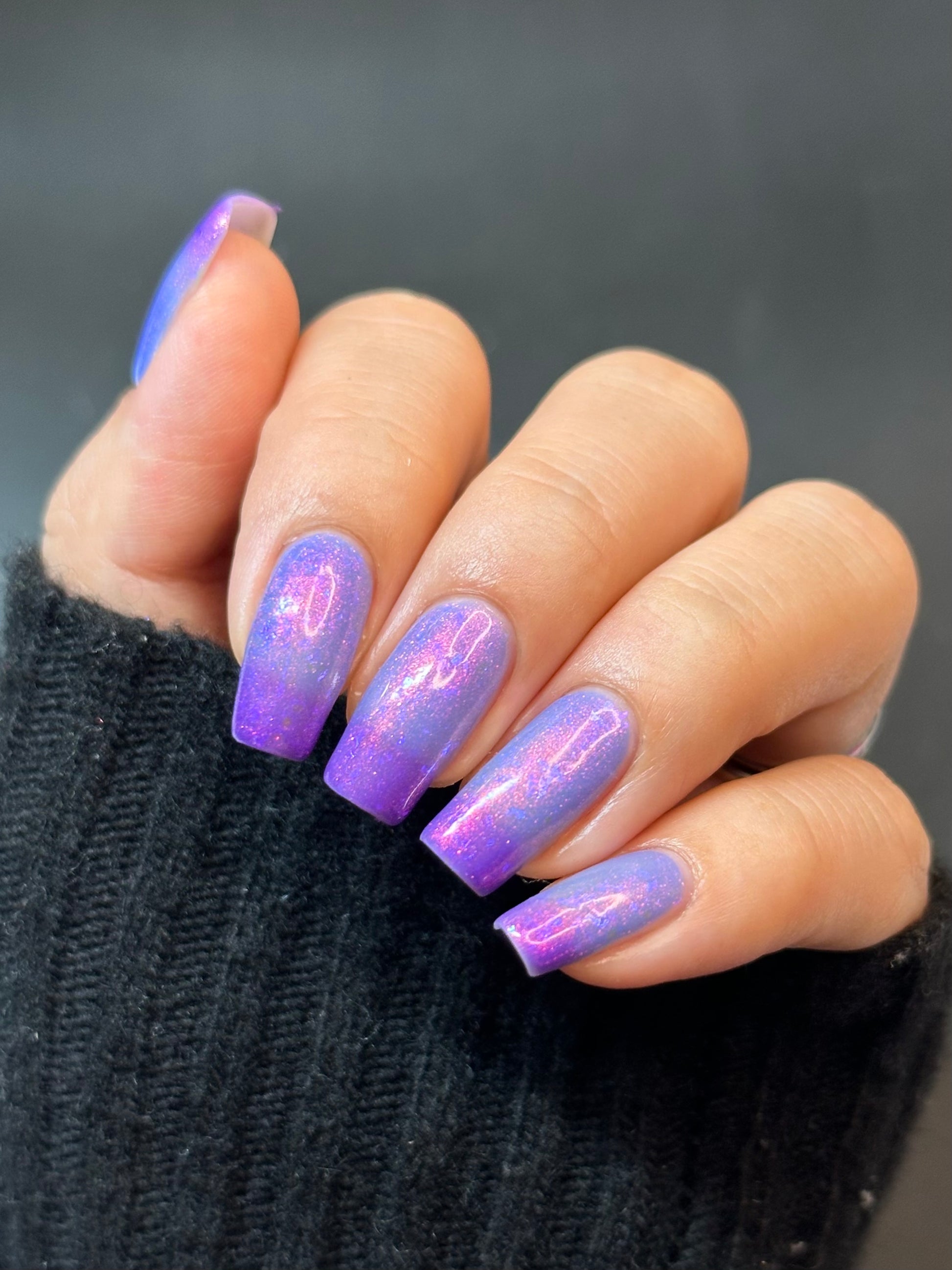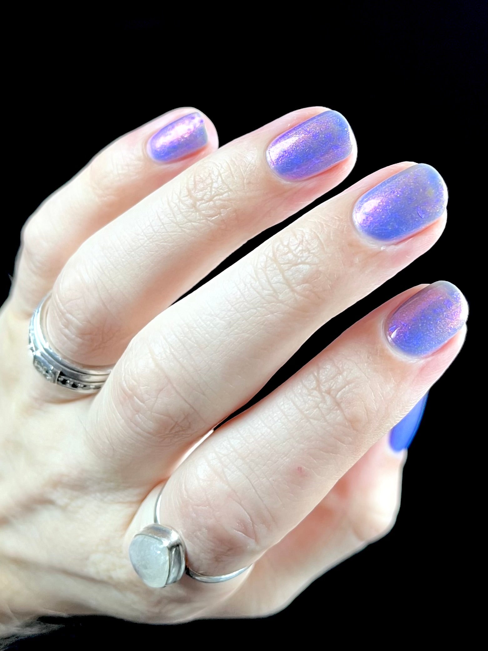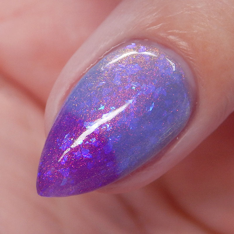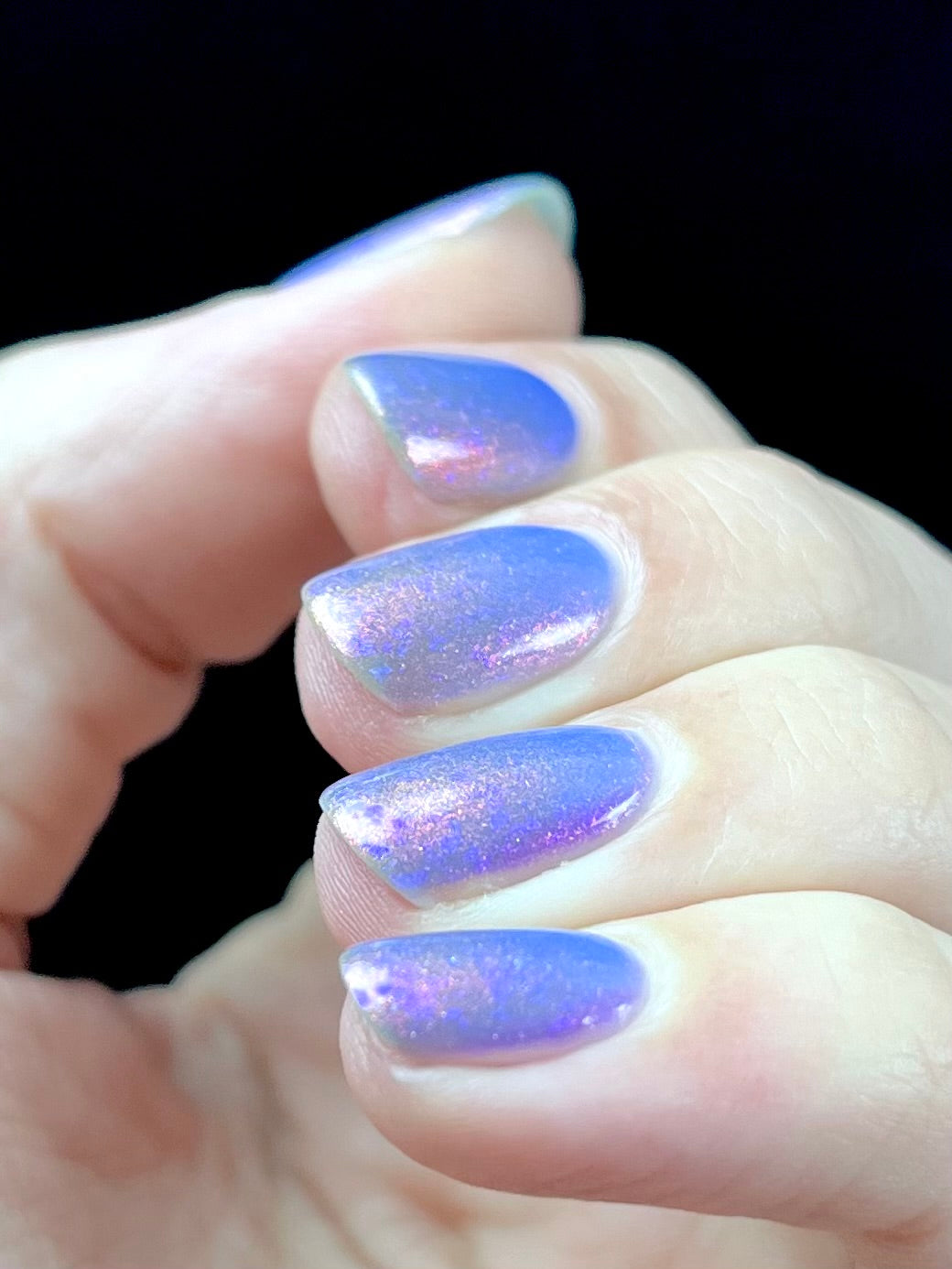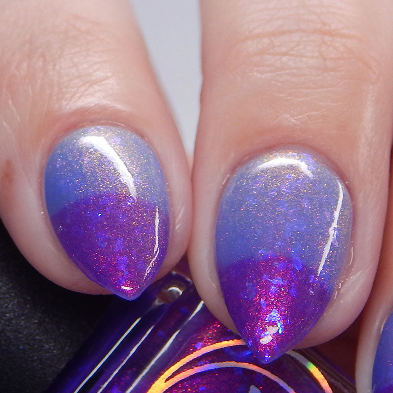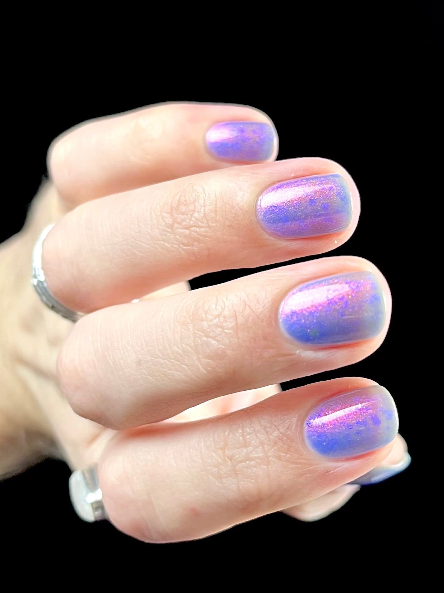 Festival of Comets features a light cornflower blue jelly base with red shimmer and blue-purple flakes. This is a thermal polish that goes from a warm-toned purple (cold state) to a light cornflower blue (warm state).