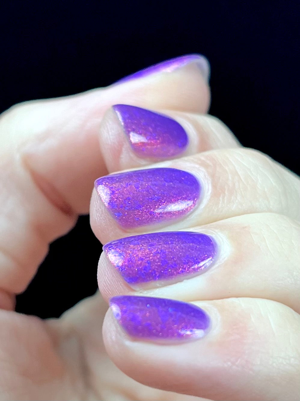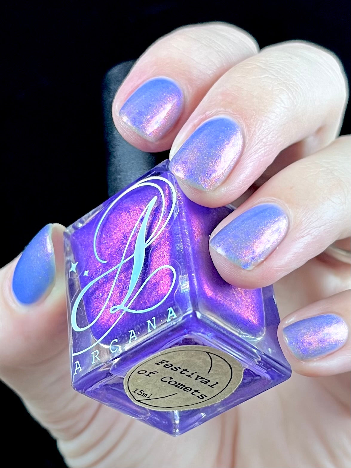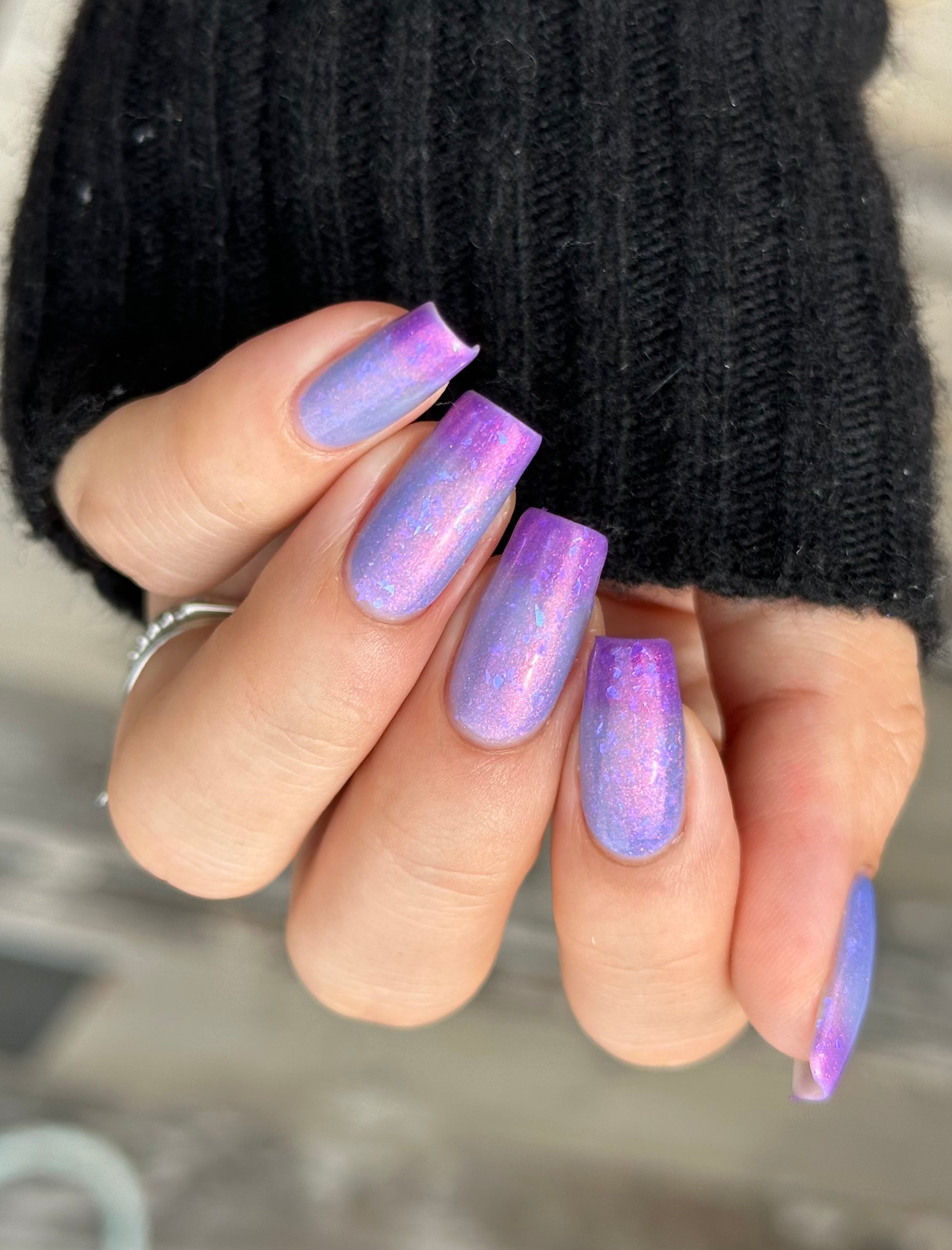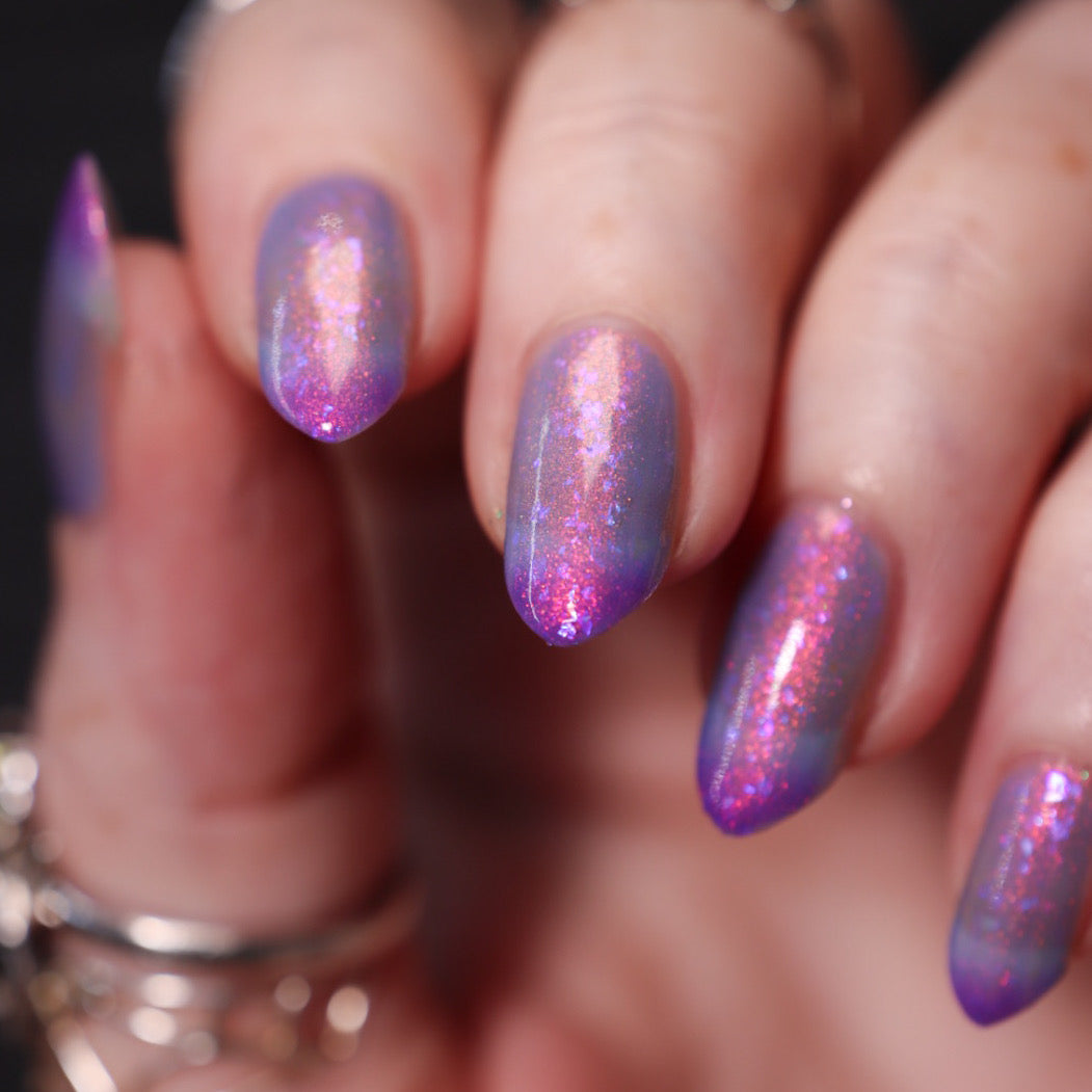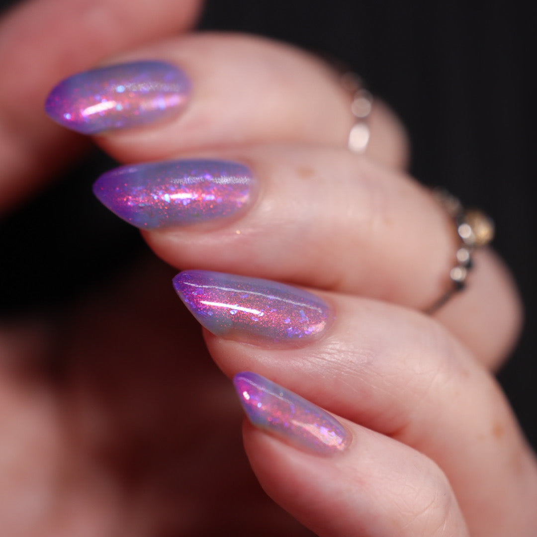Festival of Comets features a light cornflower blue jelly base with red shimmer and blue-purple flakes. This is a thermal polish that goes from a warm-toned purple (cold state) to a light cornflower blue (warm state).