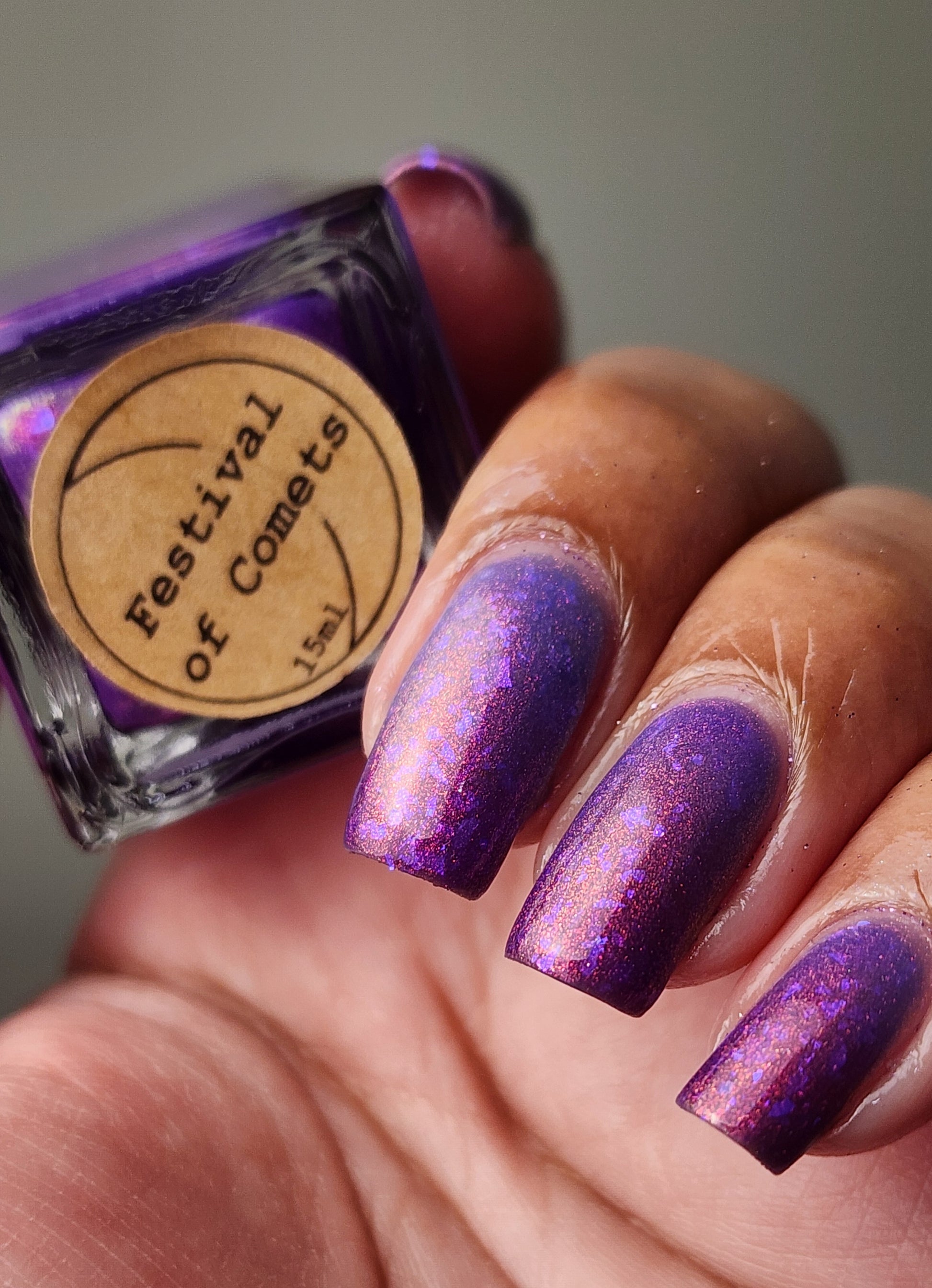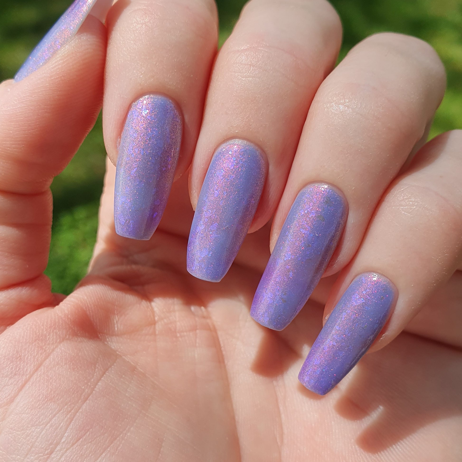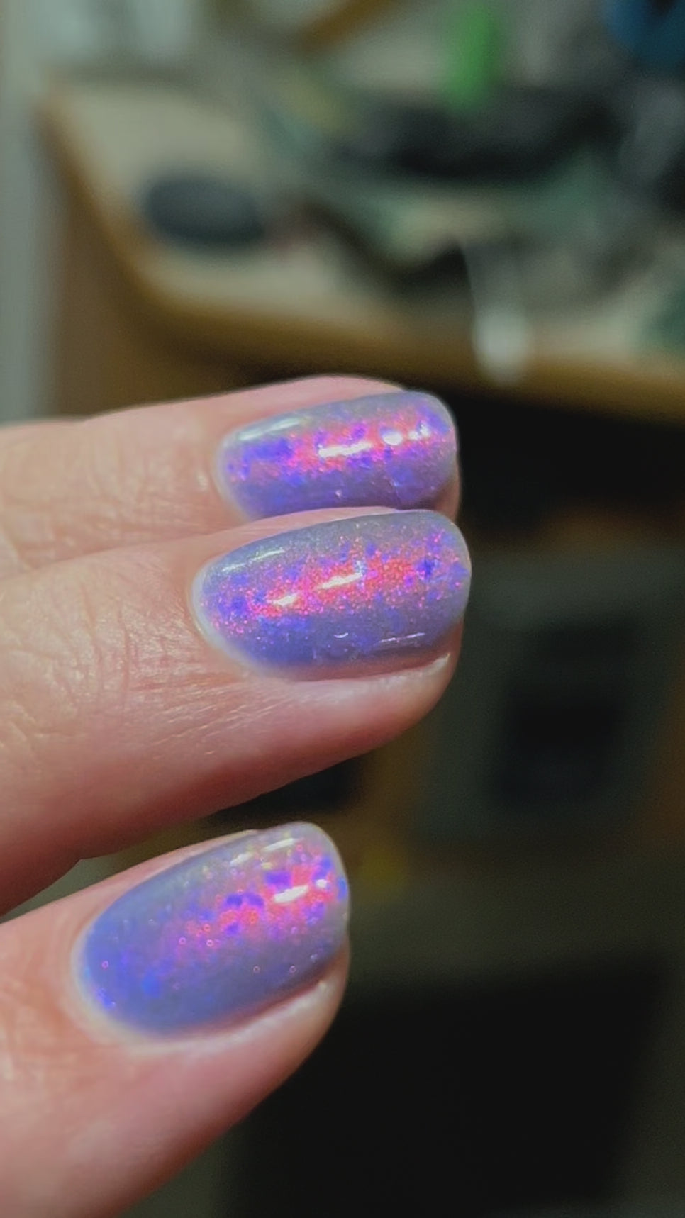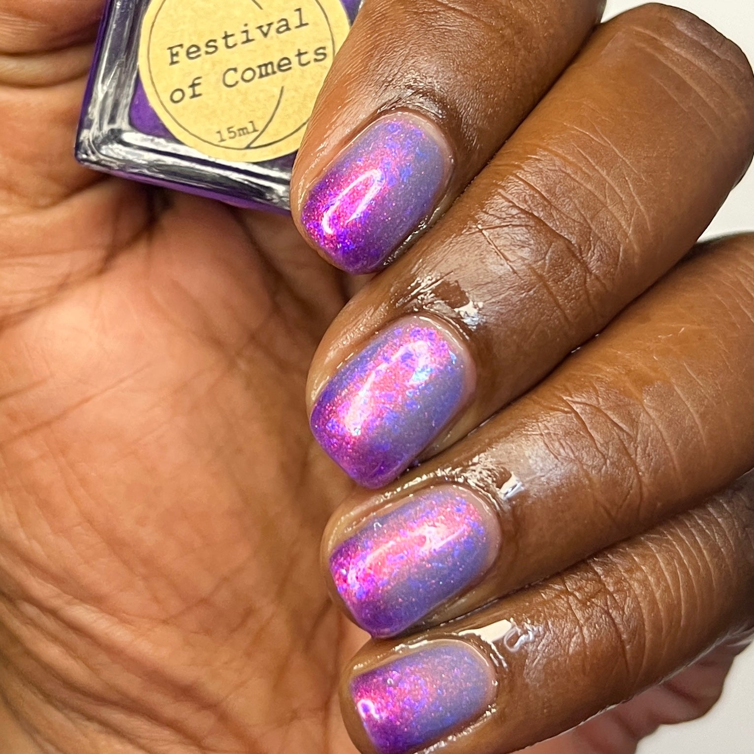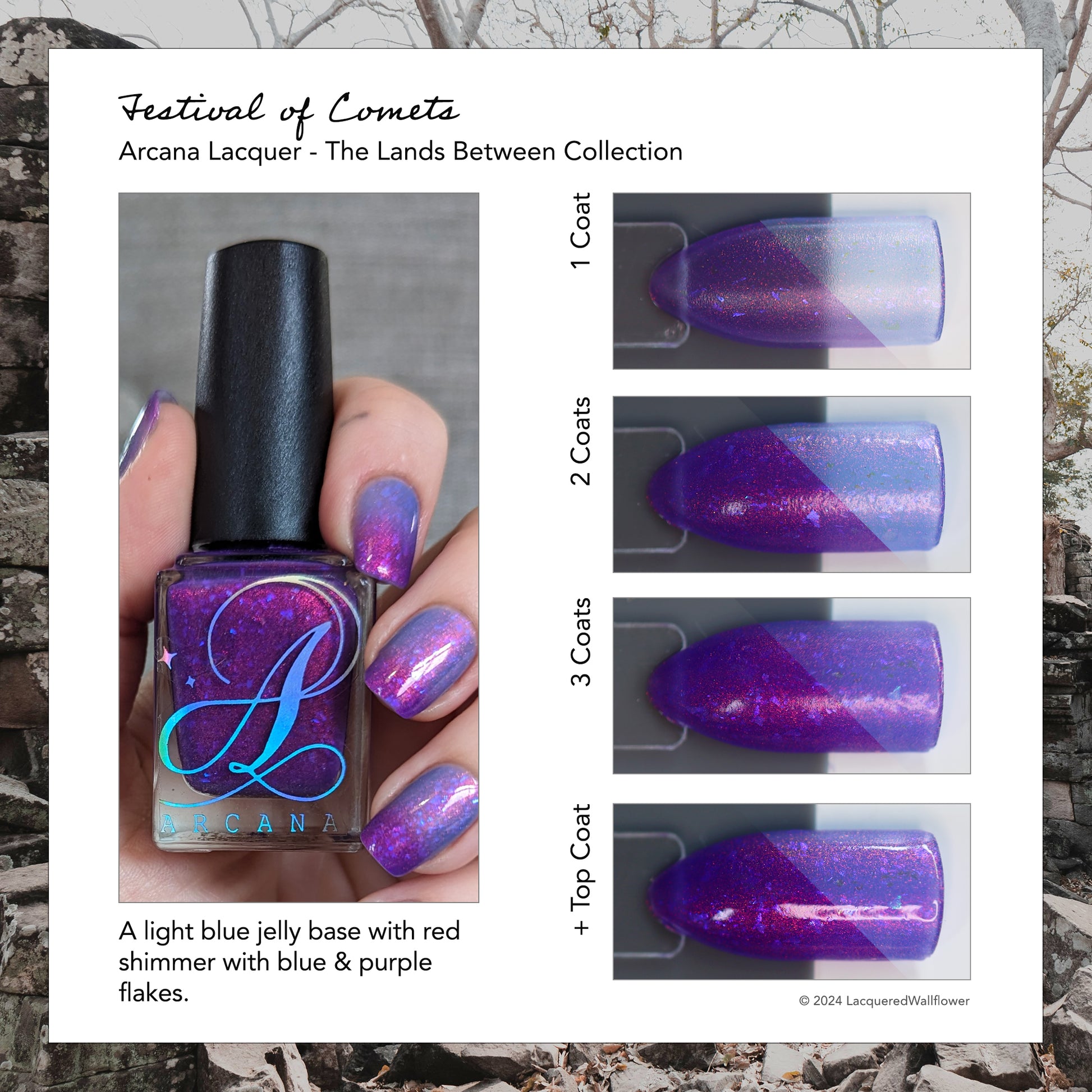 Festival of Comets features a light cornflower blue jelly base with red shimmer and blue-purple flakes. This is a thermal polish that goes from a warm-toned purple (cold state) to a light cornflower blue (warm state).