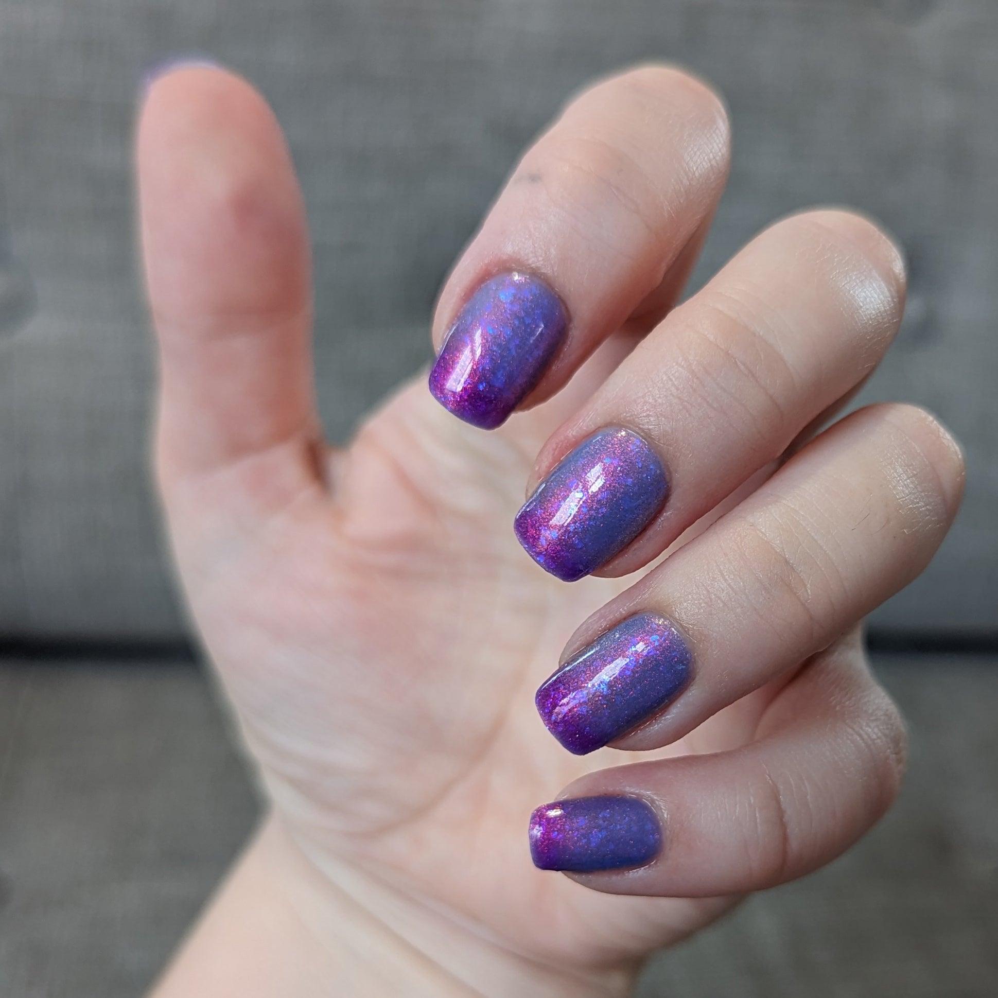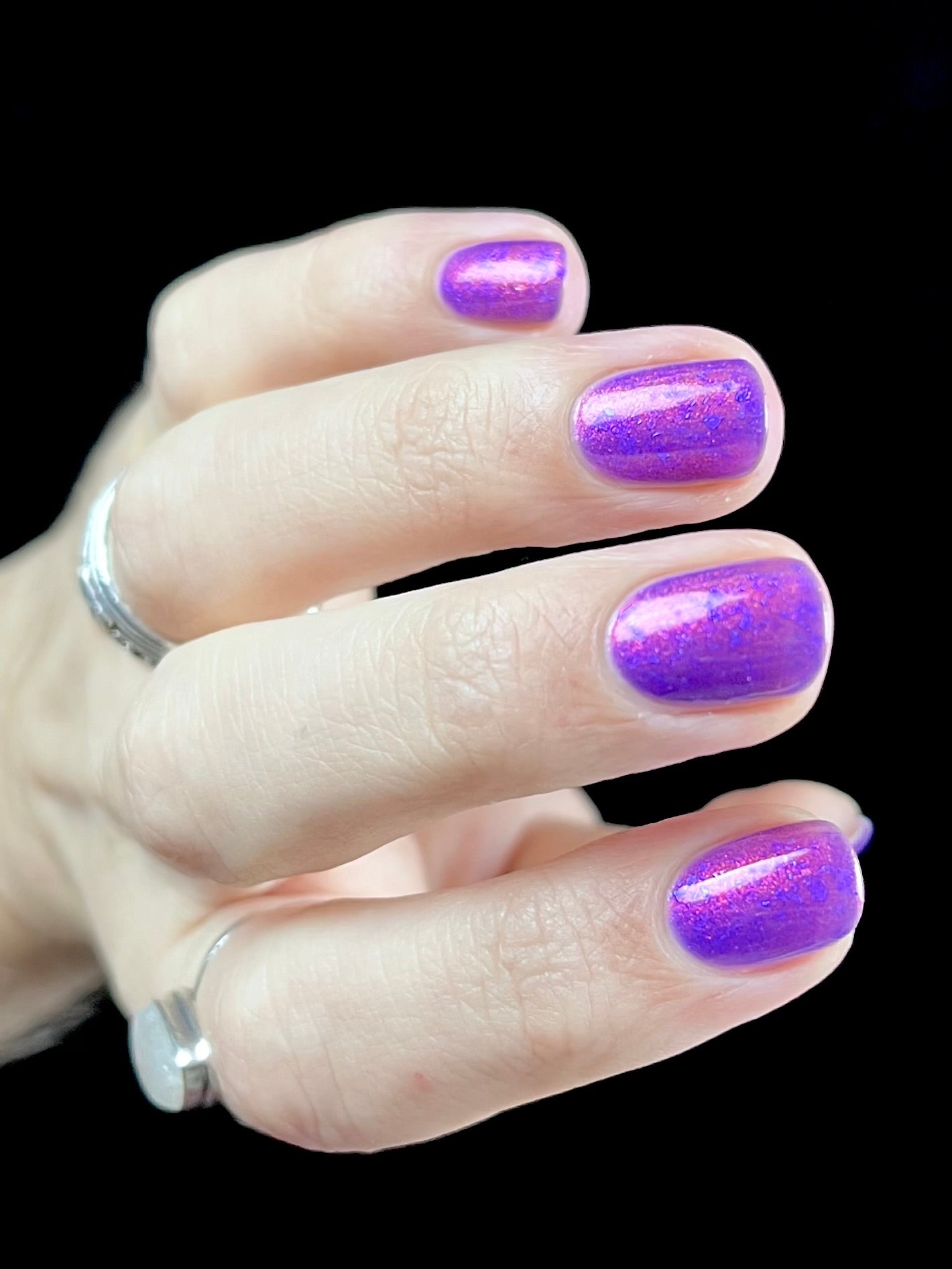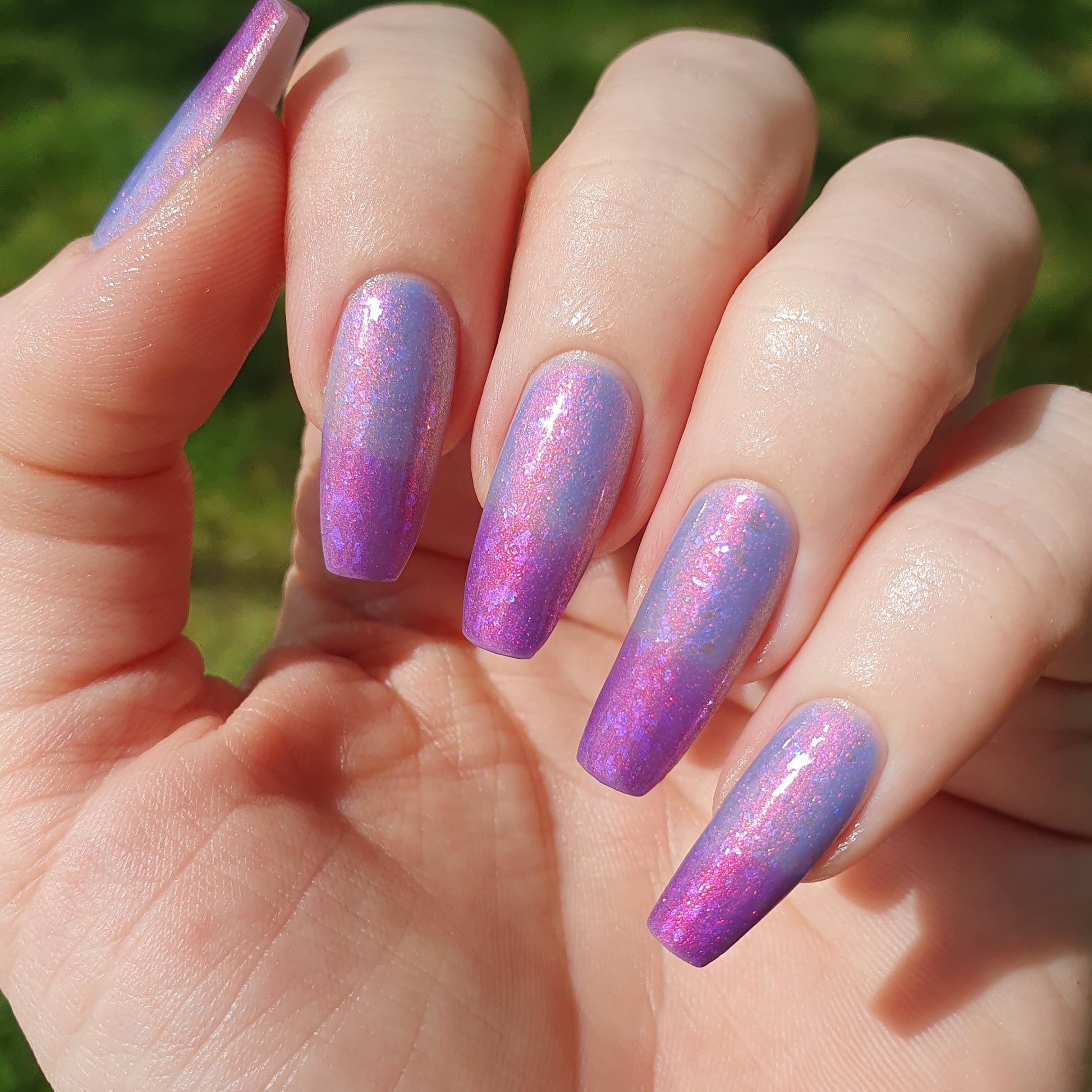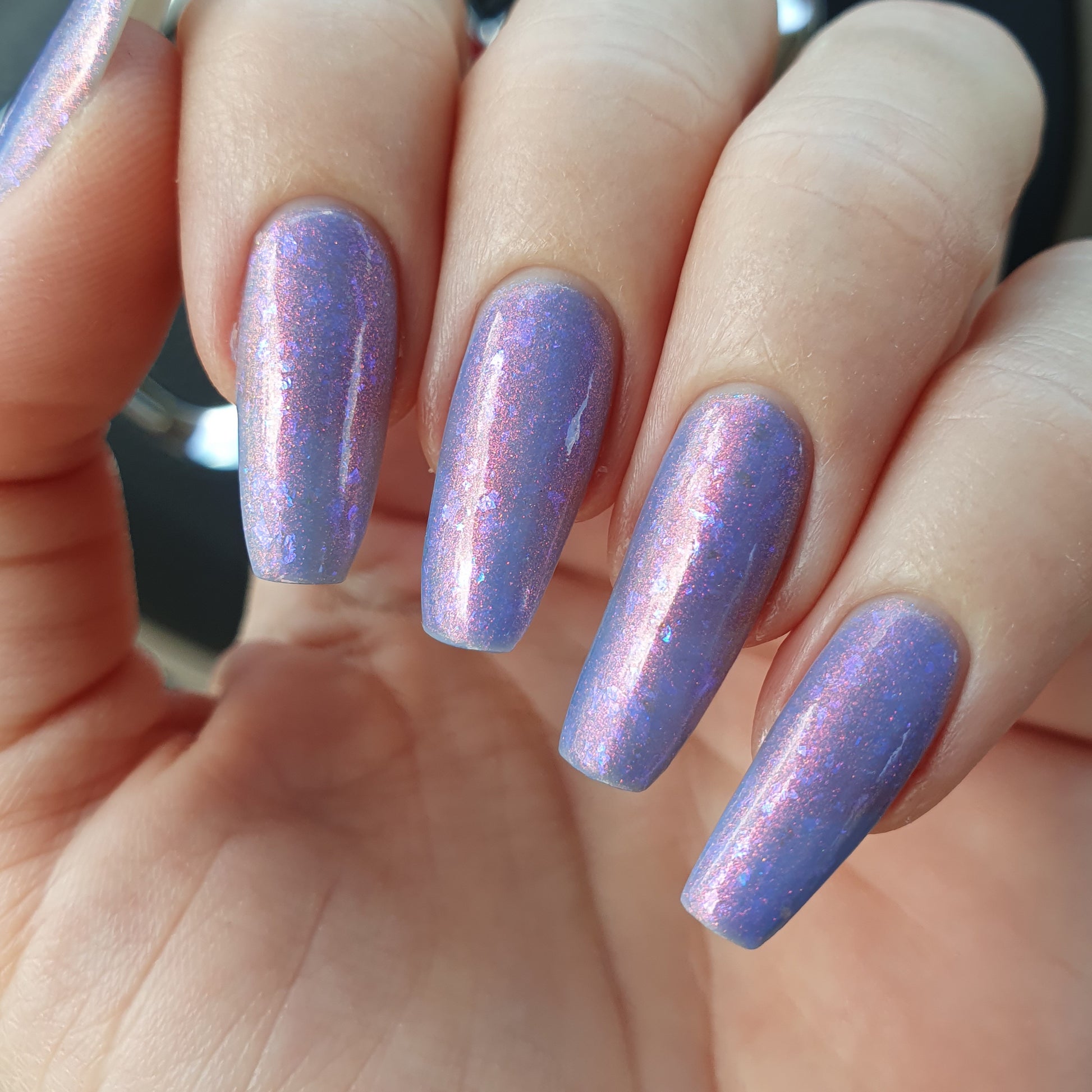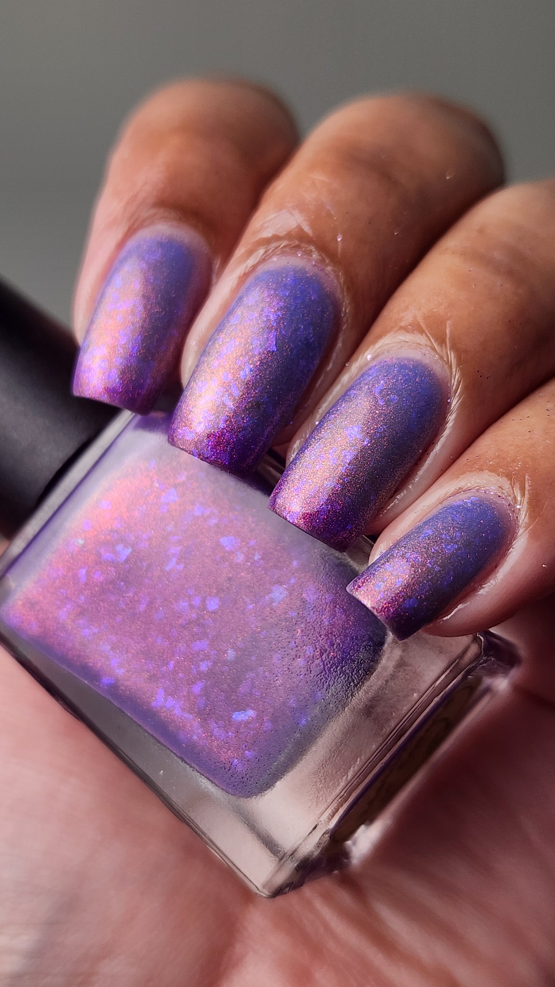 Festival of Comets features a light cornflower blue jelly base with red shimmer and blue-purple flakes. This is a thermal polish that goes from a warm-toned purple (cold state) to a light cornflower blue (warm state).