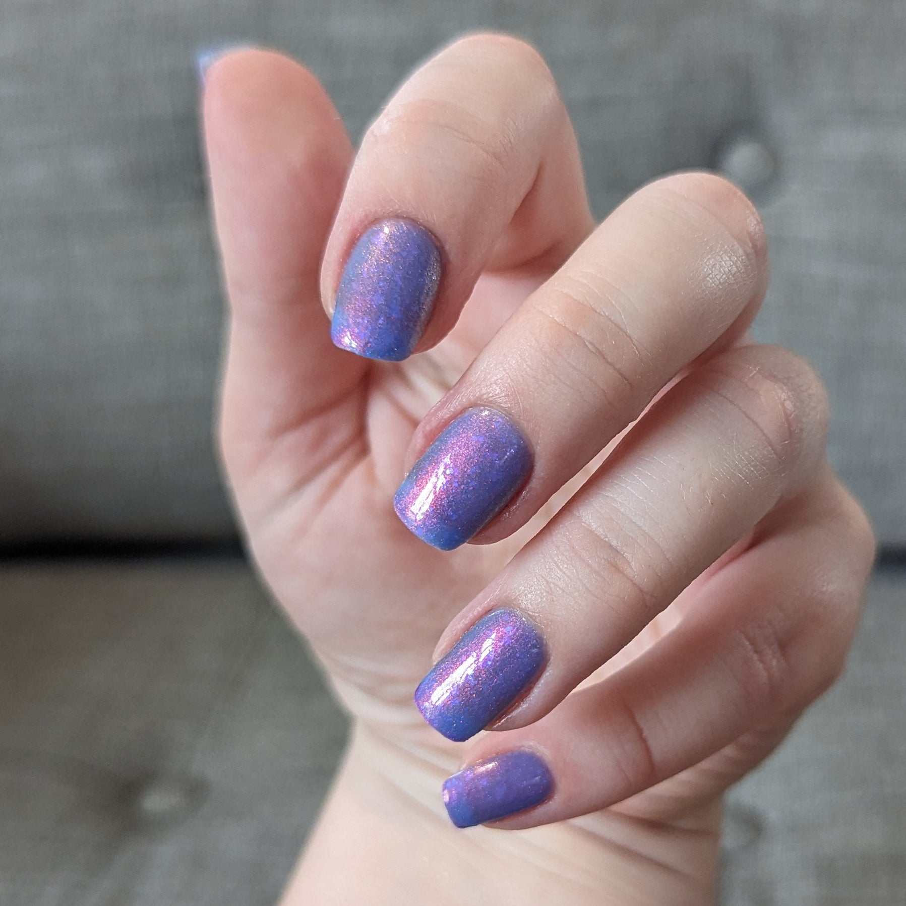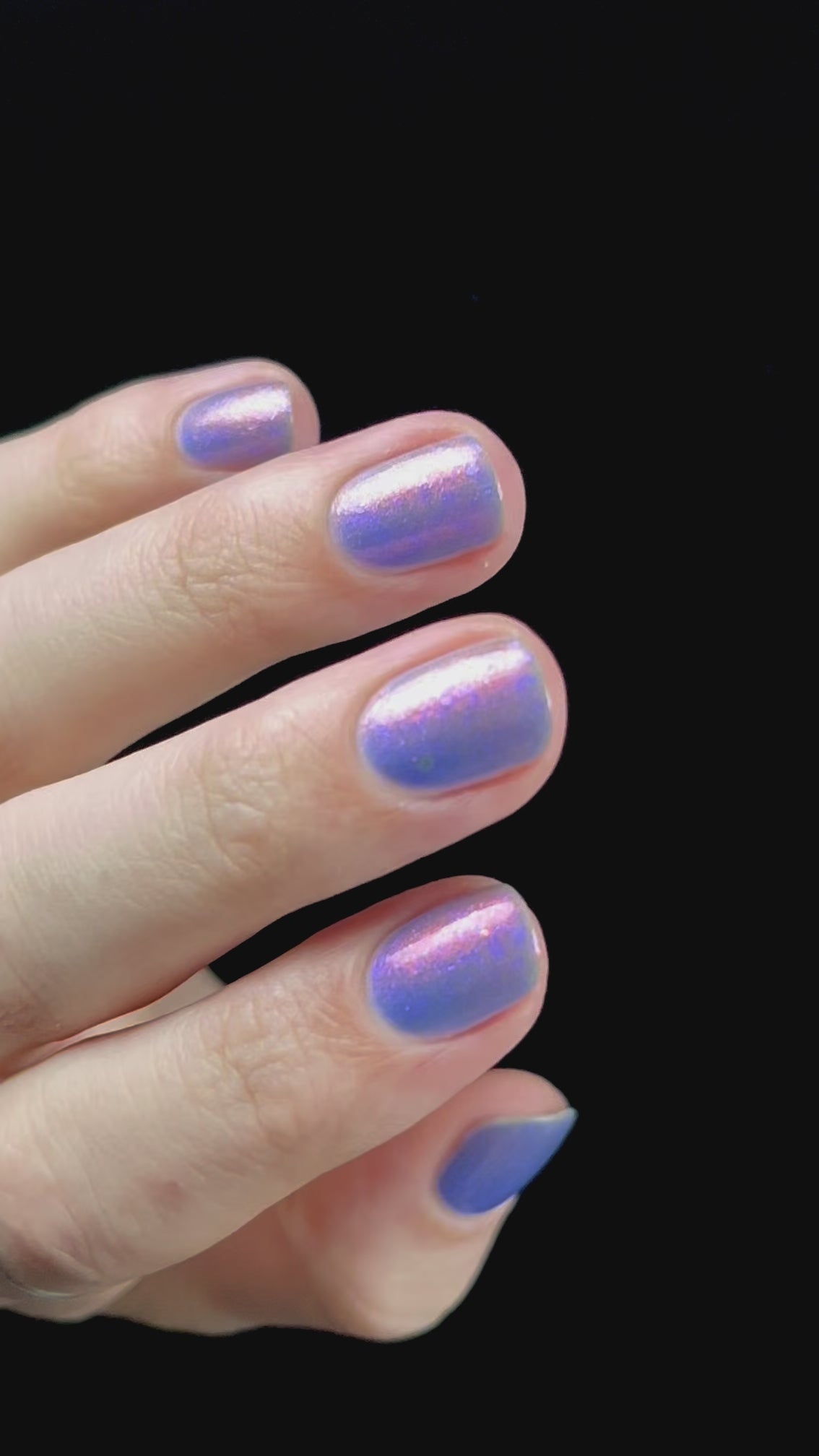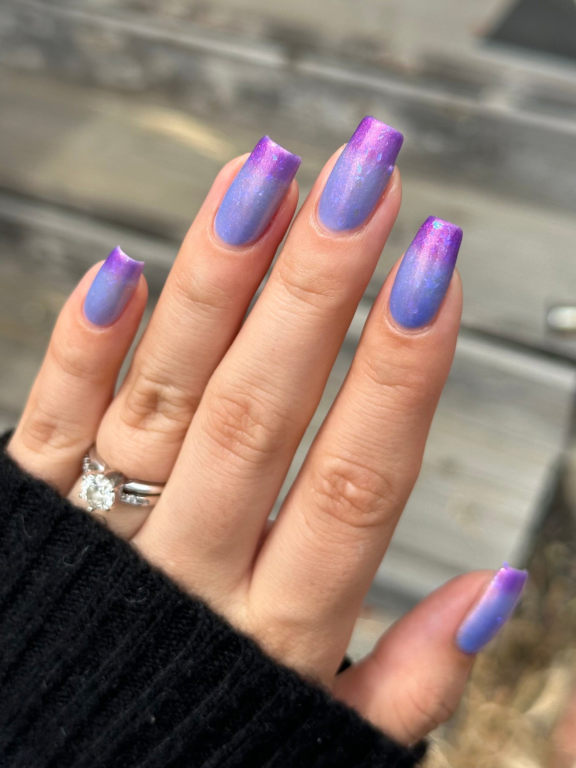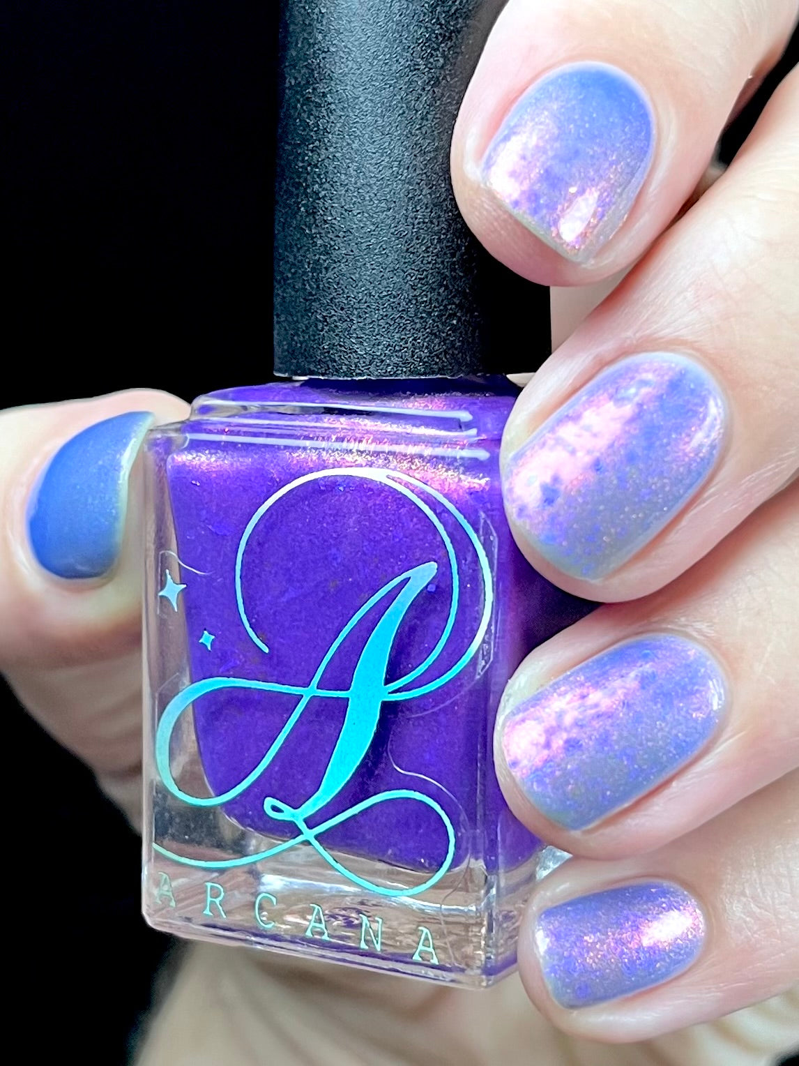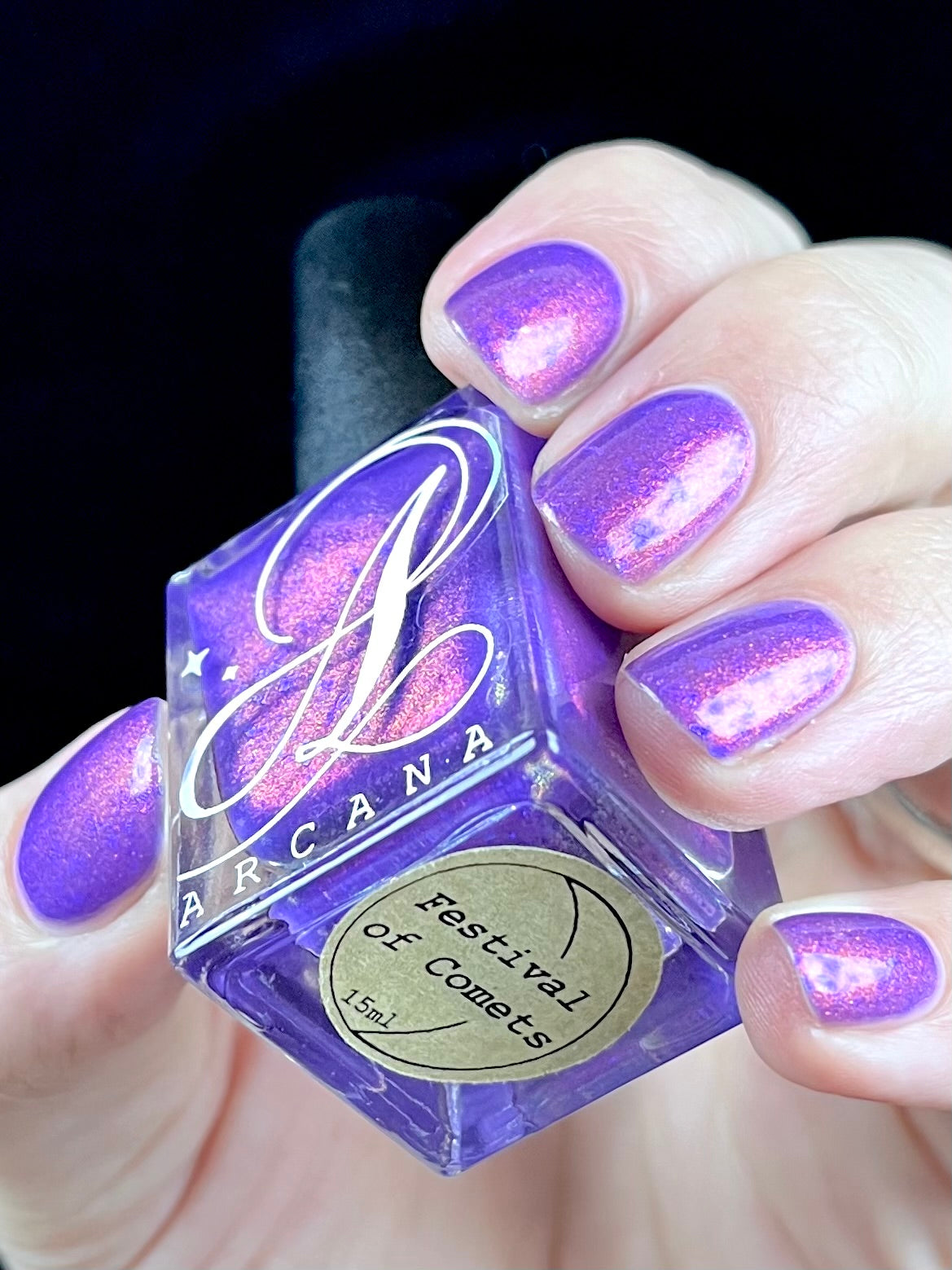 Festival of Comets features a light cornflower blue jelly base with red shimmer and blue-purple flakes. This is a thermal polish that goes from a warm-toned purple (cold state) to a light cornflower blue (warm state).