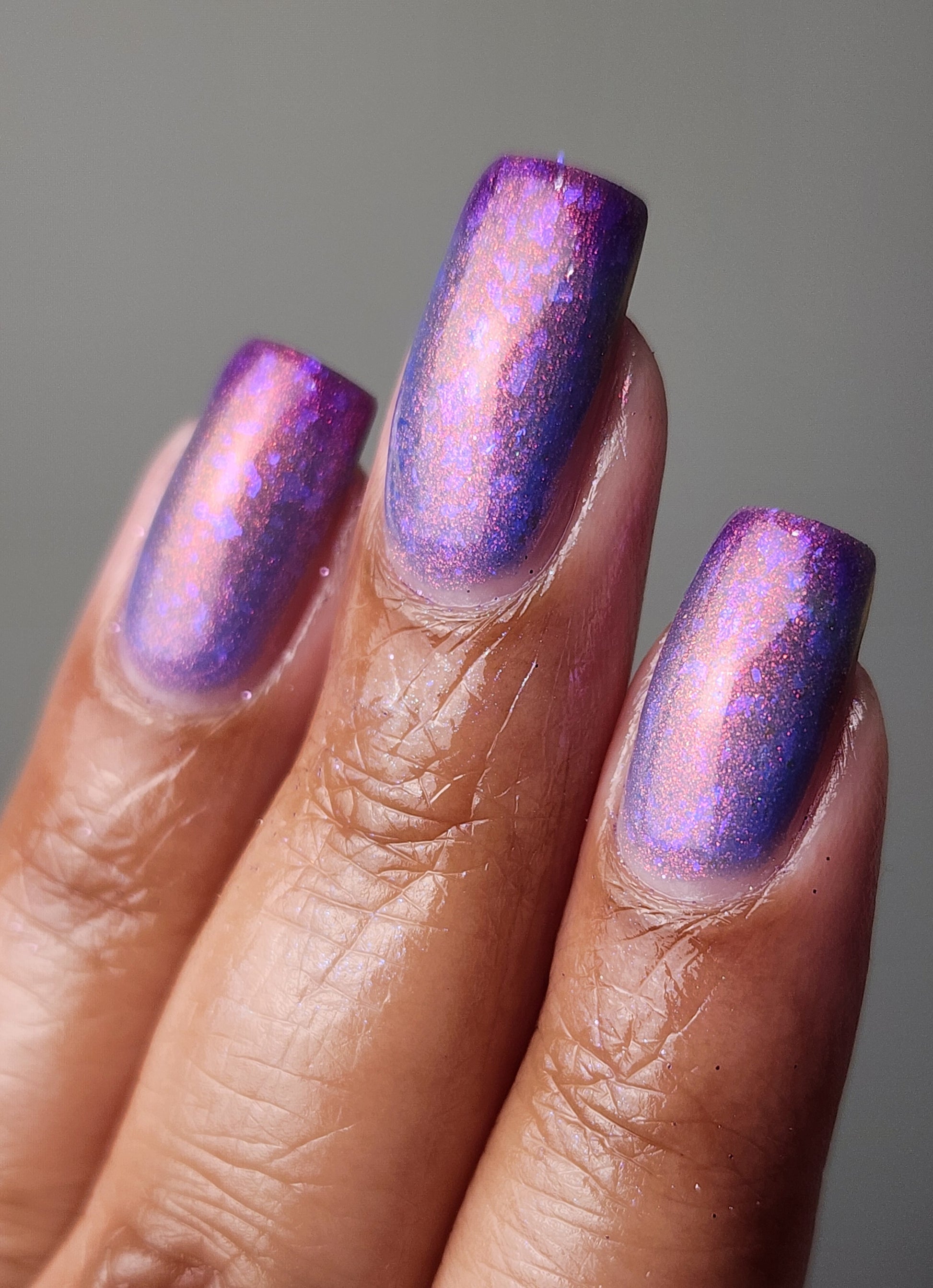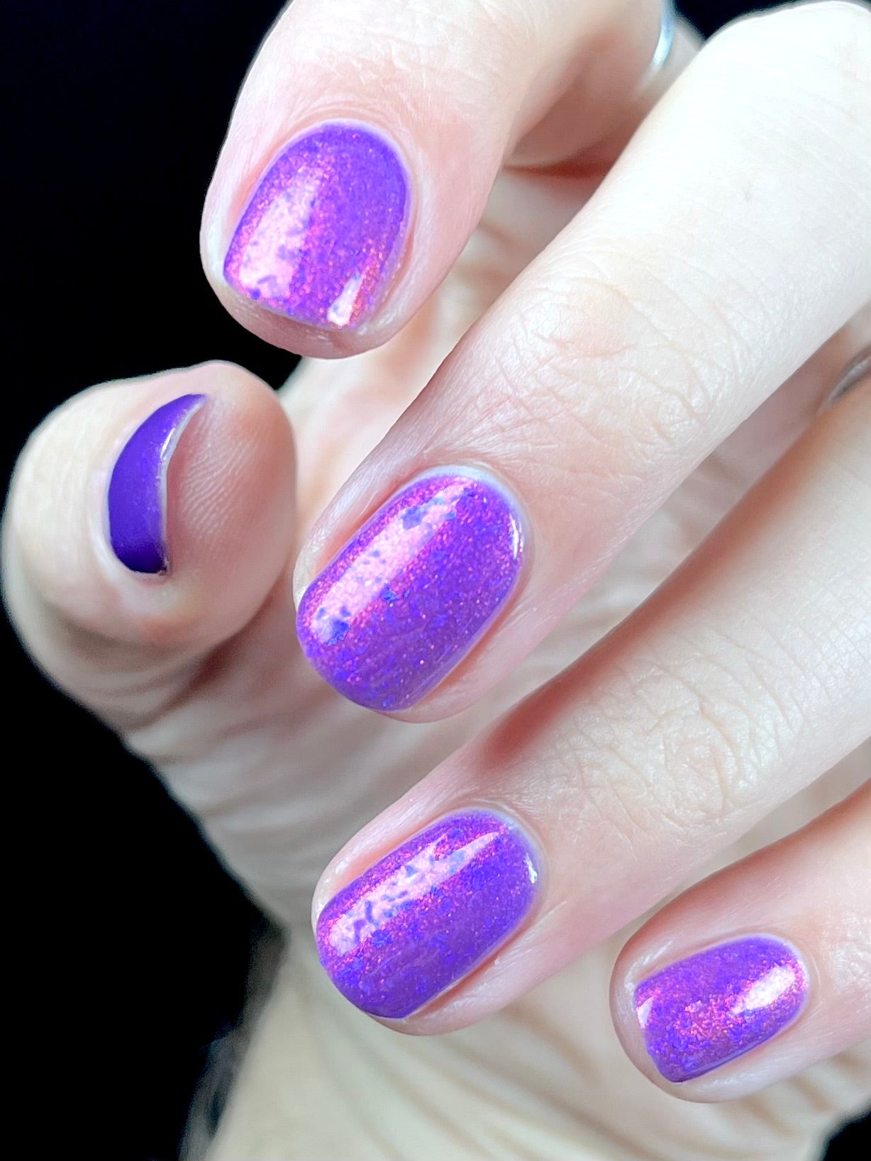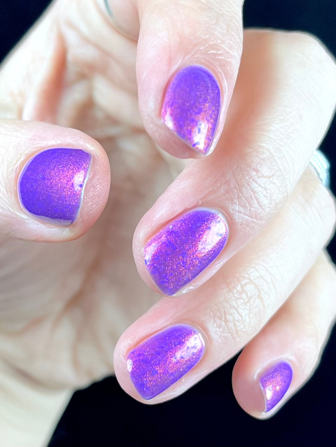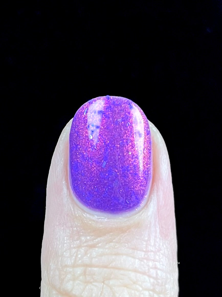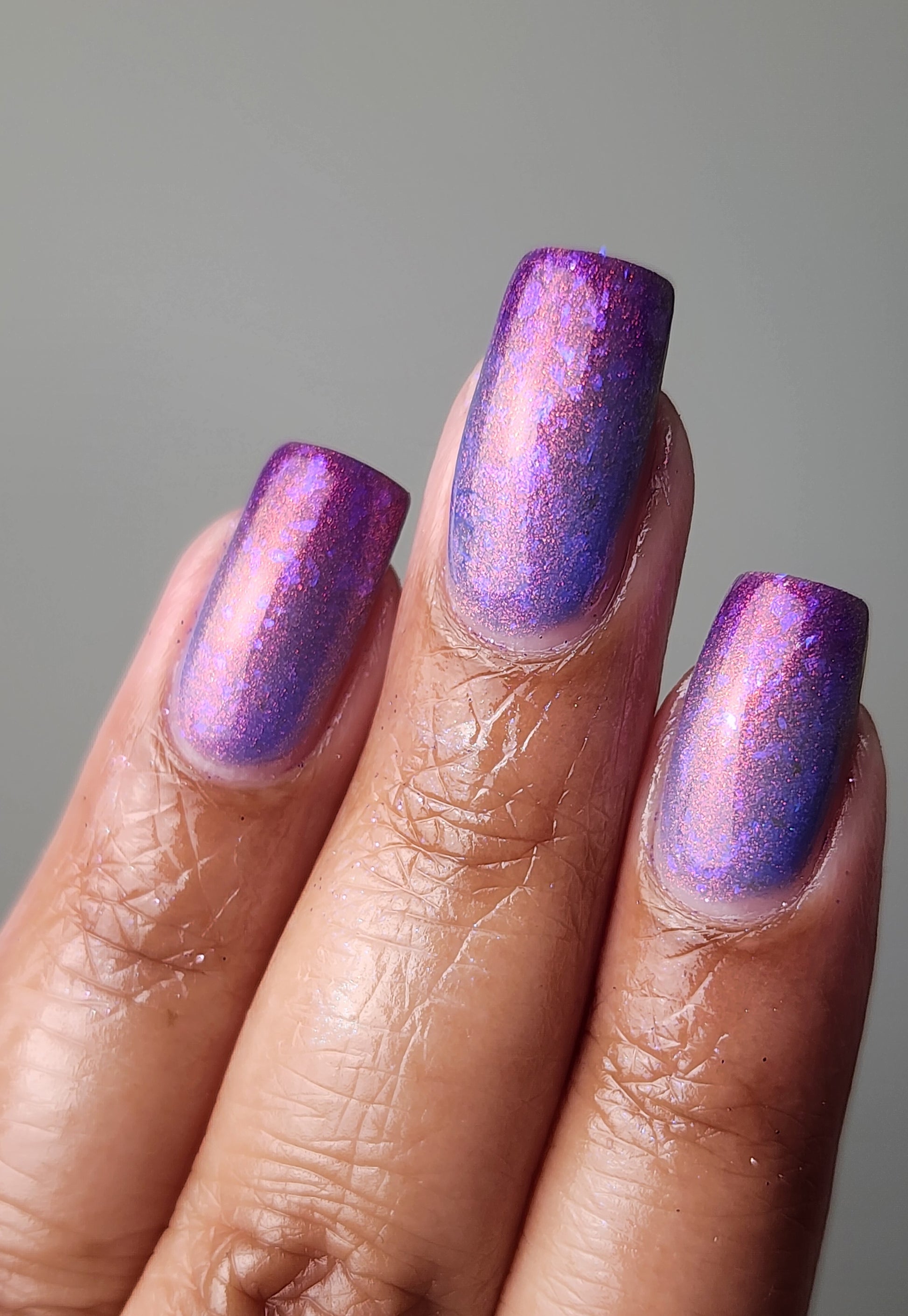 Festival of Comets features a light cornflower blue jelly base with red shimmer and blue-purple flakes. This is a thermal polish that goes from a warm-toned purple (cold state) to a light cornflower blue (warm state).