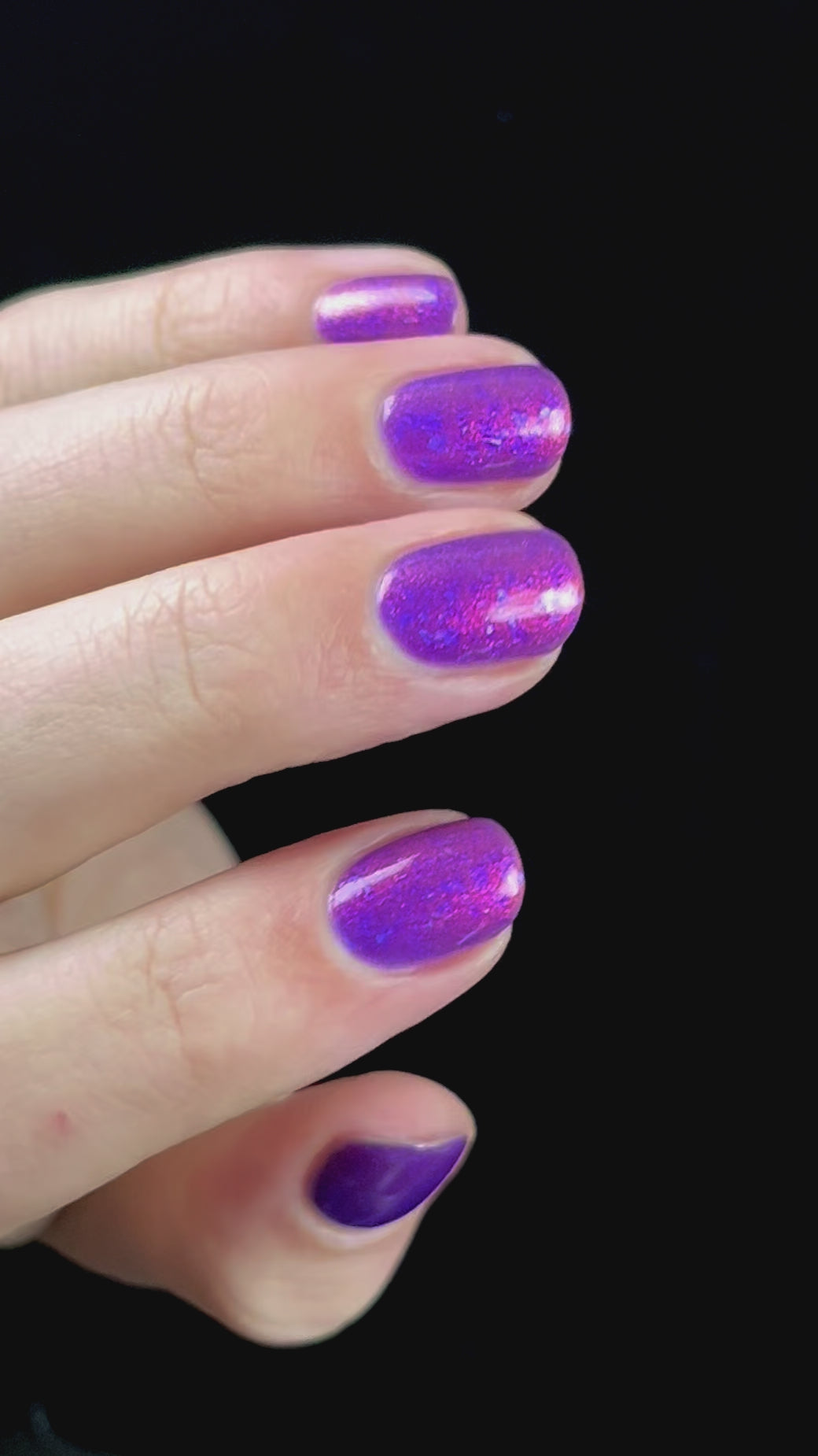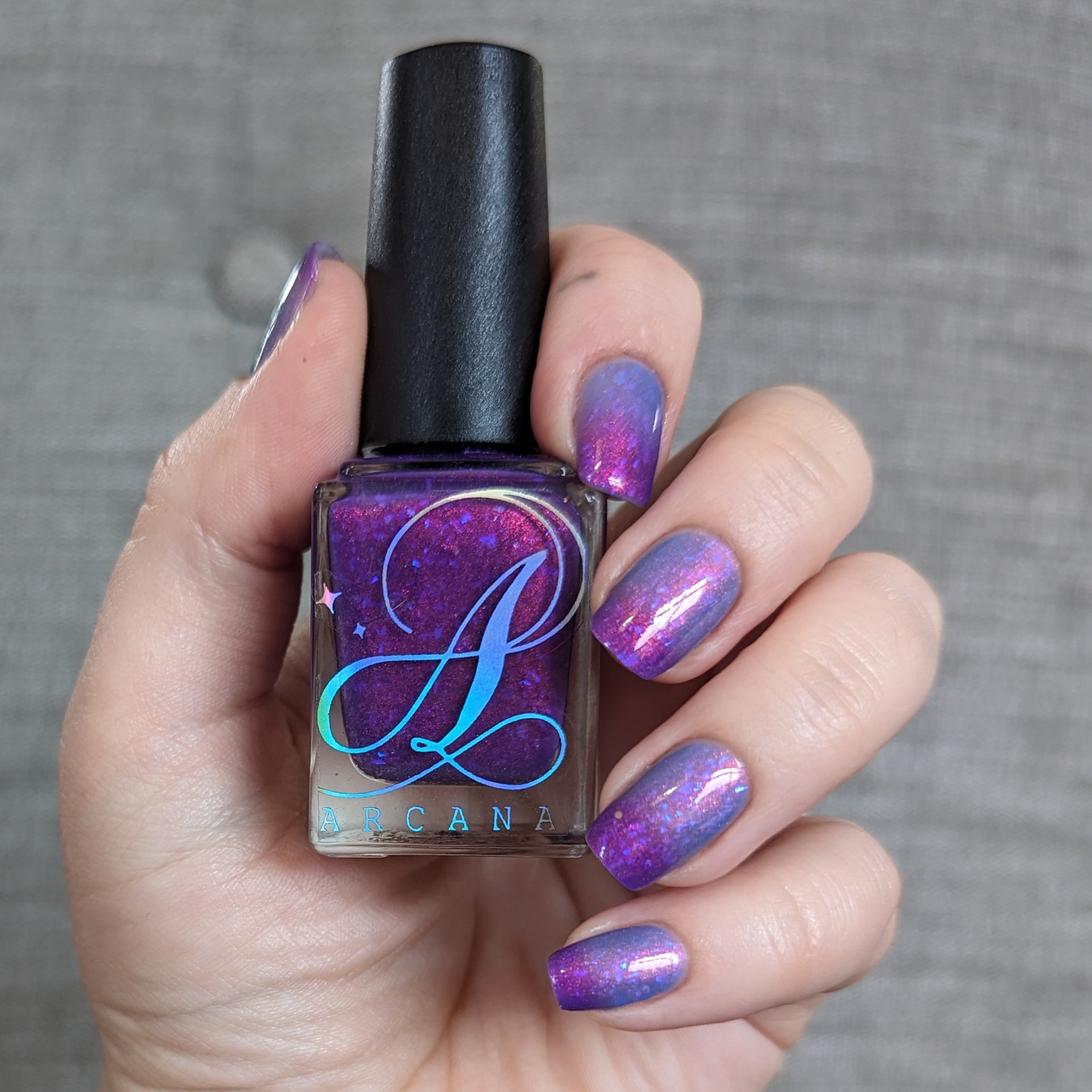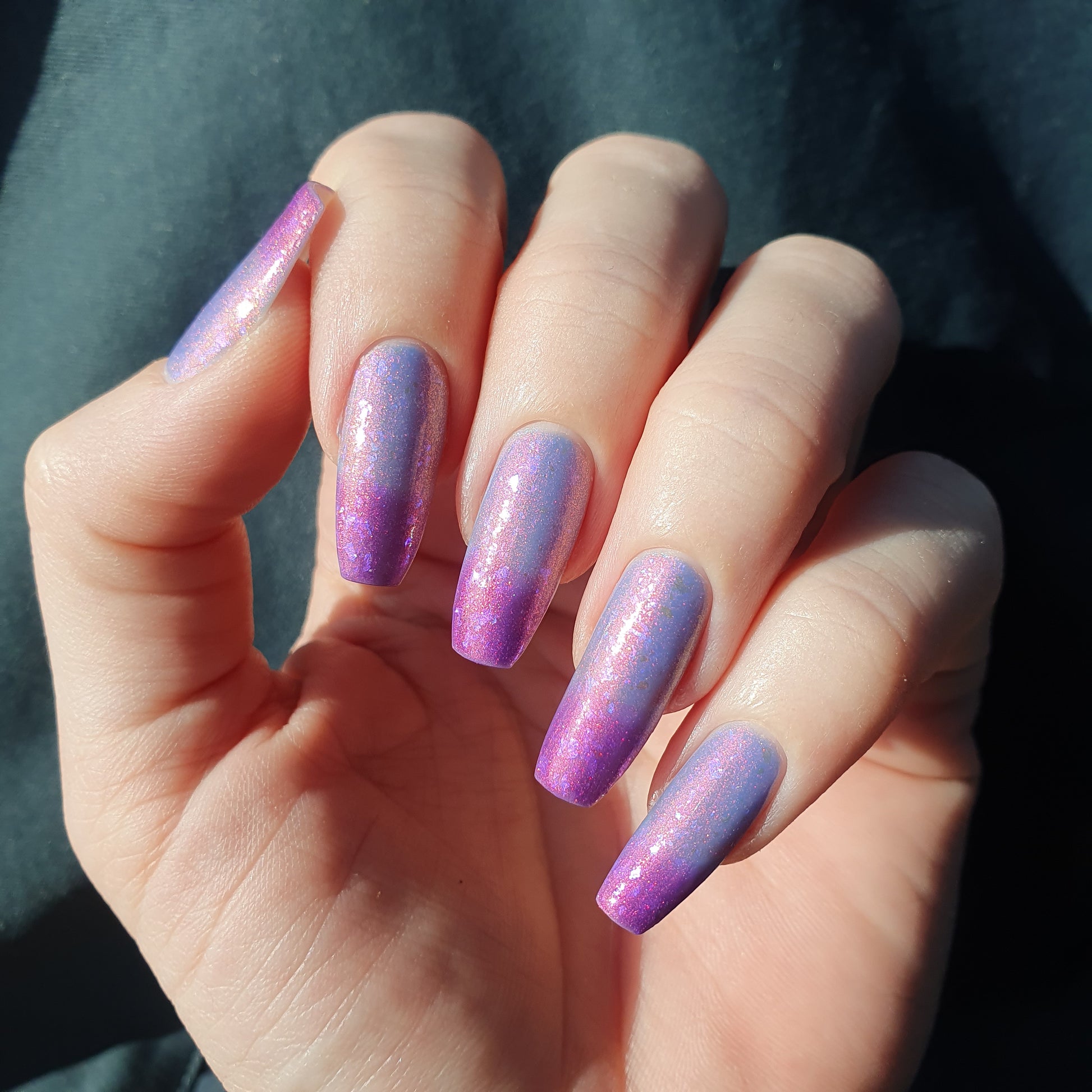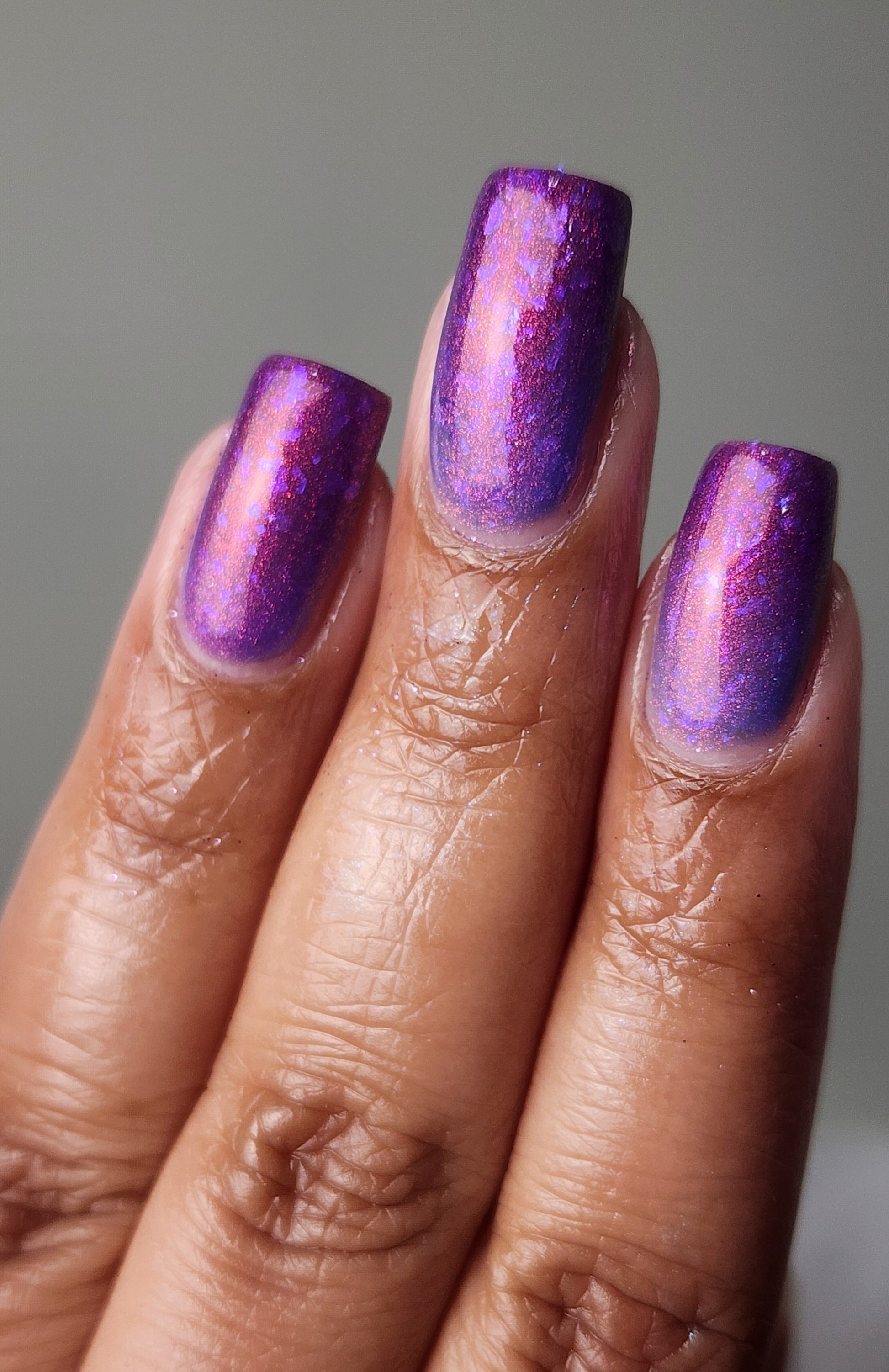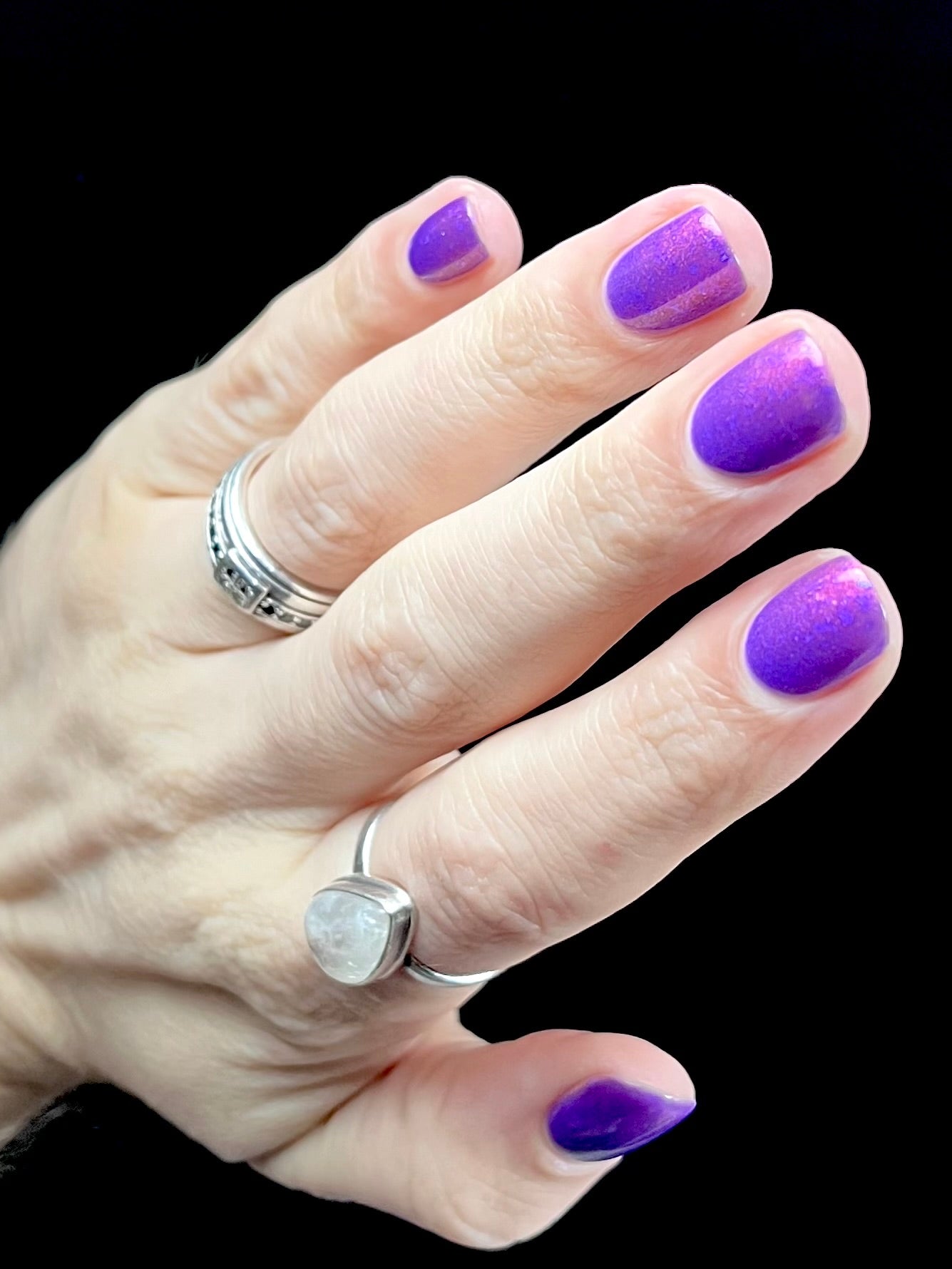 Festival of Comets features a light cornflower blue jelly base with red shimmer and blue-purple flakes. This is a thermal polish that goes from a warm-toned purple (cold state) to a light cornflower blue (warm state).