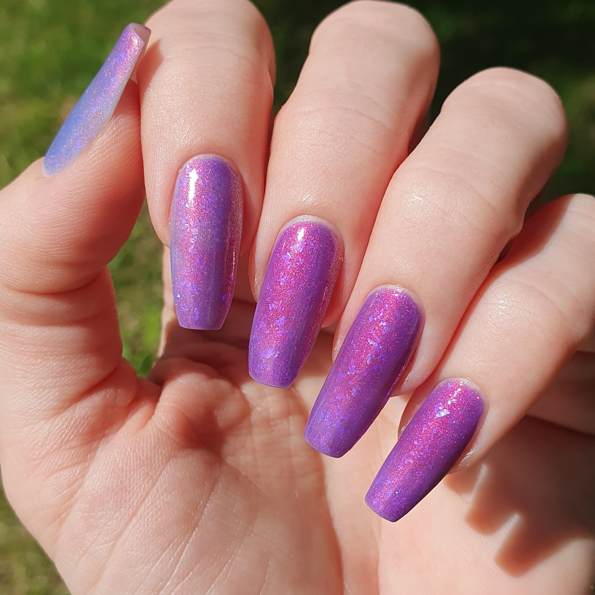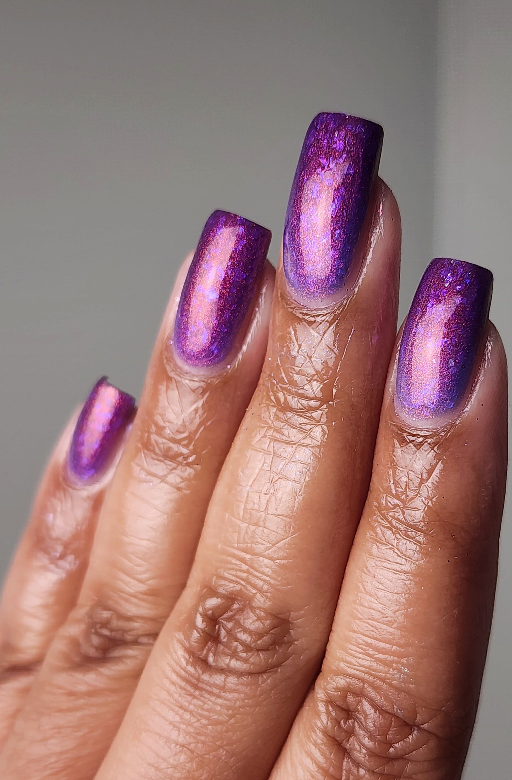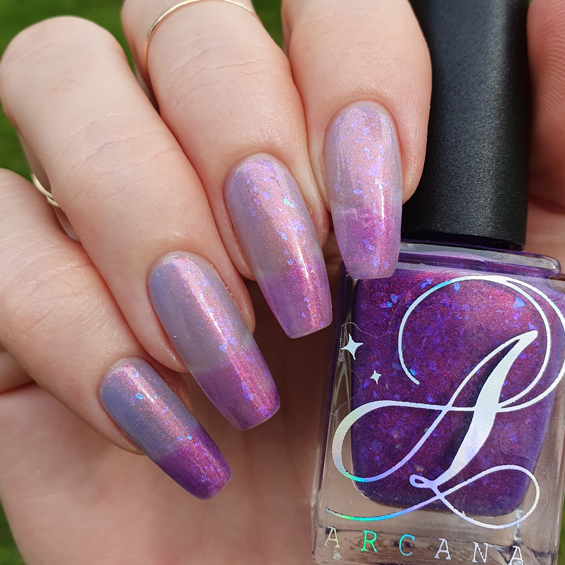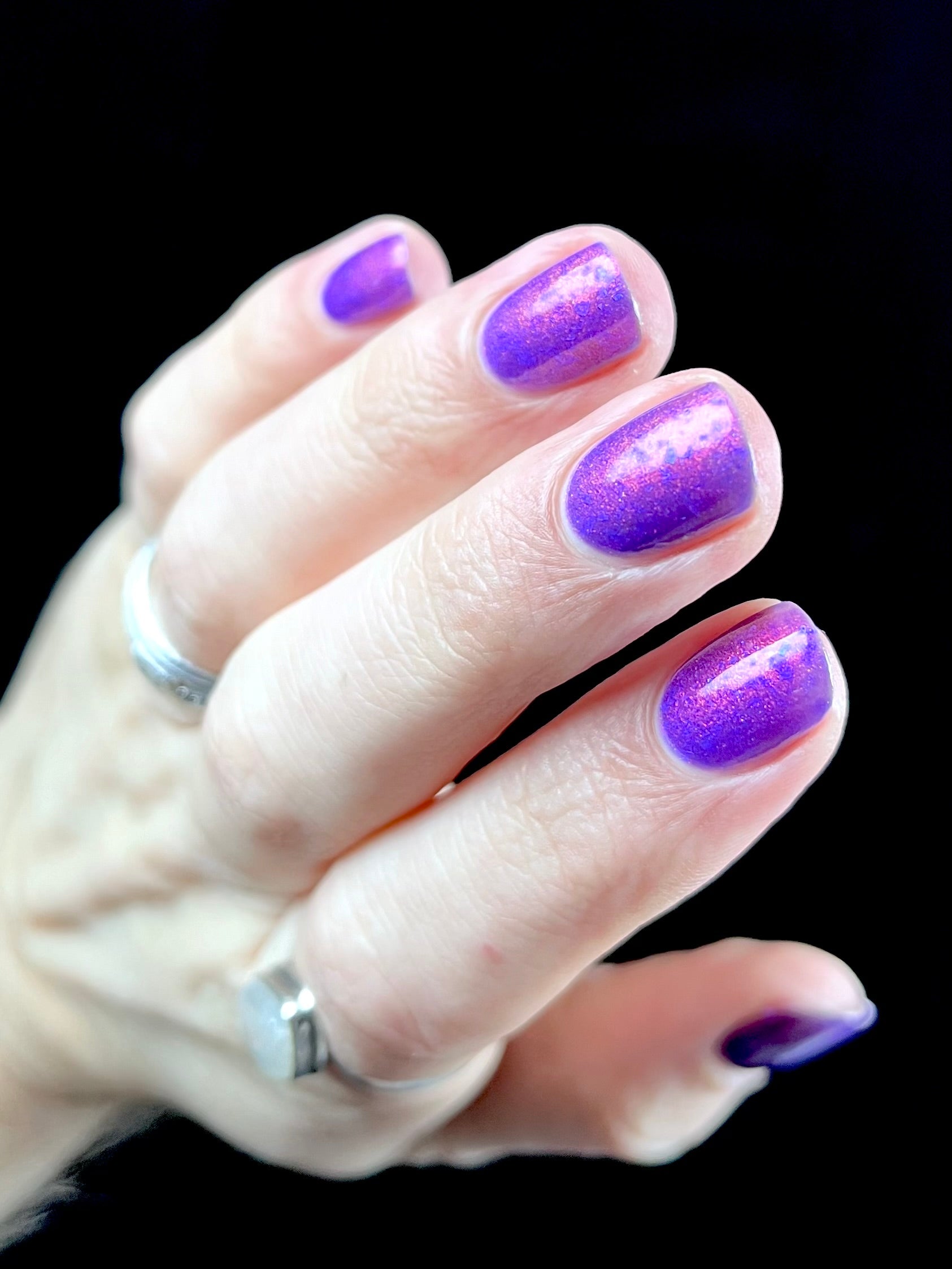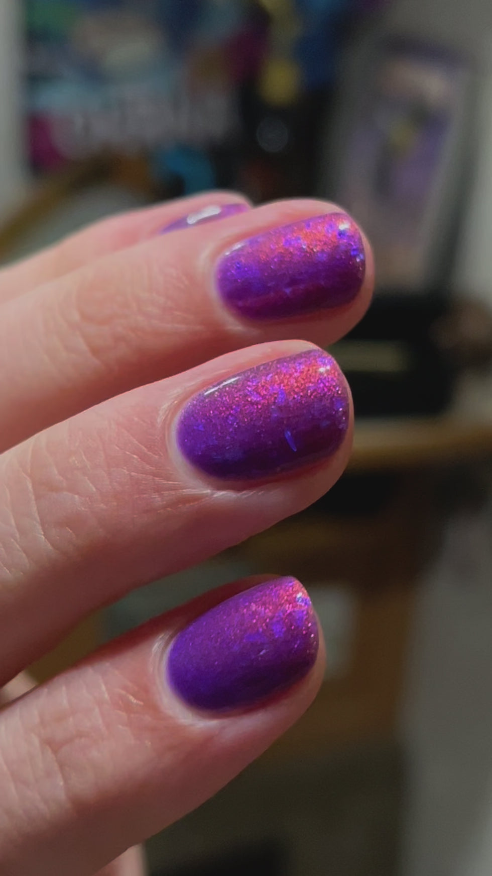 Festival of Comets features a light cornflower blue jelly base with red shimmer and blue-purple flakes. This is a thermal polish that goes from a warm-toned purple (cold state) to a light cornflower blue (warm state).