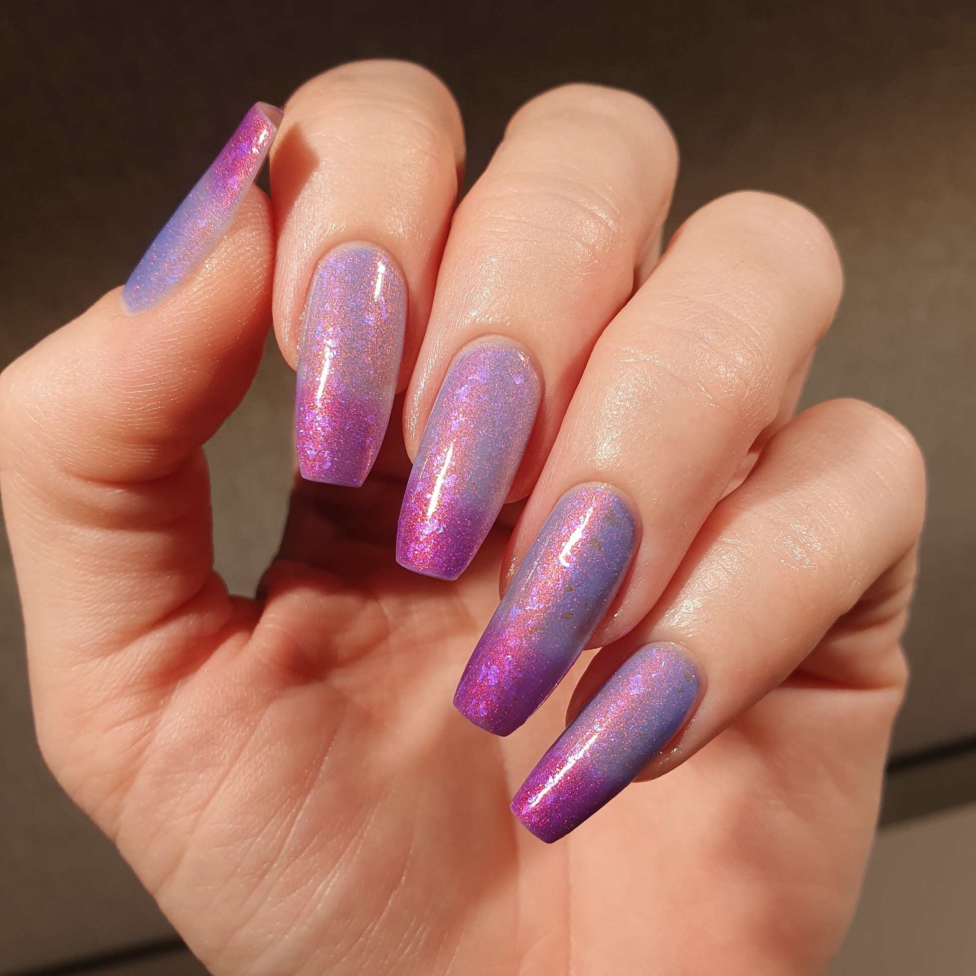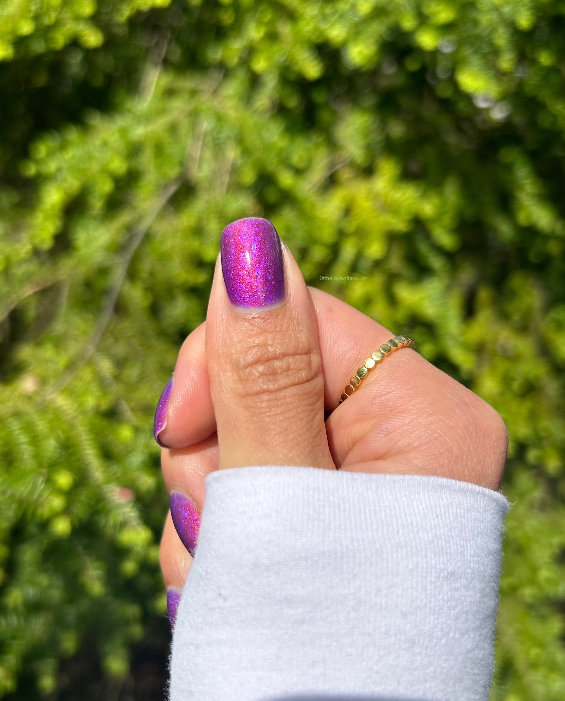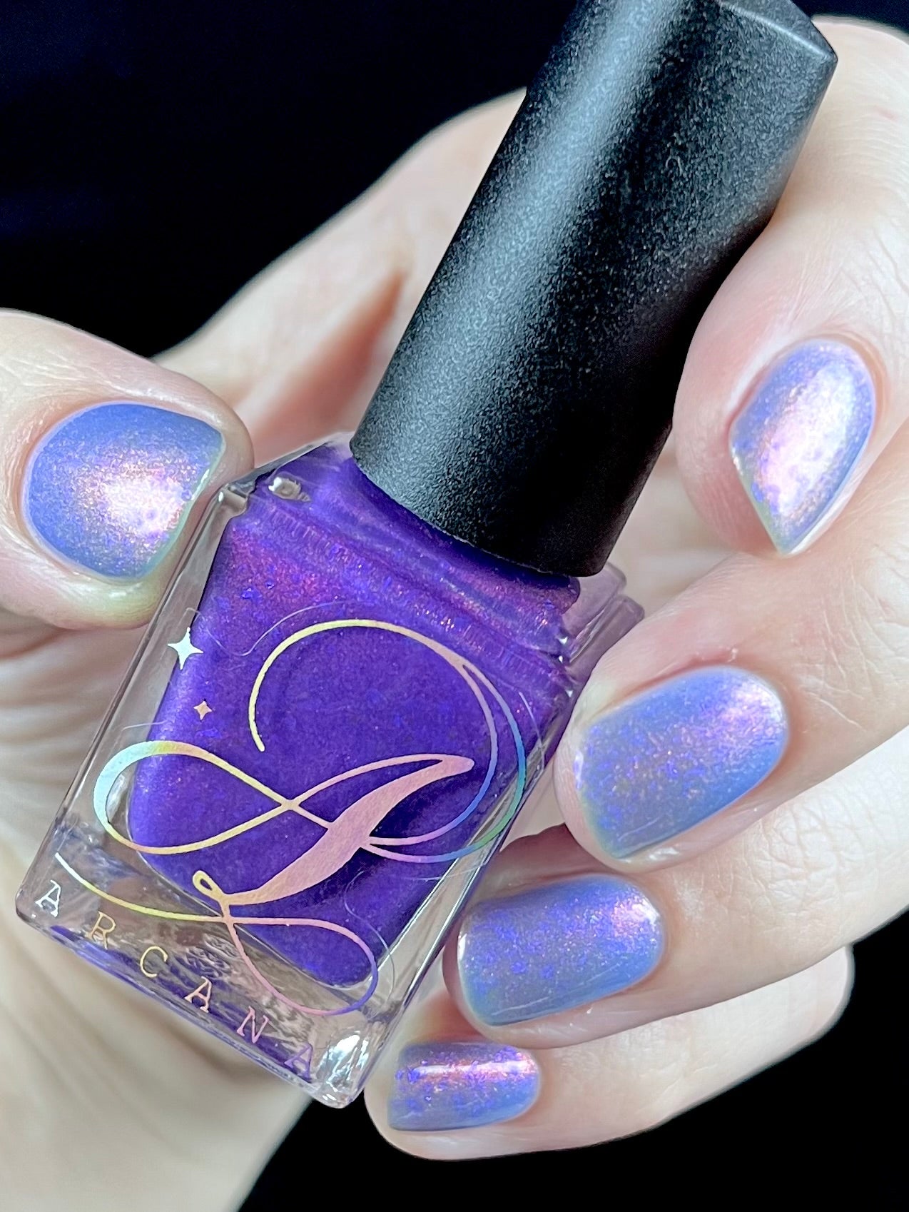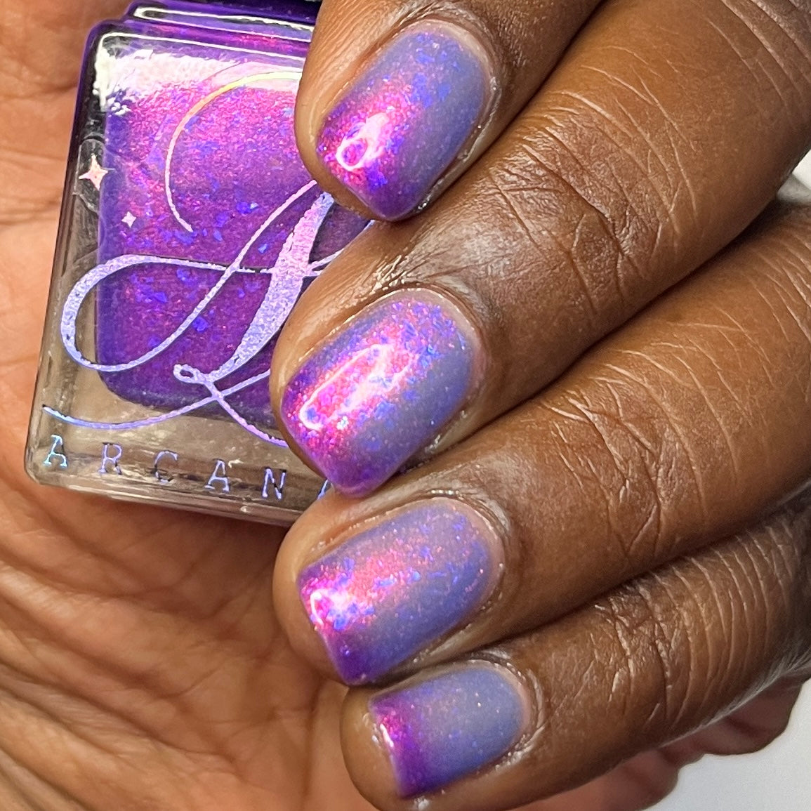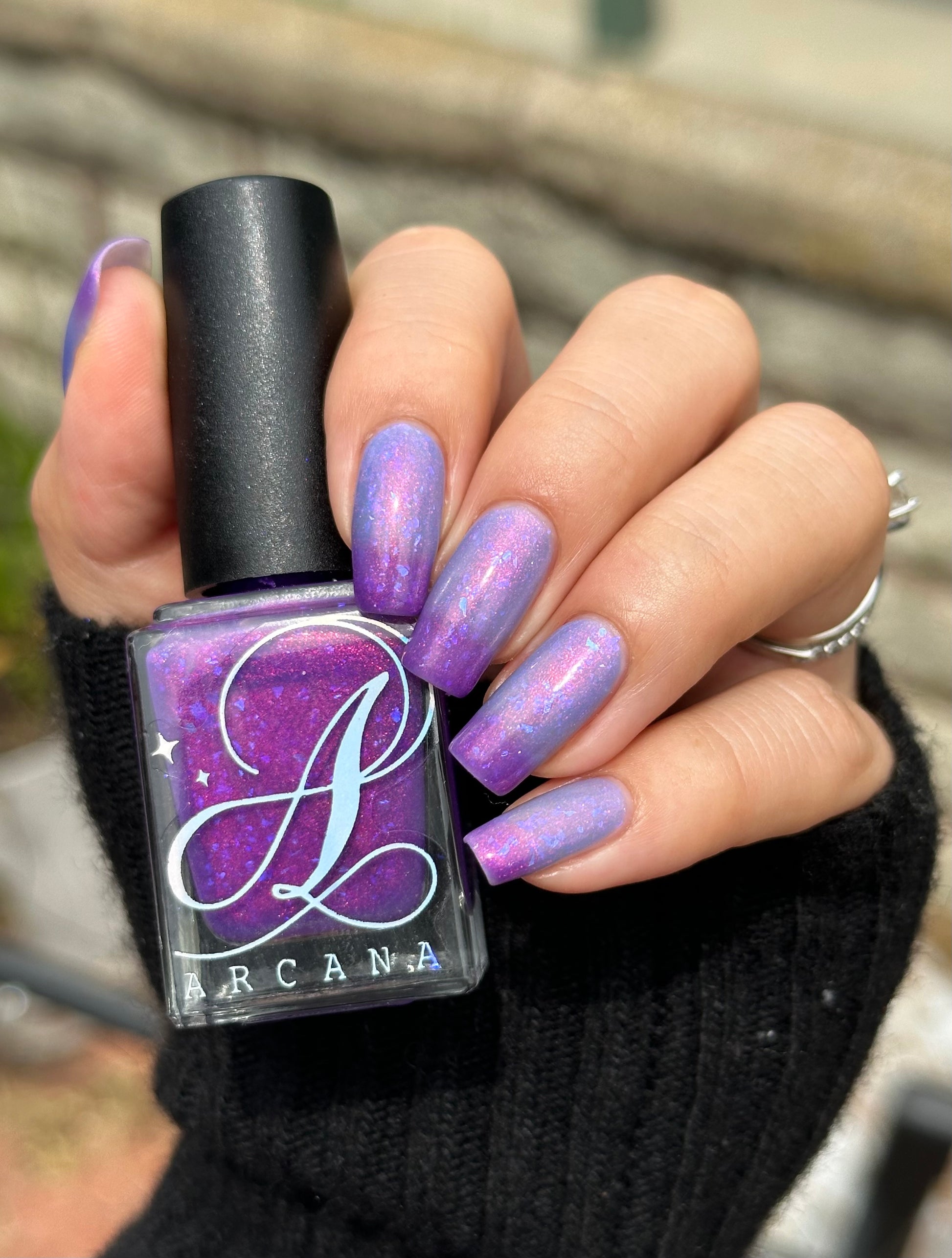 Festival of Comets features a light cornflower blue jelly base with red shimmer and blue-purple flakes. This is a thermal polish that goes from a warm-toned purple (cold state) to a light cornflower blue (warm state).