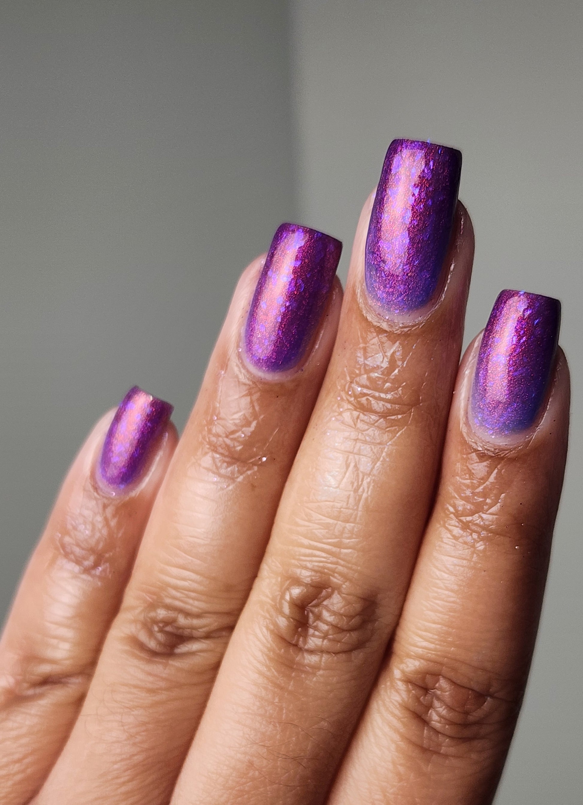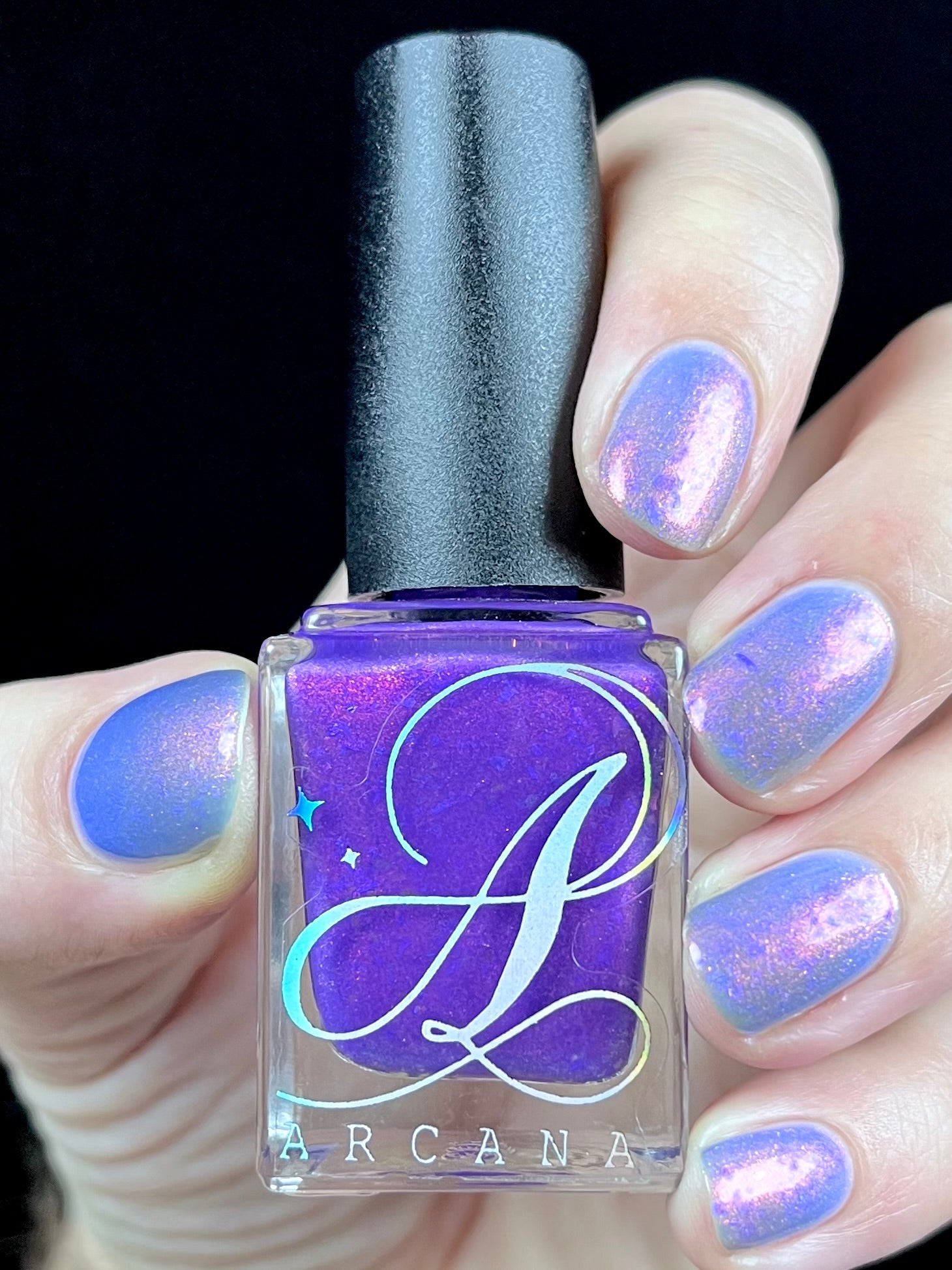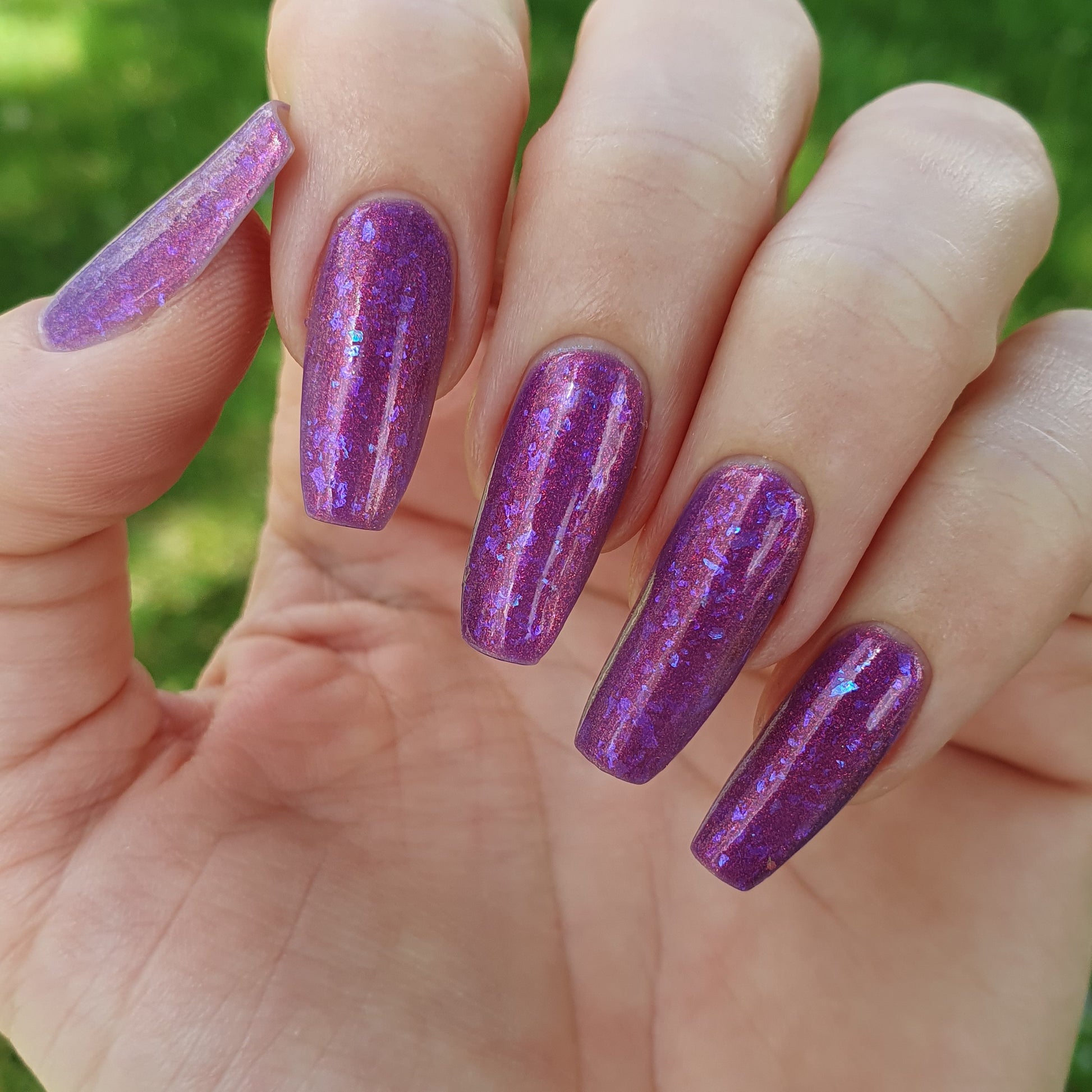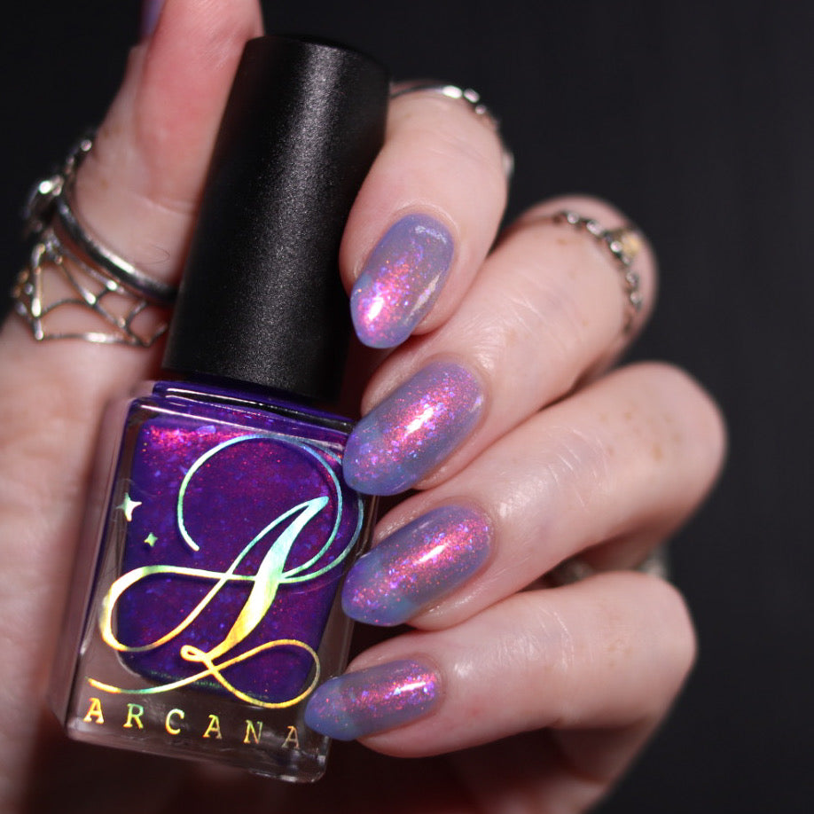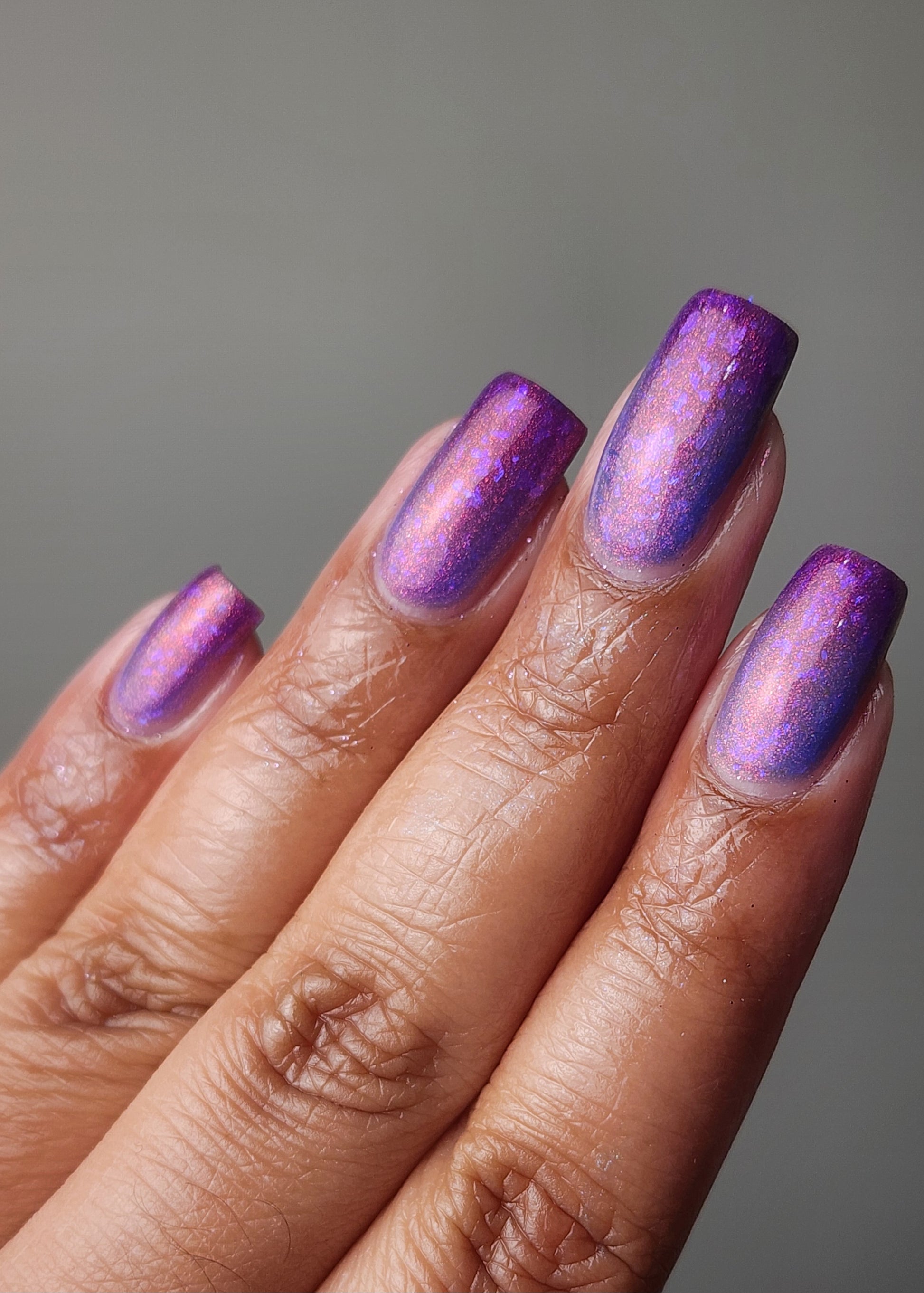 Festival of Comets features a light cornflower blue jelly base with red shimmer and blue-purple flakes. This is a thermal polish that goes from a warm-toned purple (cold state) to a light cornflower blue (warm state).