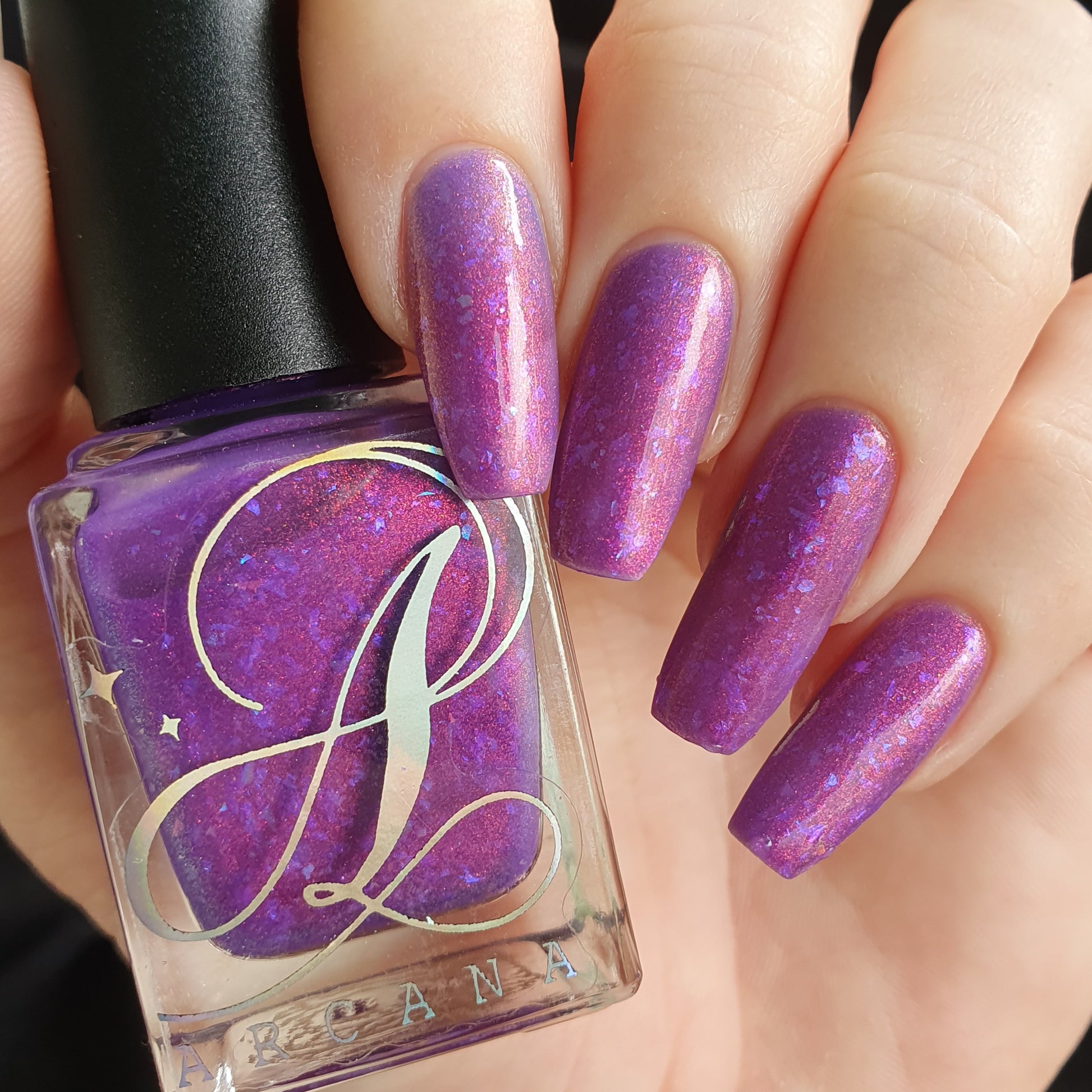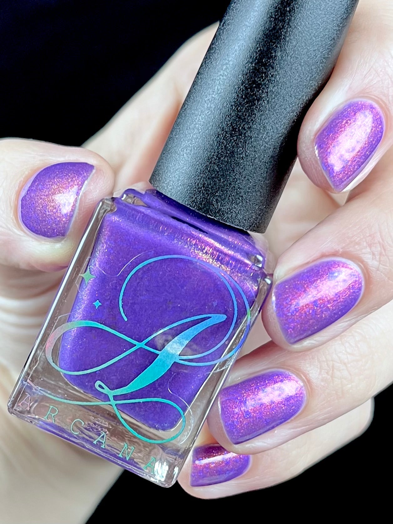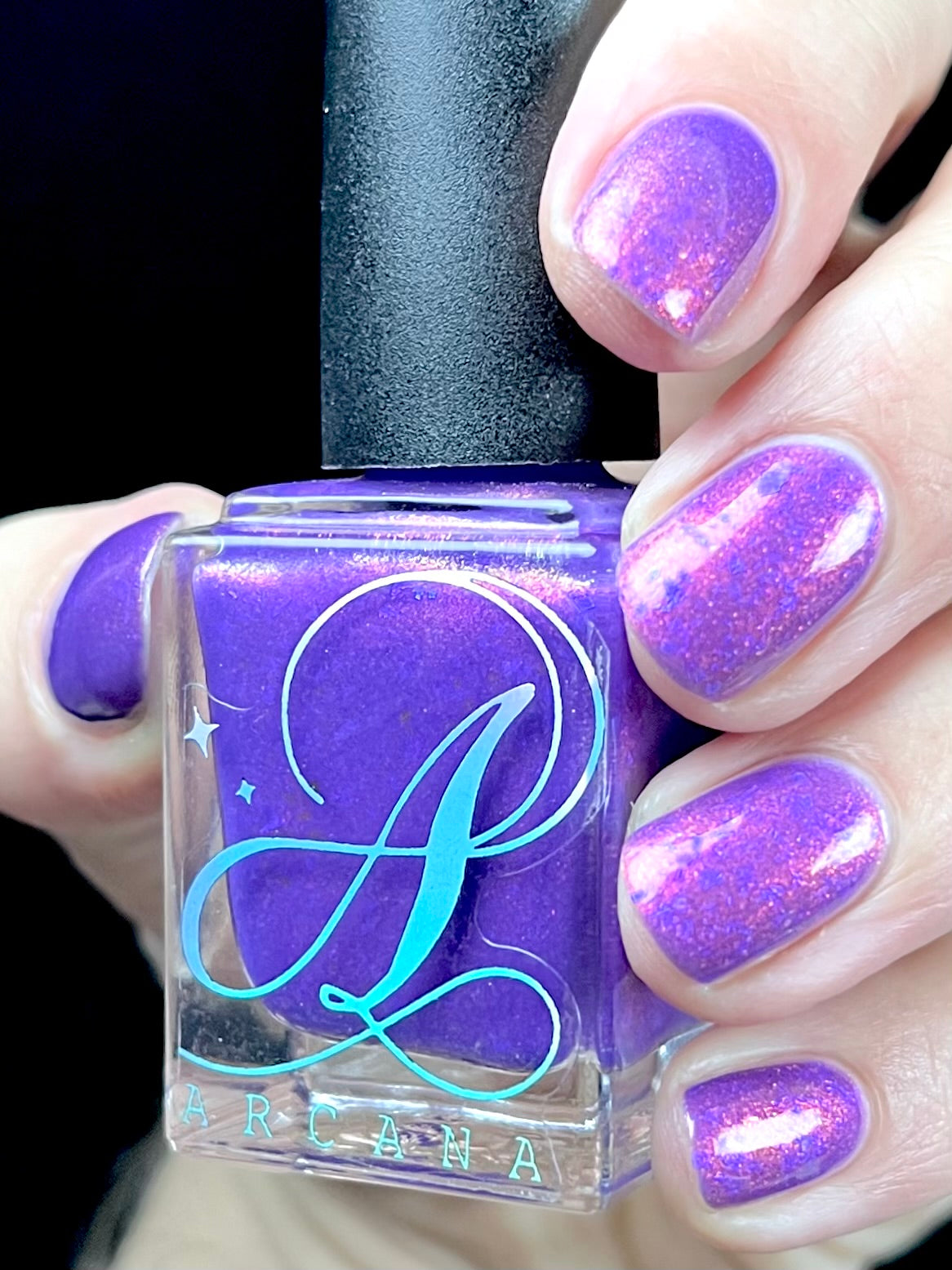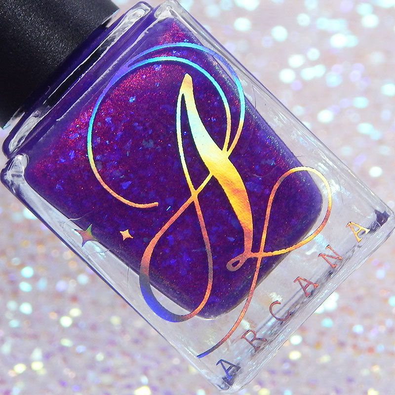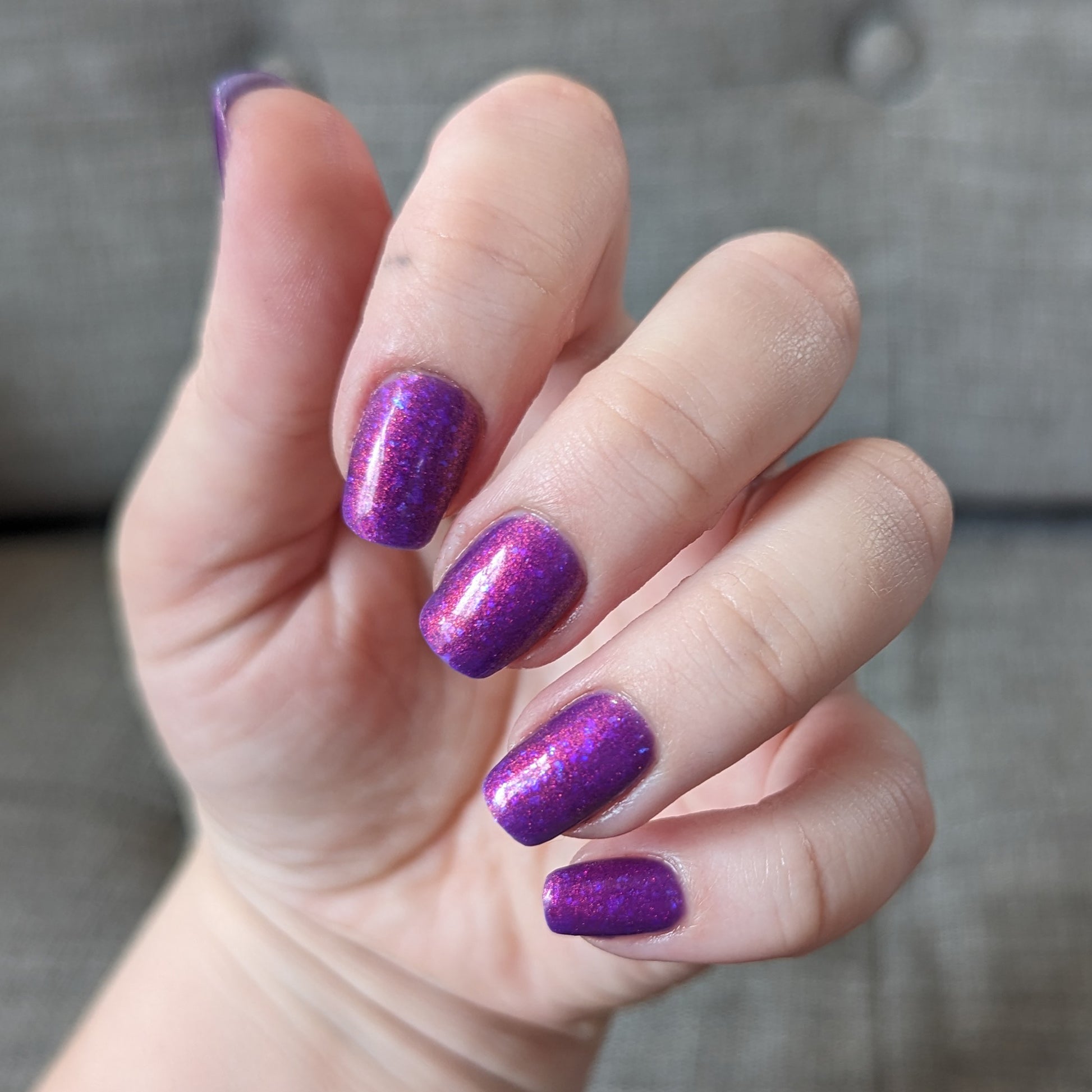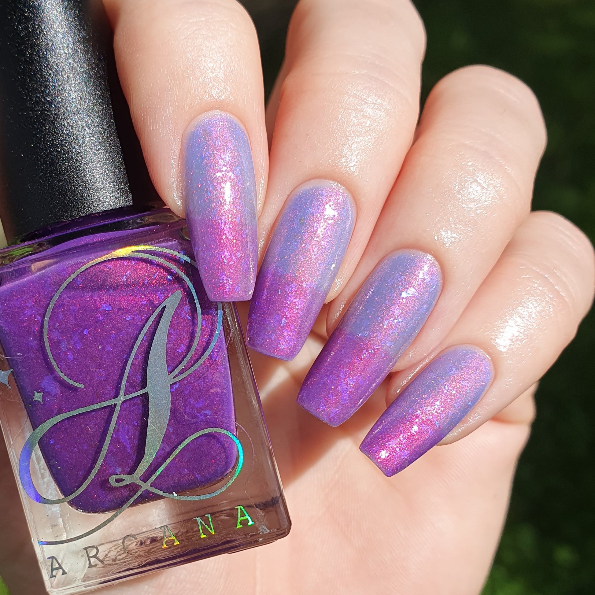 Festival of Comets features a light cornflower blue jelly base with red shimmer and blue-purple flakes. This is a thermal polish that goes from a warm-toned purple (cold state) to a light cornflower blue (warm state).