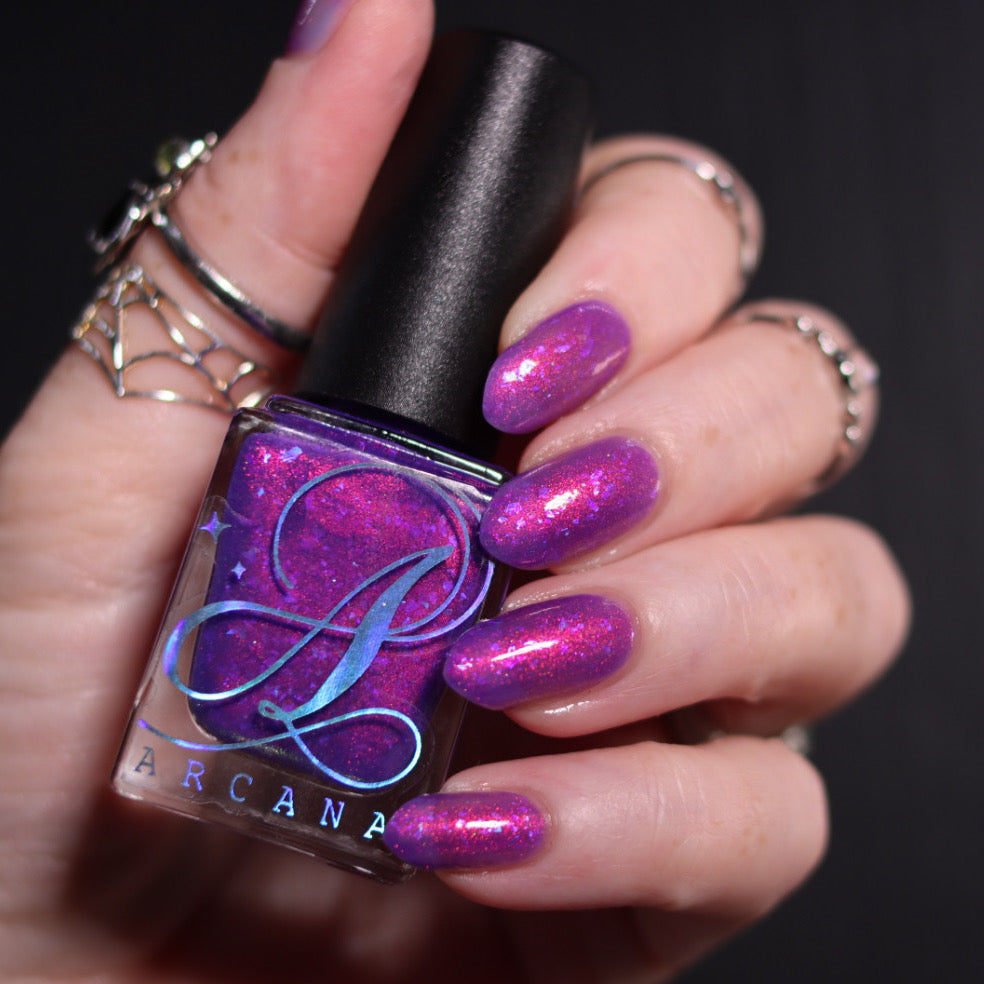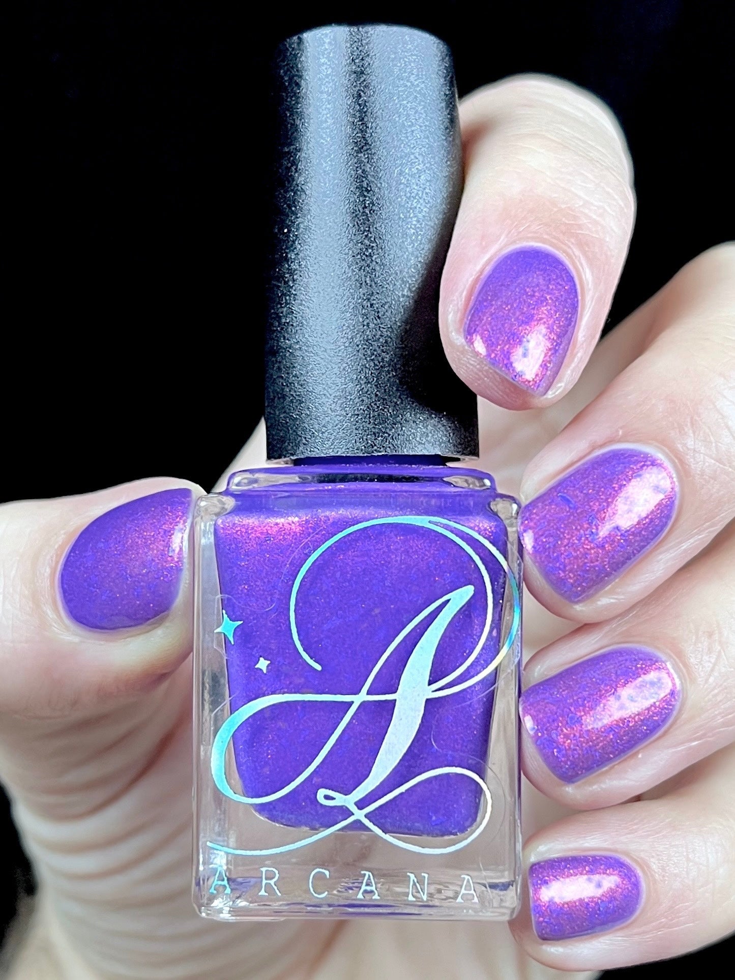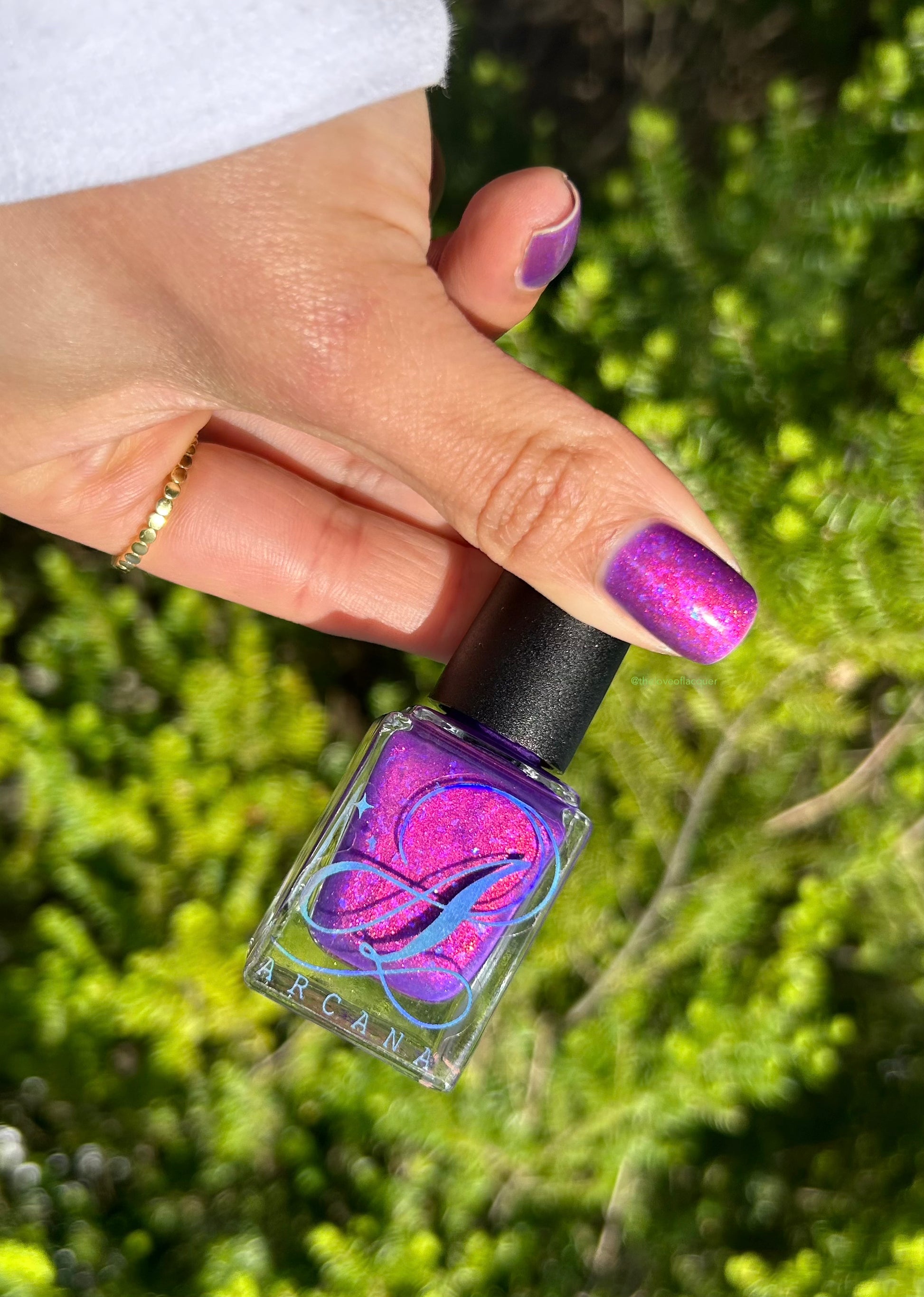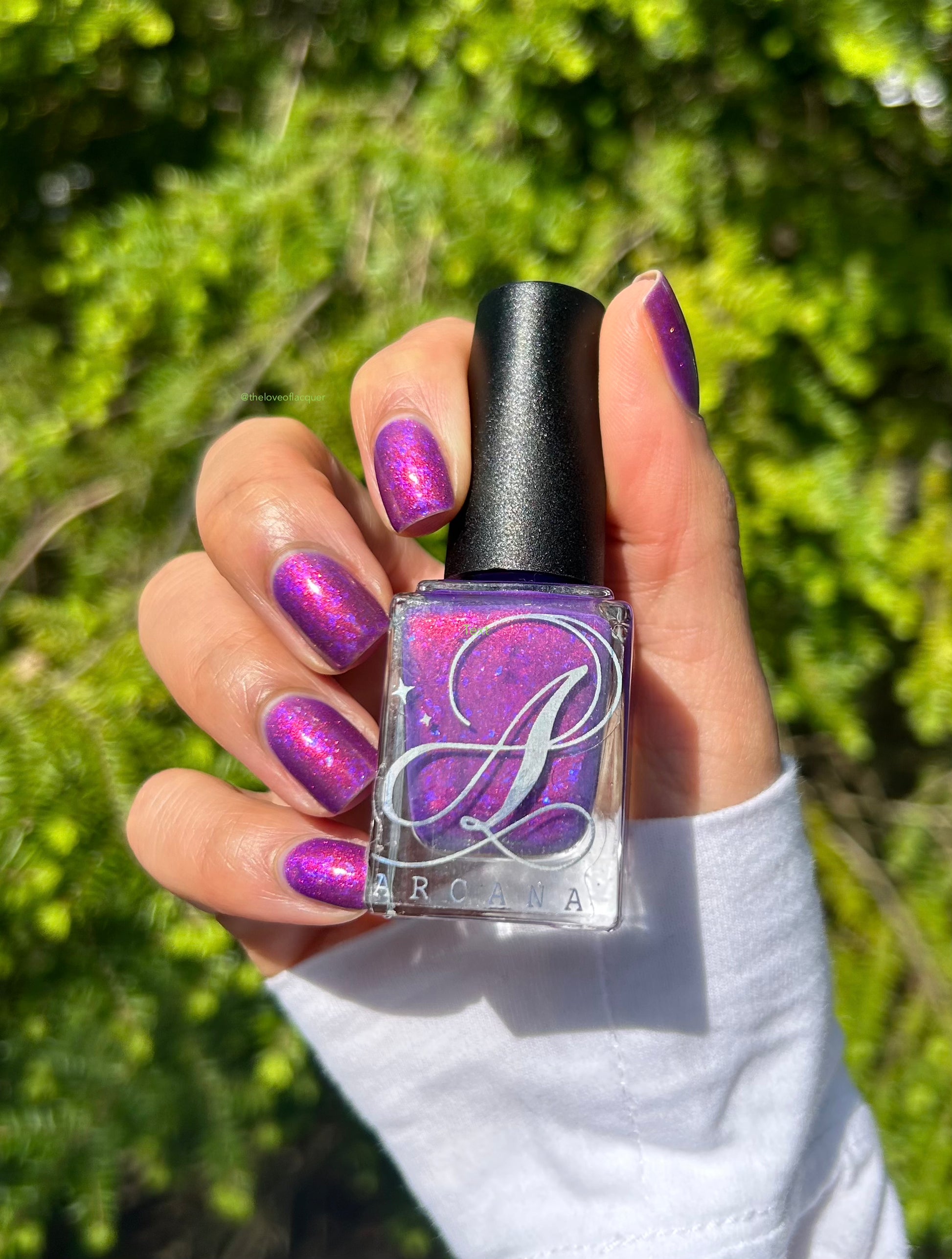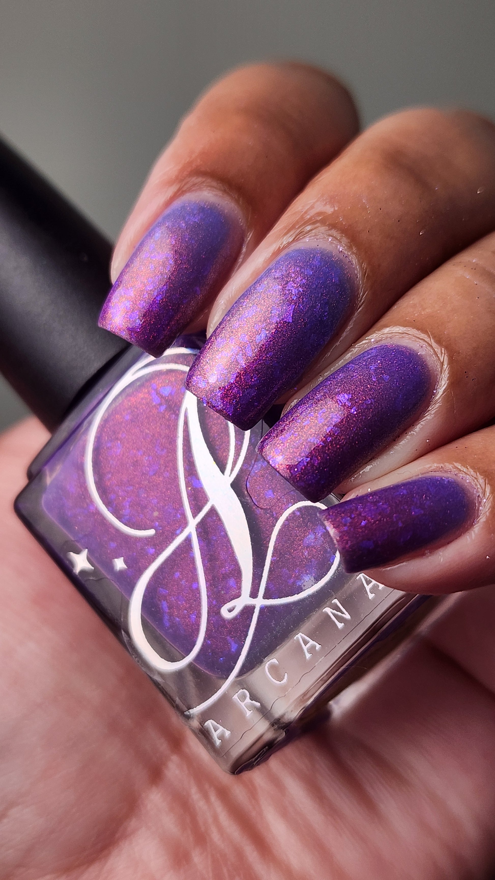 Festival of Comets features a light cornflower blue jelly base with red shimmer and blue-purple flakes. This is a thermal polish that goes from a warm-toned purple (cold state) to a light cornflower blue (warm state).