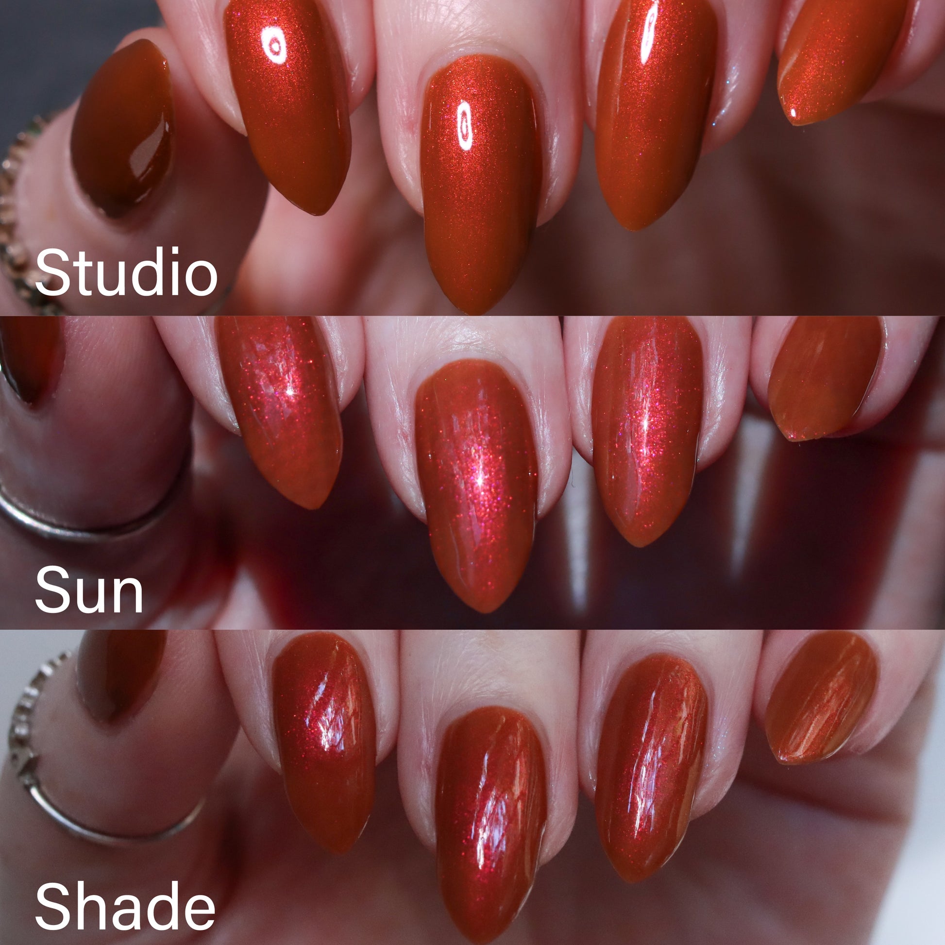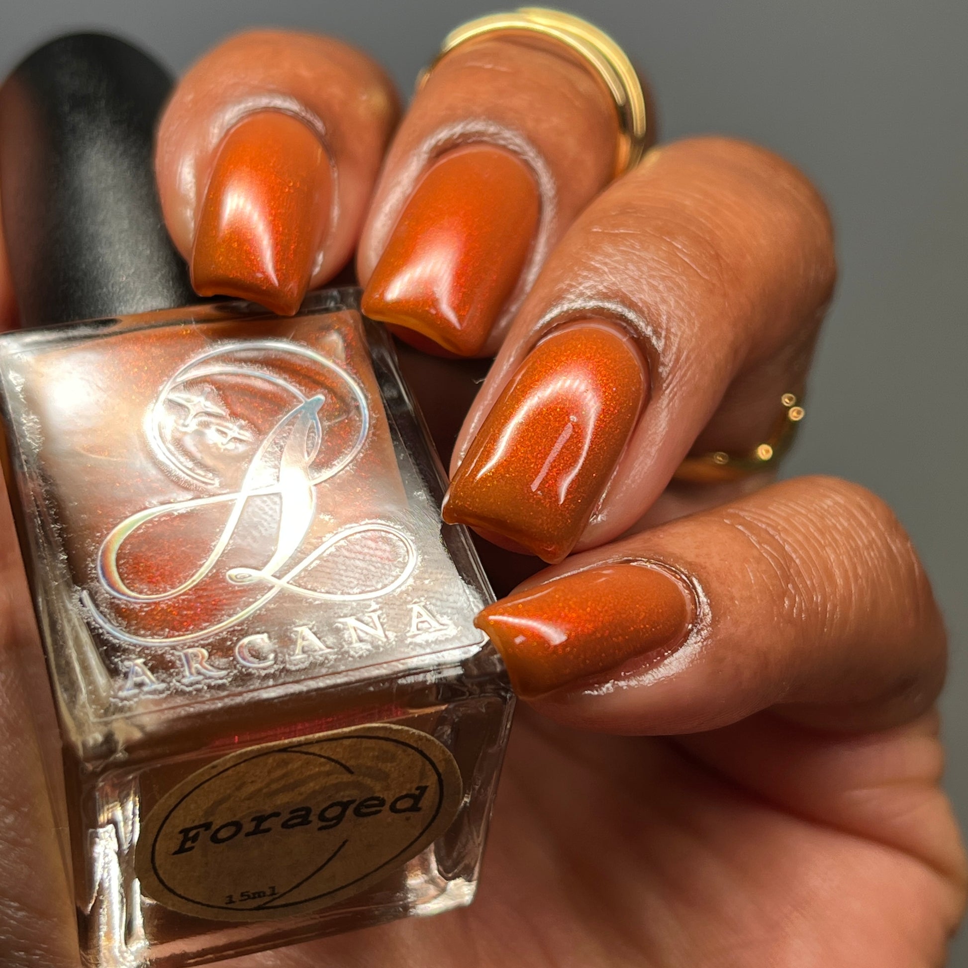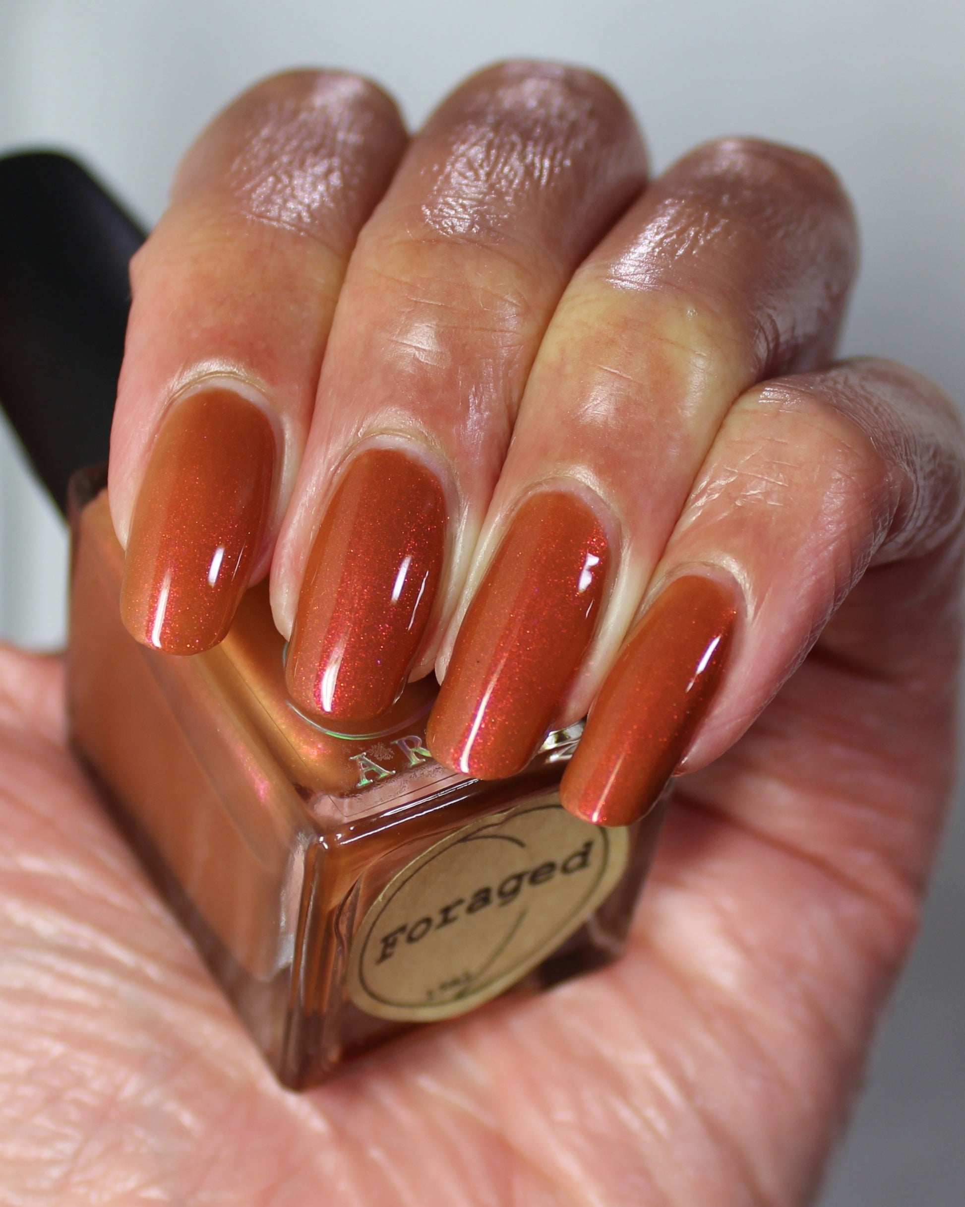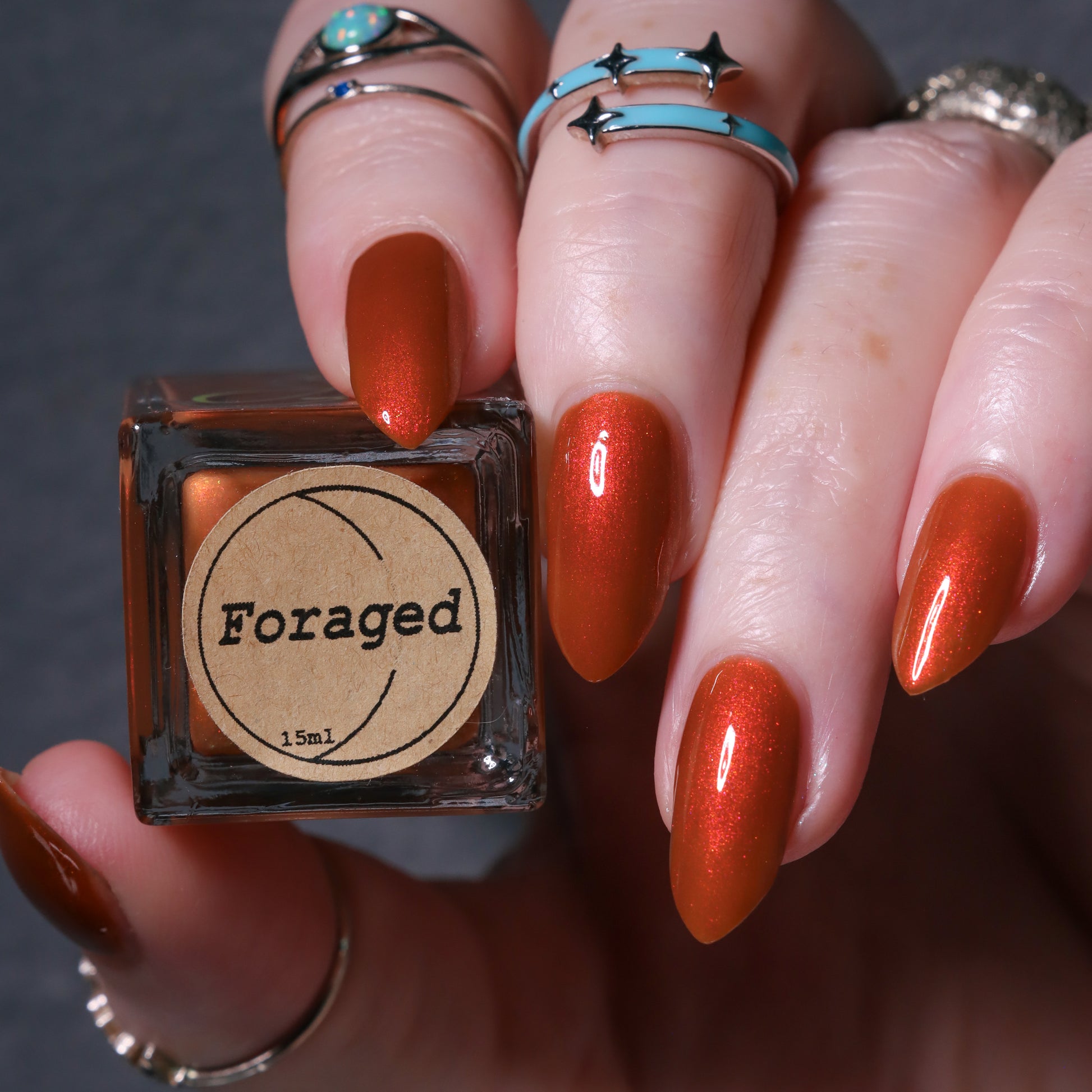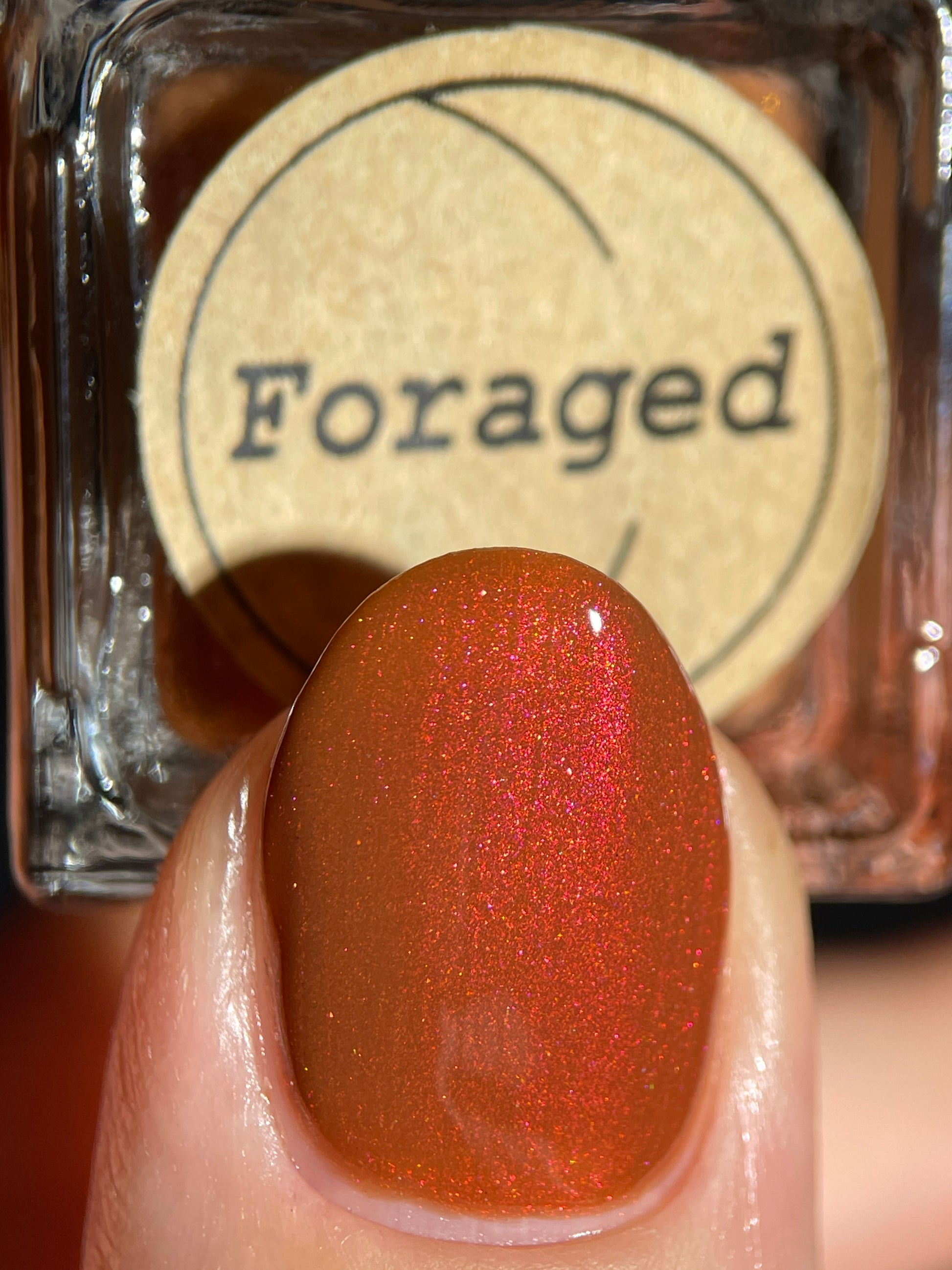 Foraged has a muted brown-orange base with red to orange shimmer.
