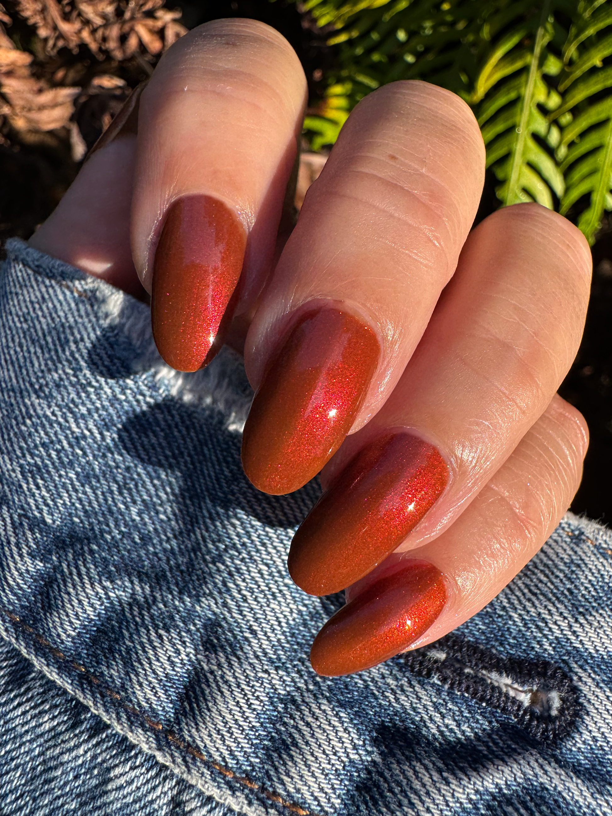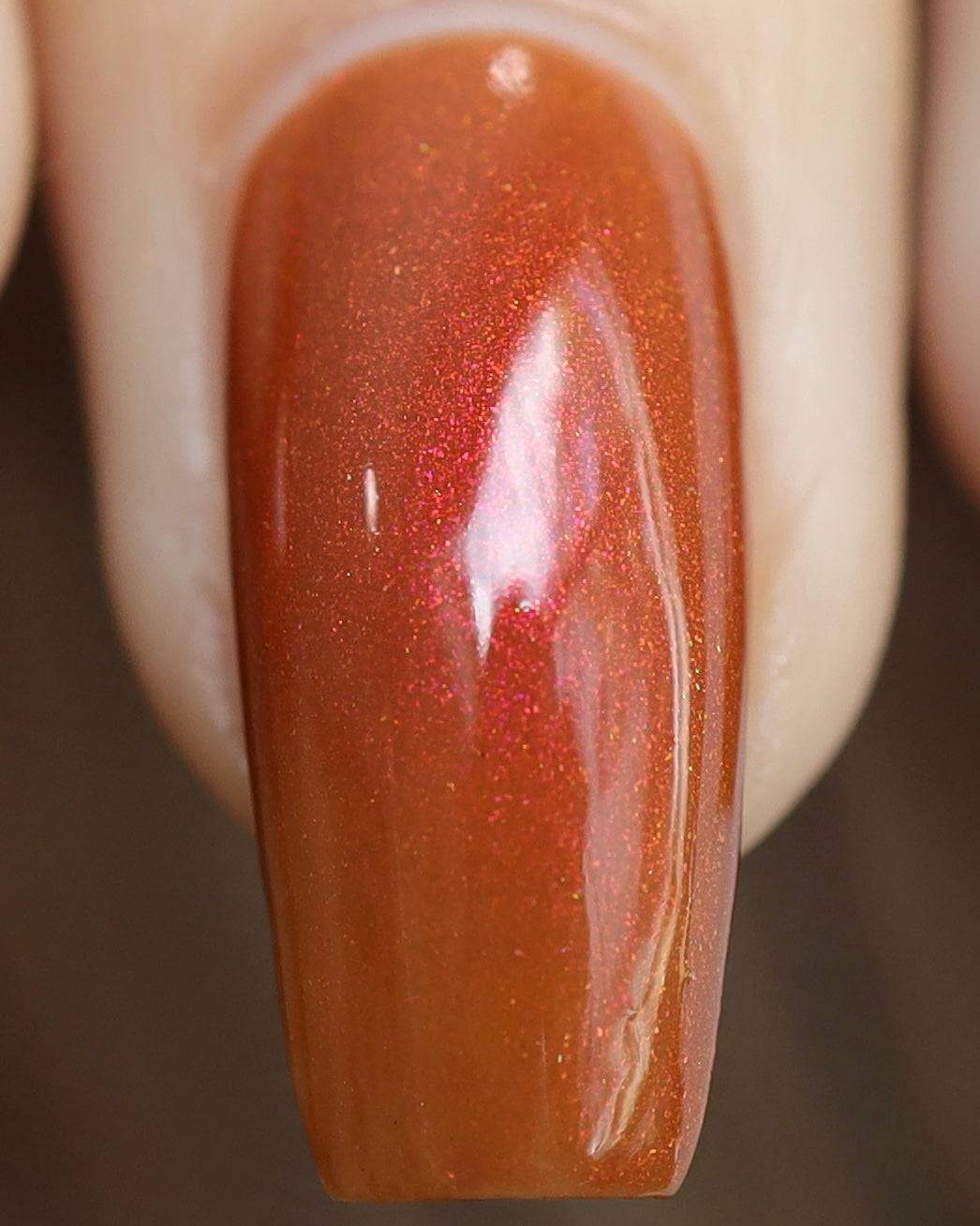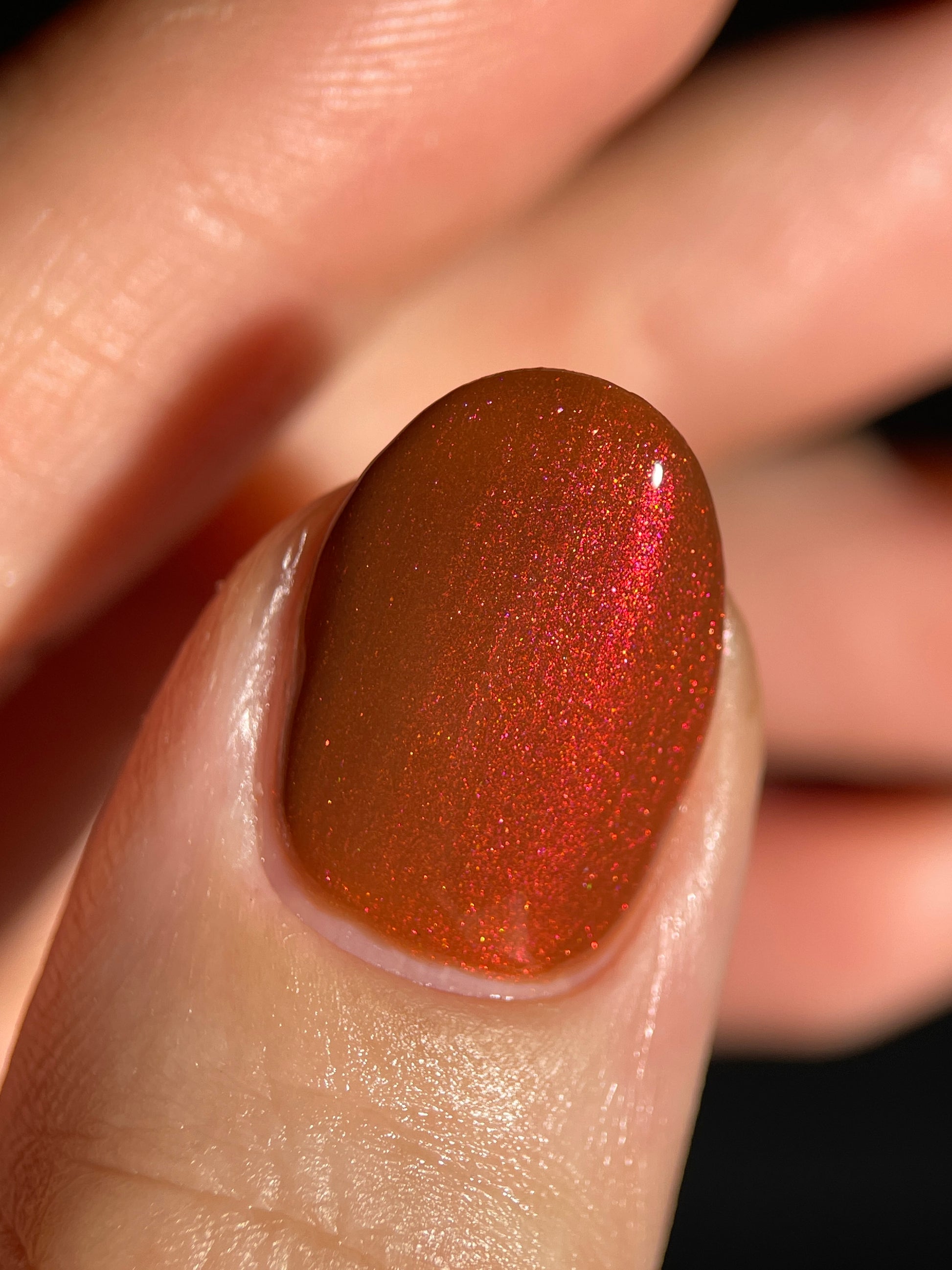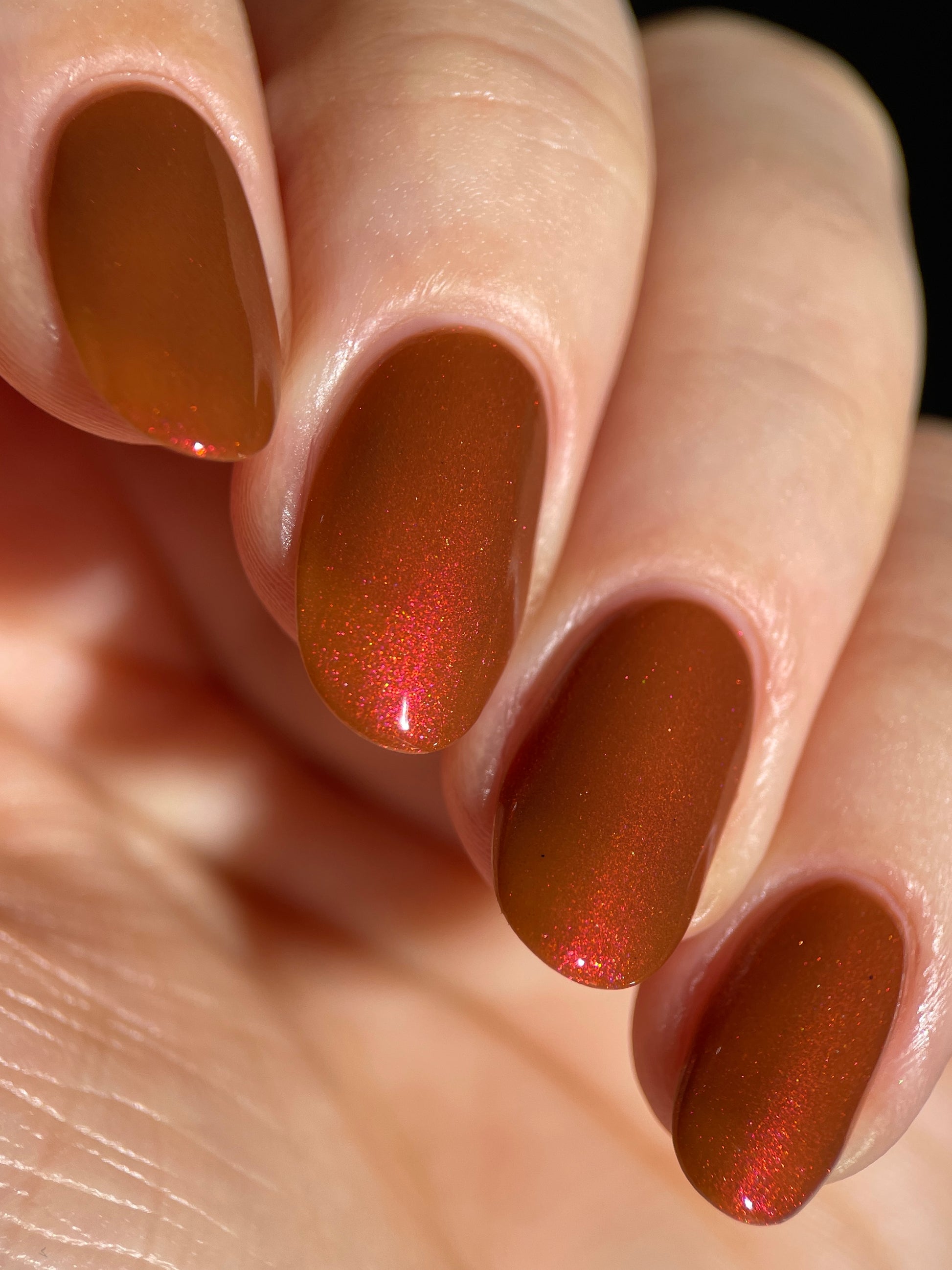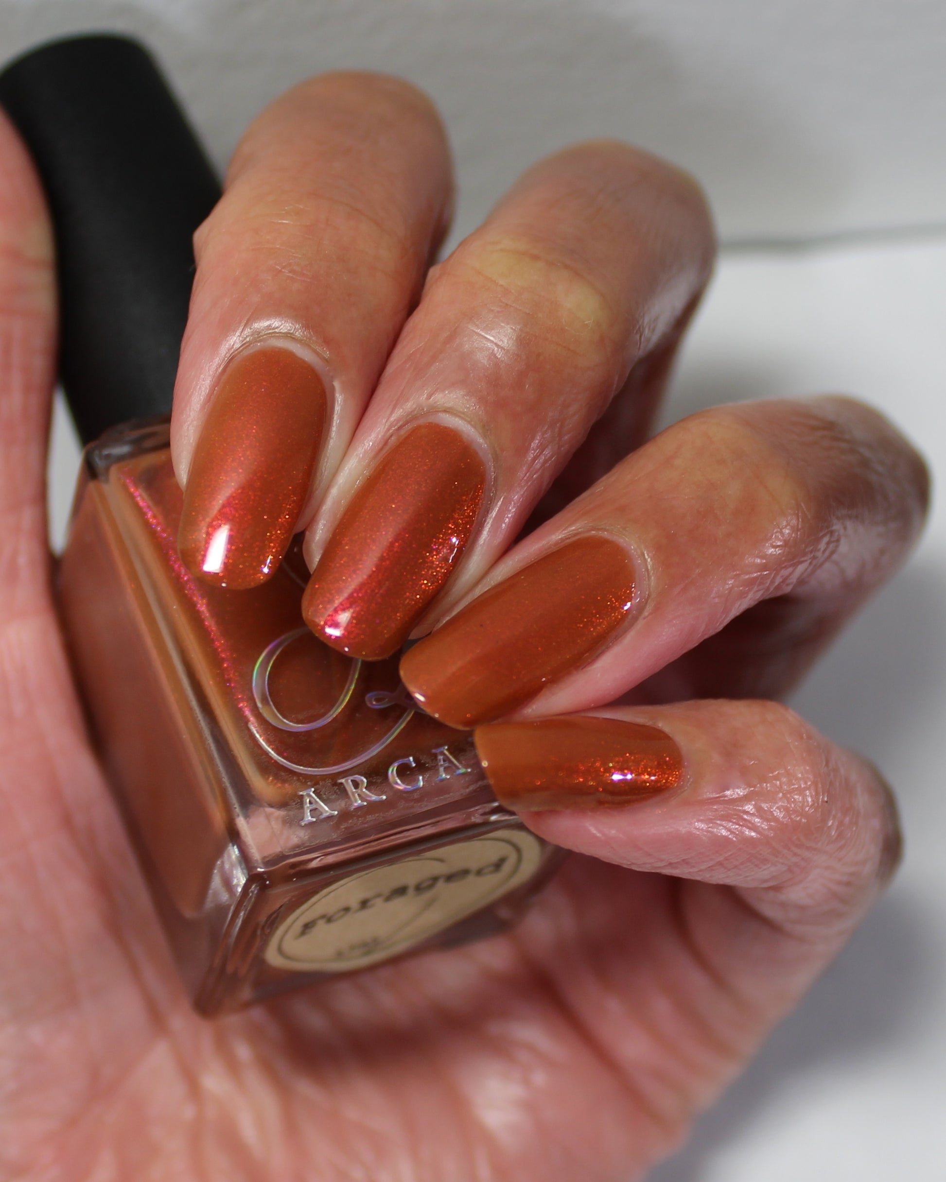 Foraged has a muted brown-orange base with red to orange shimmer.
