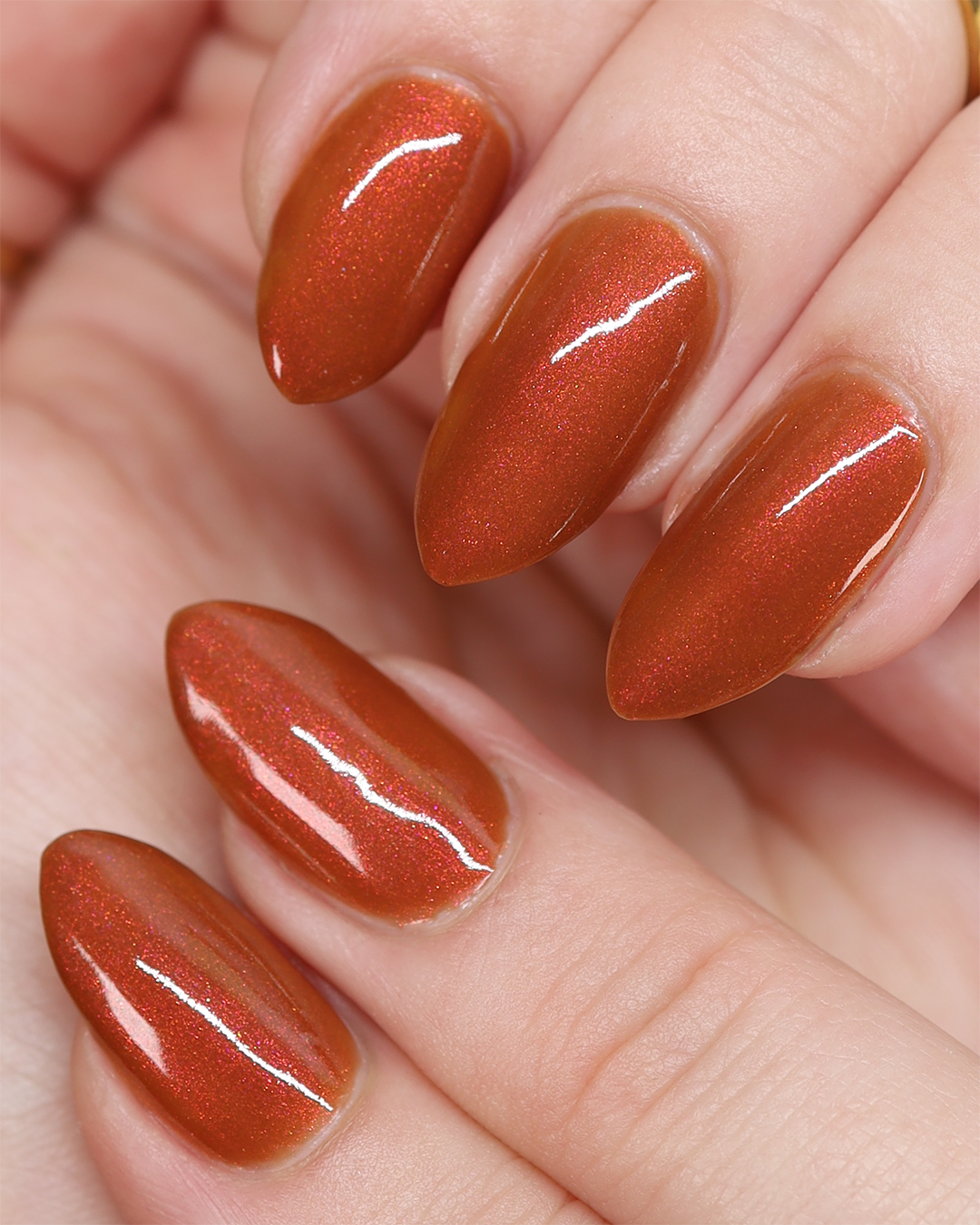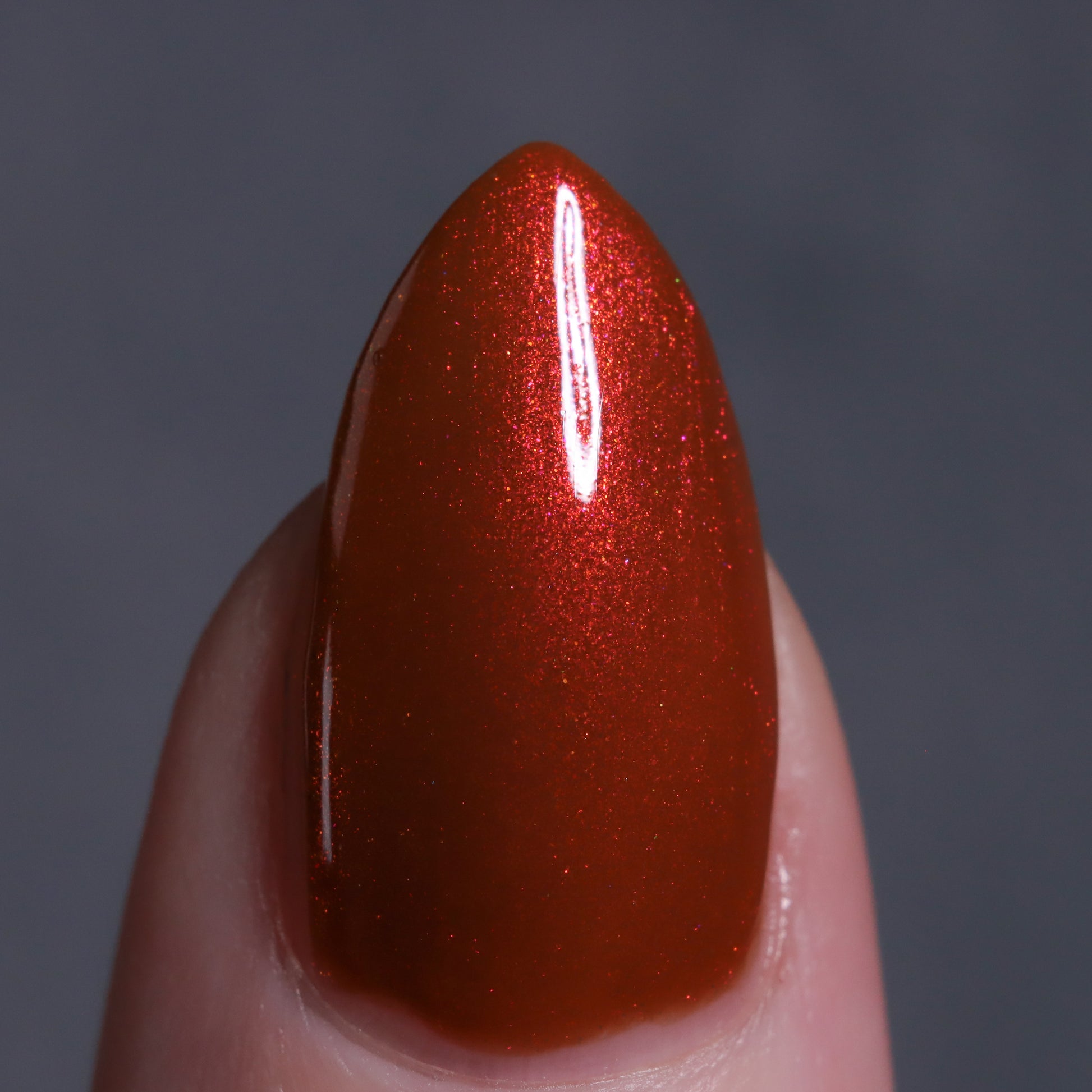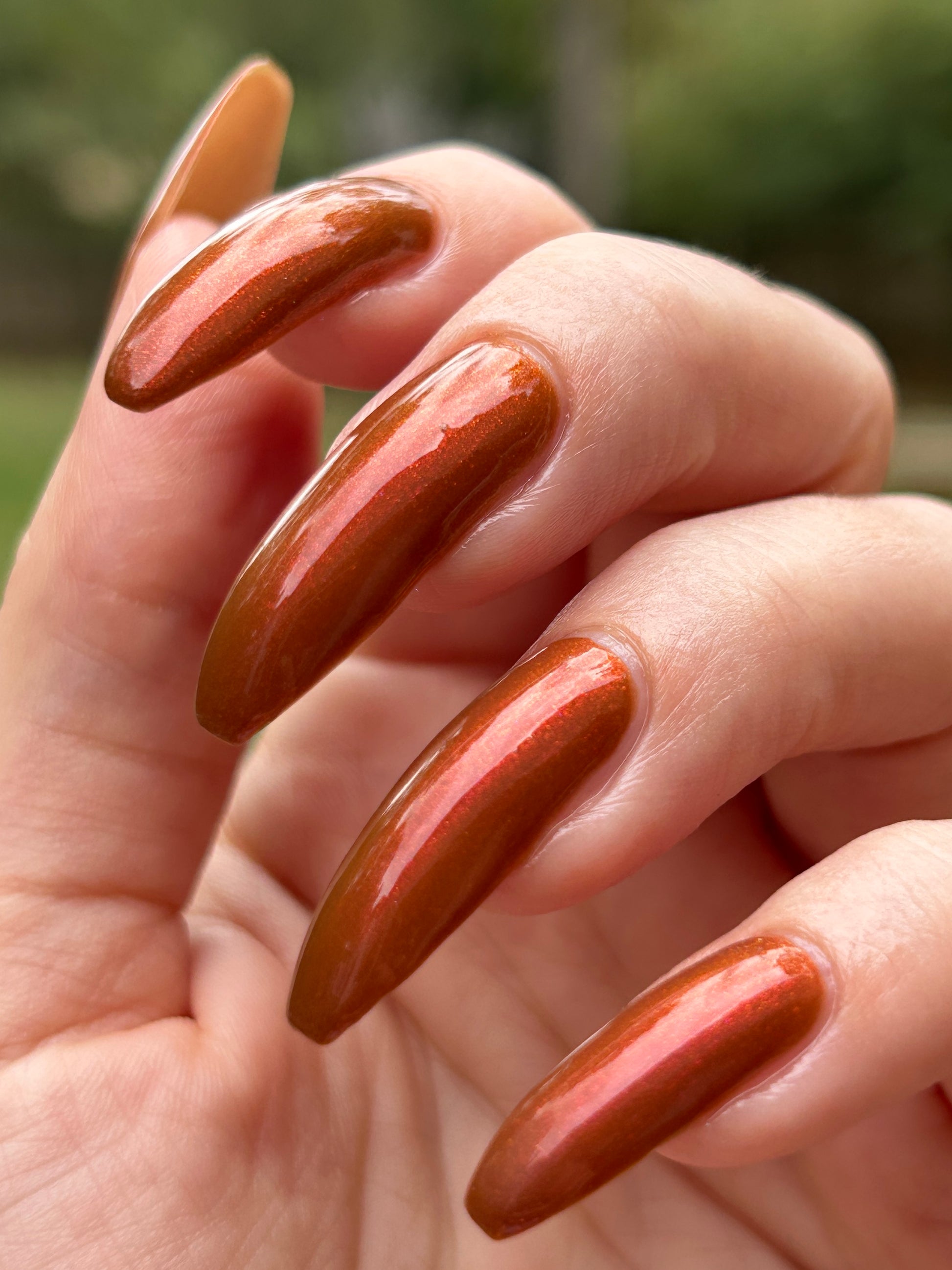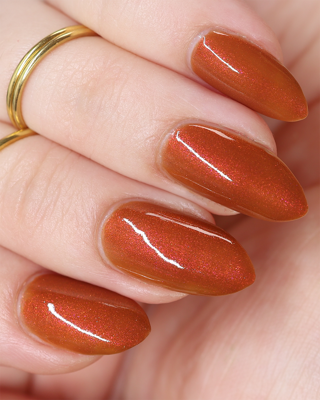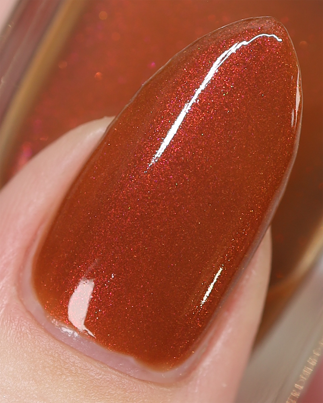 Foraged has a muted brown-orange base with red to orange shimmer.