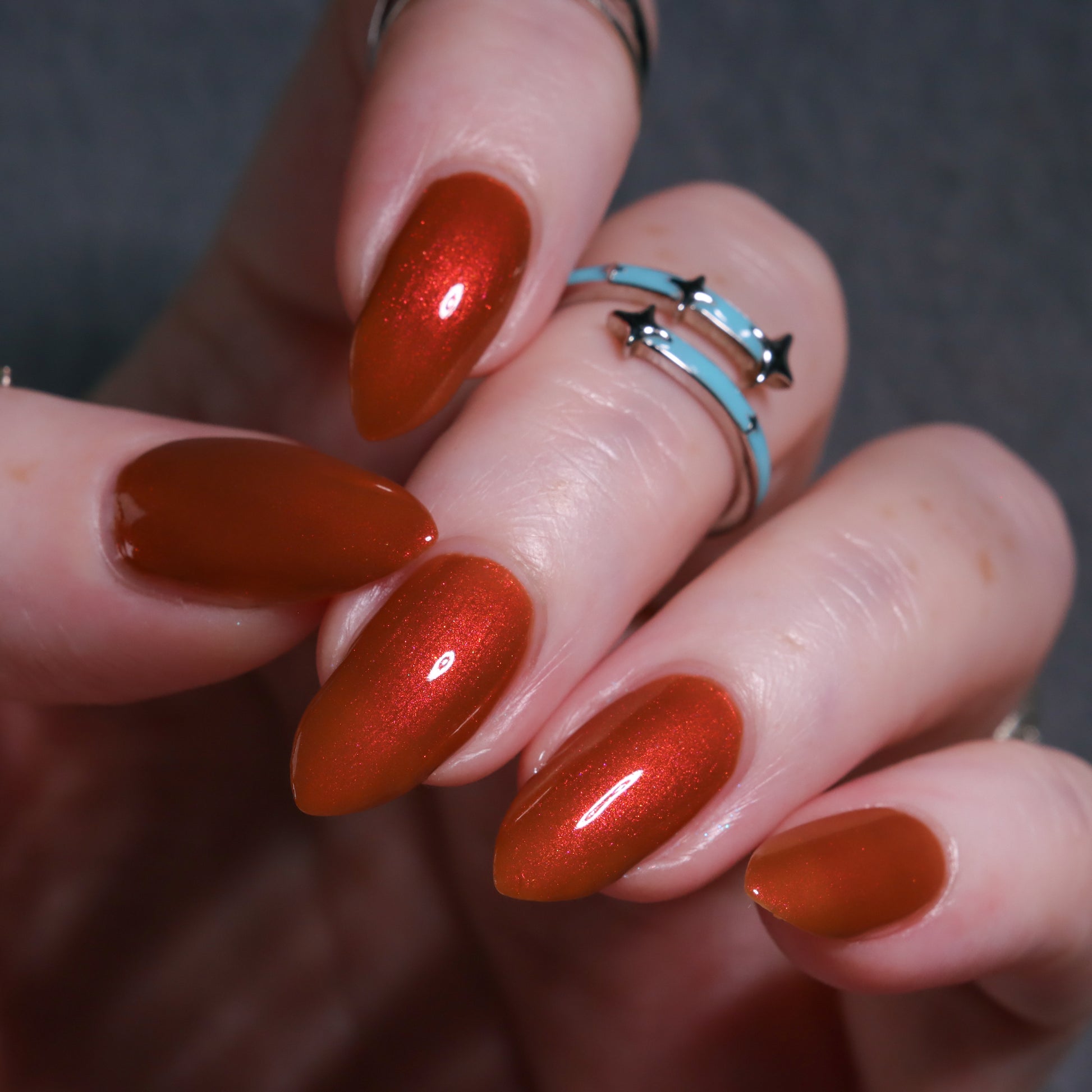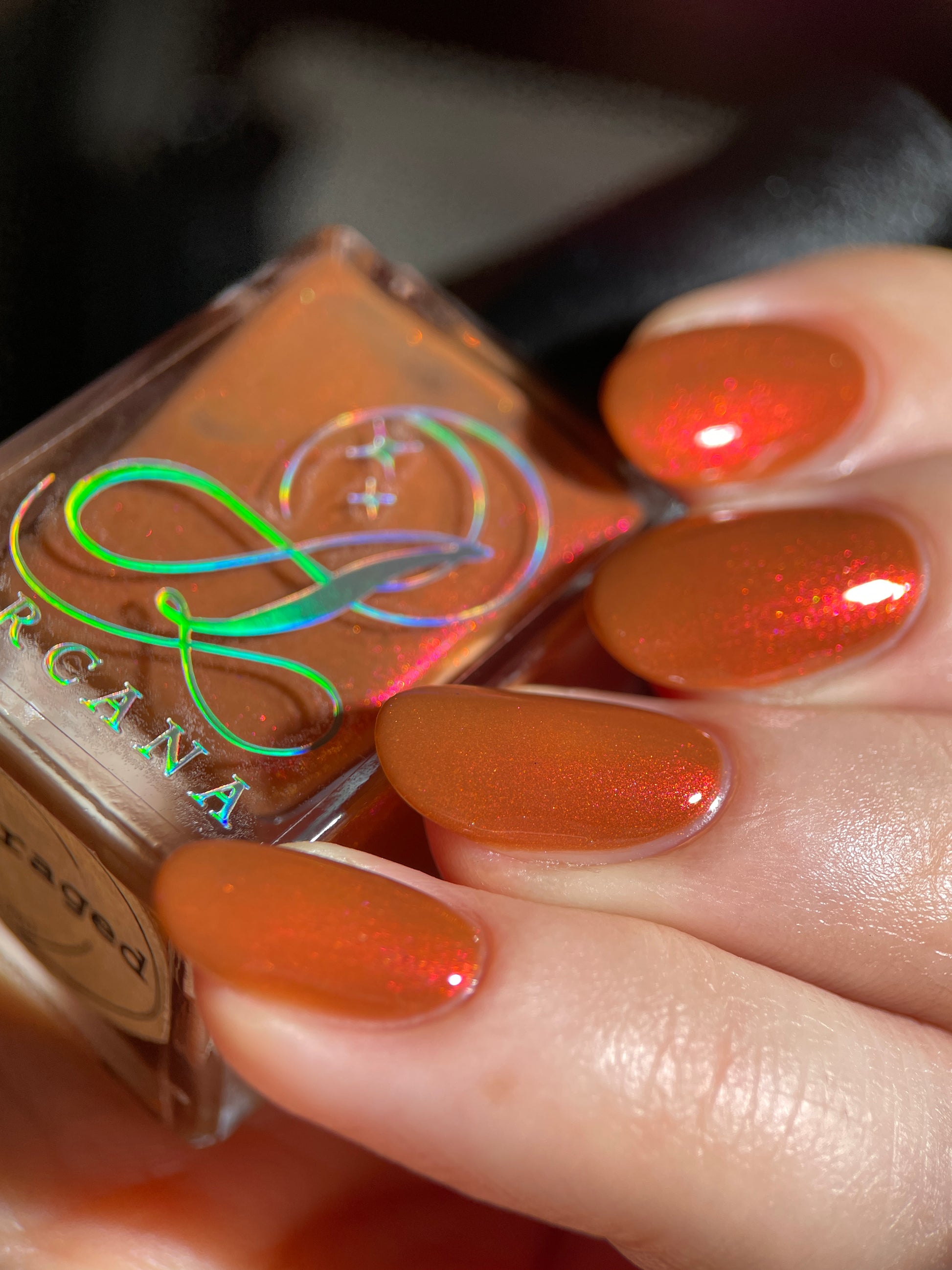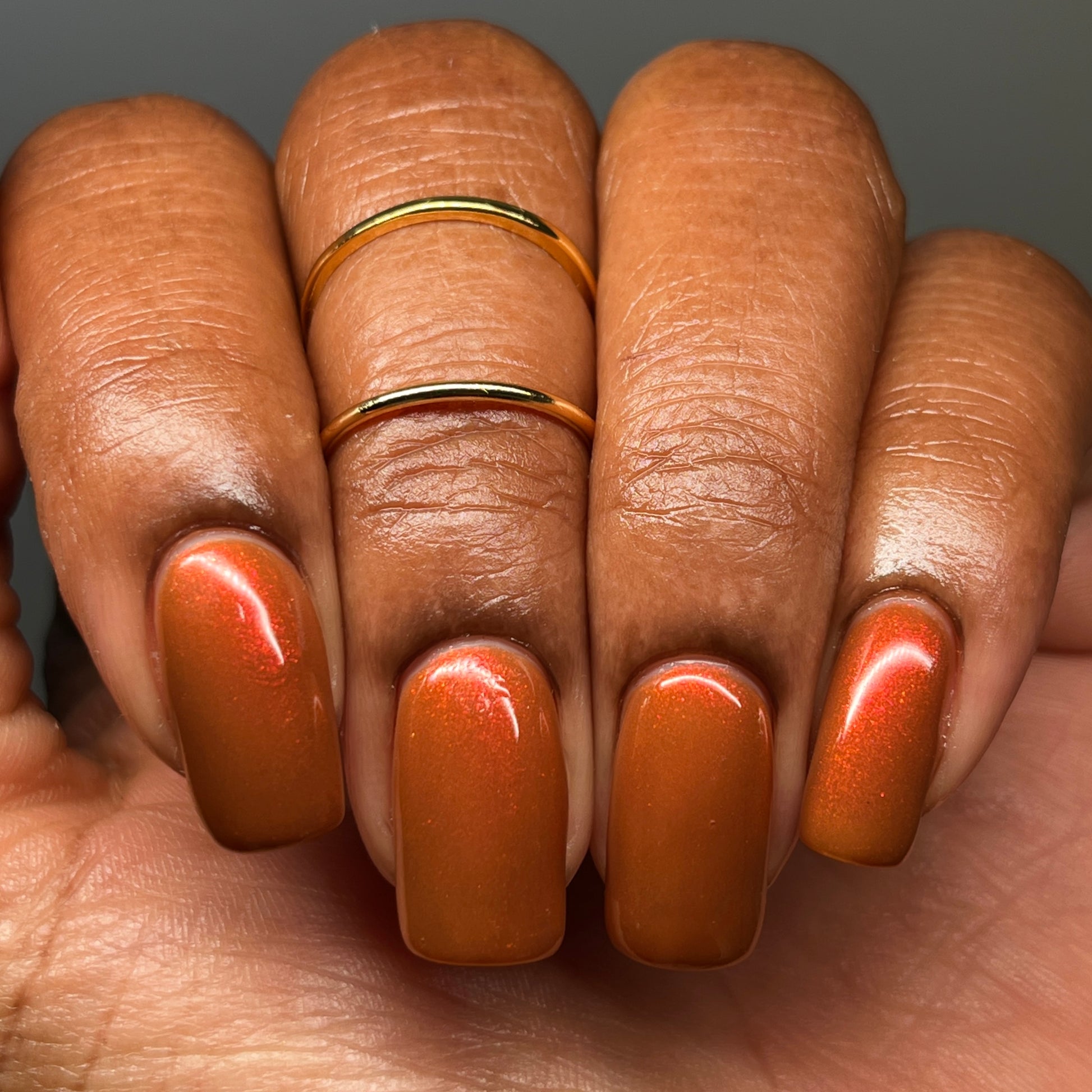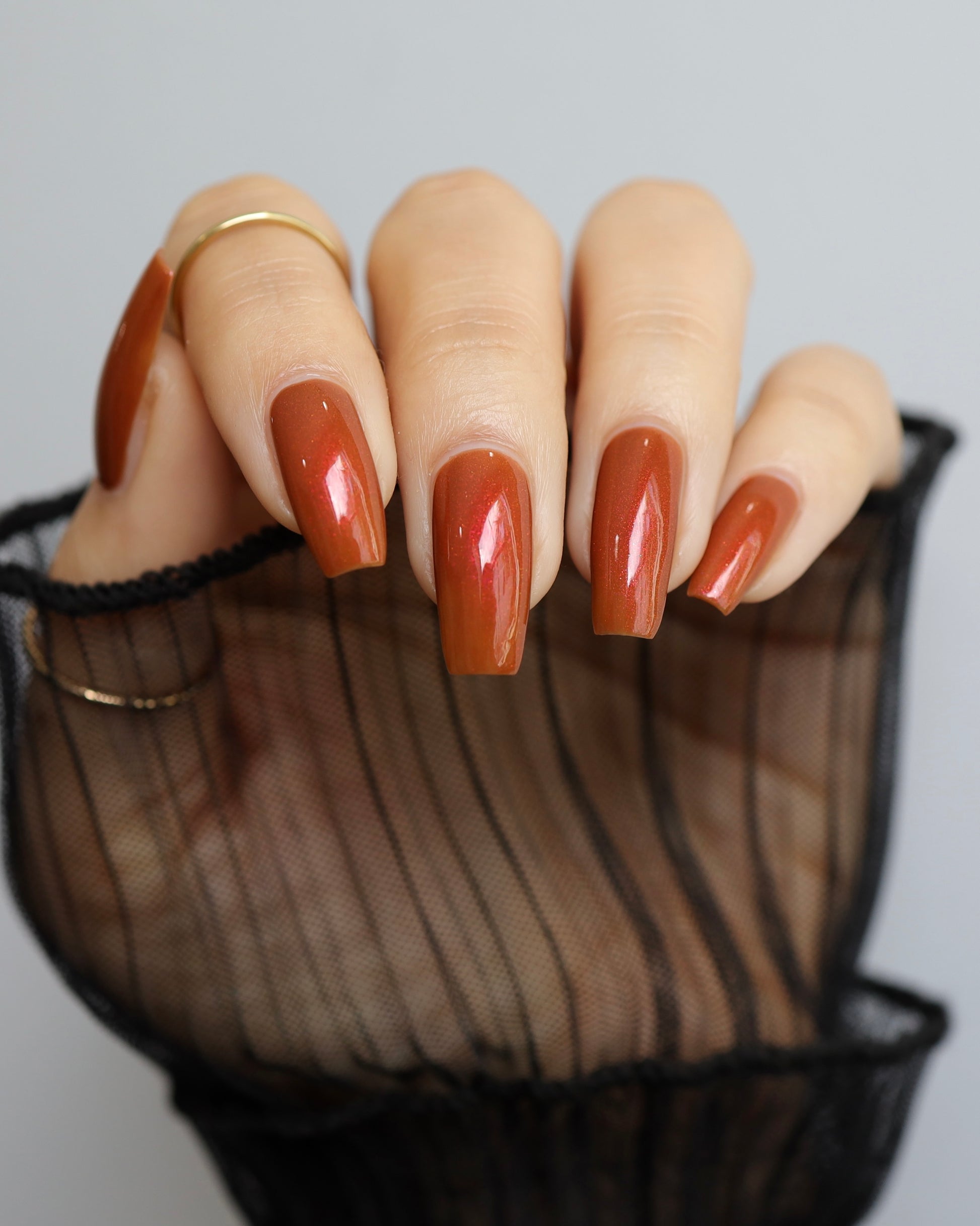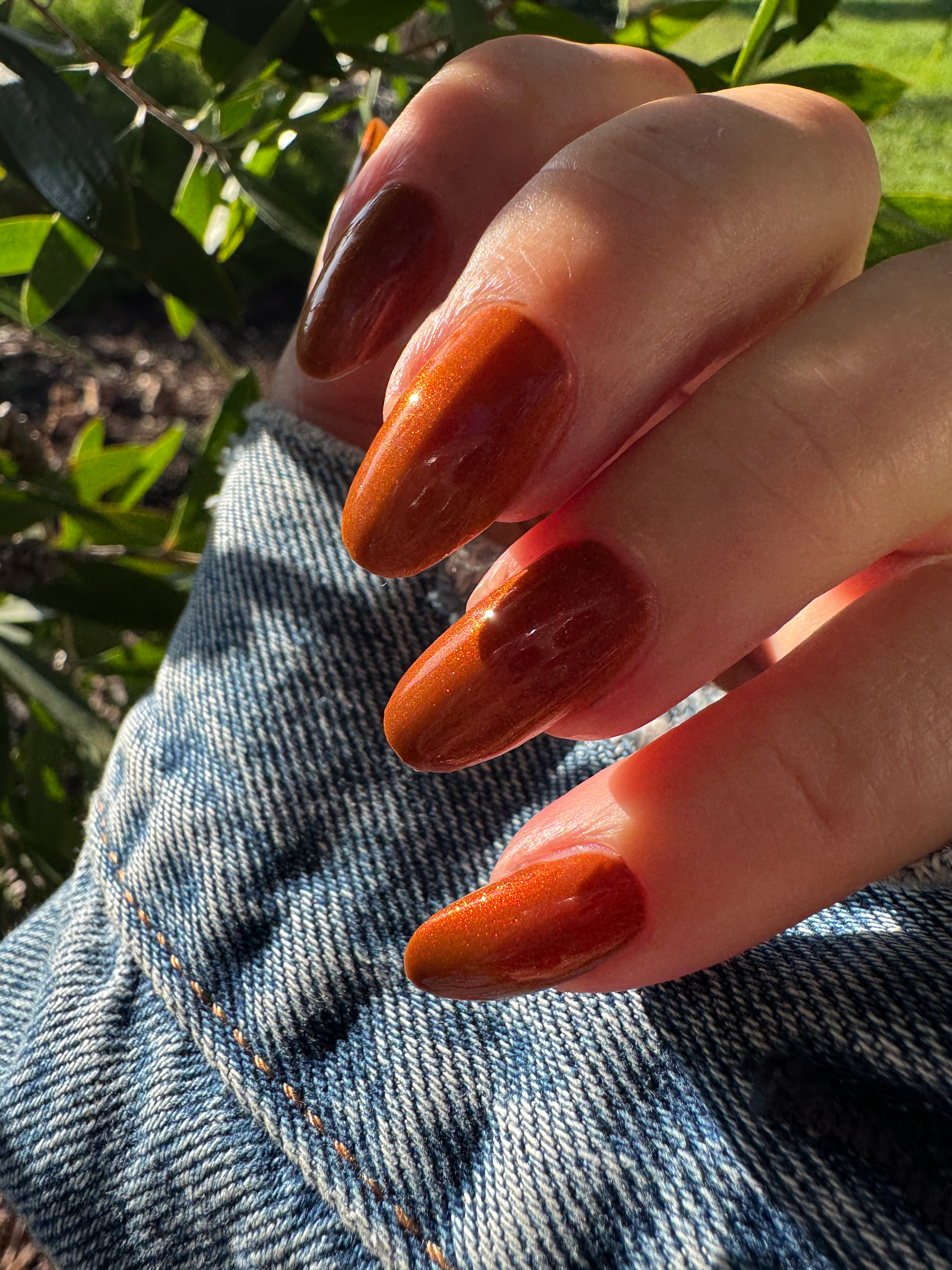Foraged has a muted brown-orange base with red to orange shimmer.