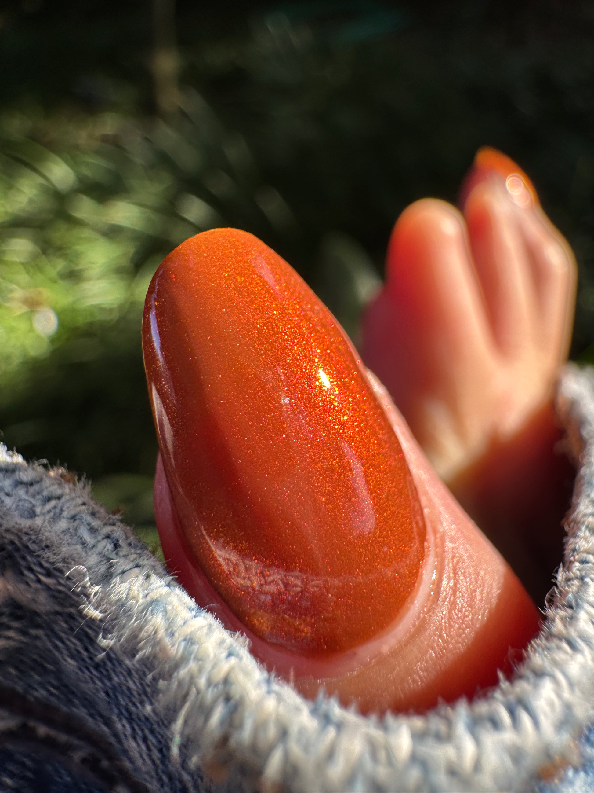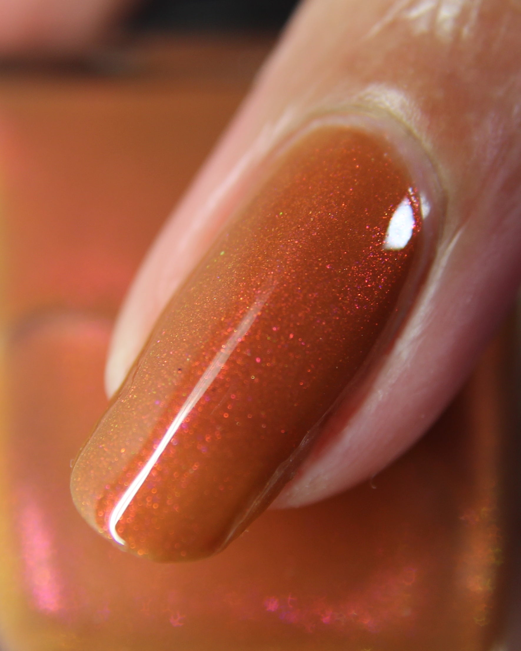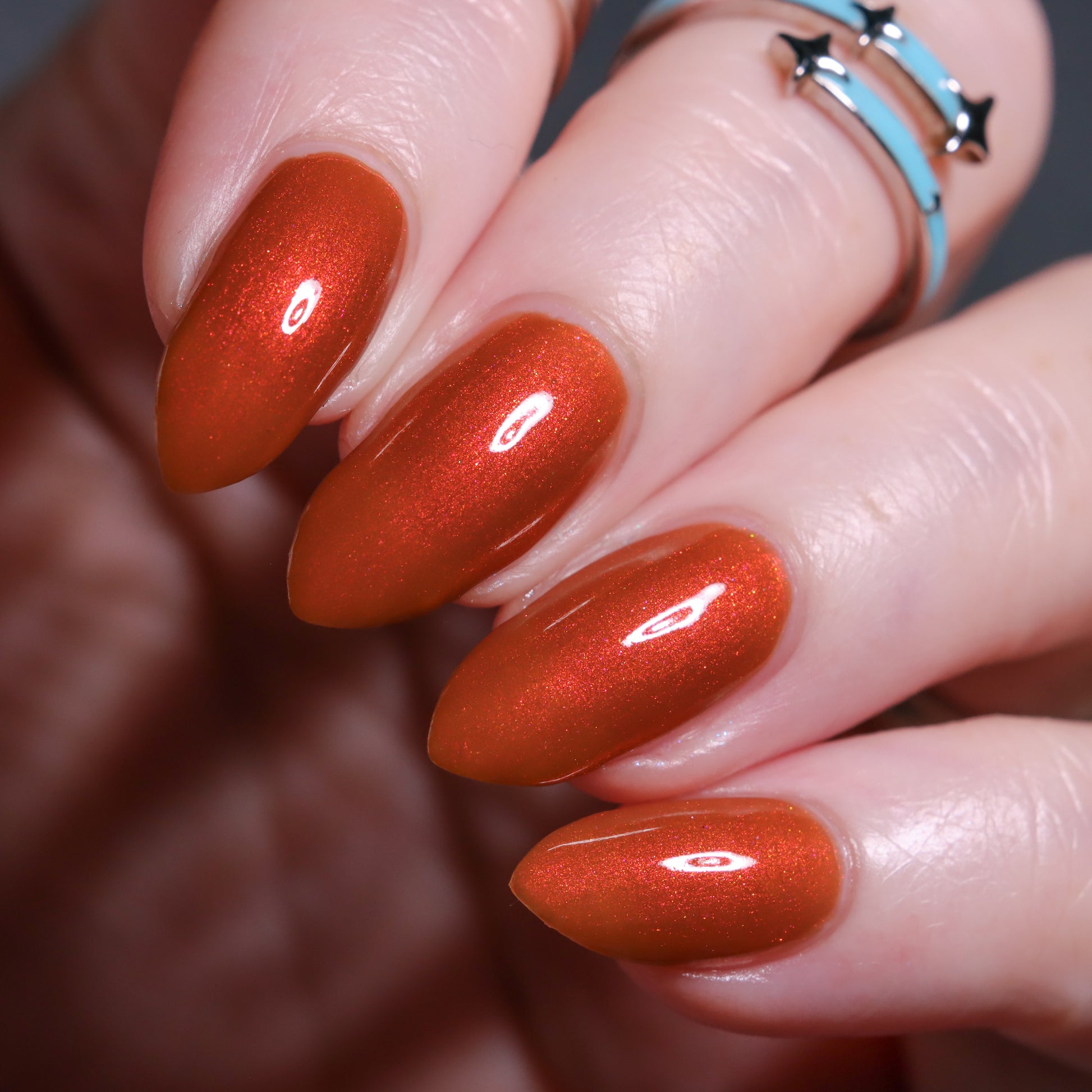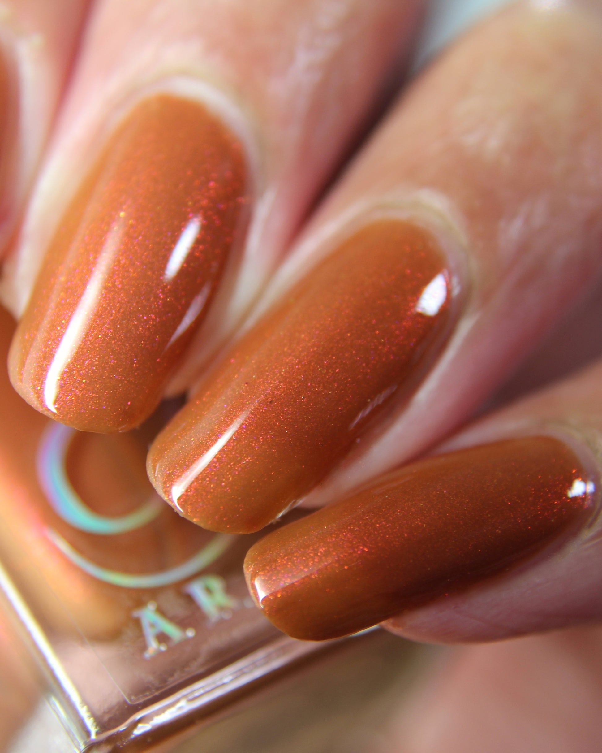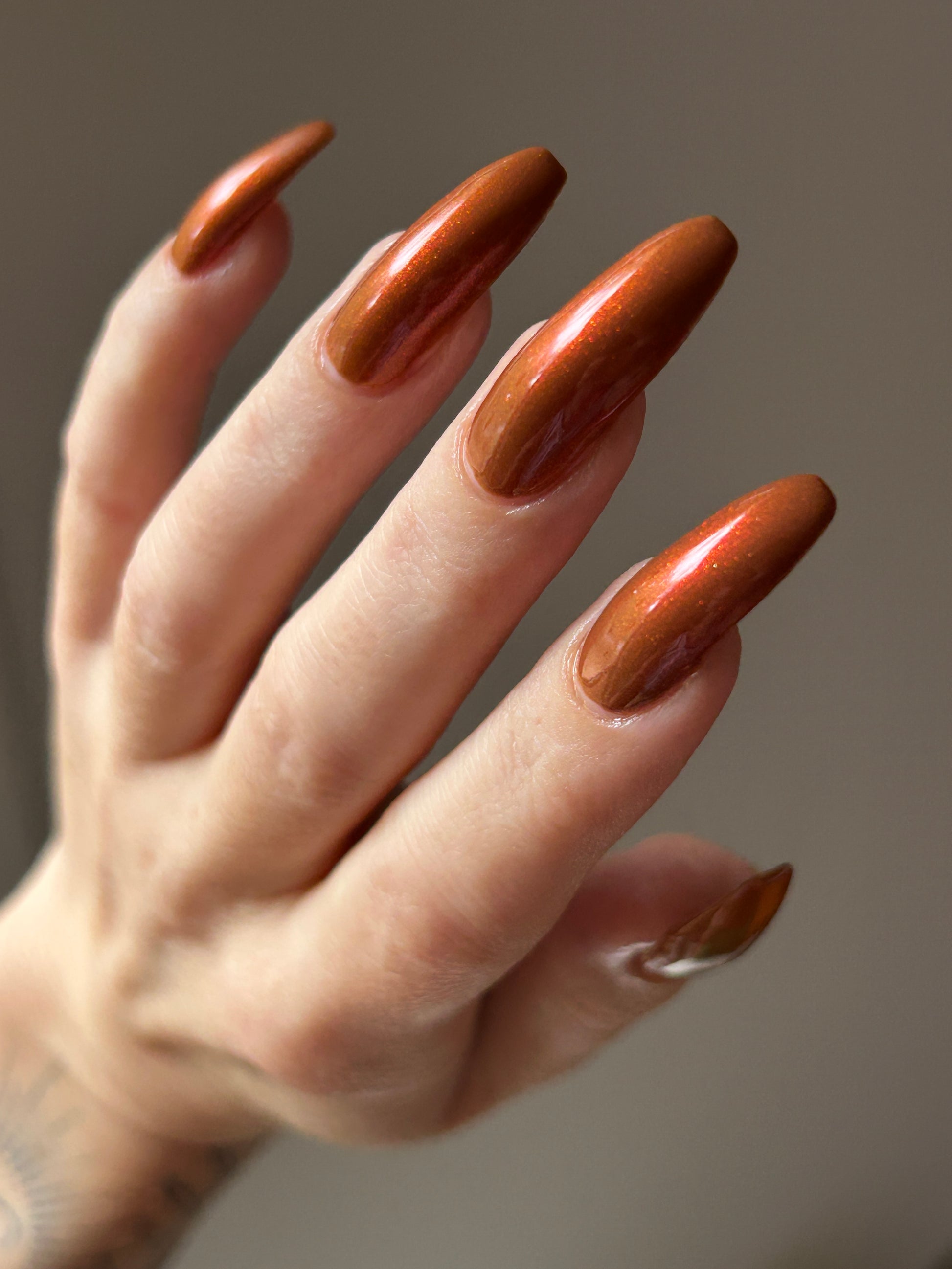 Foraged has a muted brown-orange base with red to orange shimmer.